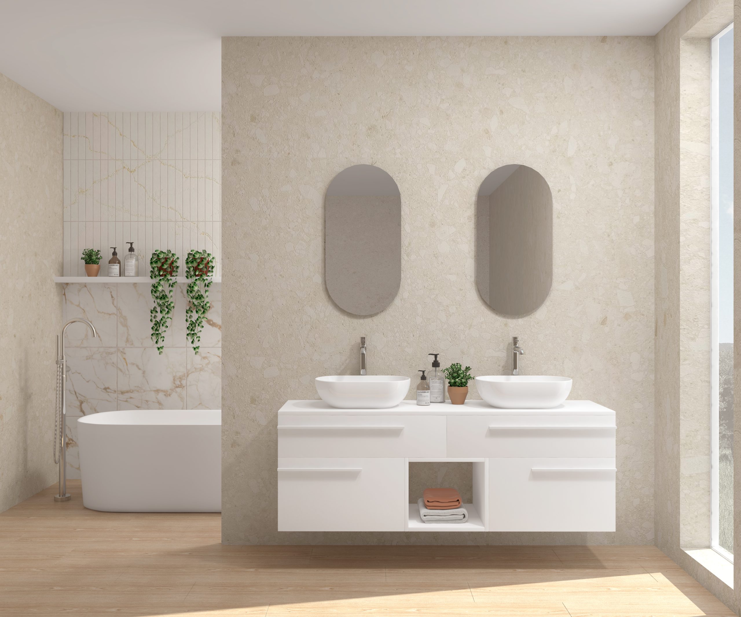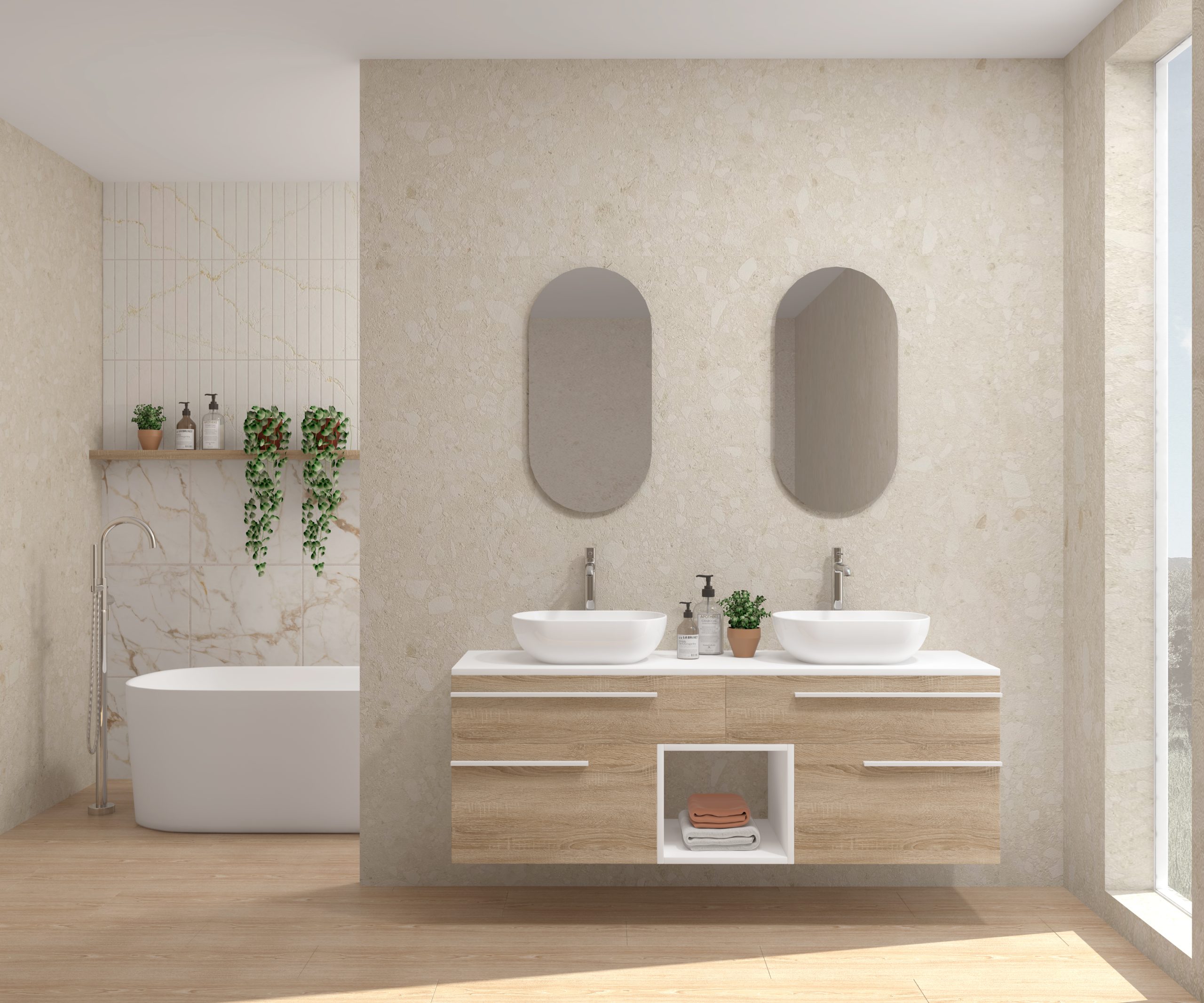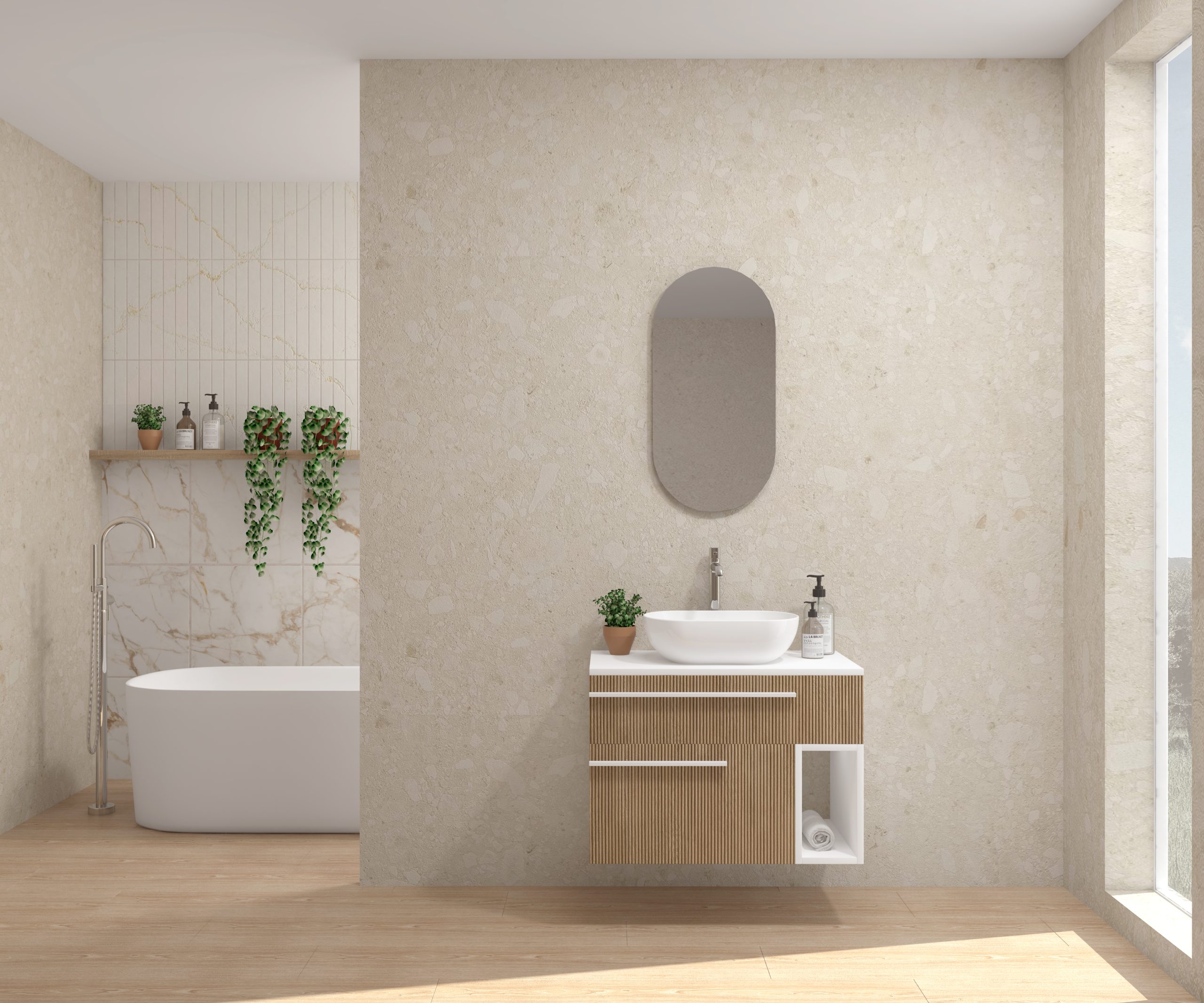 Miroir design capsule inclus. Vasque à poser en céramique incluse. Livré monté, prêt à être fixé au mur. Comprend toute la quincaillerie nécessaire. Fabriqué en Espagne. Robinet et siphon non inclus.