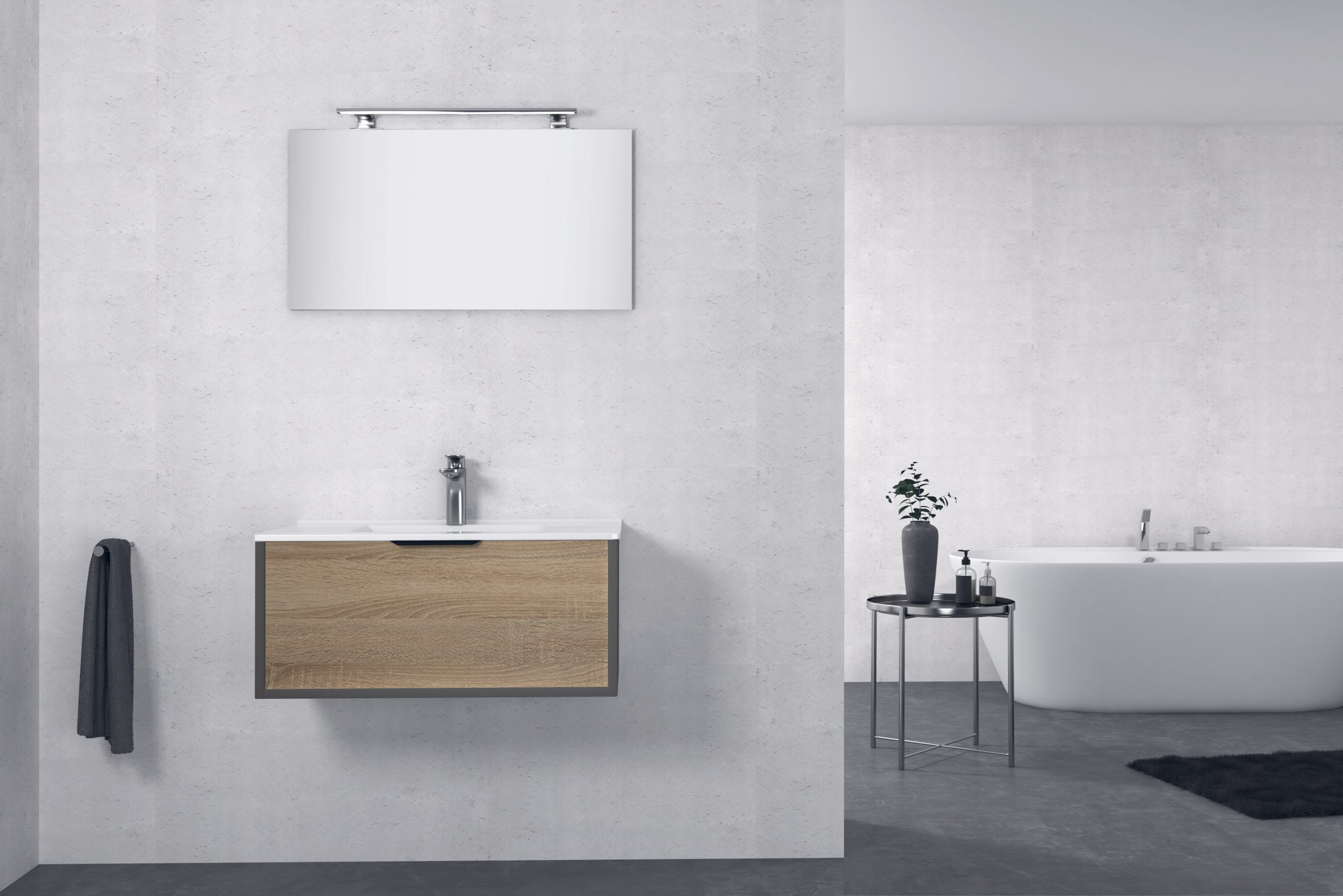 Pack formado por mueble de baño realizado en tablero laminado con un cajón totalmente extraíble y cierre softclosing. Lavabo de Solid Surface, espejo y foco iluminación LED incluidos. Made in Europe.