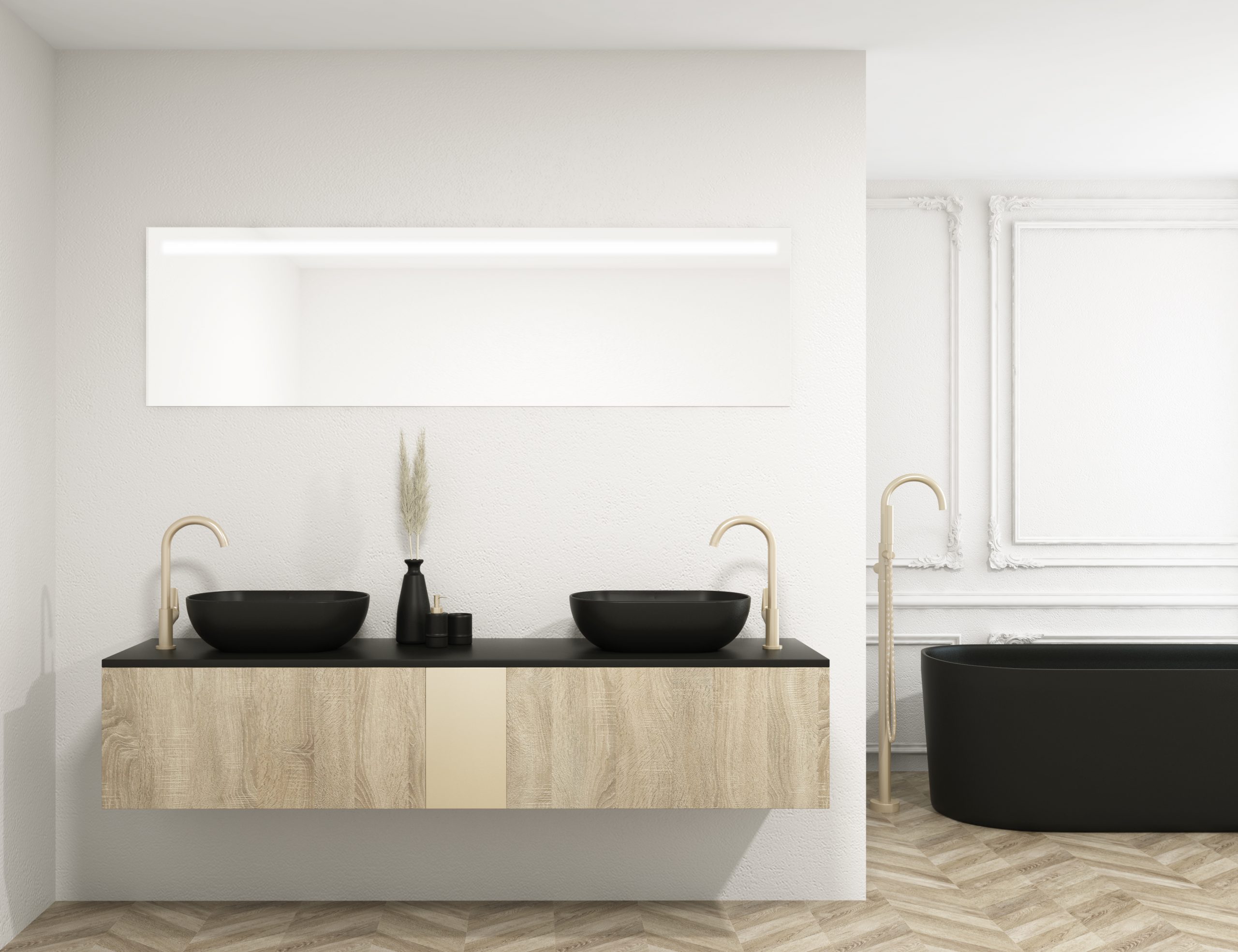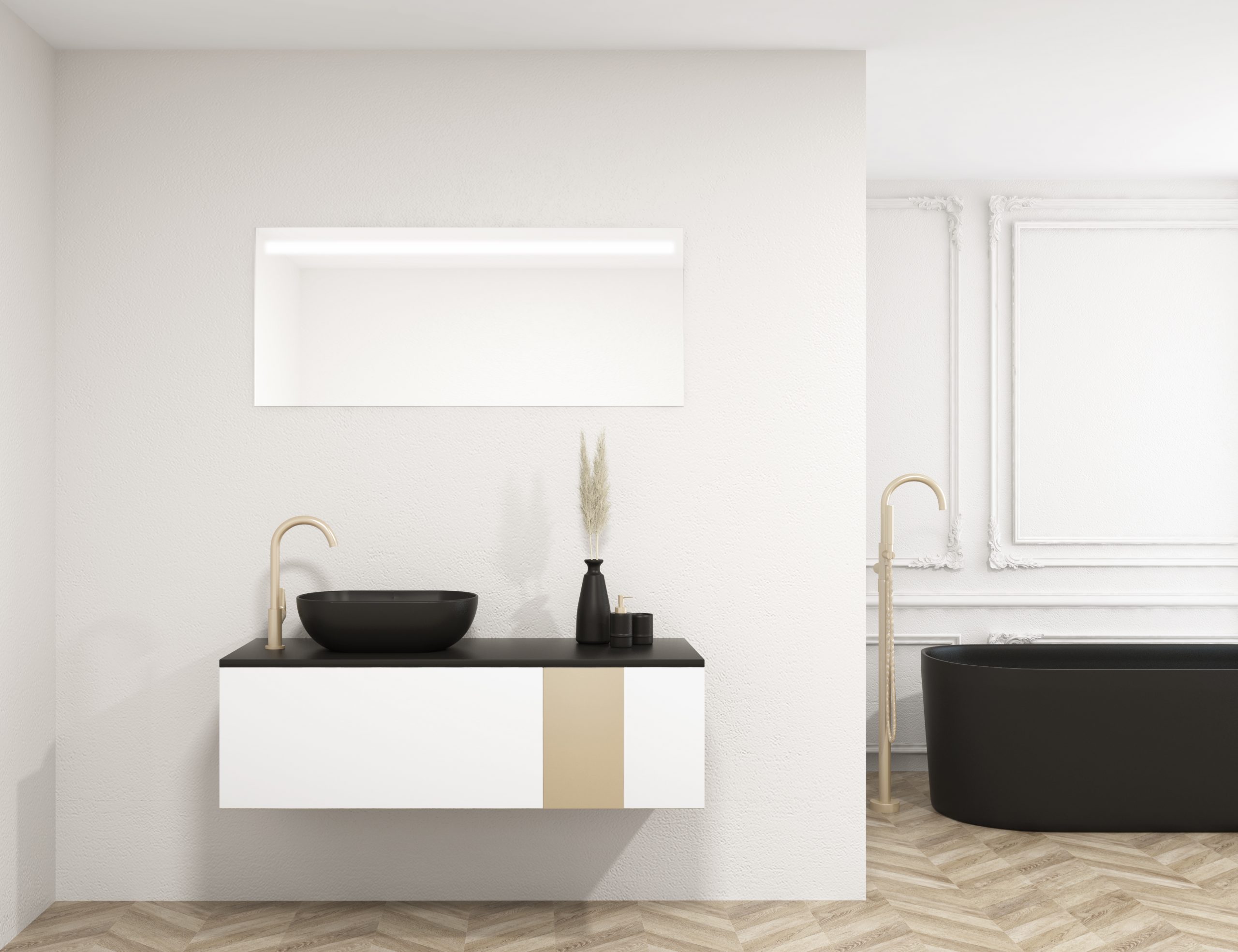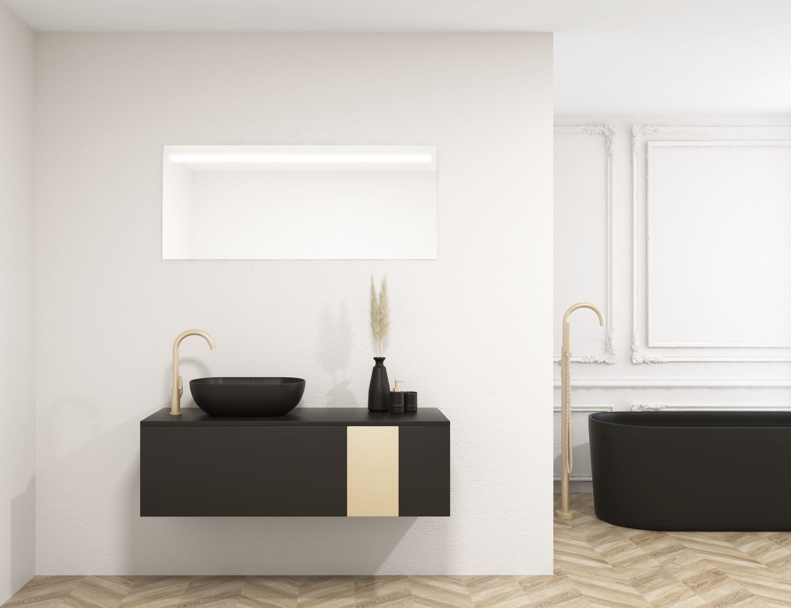 Ensemble composé d’un meuble suspendu, d’une vasque et d’un miroir LED. Meuble sous-vasque composé d’un module suspendu avec tiroir et porte. Plan de toilette finition noir mat assorti à la vasque de la même couleur. Porte décorative en finition dorée. Meuble fabriqué en panneau de particules de 19 mm avec revêtement mélaminé. Tiroir métallique à double paroi à l’esthétique minimaliste, aux parois fines et aux lignes droites, avec fermeture amortie et une capacité de charge de 25 kg. Tiroir à pleine extension et espace arrière disponible. Porte avec vérin amortisseur pour une fermeture douce. Réglage tridimensionnel pour une plus grande précision. Vasque en céramique de couleur noir mat. Robinetterie sur meuble. Miroir LED inclus IP44, 6000ºK, 14,4W, 1320 lumens. Livré monté, prêt à être fixé au mur. Comprend toute la quincaillerie nécessaire. Fabriqué en Espagne. Robinet et siphon non inclus.