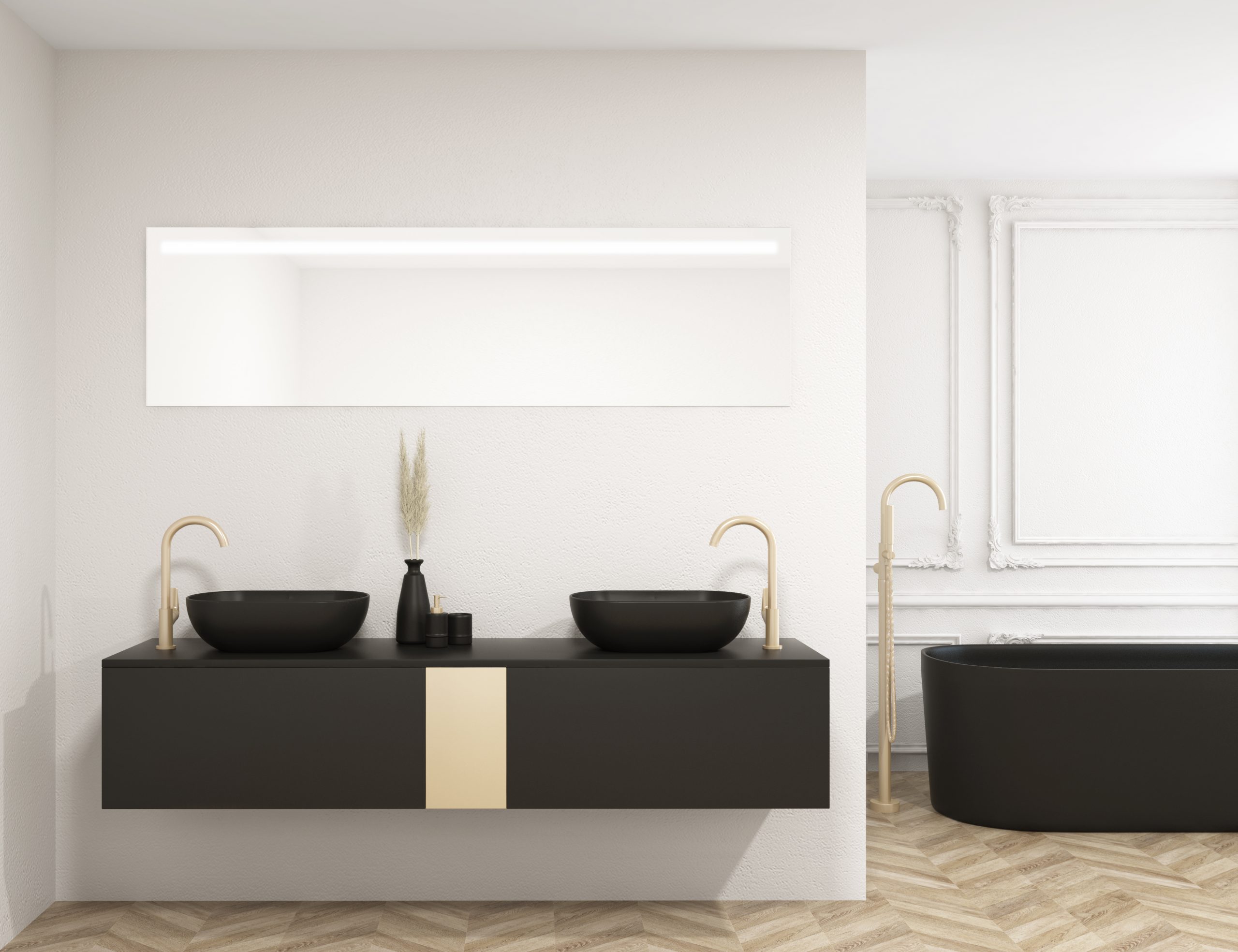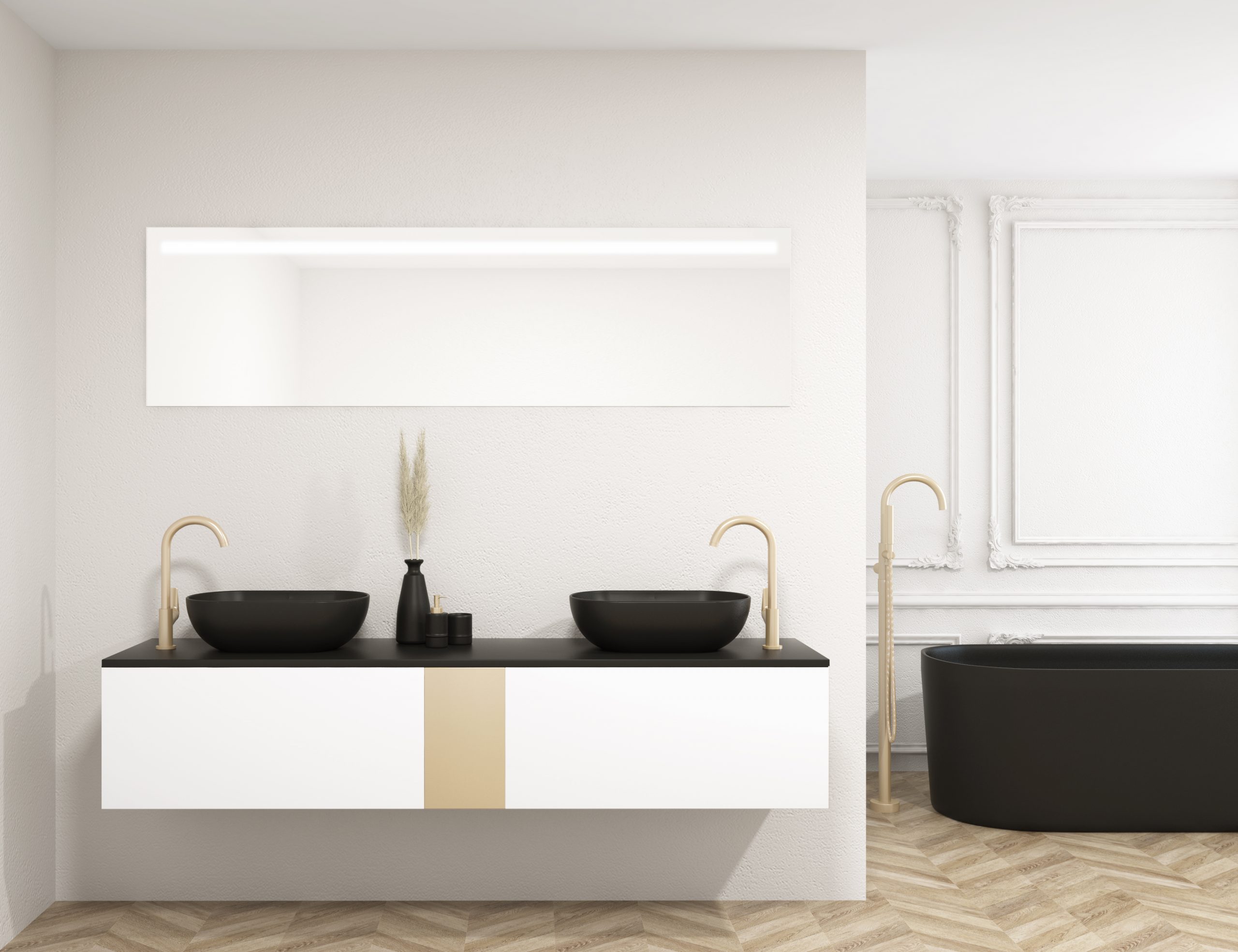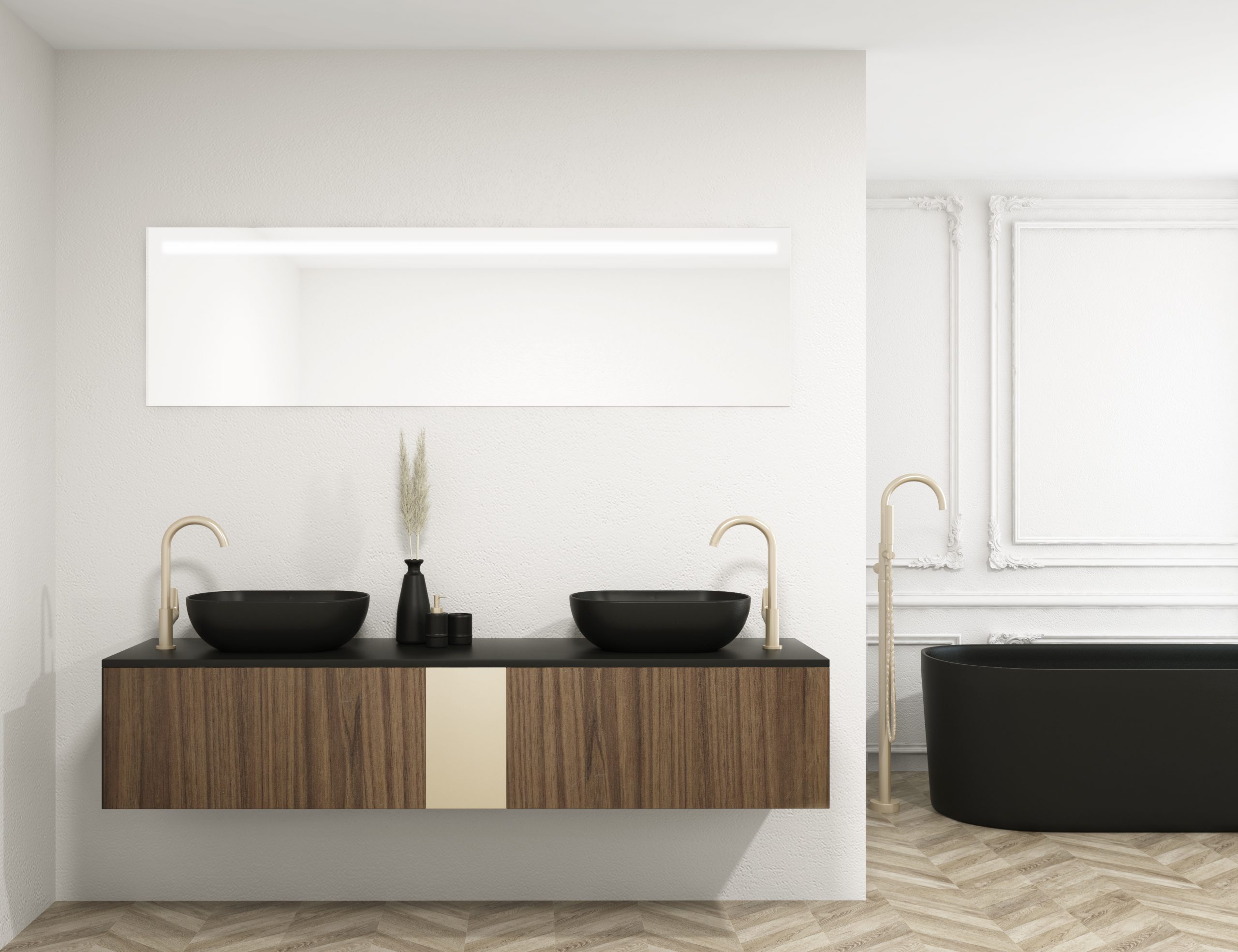 Ensemble composé d’un meuble suspendu, d’une vasque et d’un miroir LED. Meuble sous-vasque composé d’un module suspendu avec tiroir et porte. Plan de toilette finition noir mat assorti à la vasque de la même couleur. Porte décorative en finition dorée. Meuble fabriqué en panneau de particules de 19 mm avec revêtement mélaminé. Tiroir métallique à double paroi à l’esthétique minimaliste, aux parois fines et aux lignes droites, avec fermeture amortie et une capacité de charge de 25 kg. Tiroir à pleine extension et espace arrière disponible. Porte avec vérin amortisseur pour une fermeture douce. Réglage tridimensionnel pour une plus grande précision. Vasque en céramique de couleur noir mat. Robinetterie sur meuble. Miroir LED inclus IP44, 6000ºK, 14,4W, 1320 lumens. Livré monté, prêt à être fixé au mur. Comprend toute la quincaillerie nécessaire. Fabriqué en Espagne. Robinet et siphon non inclus.