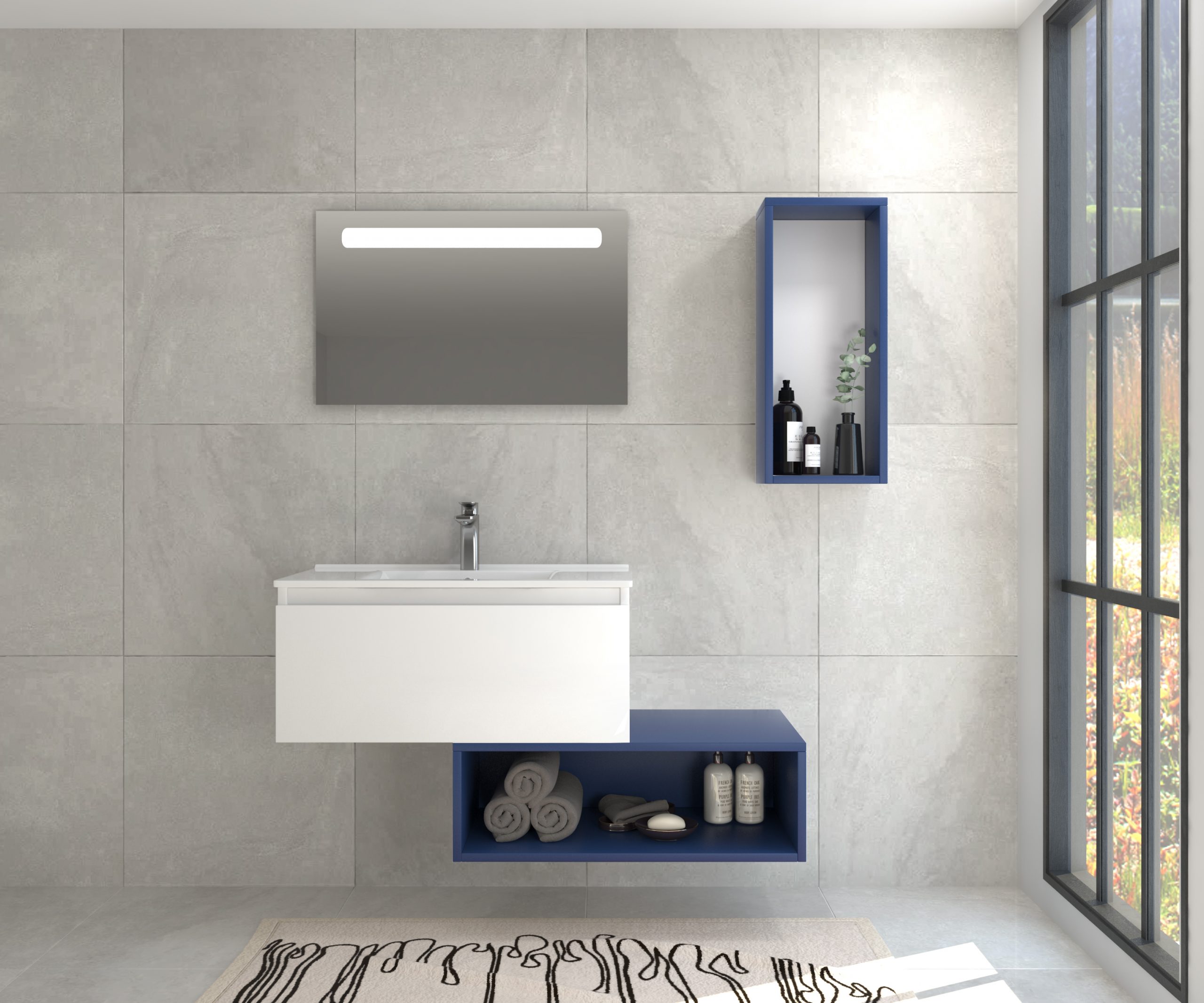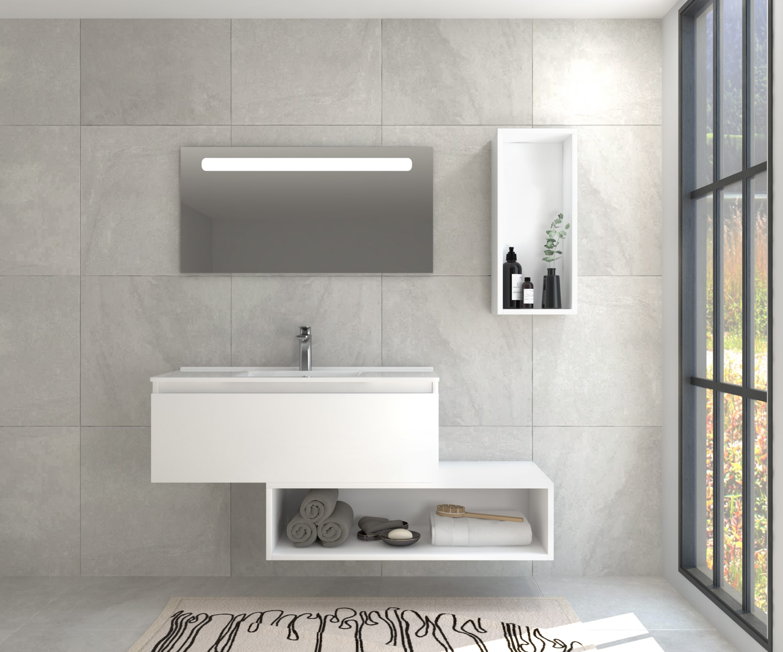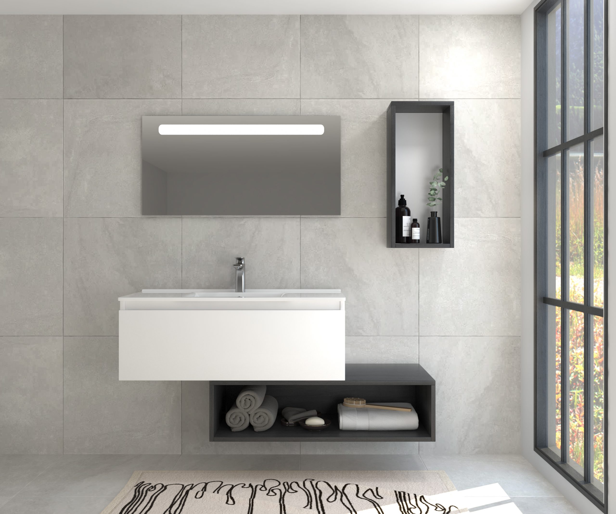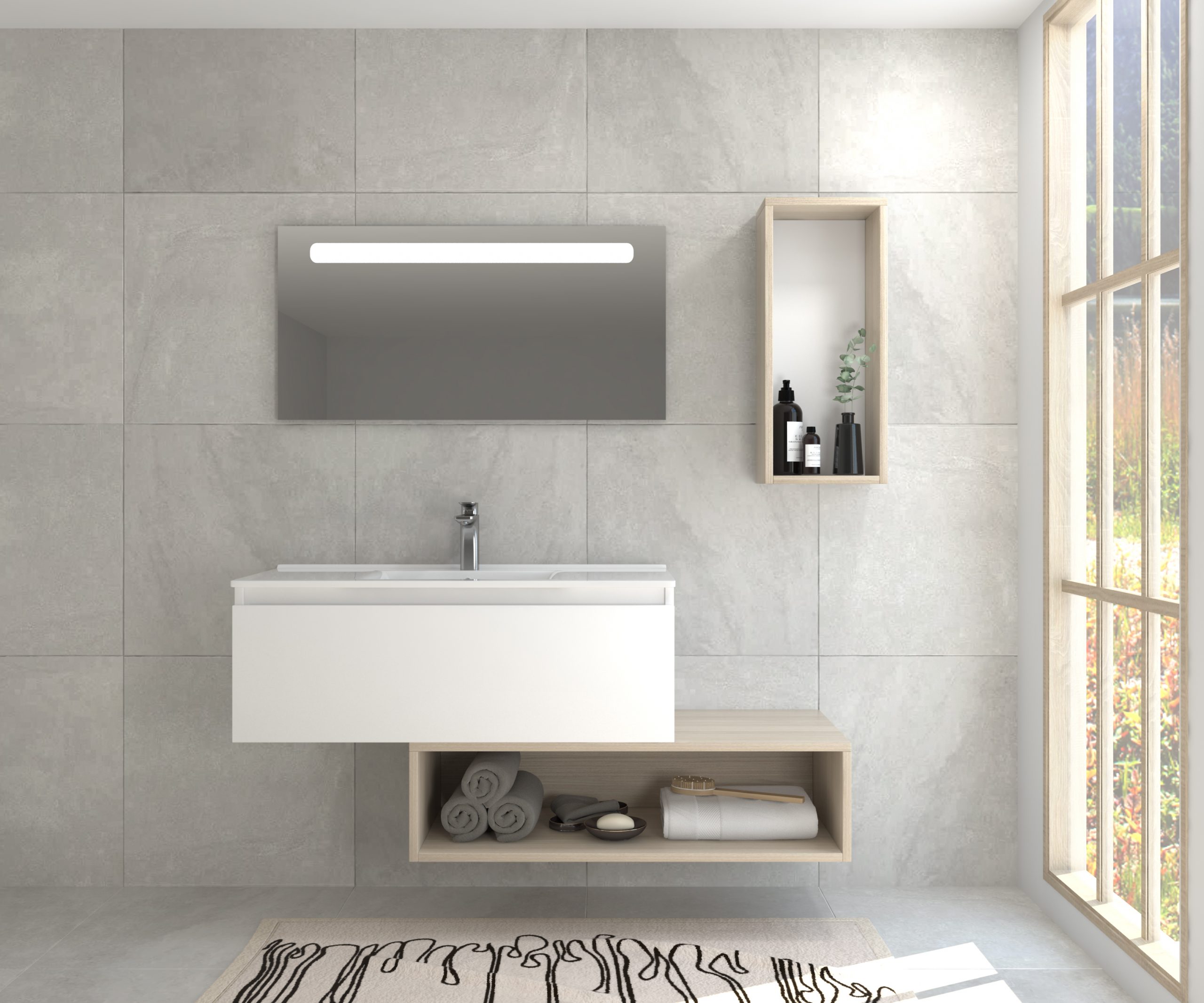 Pack compuesto por mueble de baño, lavabo y espejo iluminado. Mueble de baño formado por dos módulos fabricados en tablero laminado de 19 mm de grosor. Módulo suspendido para lavabo con un cajón de gran capacidad y cierre suave. Módulo suspendido con espacio decorativo. Lavabo encimera de cerámica blanco brillo. Espejo con iluminación led integrado incluido IP65, 6000ºK. Incluye soportes a pared. No incluye grifo ni sifón. Fabricado en España.