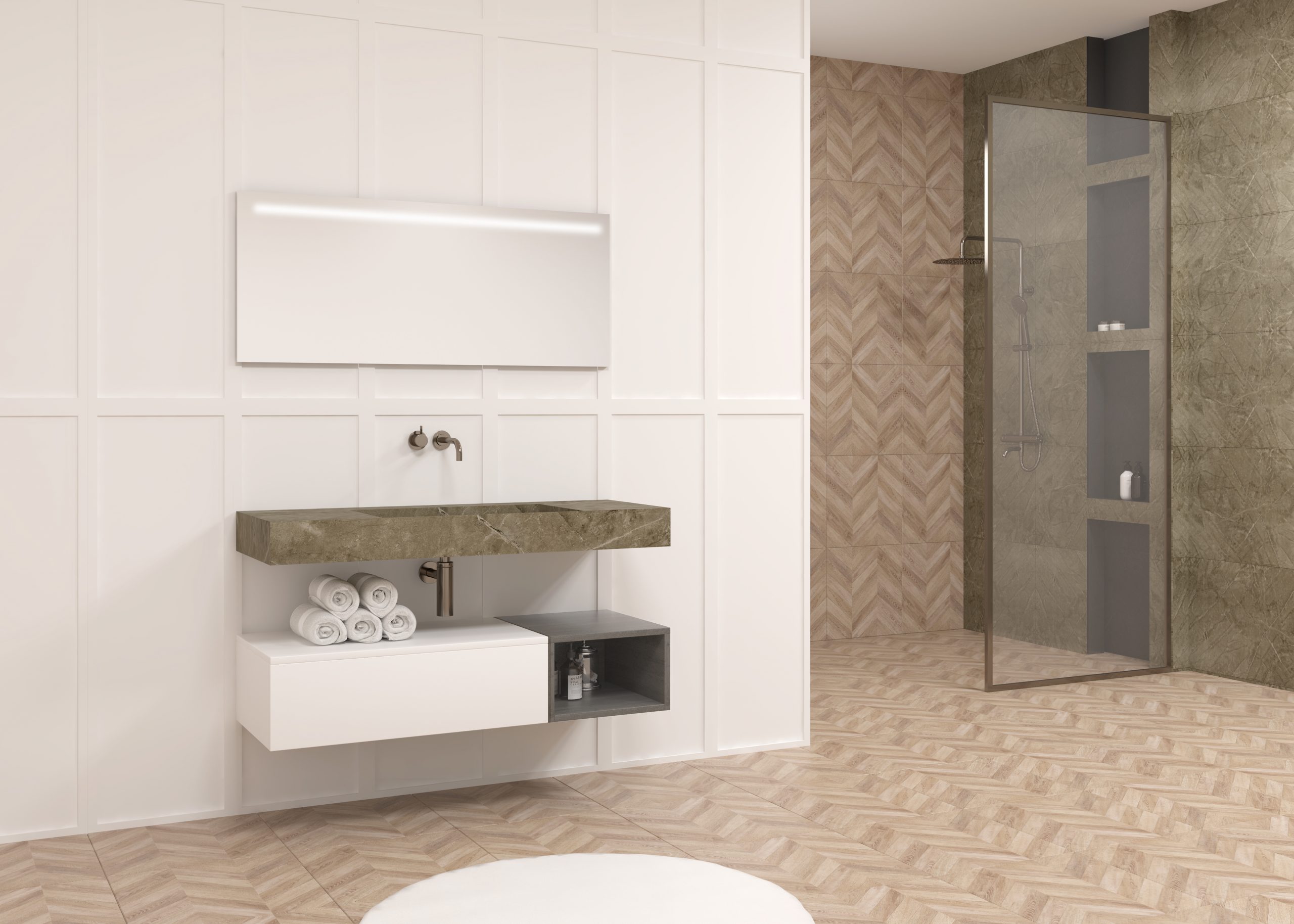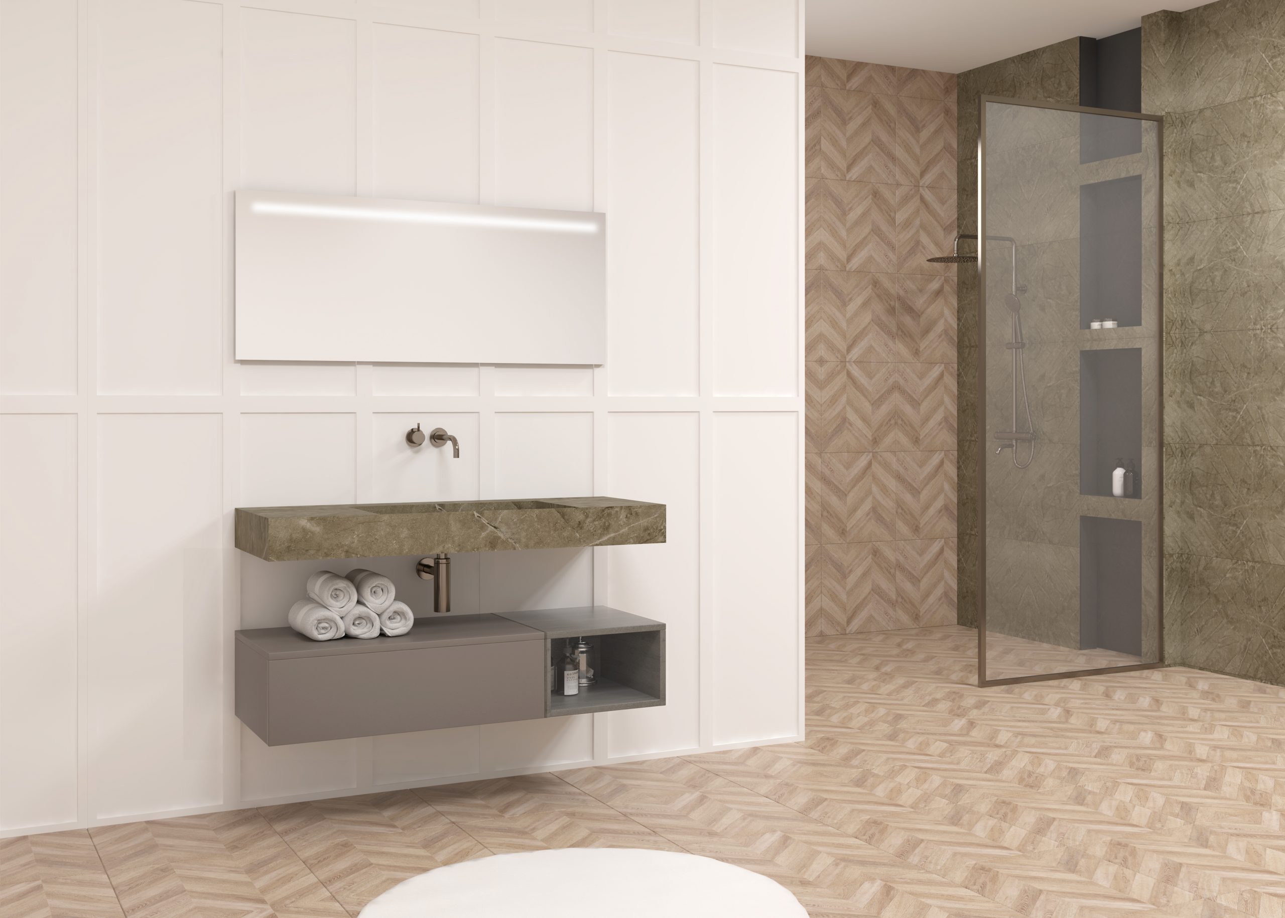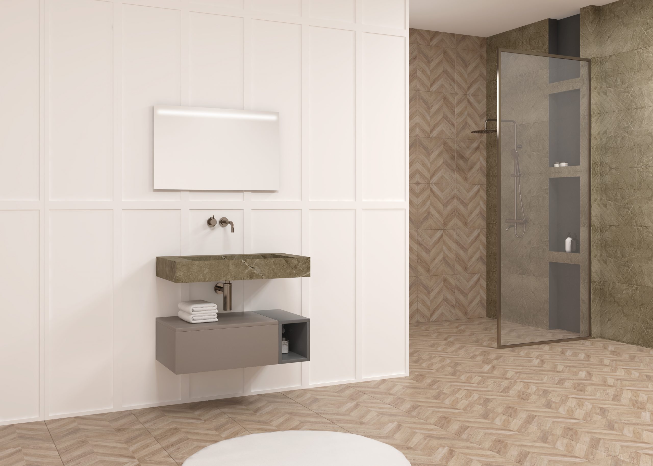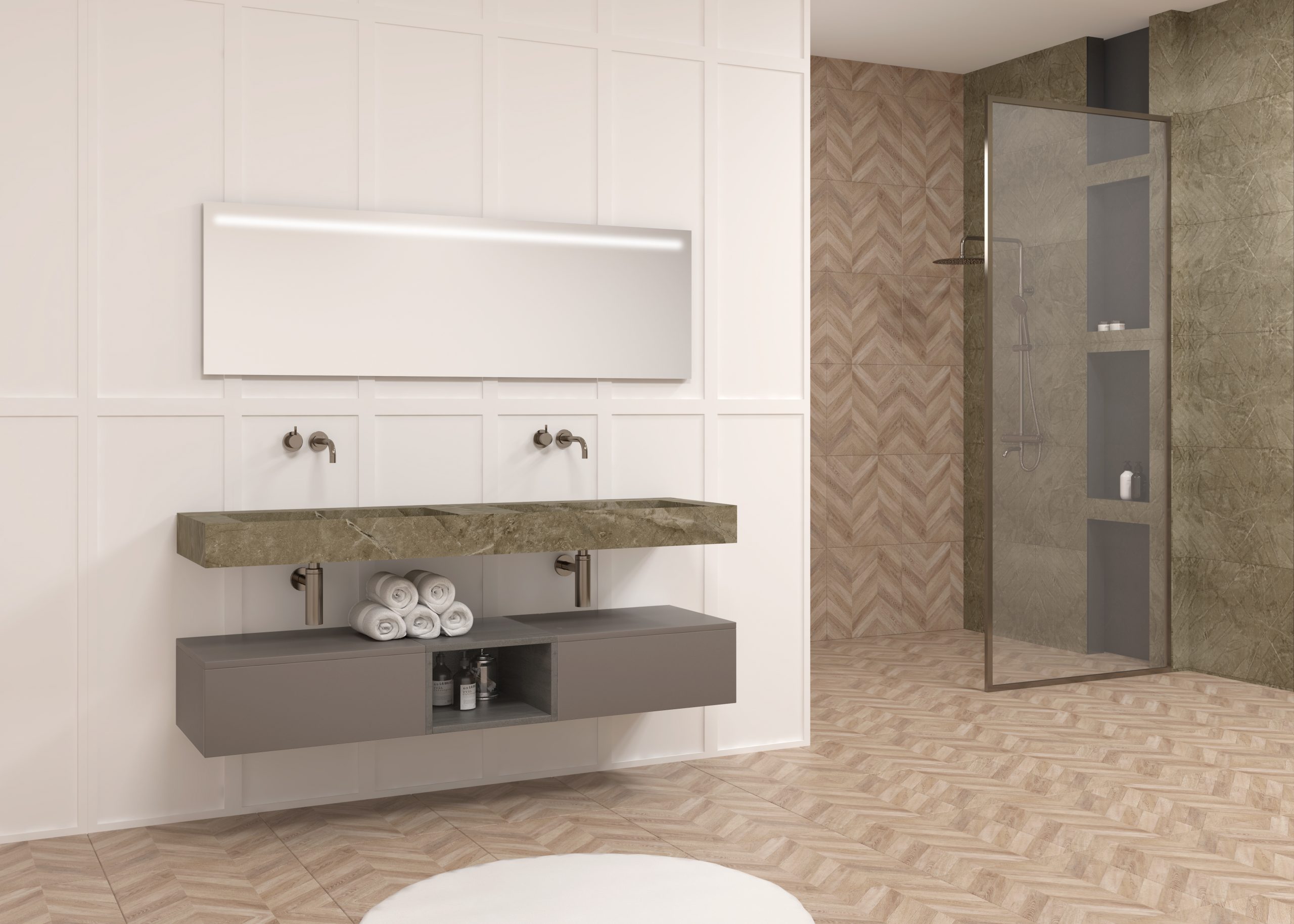 Pack composé d’un lavabo suspendu en matériau Dekton de Cosentino, d’un meuble et d’un miroir LED.