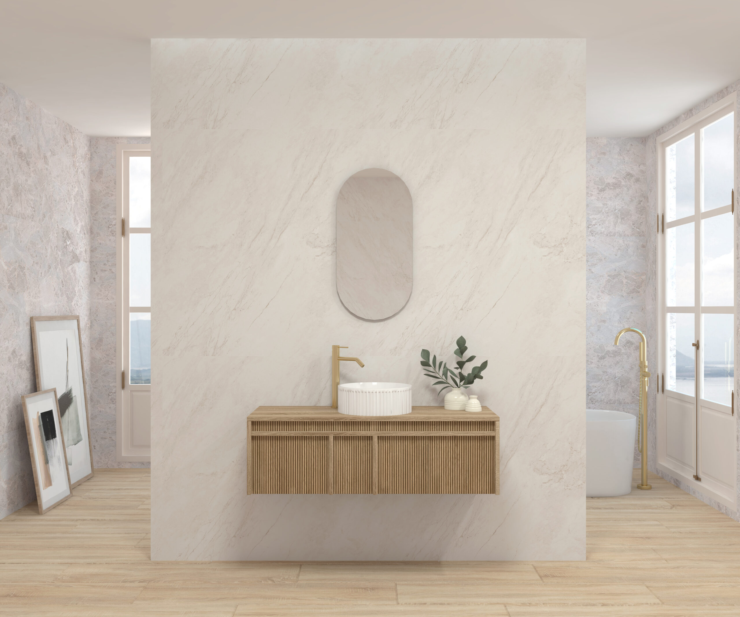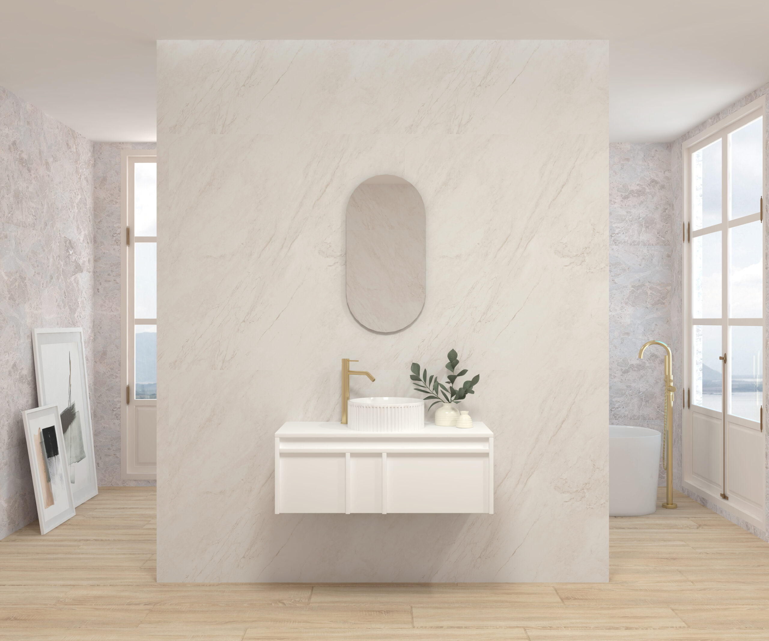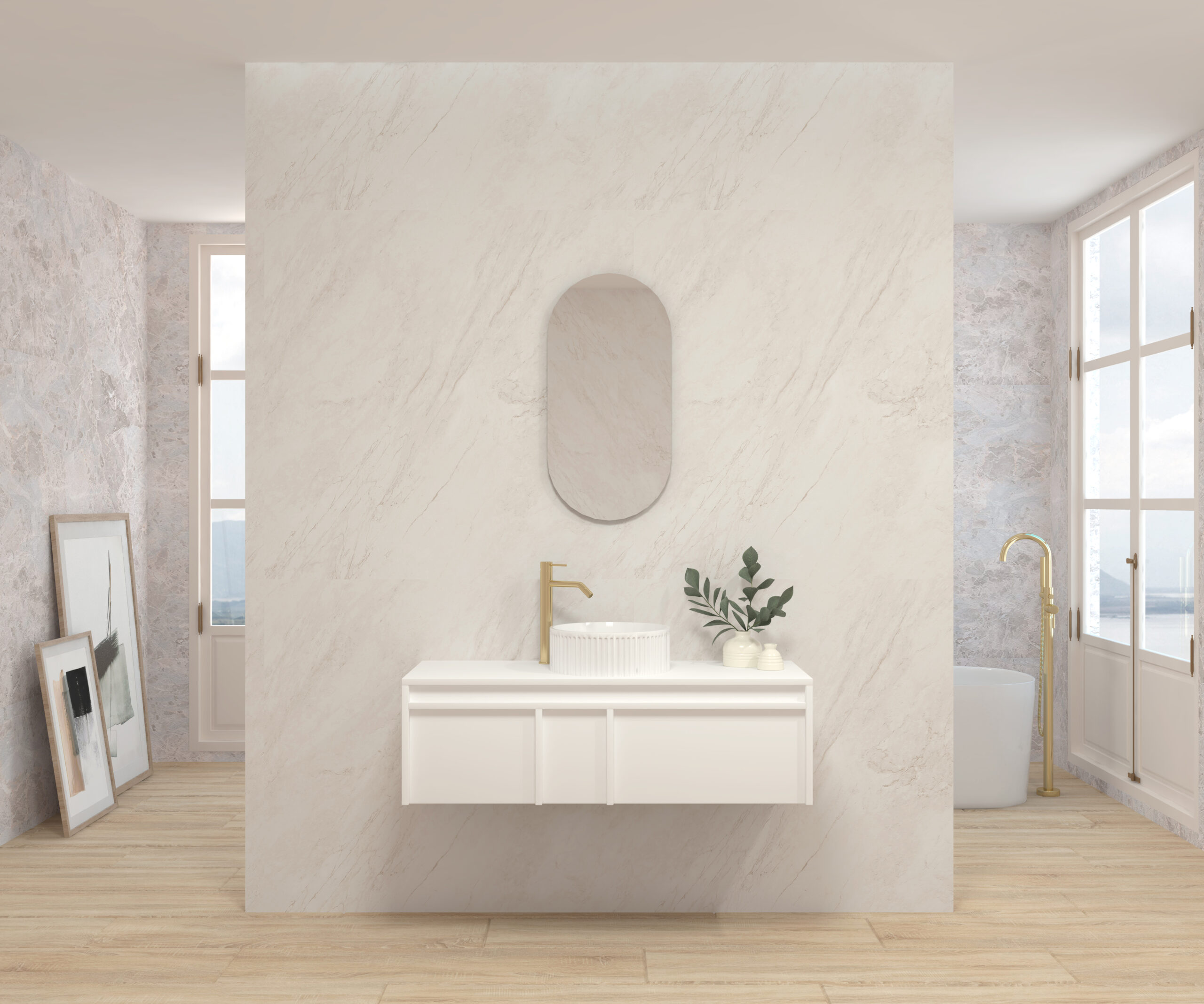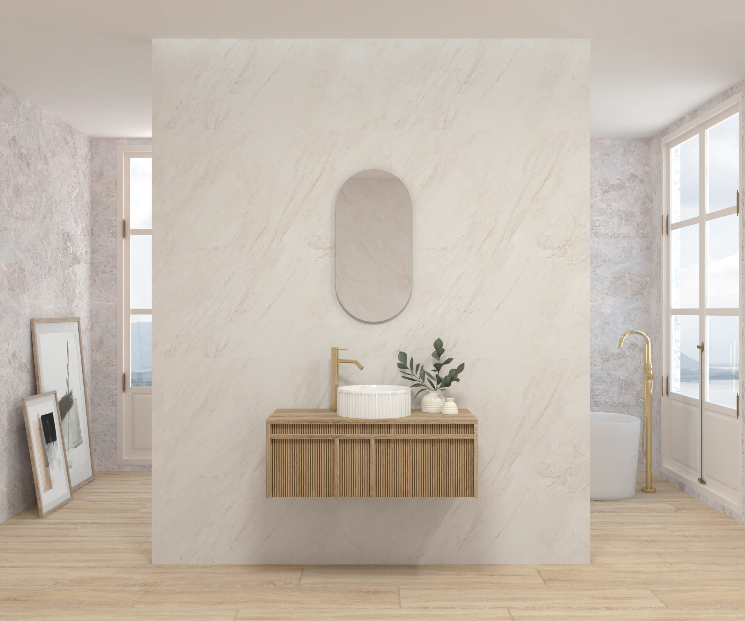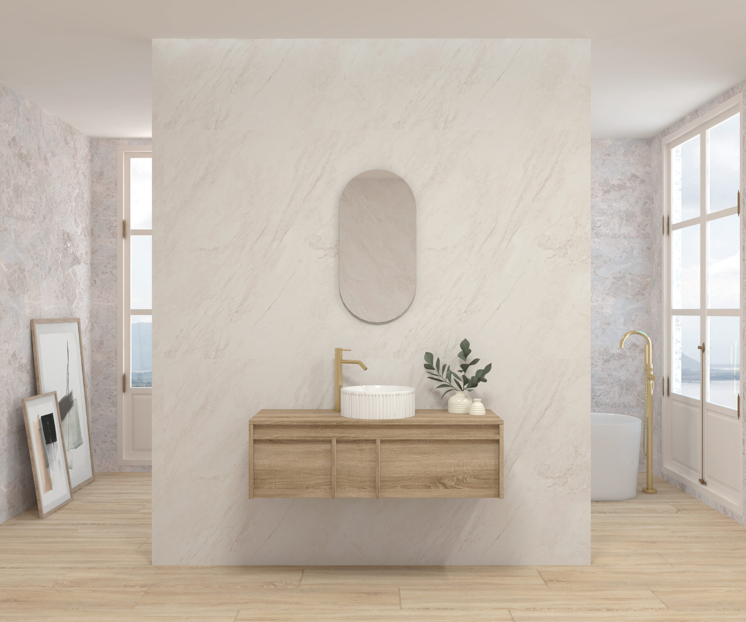 Pack composé d’un meuble suspendu, d’un lavabo et d’un miroir design capsule.