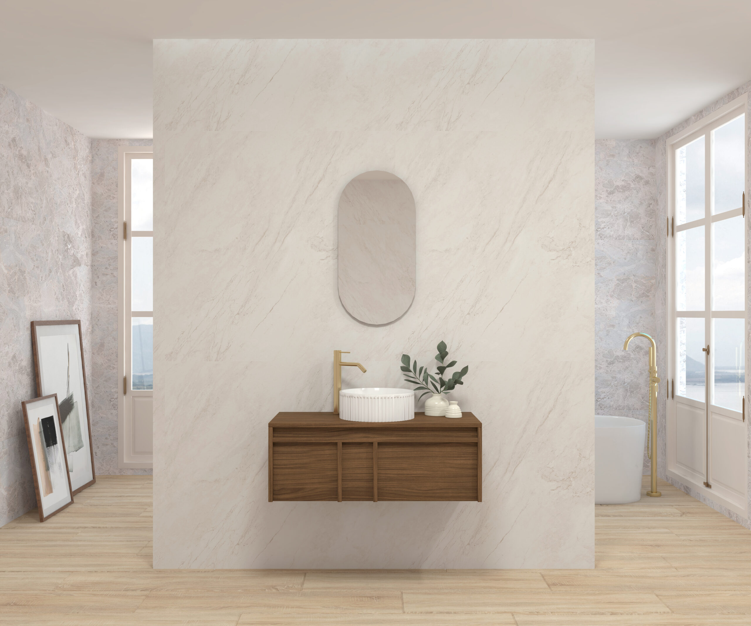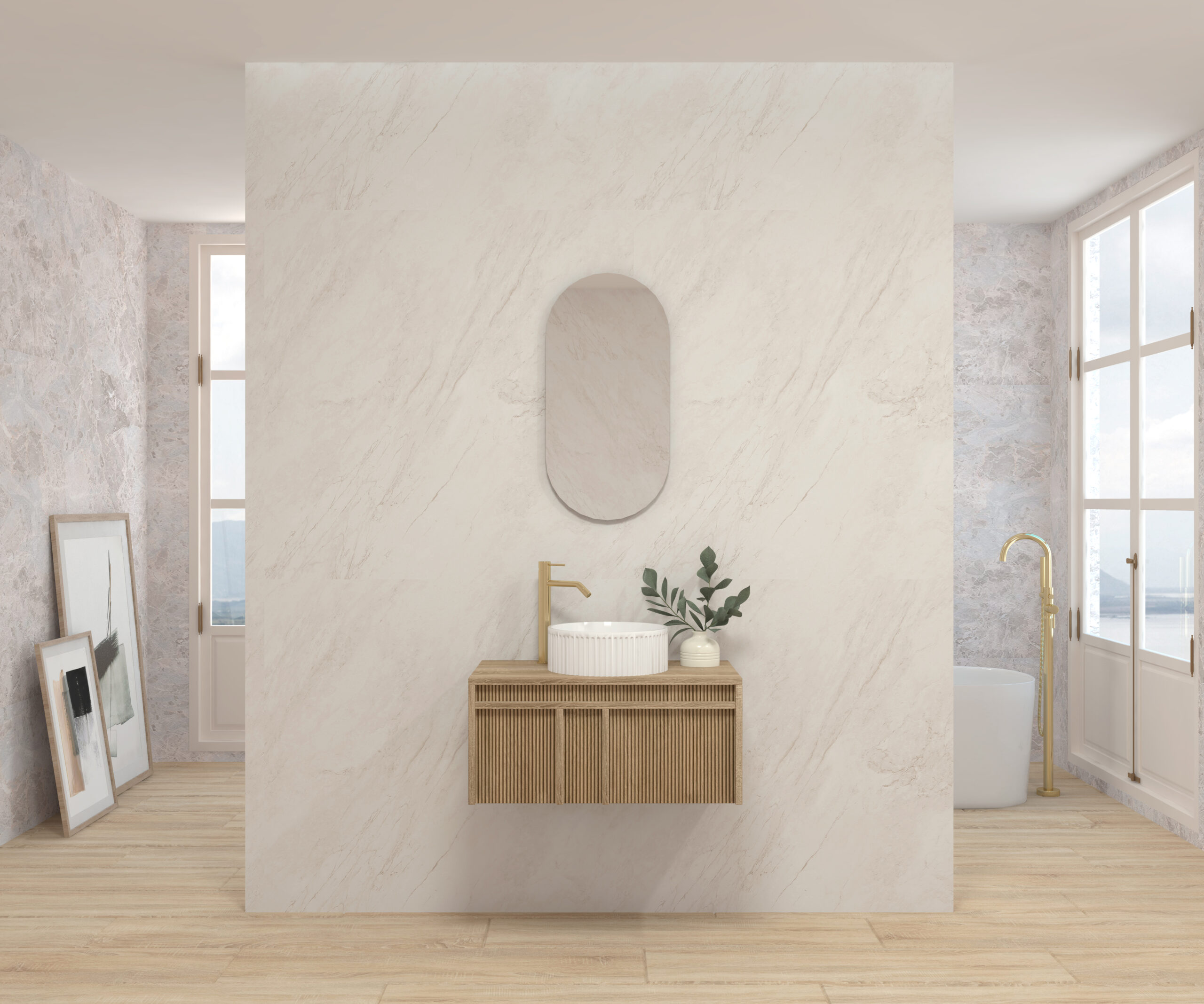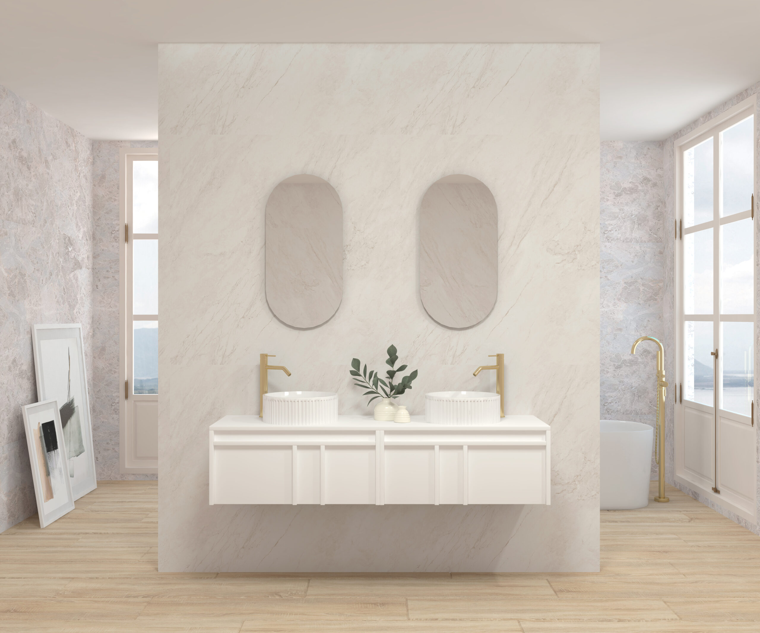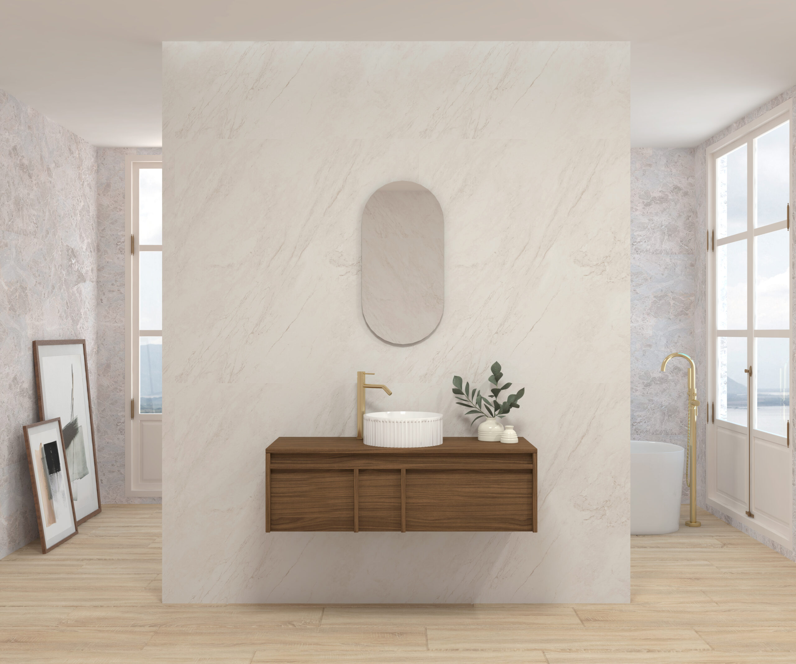 Pack composé d’un meuble suspendu, d’un lavabo et d’un miroir design capsule.