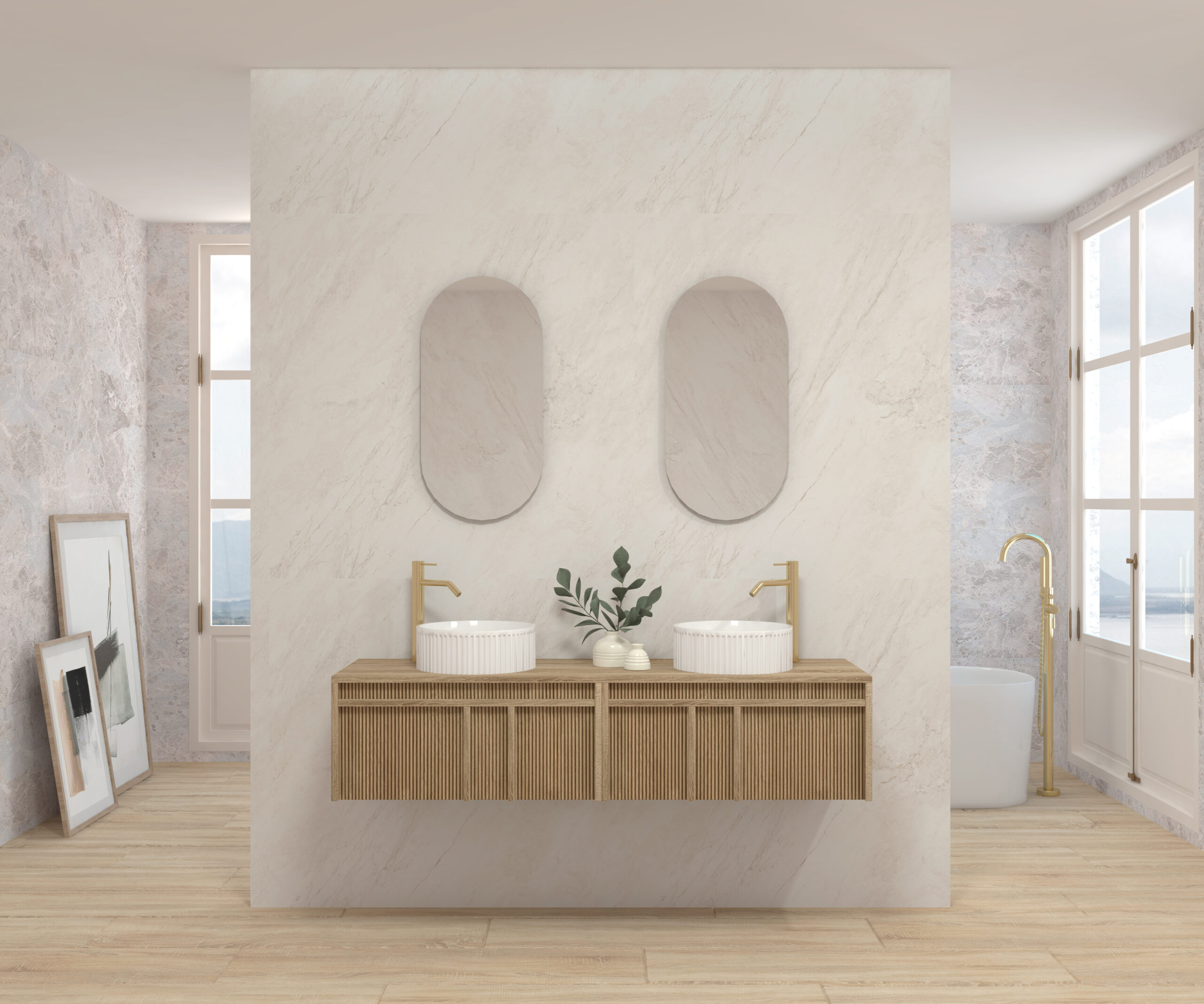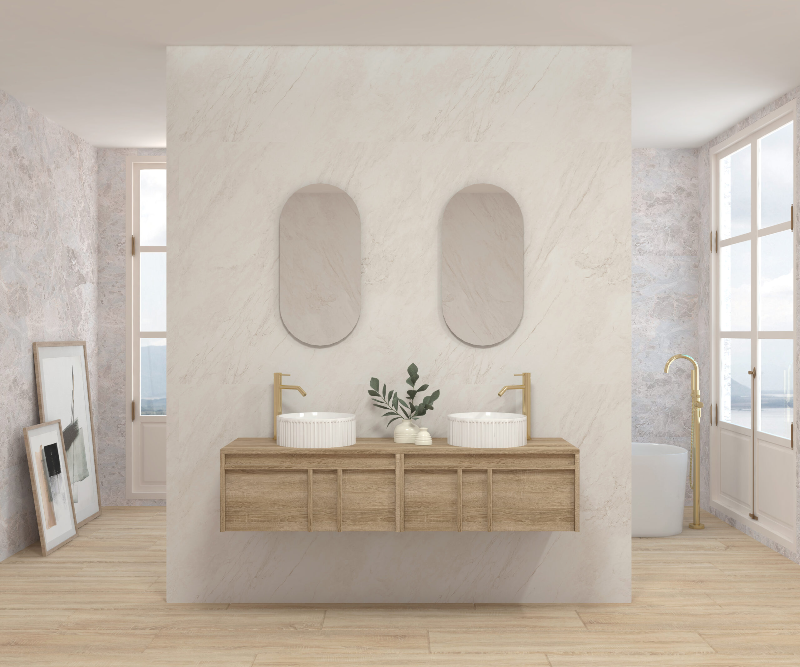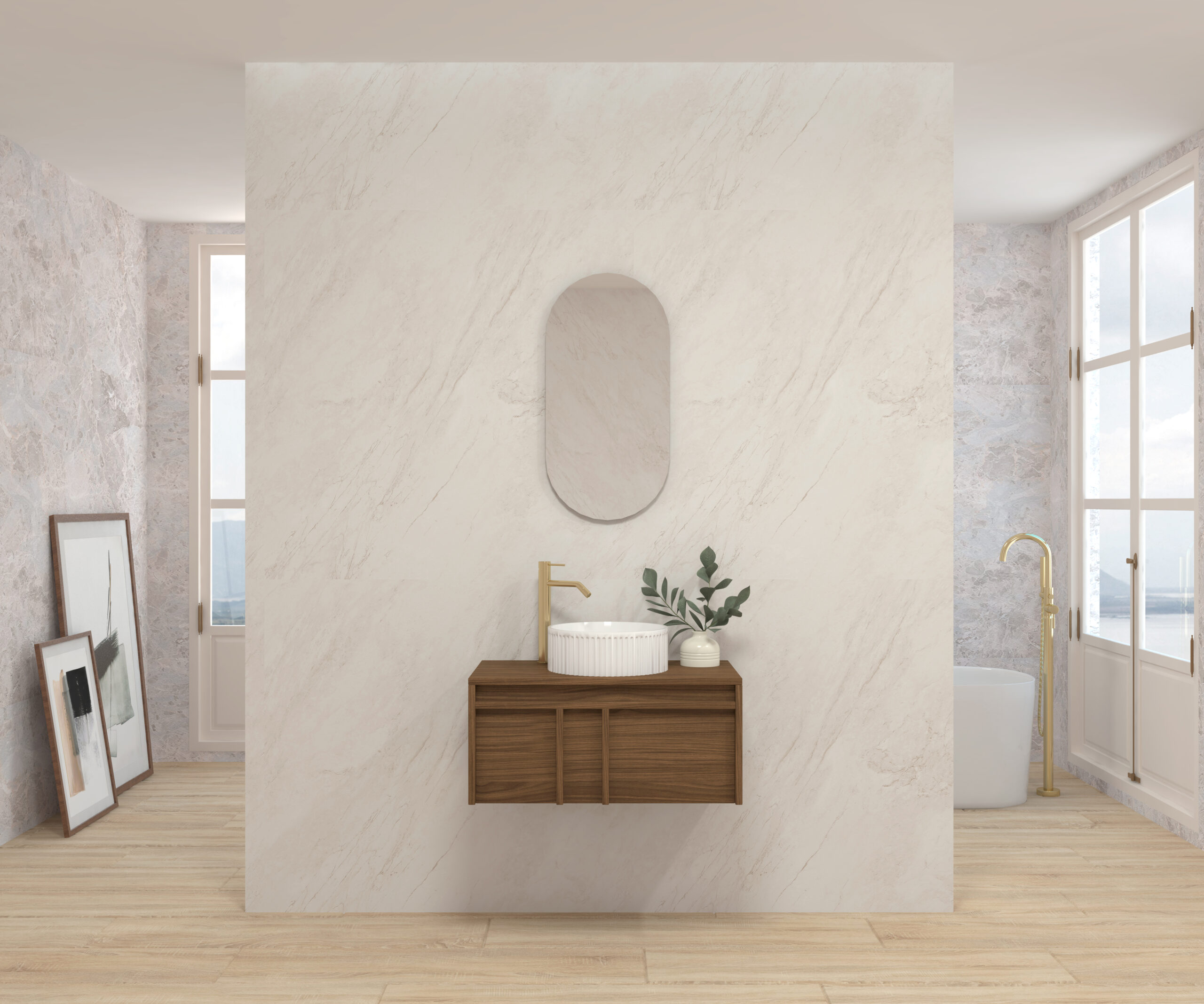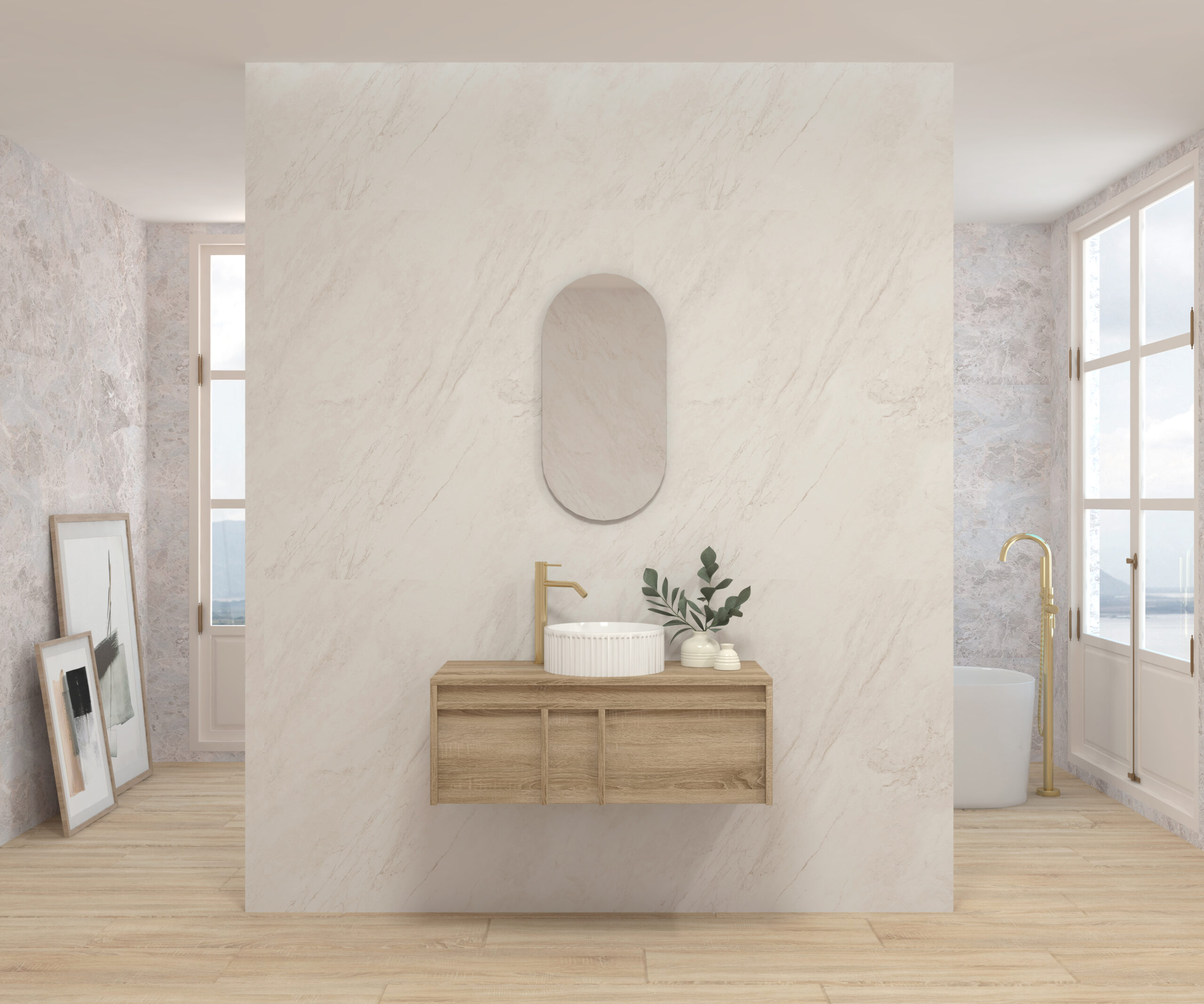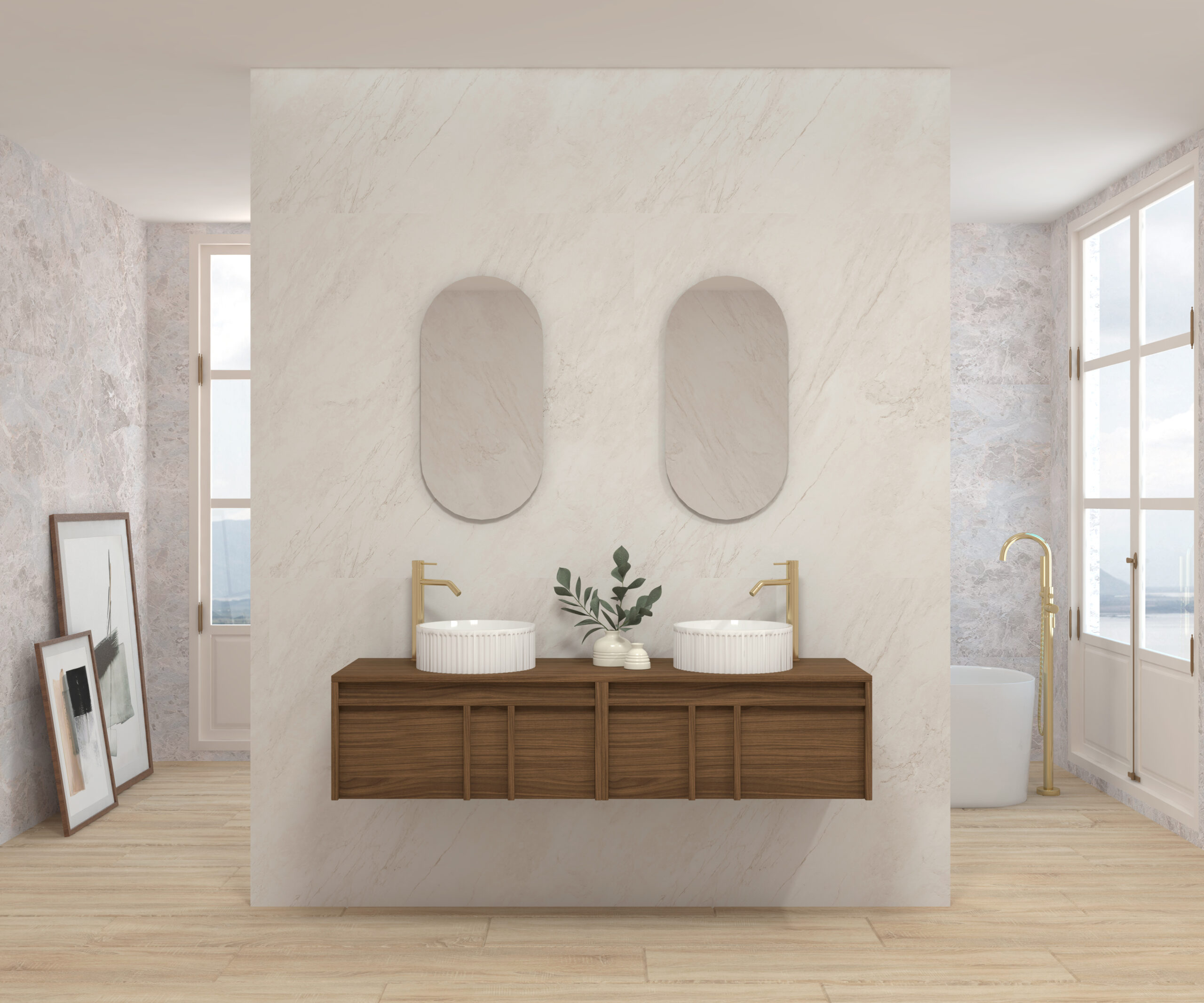 Pack composé d’un meuble suspendu, d’un lavabo et d’un miroir design capsule.