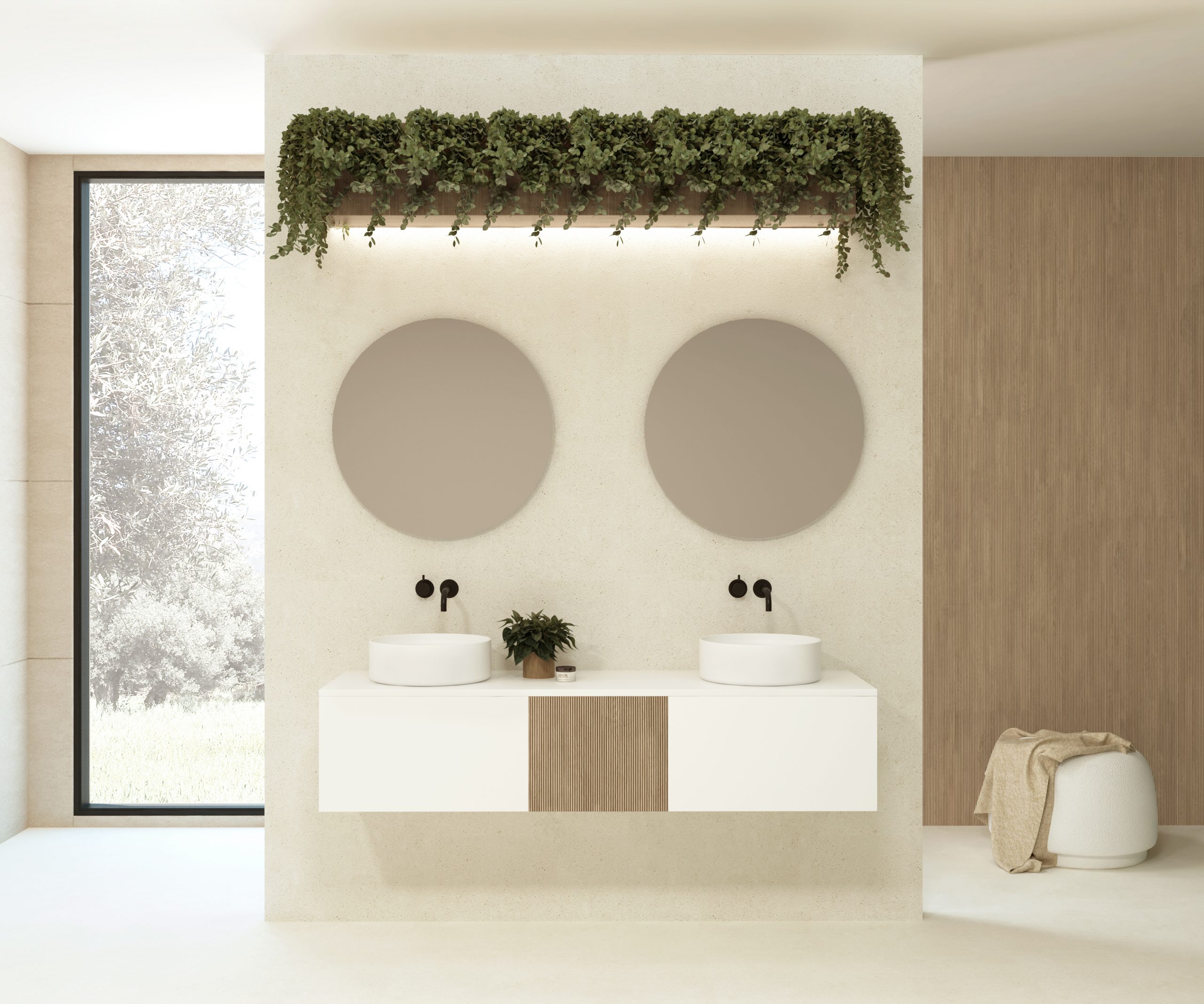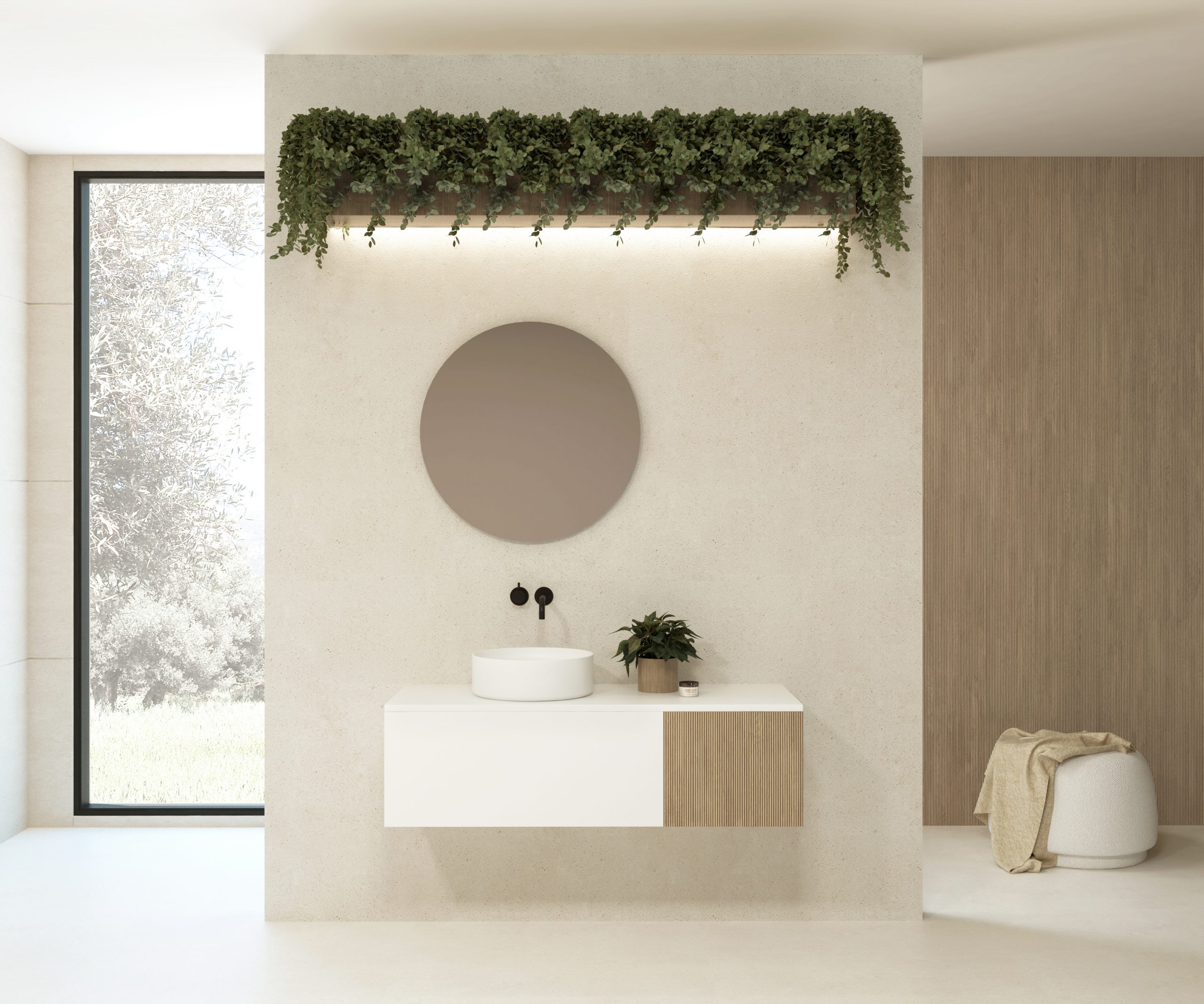 Pack composé d’un meuble sous-vasque suspendu, d’une vasque et d’un miroir circulaire.