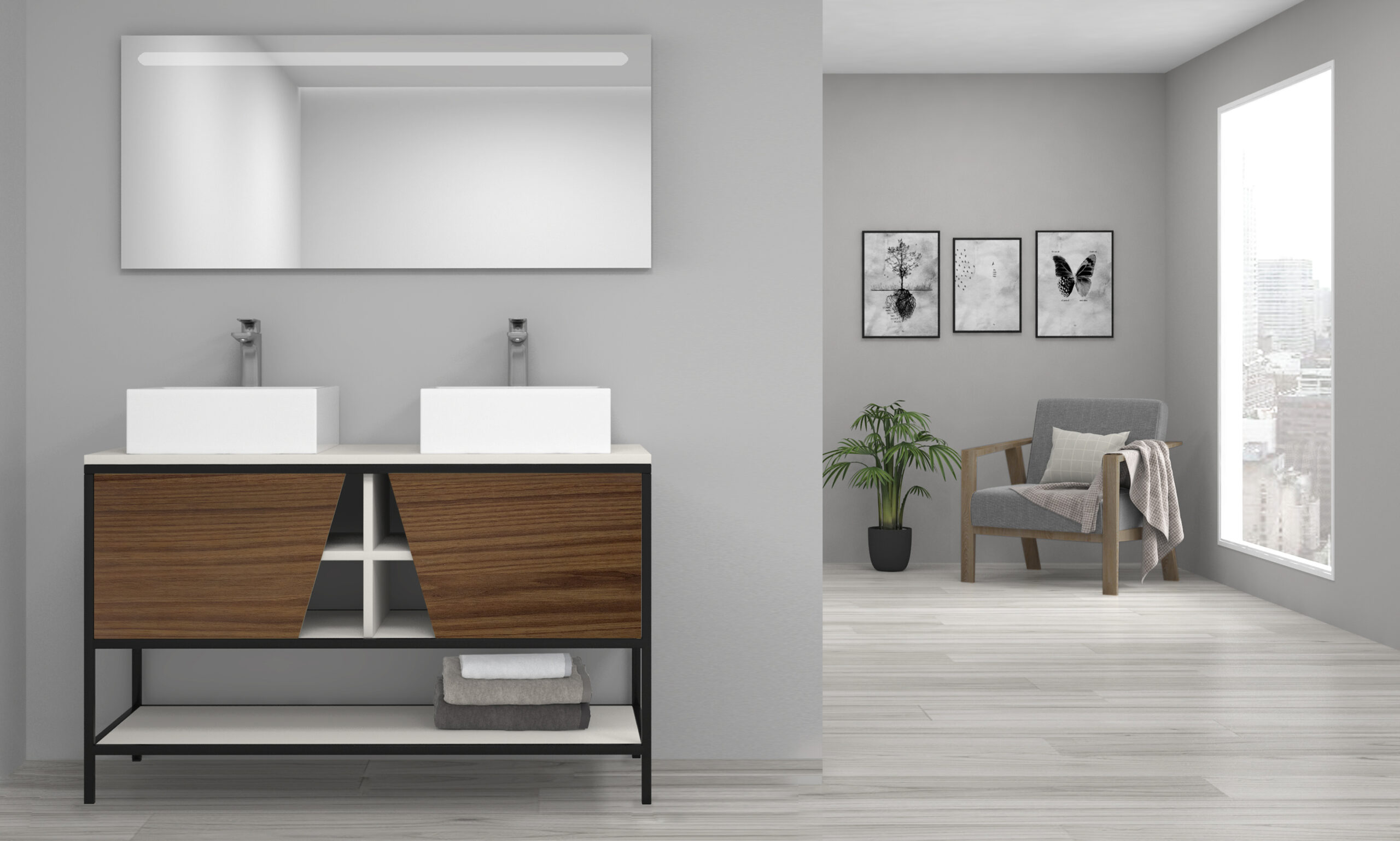 Ensemble composé de meubles de salle de bains en matériau stratifié résistant à l’eau et d’une porte stratifiée finition bois. Il se compose d’une porte avec mécanisme de fermeture en douceur, d’une étagère décorative et d’un cadre en métal noir mat. Comprend un lavabo de comptoir en céramique blanche et un miroir avec éclairage LED. Fabriqué en Espagne.
