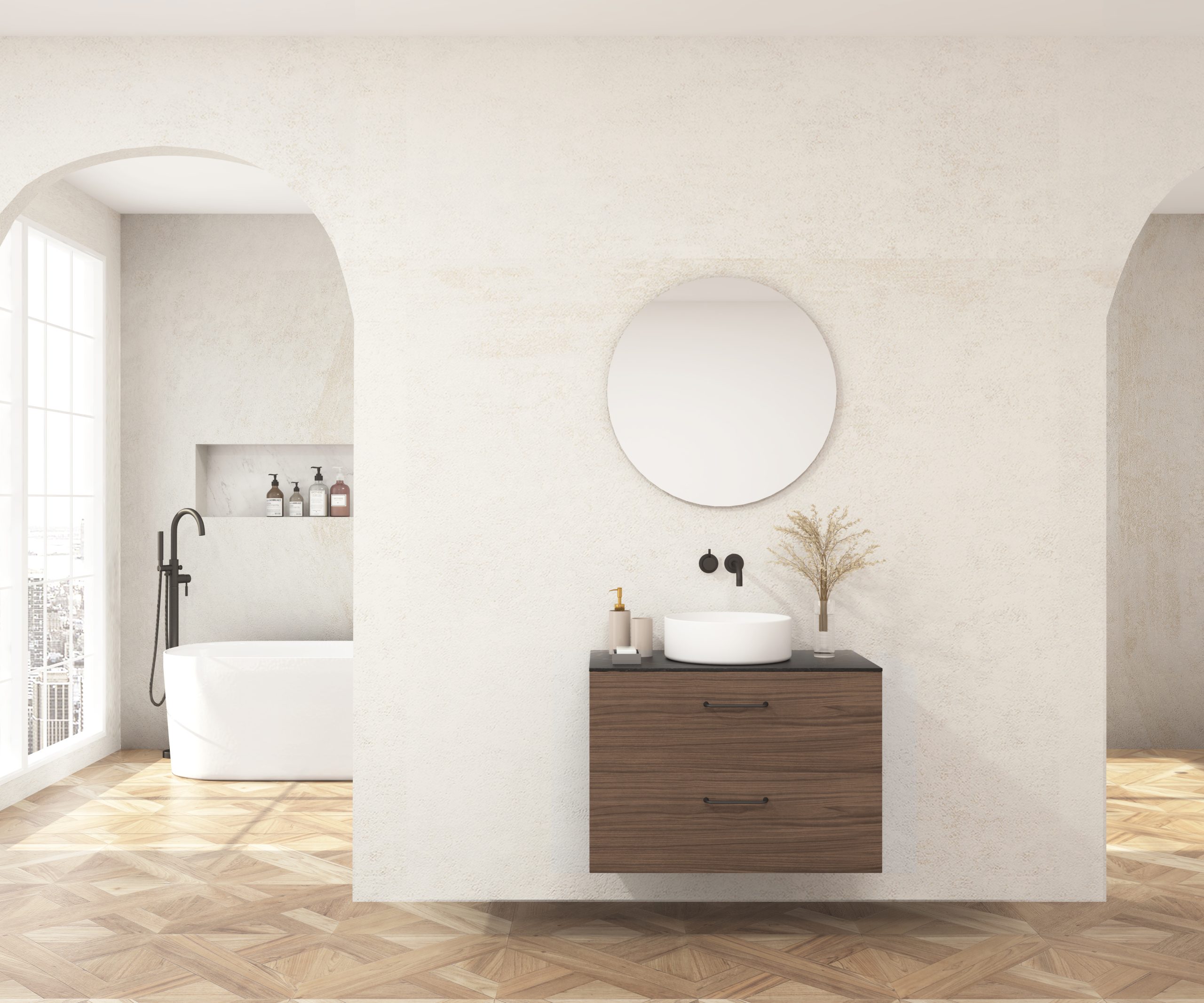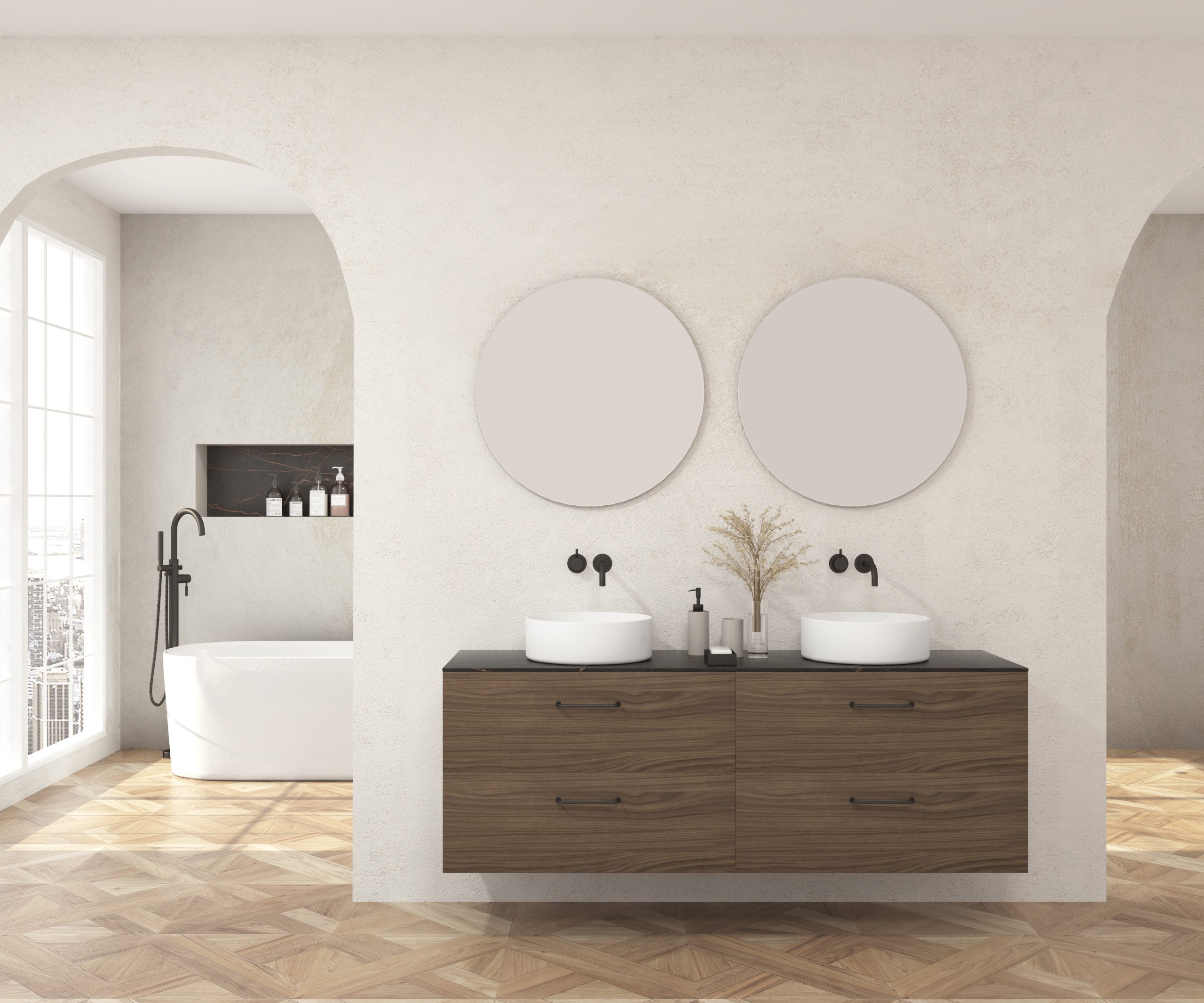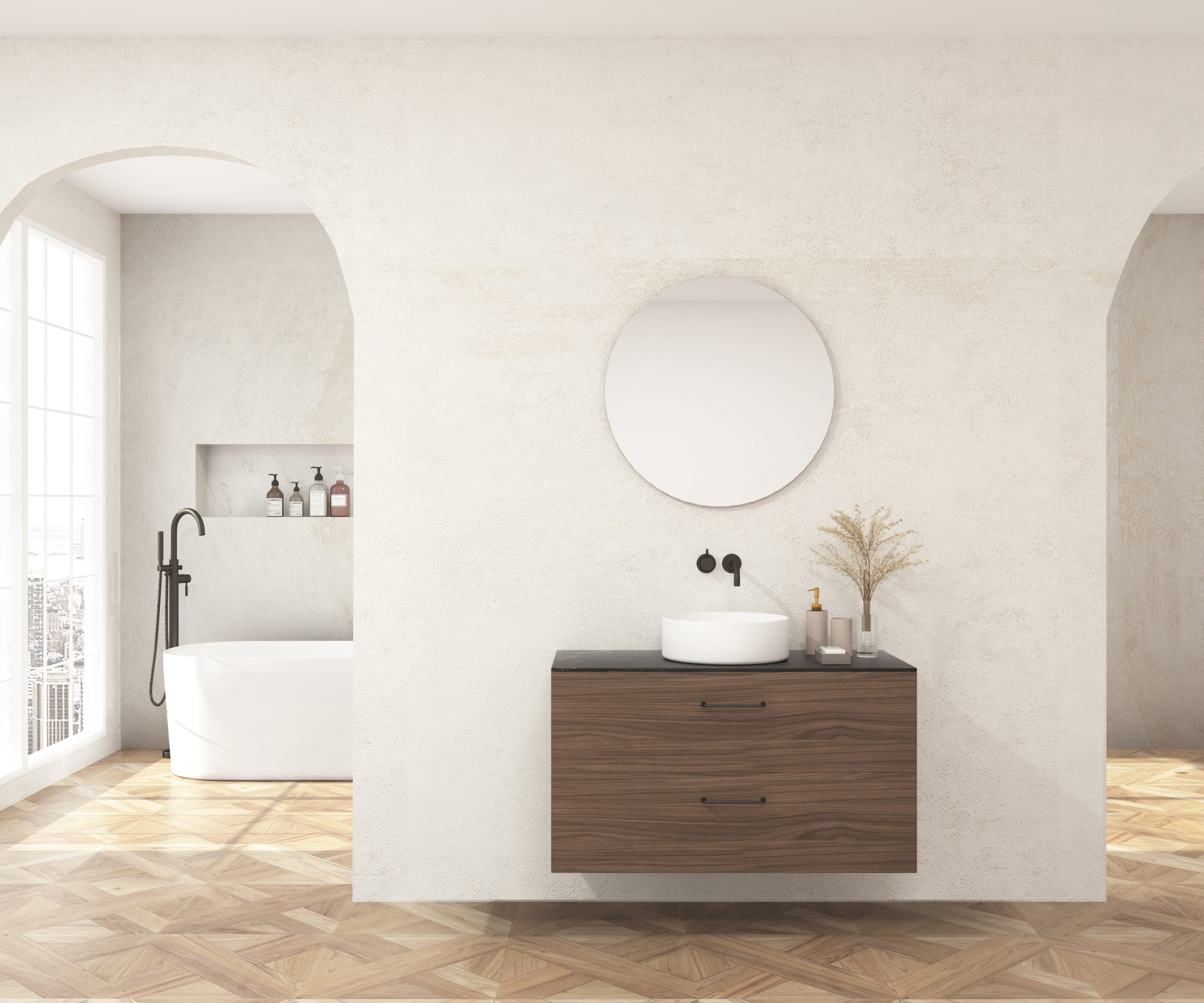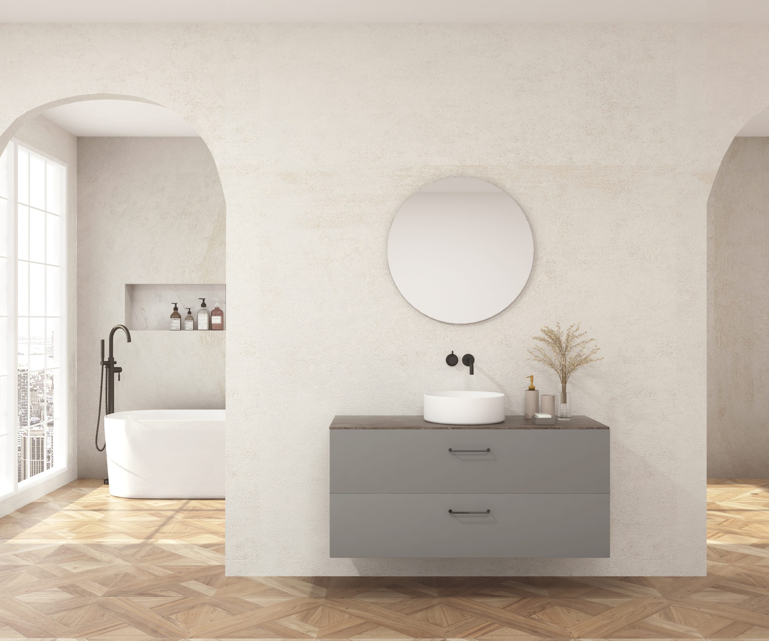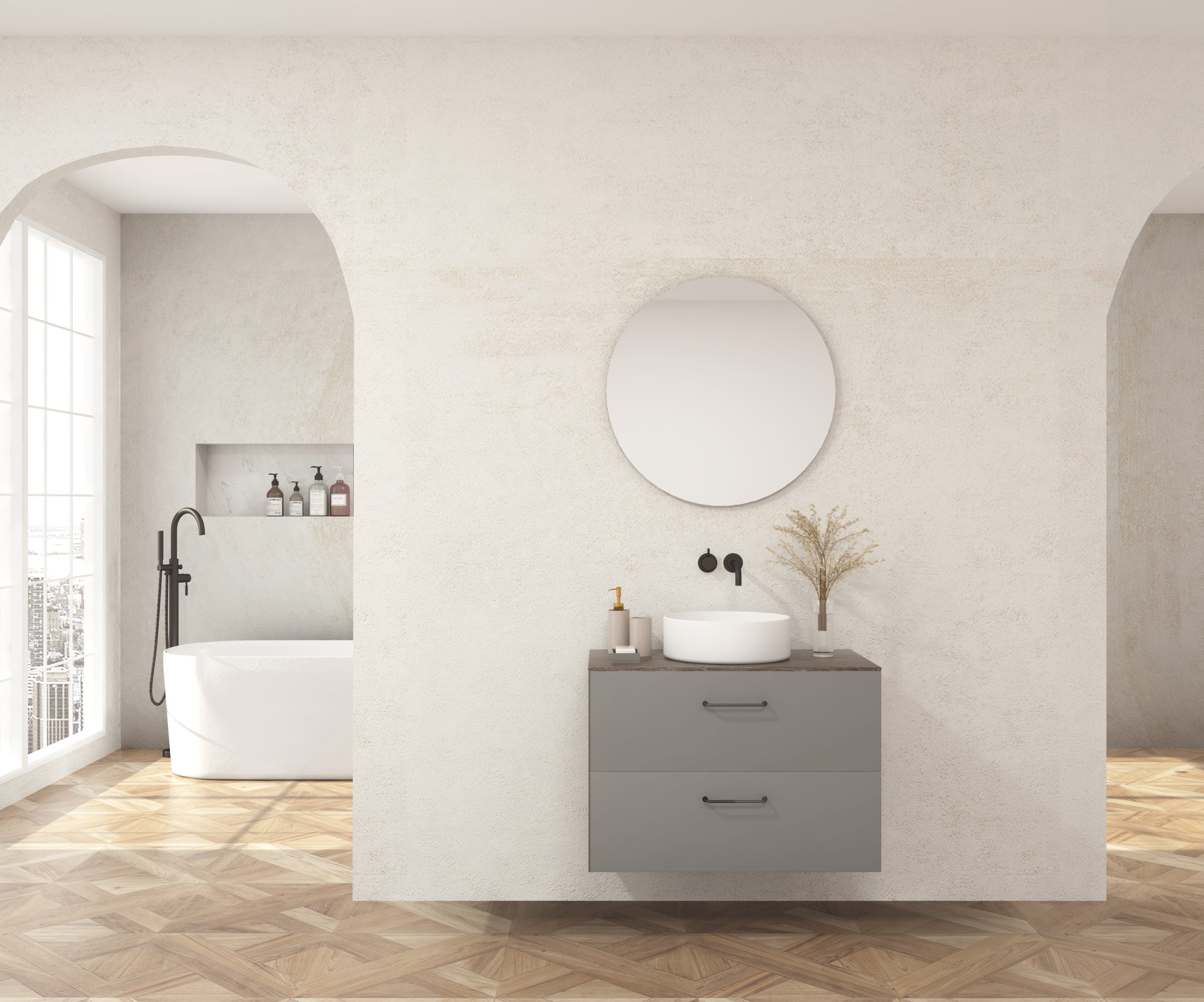 Pack composé d’un meuble suspendu pour lavabo, d’un plan de travail en matériau Dekton de Cosentino, d’un lavabo et d’un miroir circulaire.