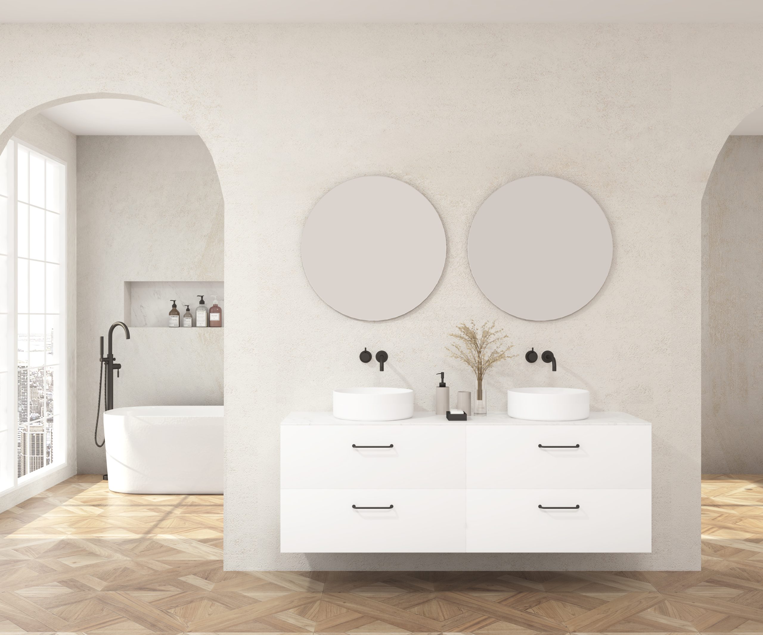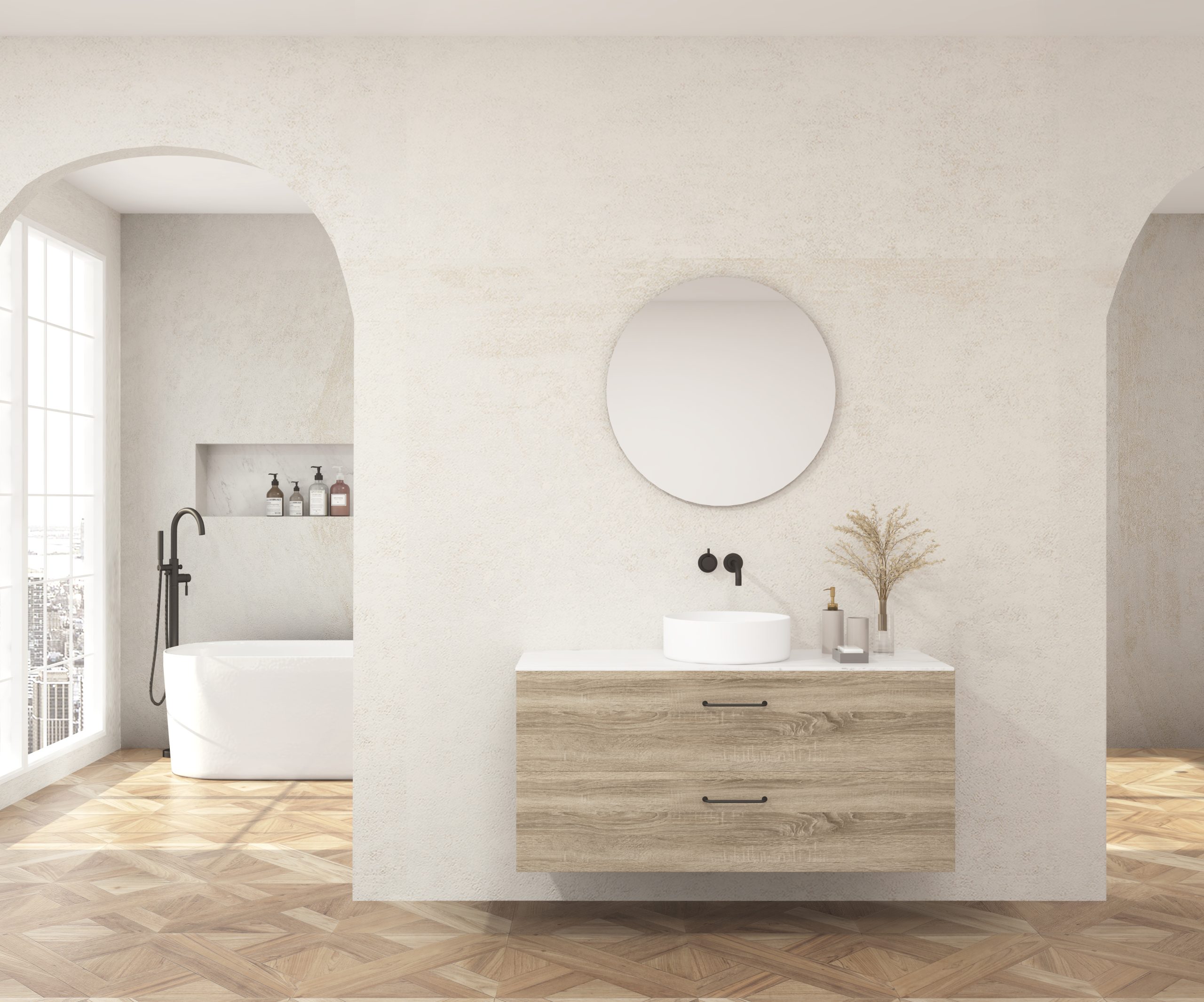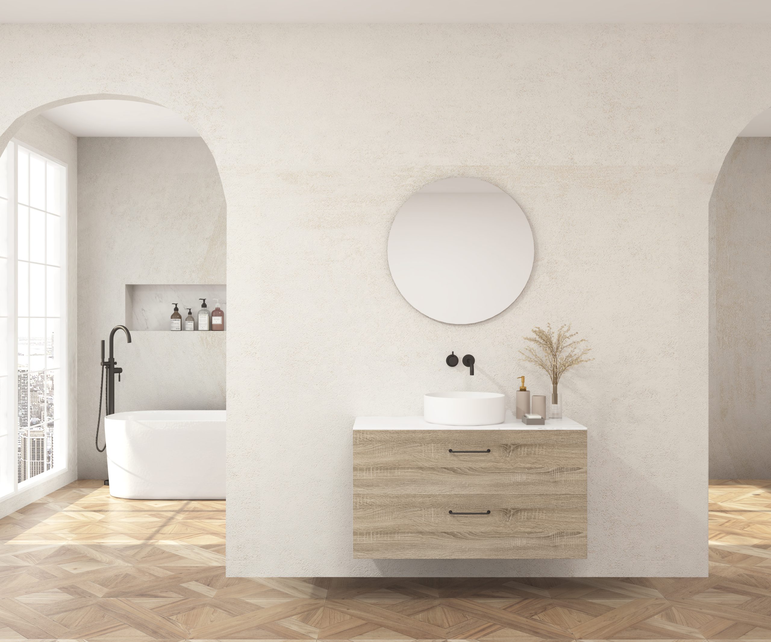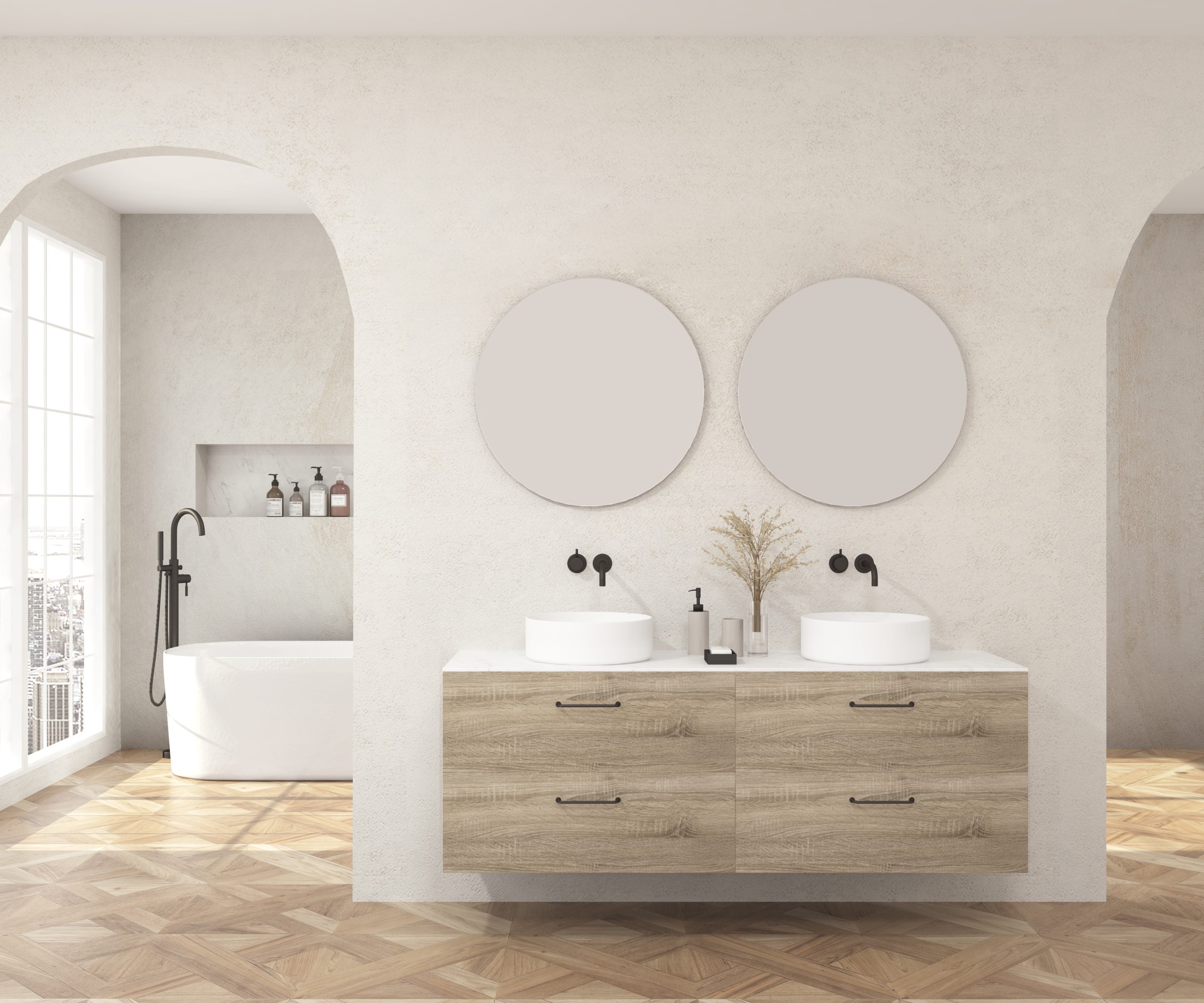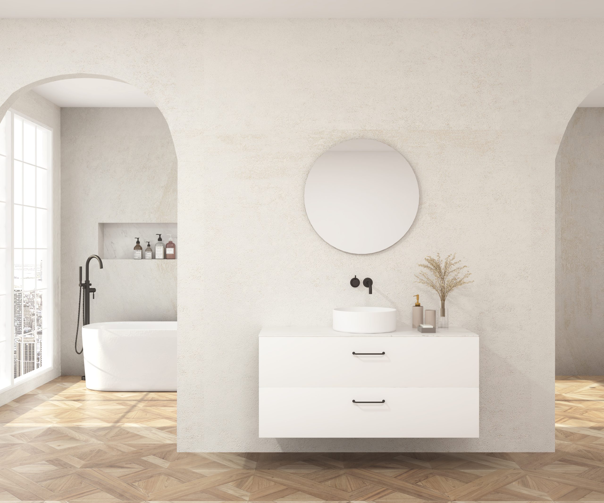 Pack composé d’un meuble suspendu pour lavabo, d’un plan de travail en matériau Dekton de Cosentino, d’un lavabo et d’un miroir circulaire.