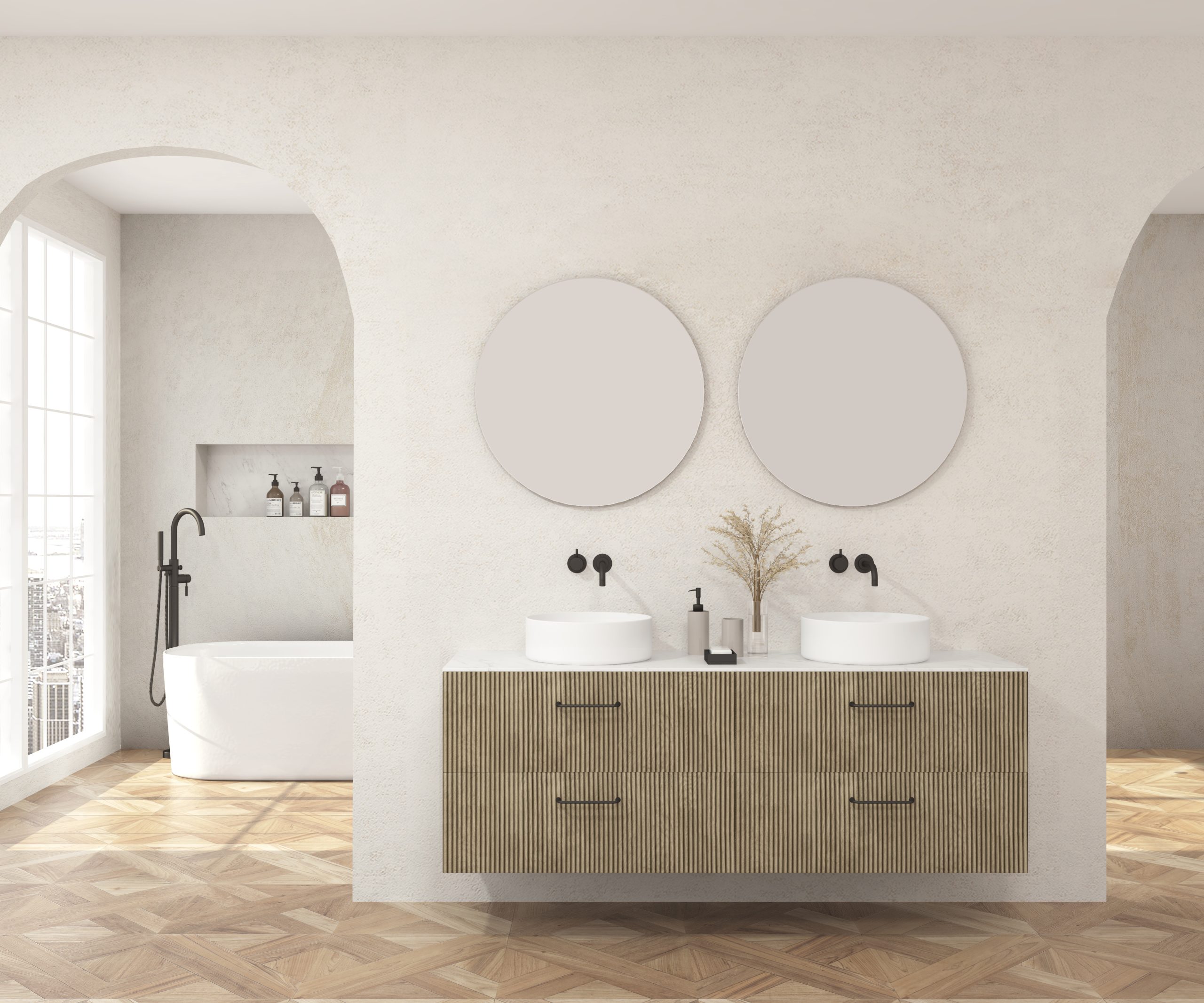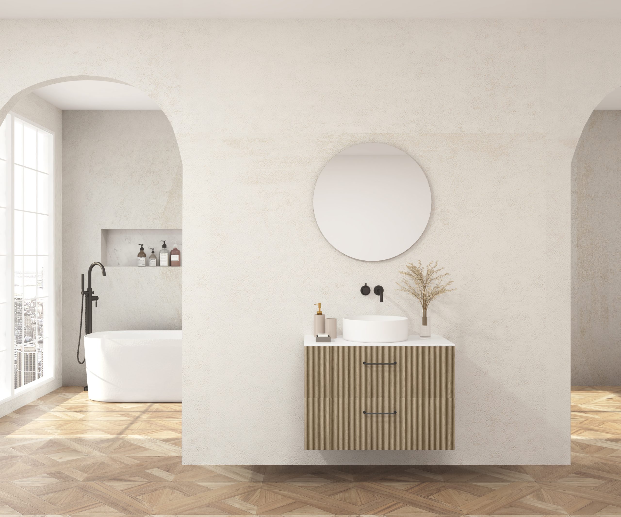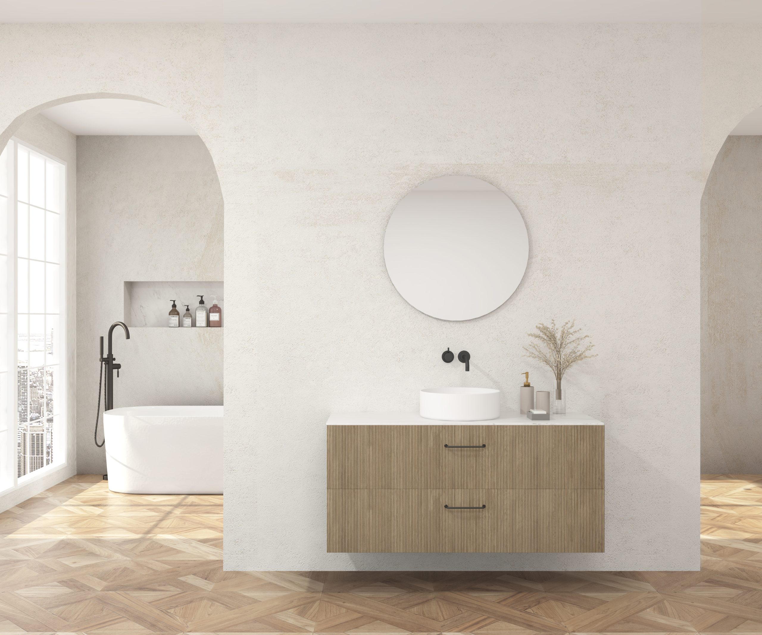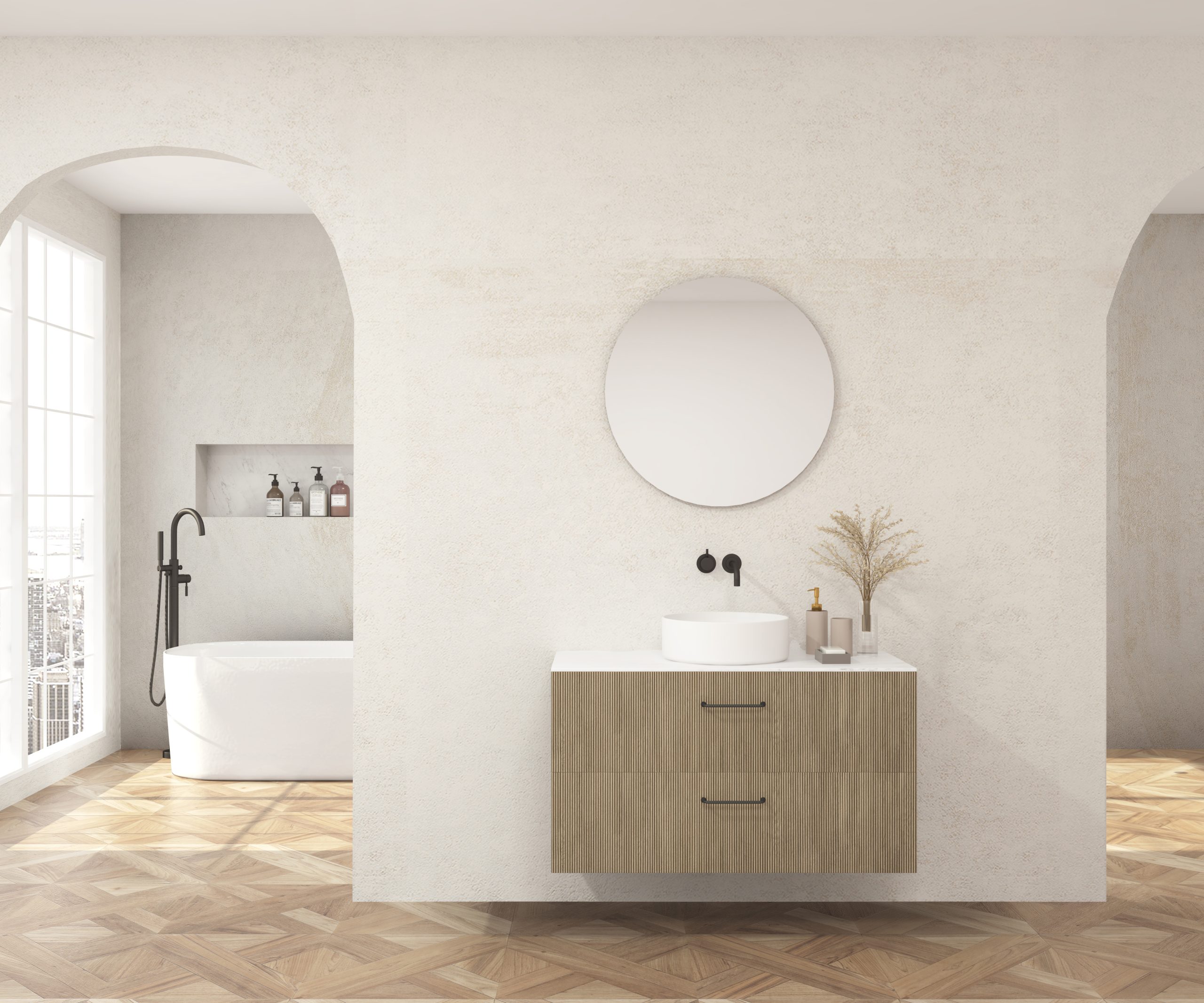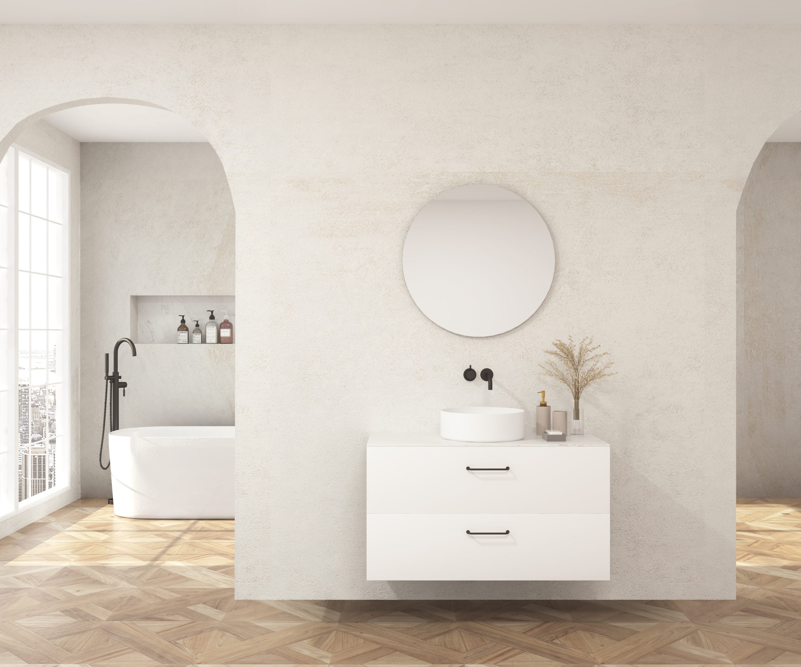 Pack composé d’un meuble suspendu pour lavabo, d’un plan de travail en matériau Dekton de Cosentino, d’un lavabo et d’un miroir circulaire.