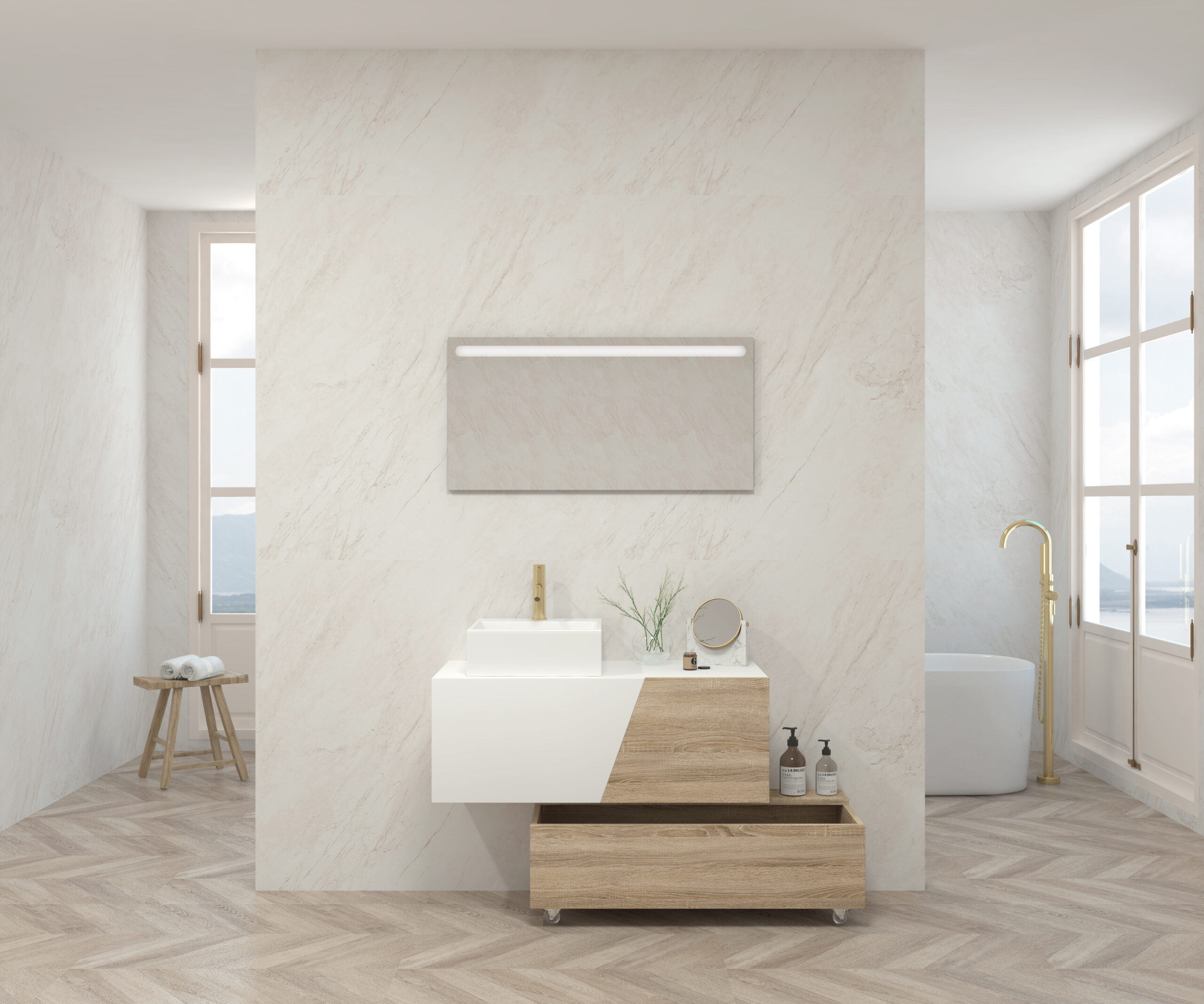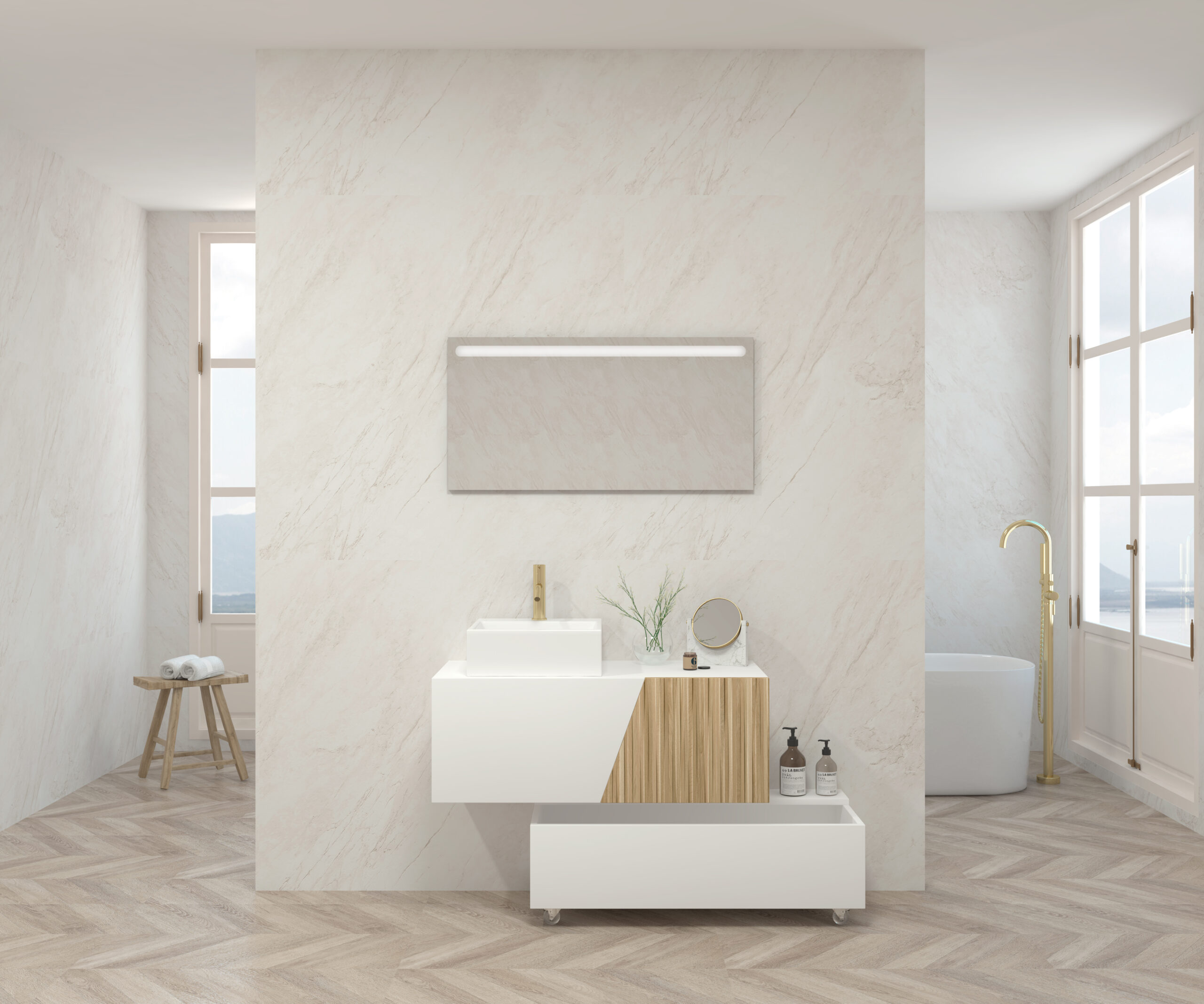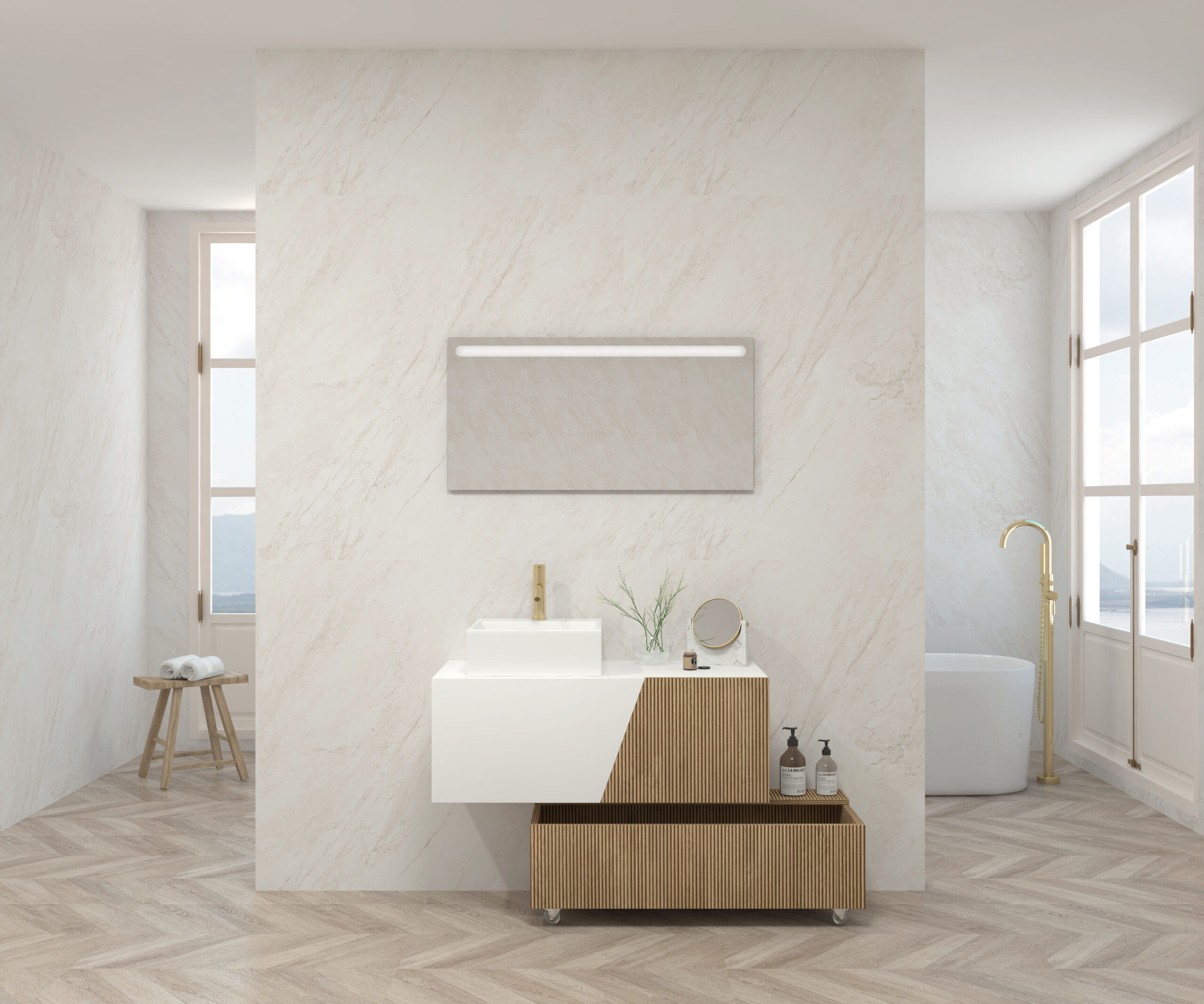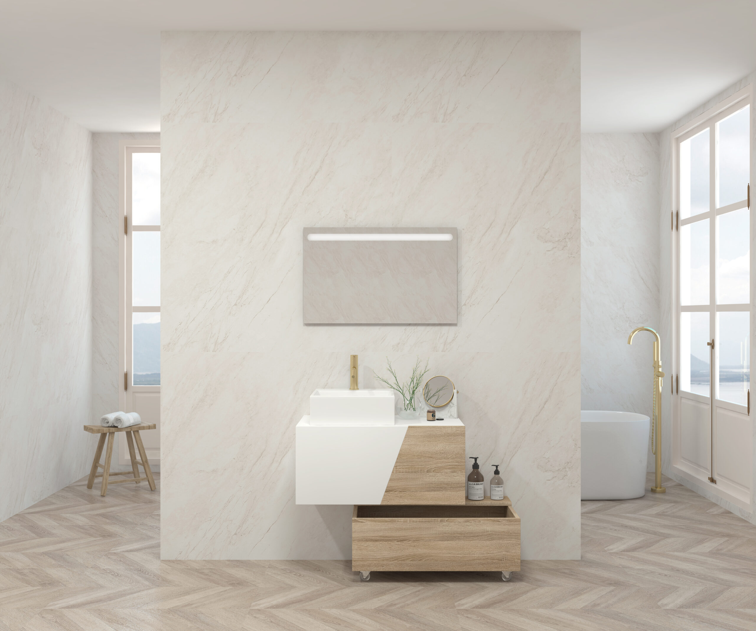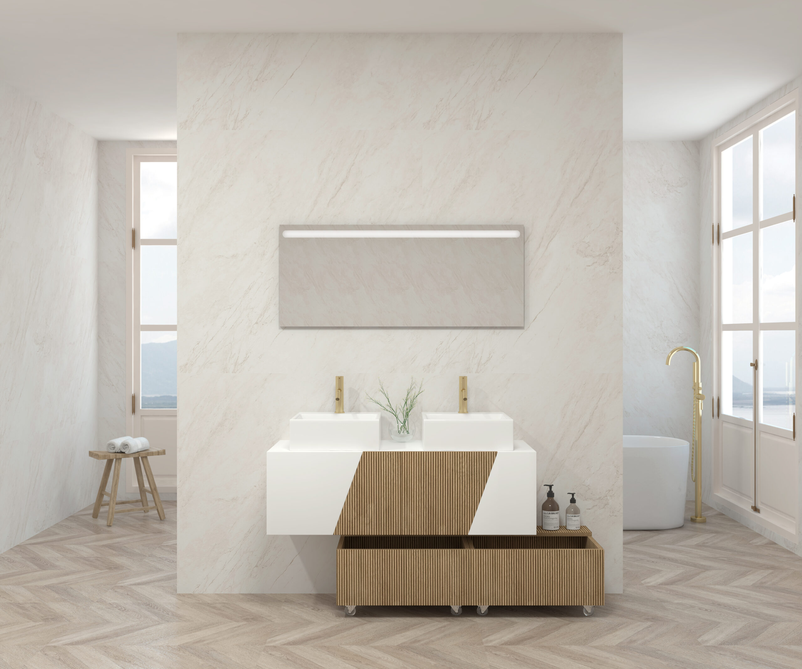 Pack composé d’un meuble de salle de bain suspendu pour lavabo, d’un lavabo en céramique, d’un miroir LED et d’un meuble bas auxiliaire à roulettes.