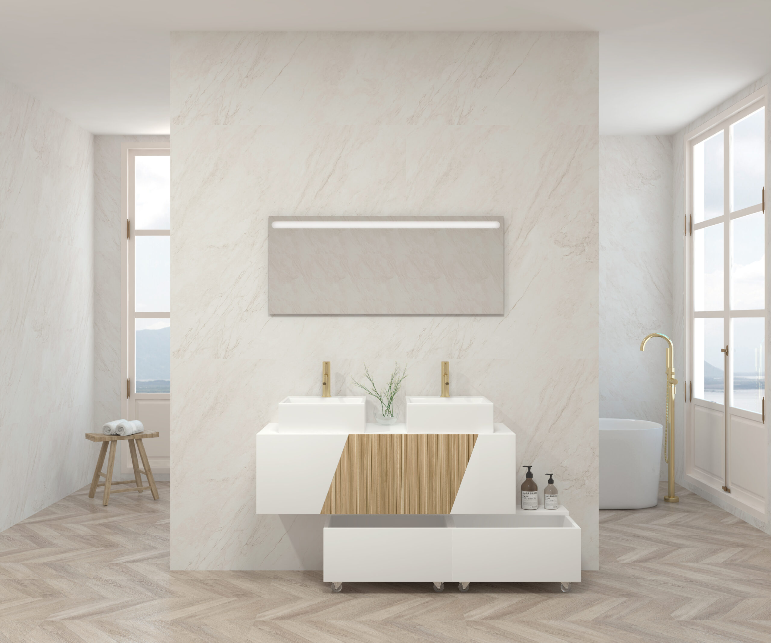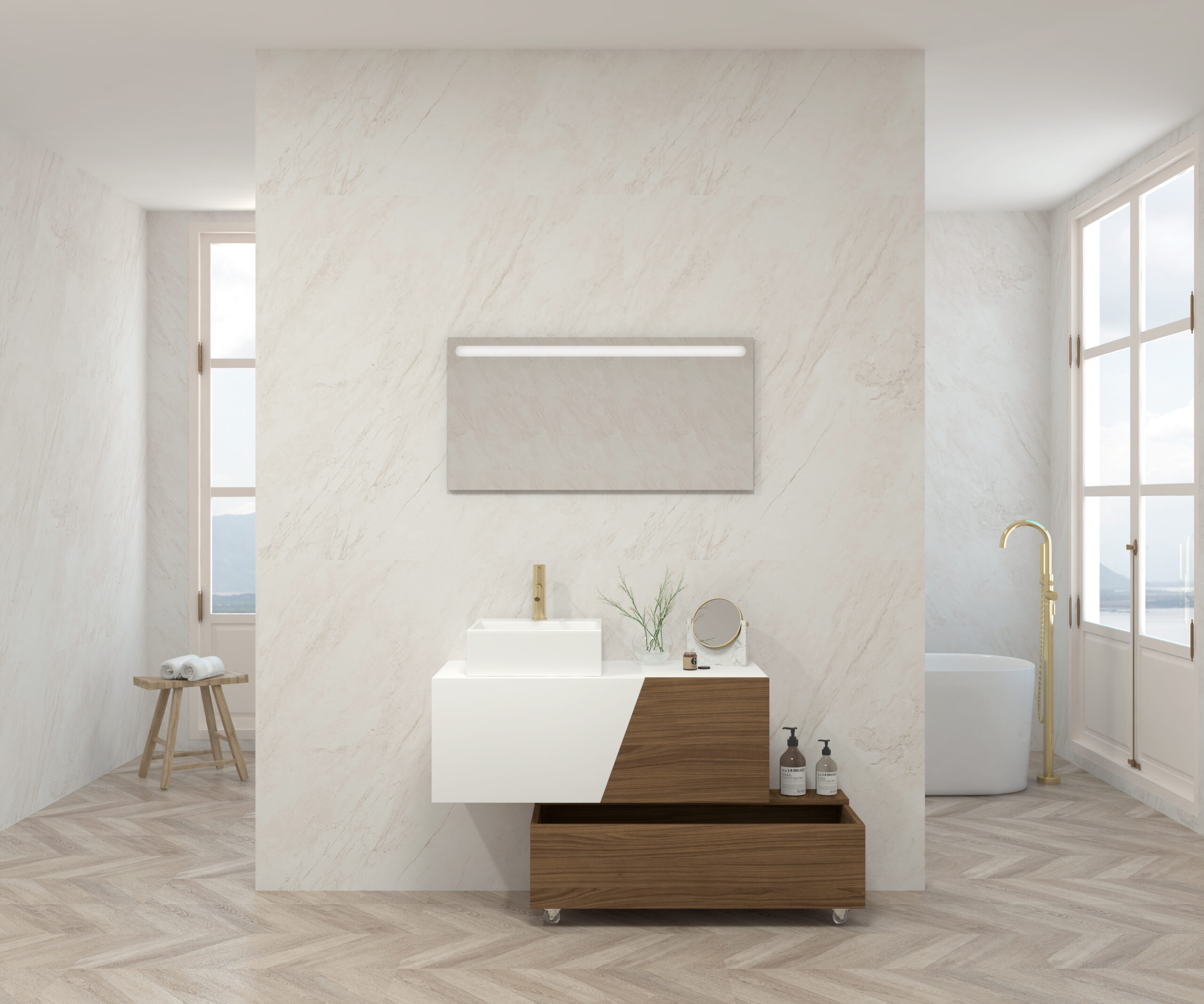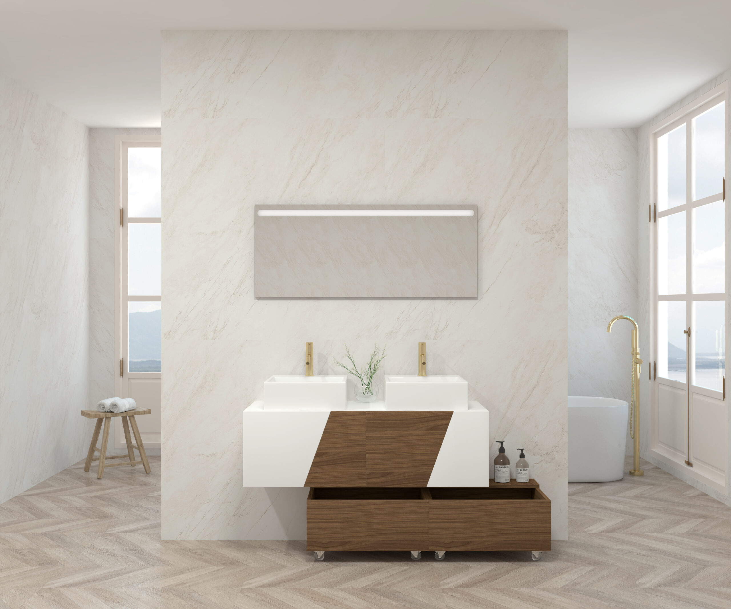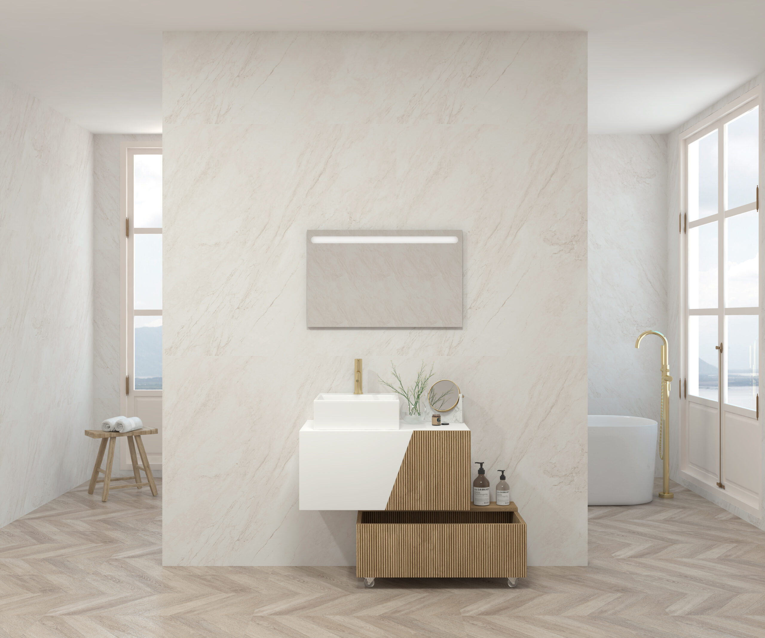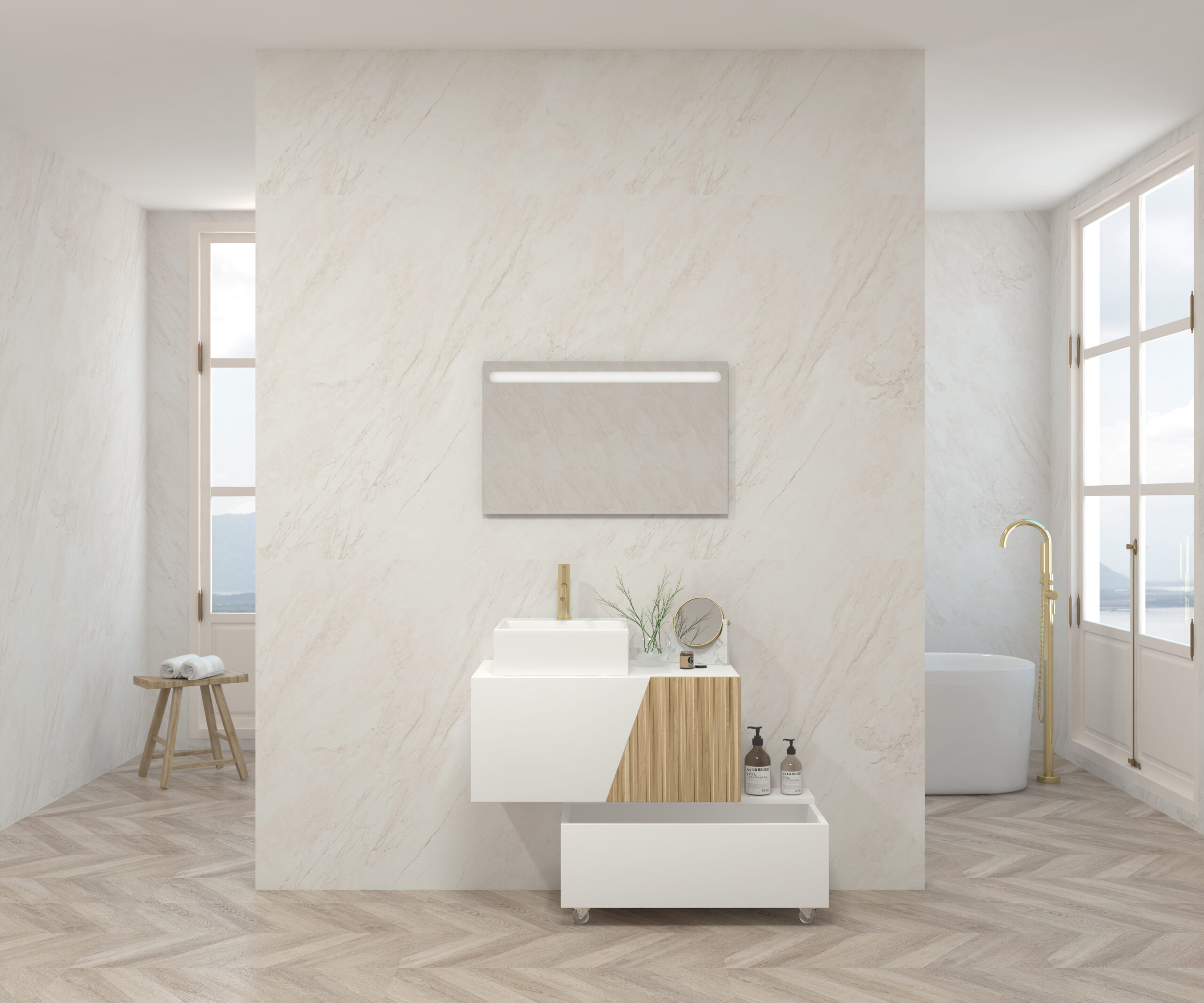 Pack composé d’un meuble de salle de bain suspendu pour lavabo, d’un lavabo en céramique, d’un miroir LED et d’un meuble bas auxiliaire à roulettes.