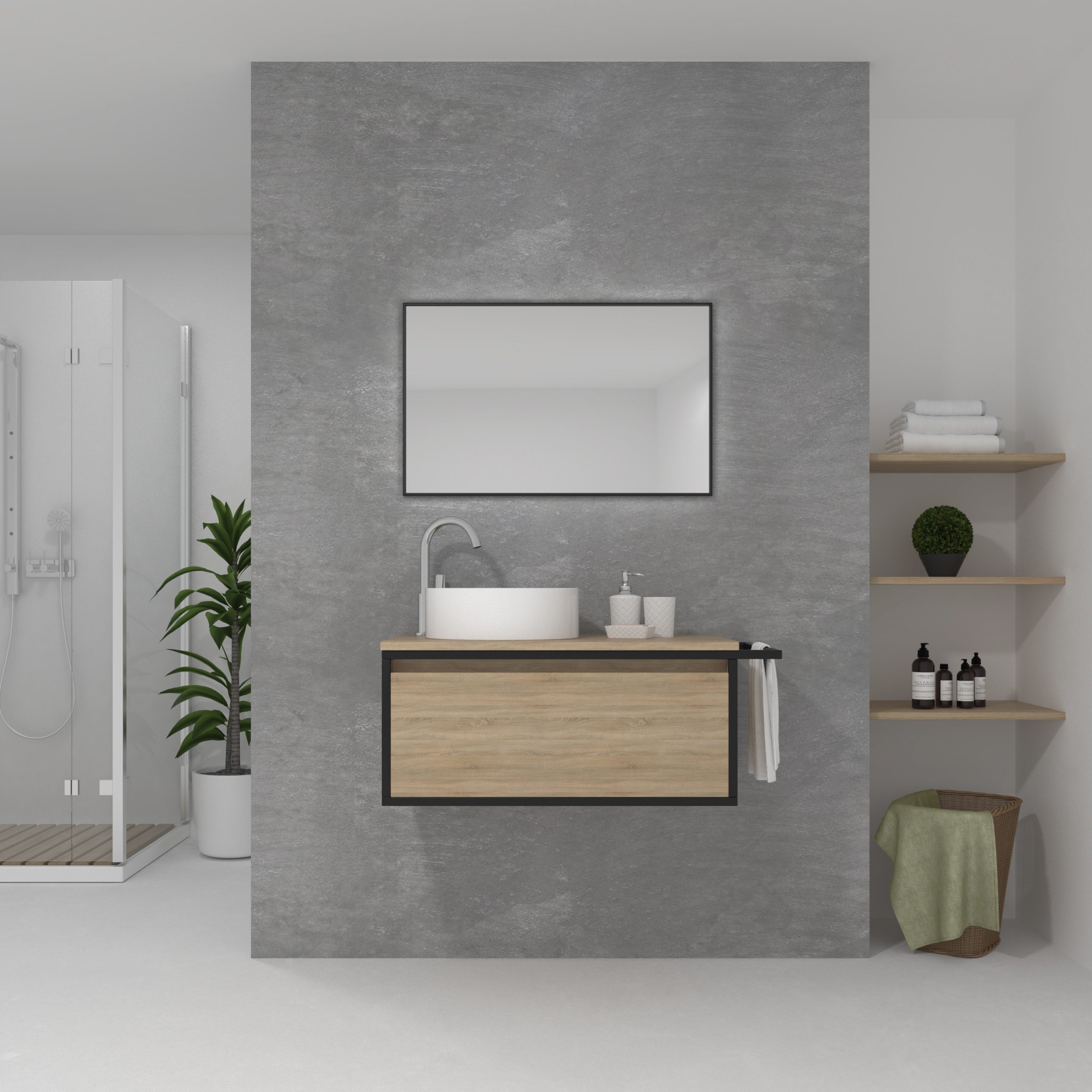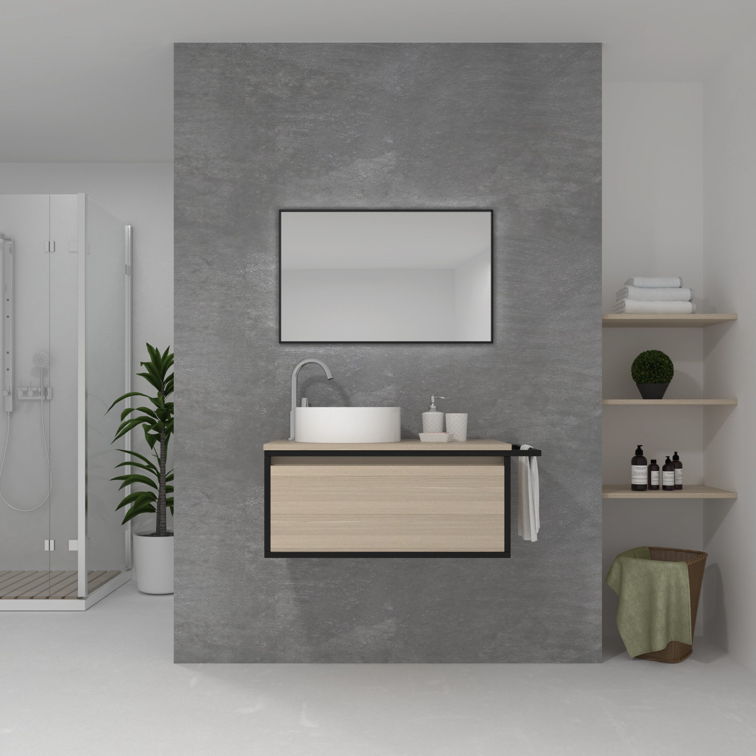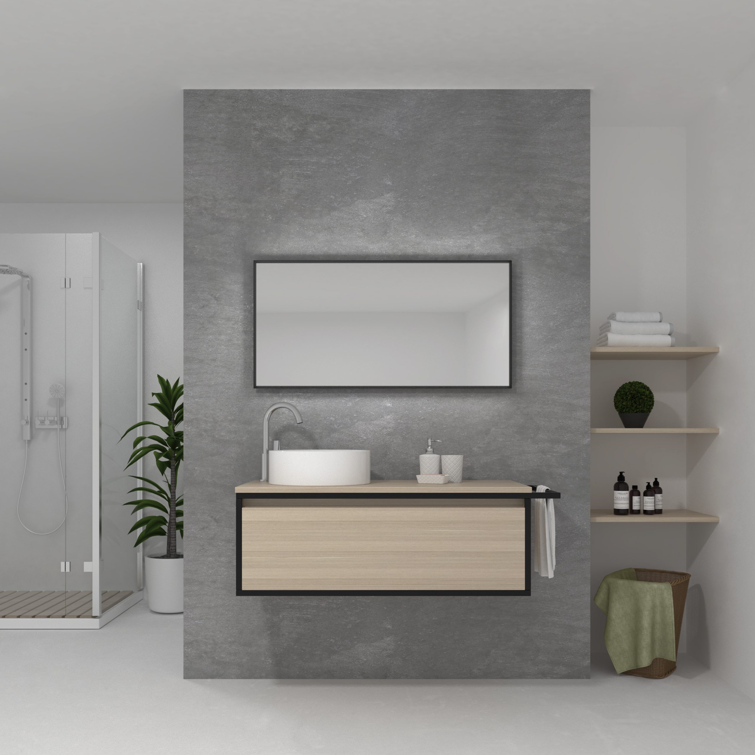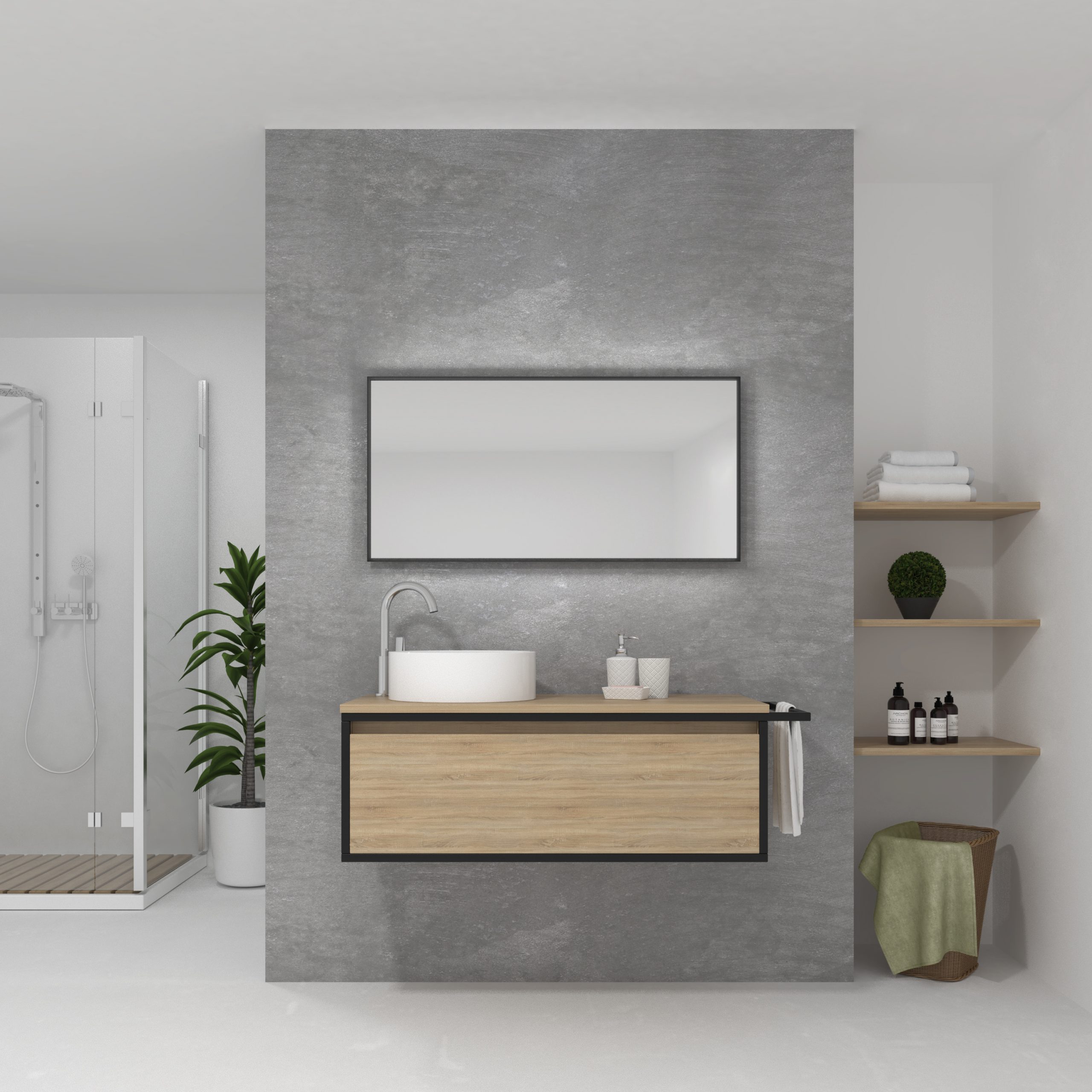 Pack compuesto por mueble de baño fabricado en tablero de partículas laminado de 19mm acabado madera con un cajón de gran capacidad, cierre suave y extracción total y estructura metálica negra con toallero integrado. Lavabo sobreencimera cerámica blanco. Espejo con iluminación LED y perfil negro. Fabricado en España. Grifo no incluido.
