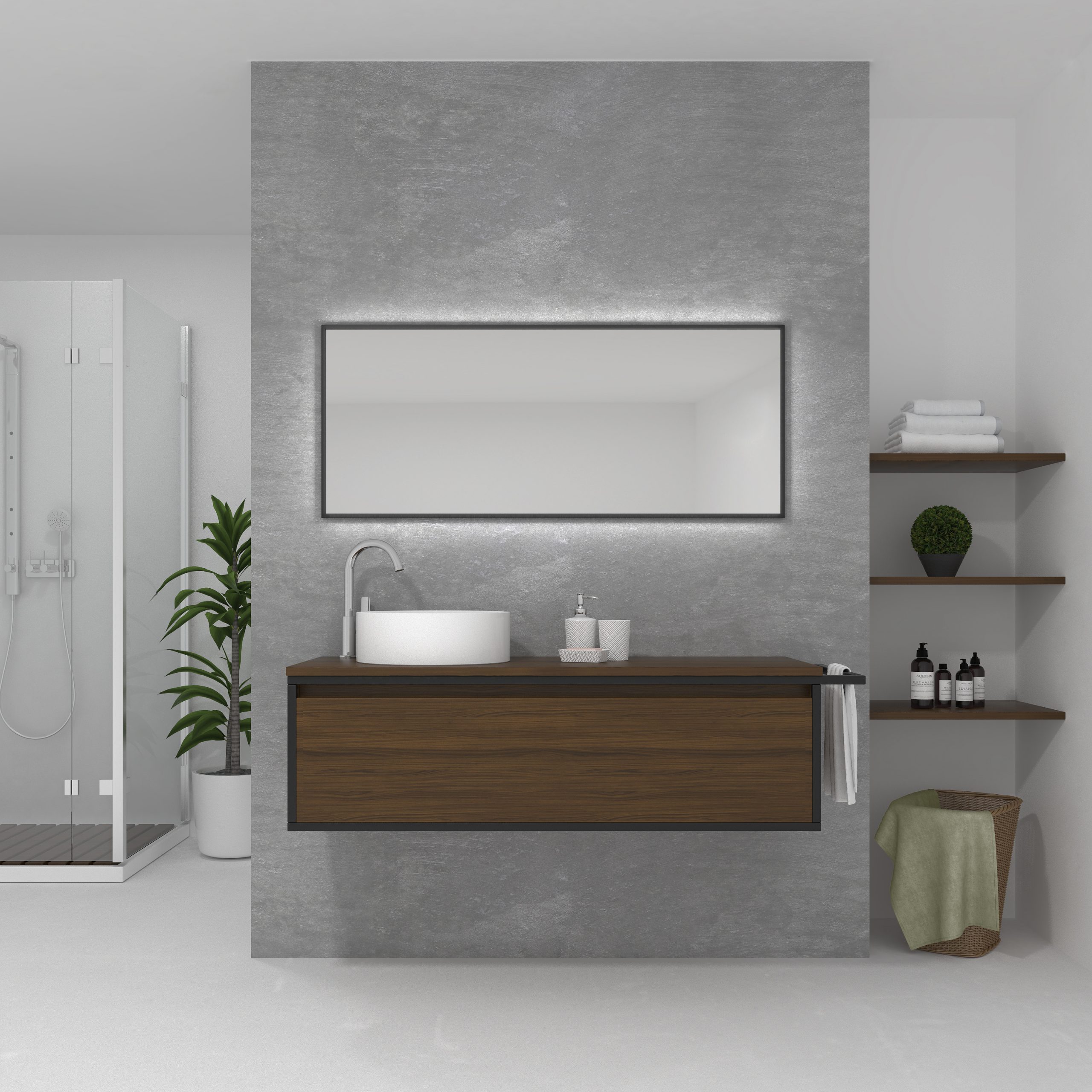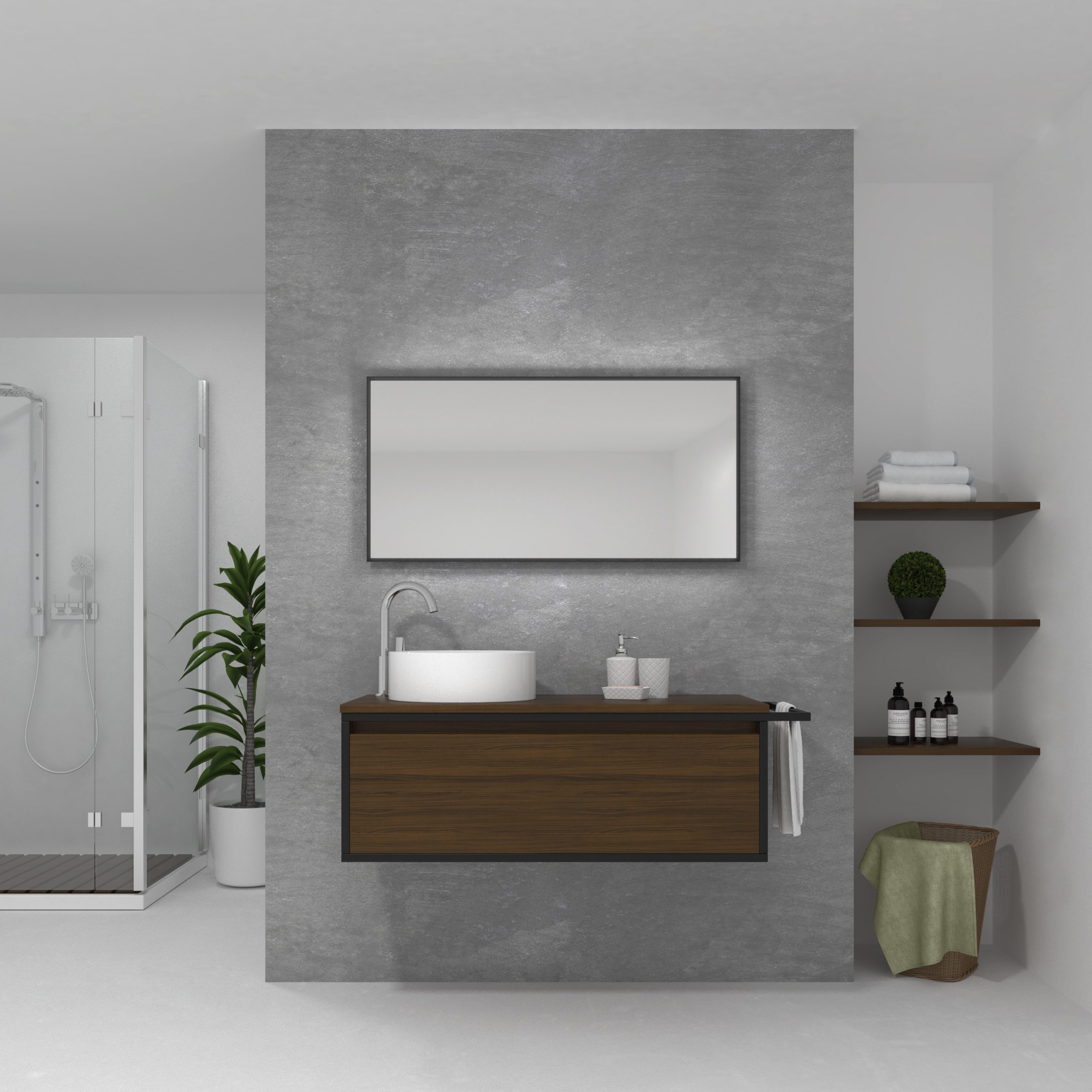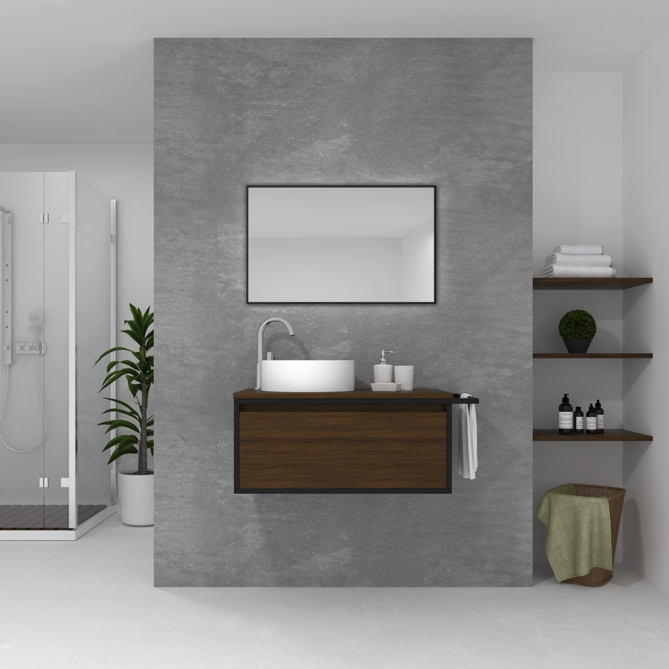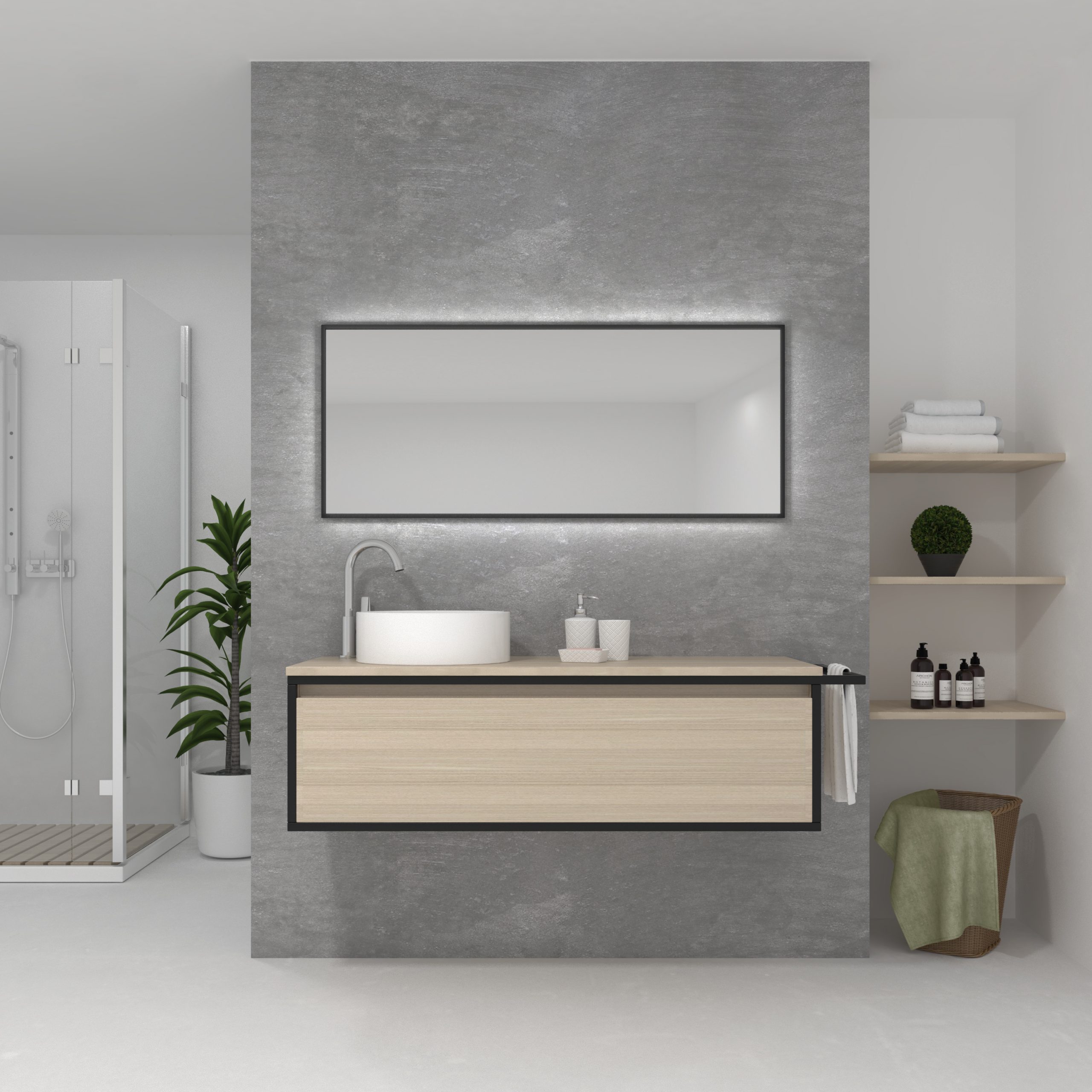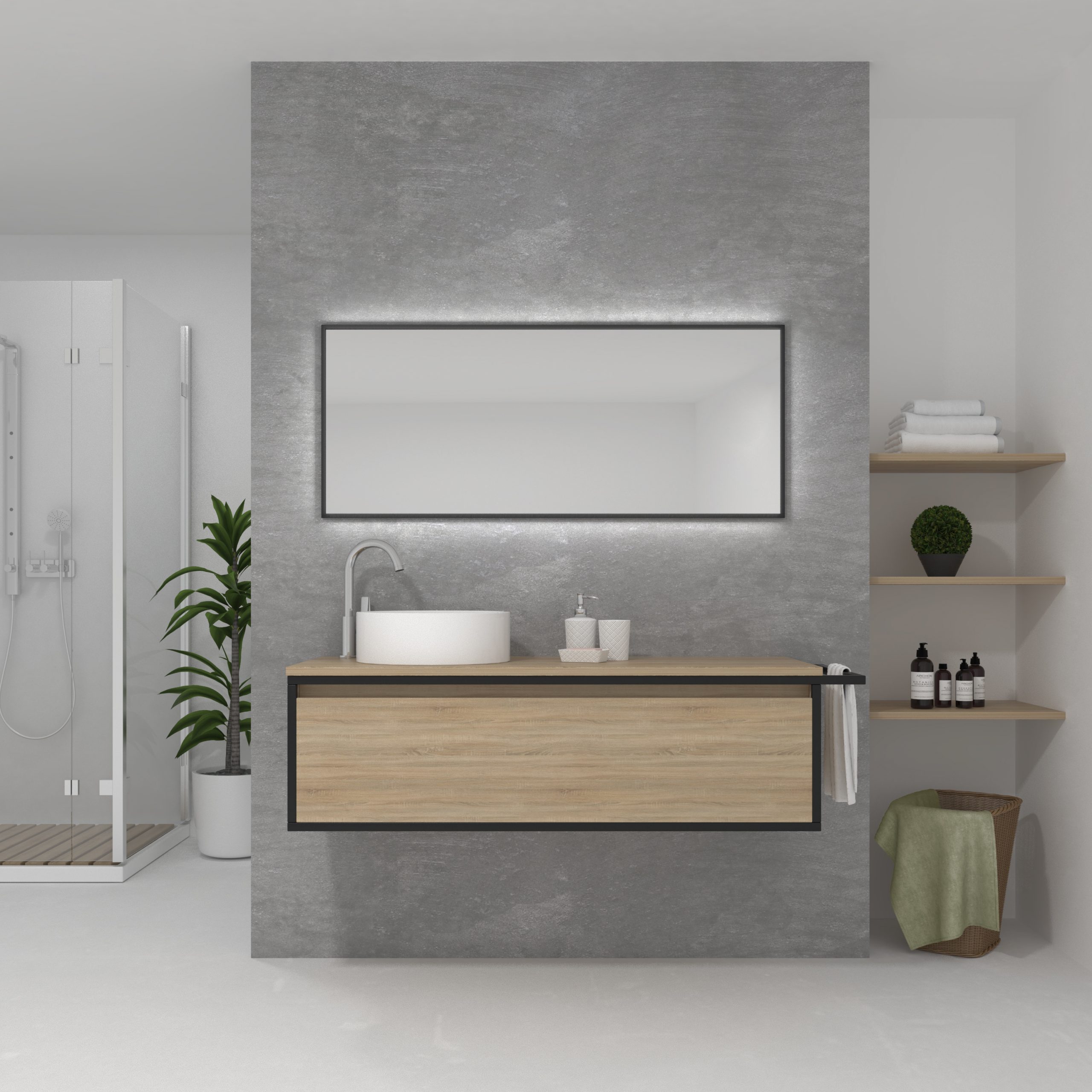 Pack compuesto por mueble de baño fabricado en tablero de partículas laminado de 19mm acabado madera con un cajón de gran capacidad, cierre suave y extracción total y estructura metálica negra con toallero integrado. Lavabo sobreencimera cerámica blanco. Espejo con iluminación LED y perfil negro. Fabricado en España. Grifo no incluido.