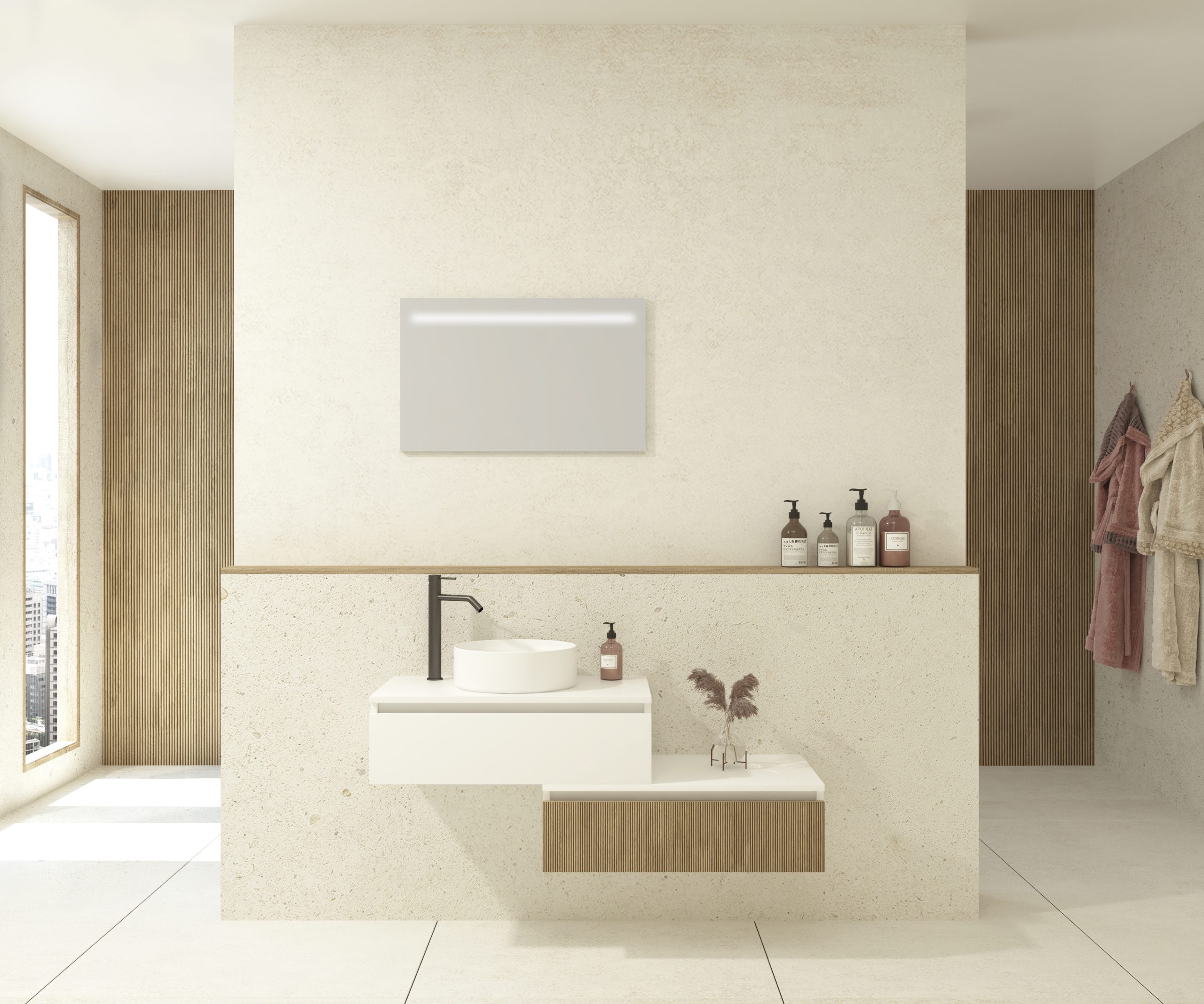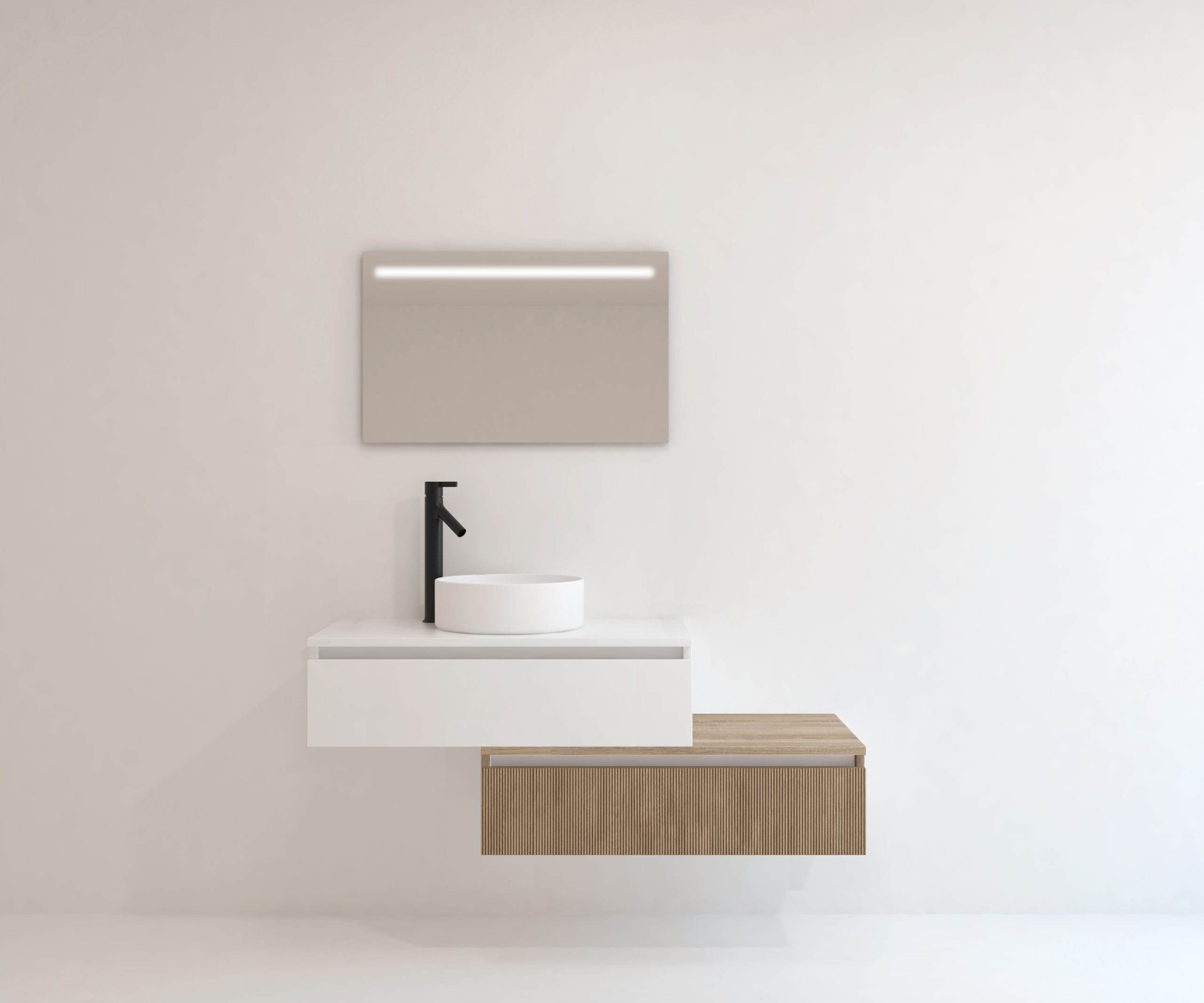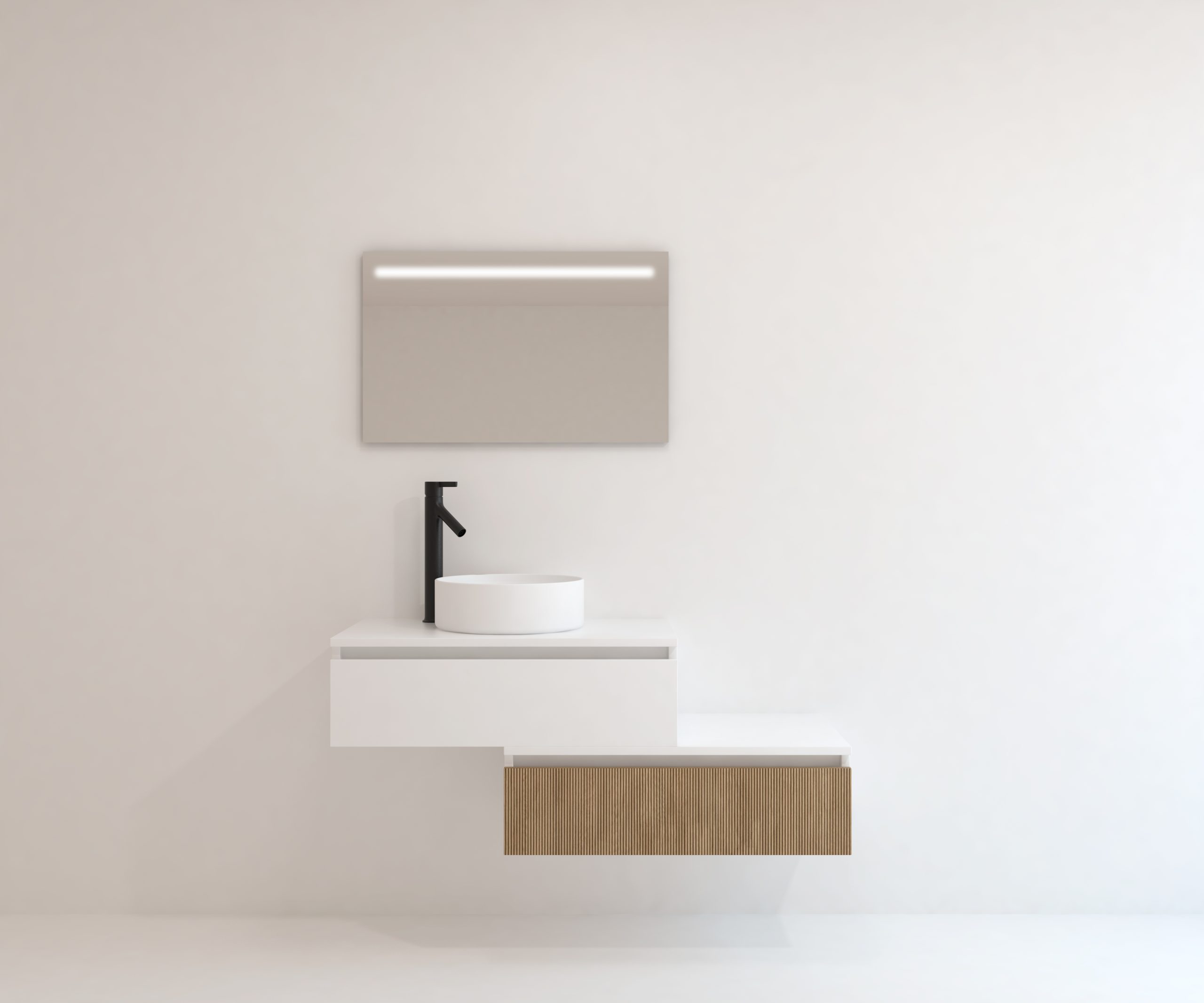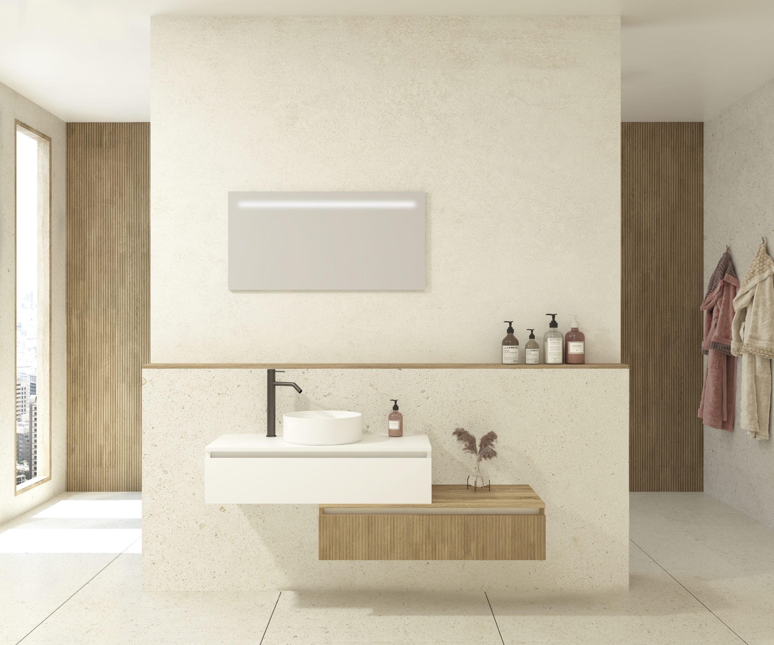 Ensemble composé d’un meuble sous-vasque suspendu, d’une vasque et d’un miroir avec éclairage LED.
