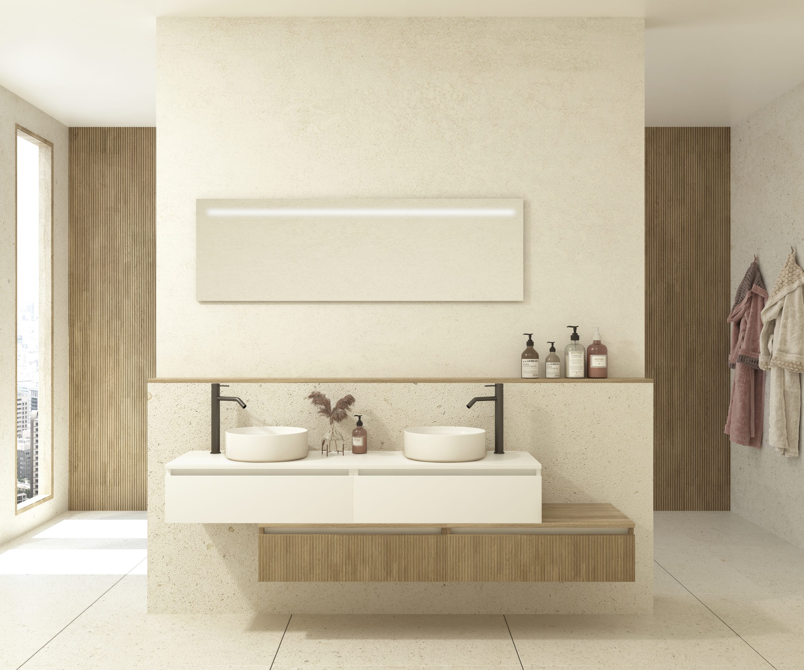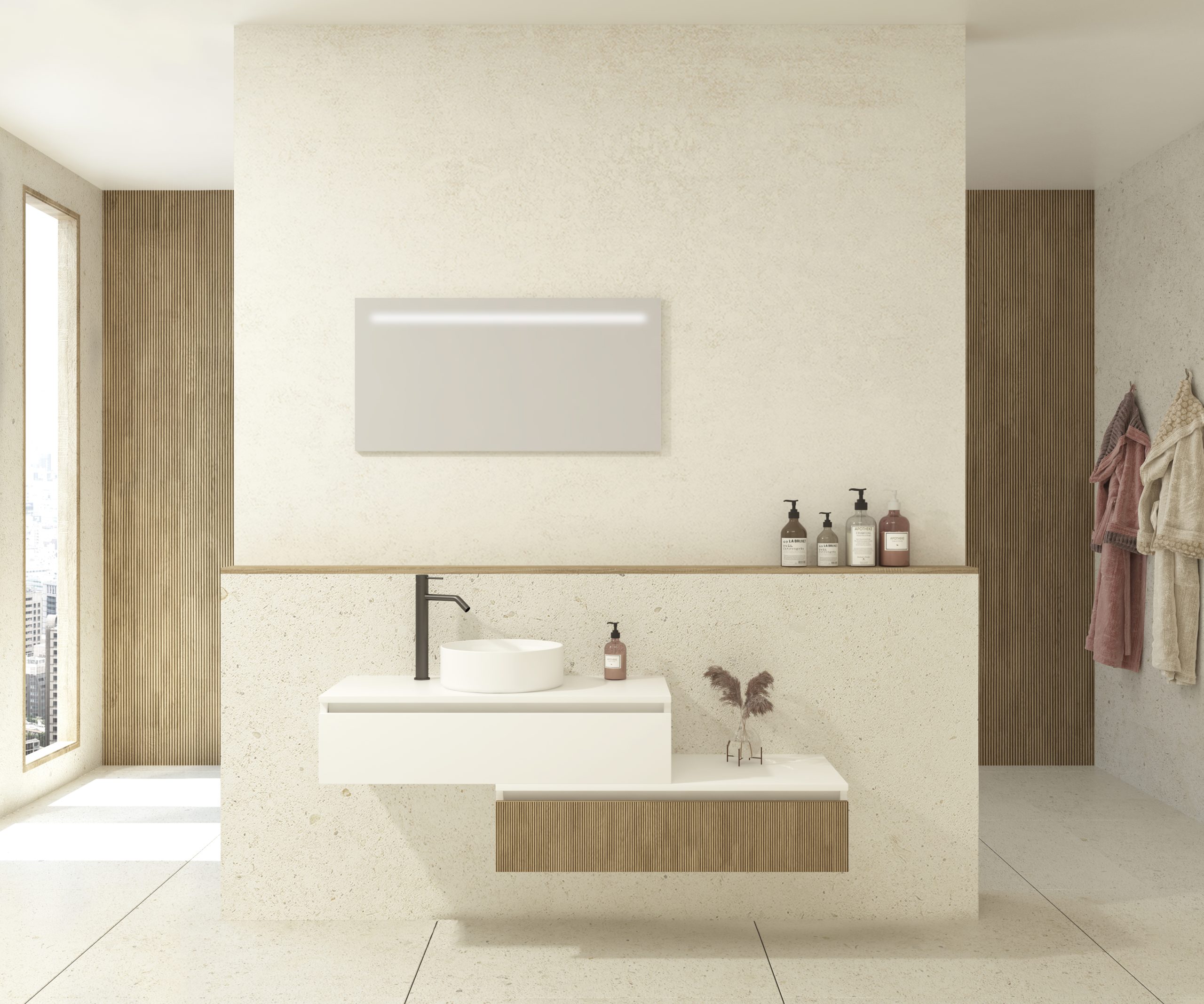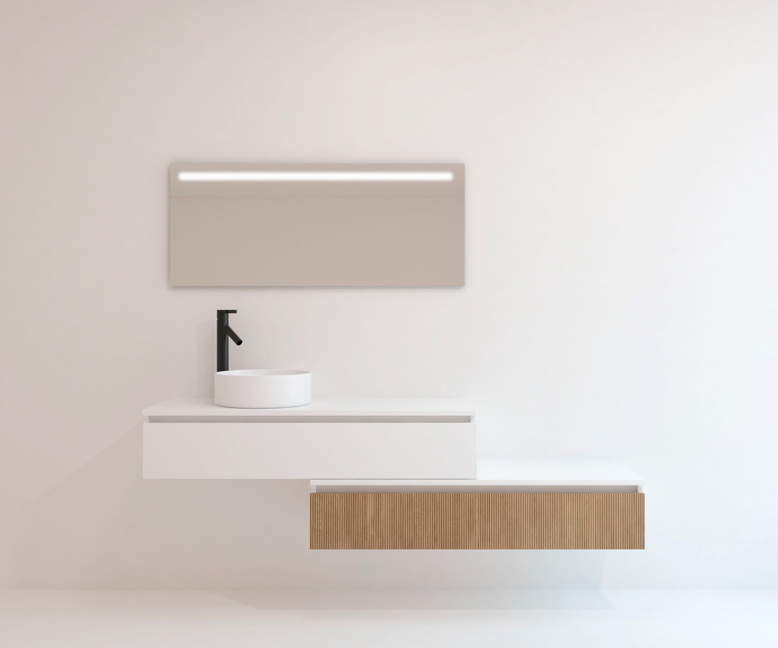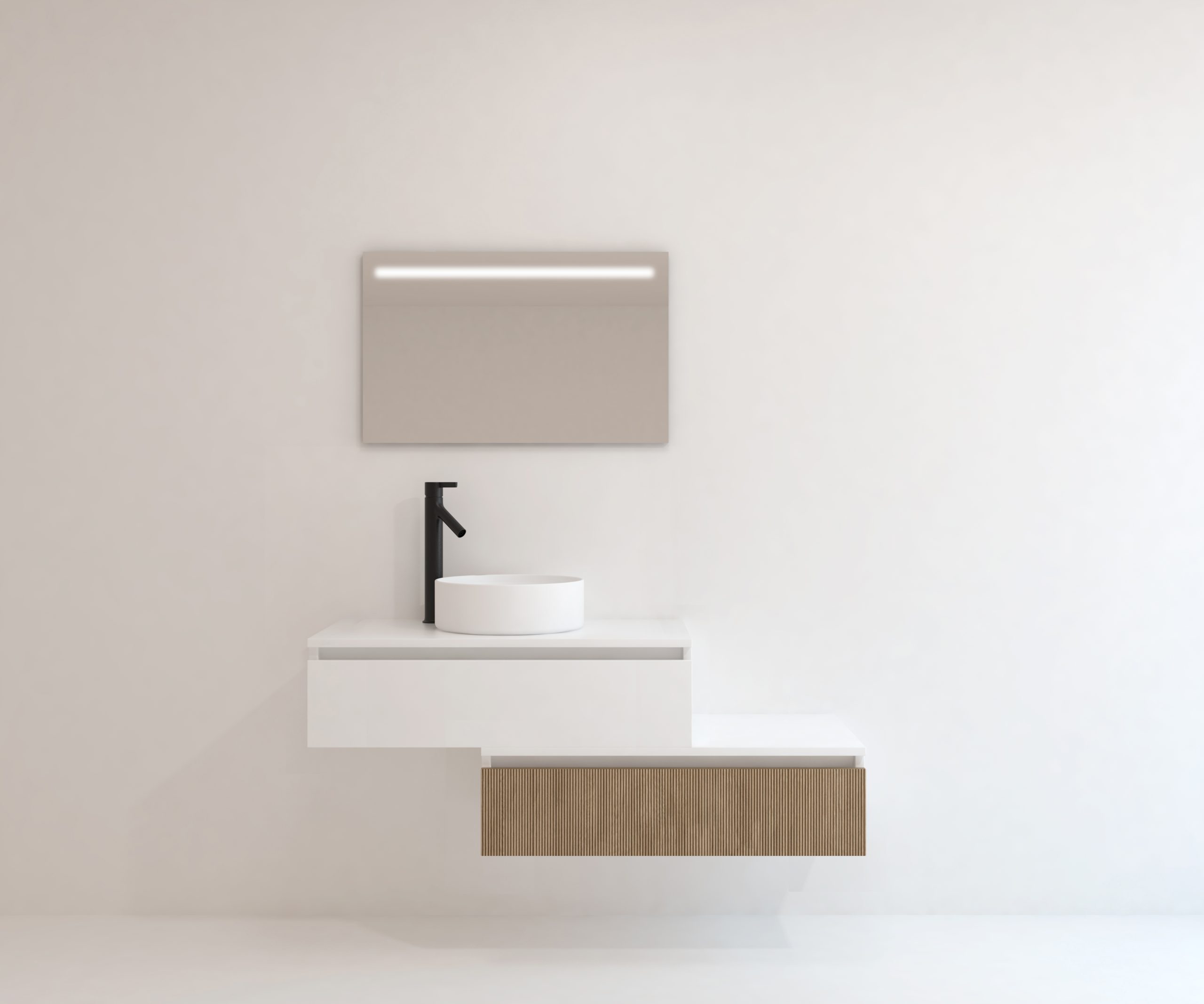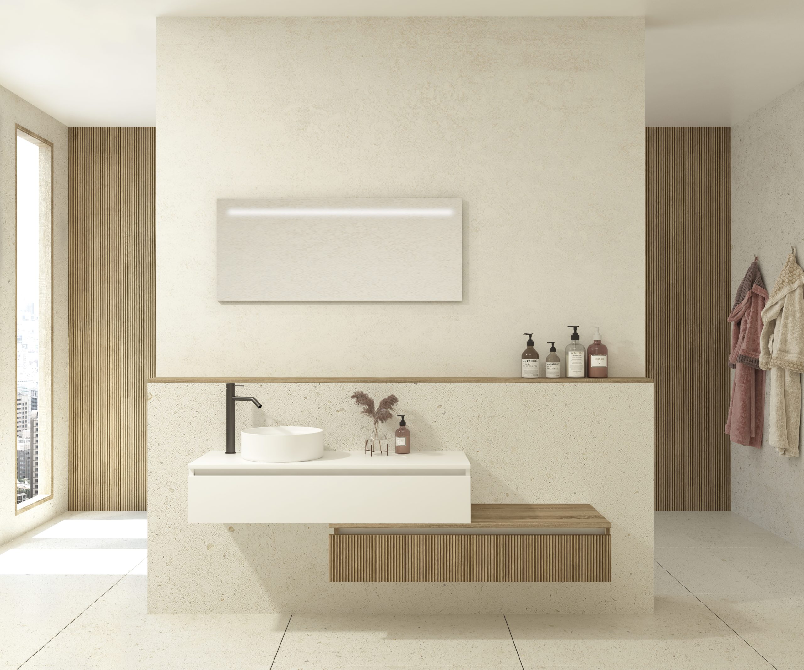 Ensemble composé d’un meuble sous-vasque suspendu, d’une vasque et d’un miroir avec éclairage LED.