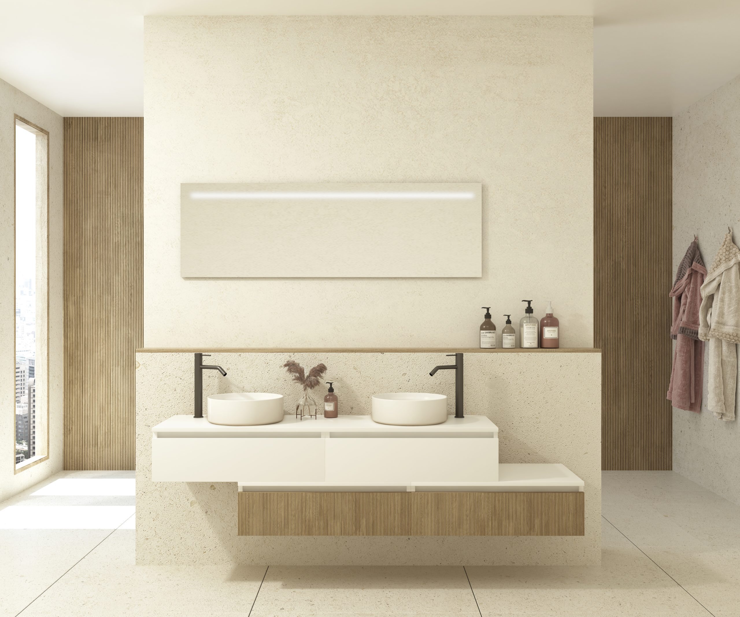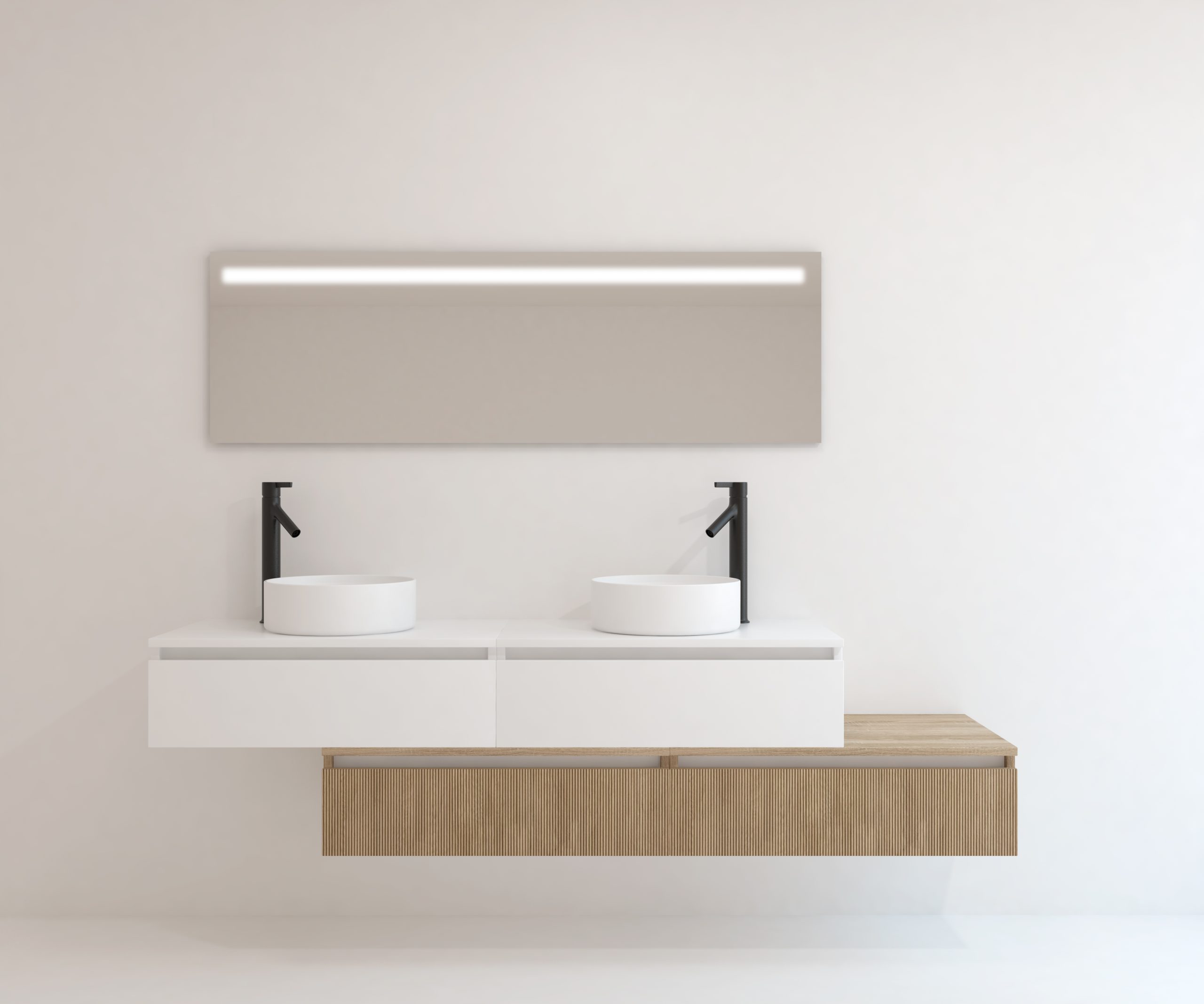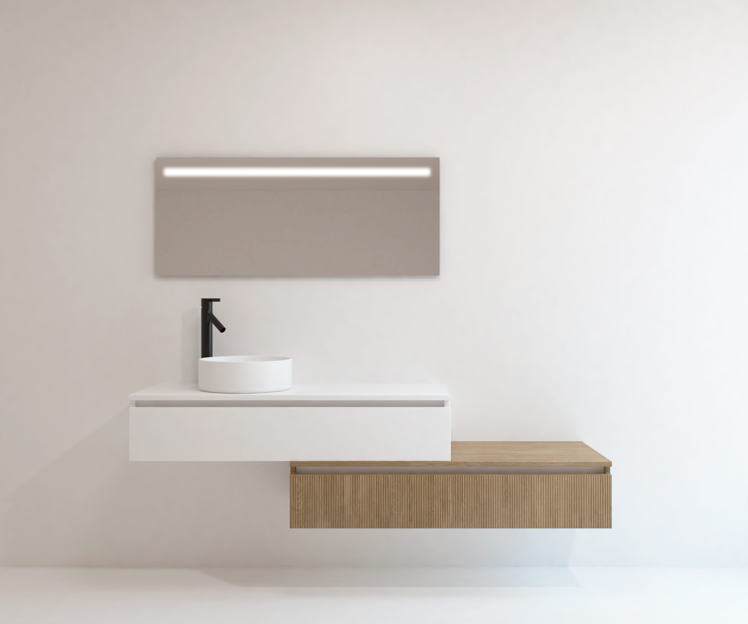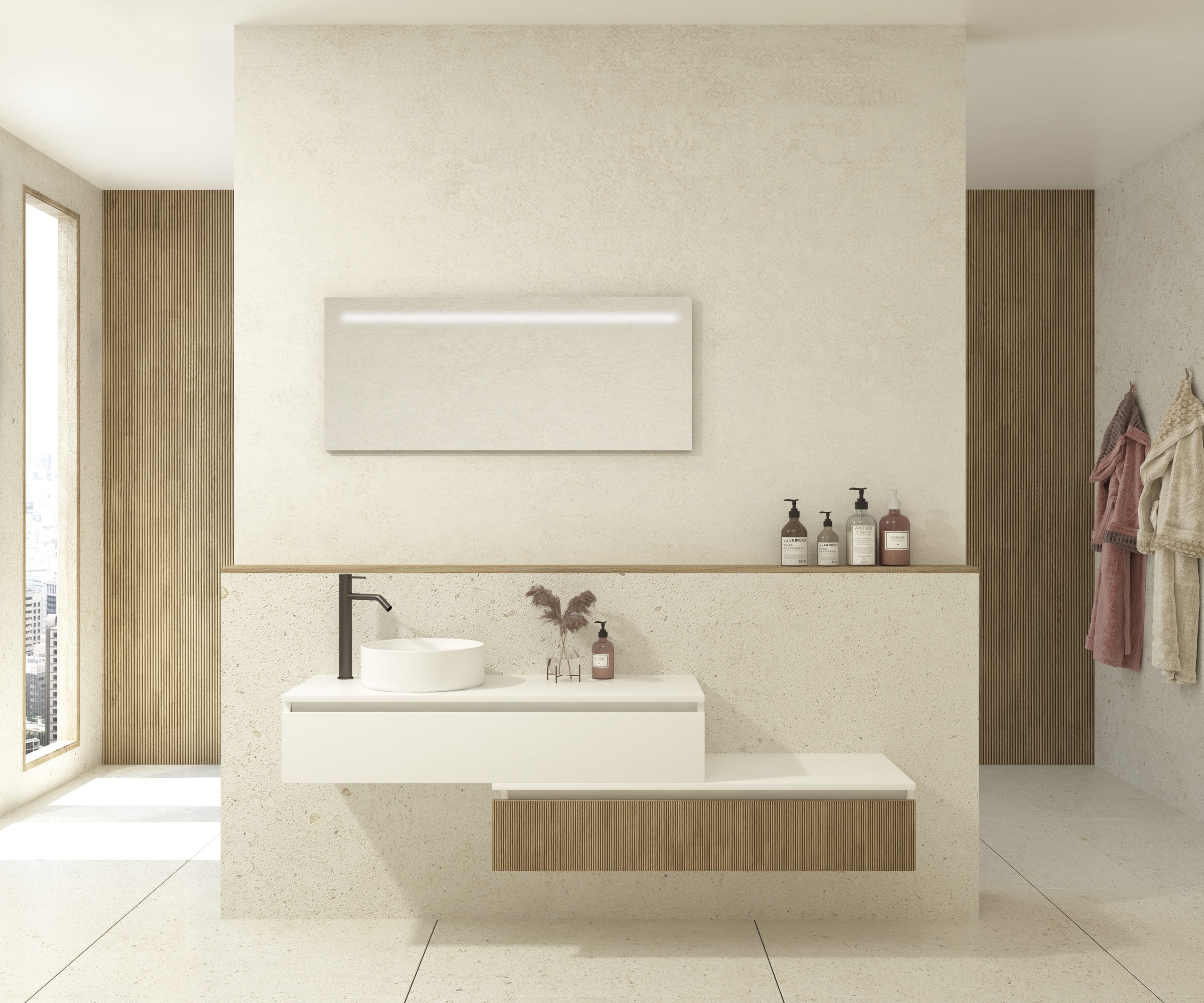 Ensemble composé d’un meuble sous-vasque suspendu, d’une vasque et d’un miroir avec éclairage LED.