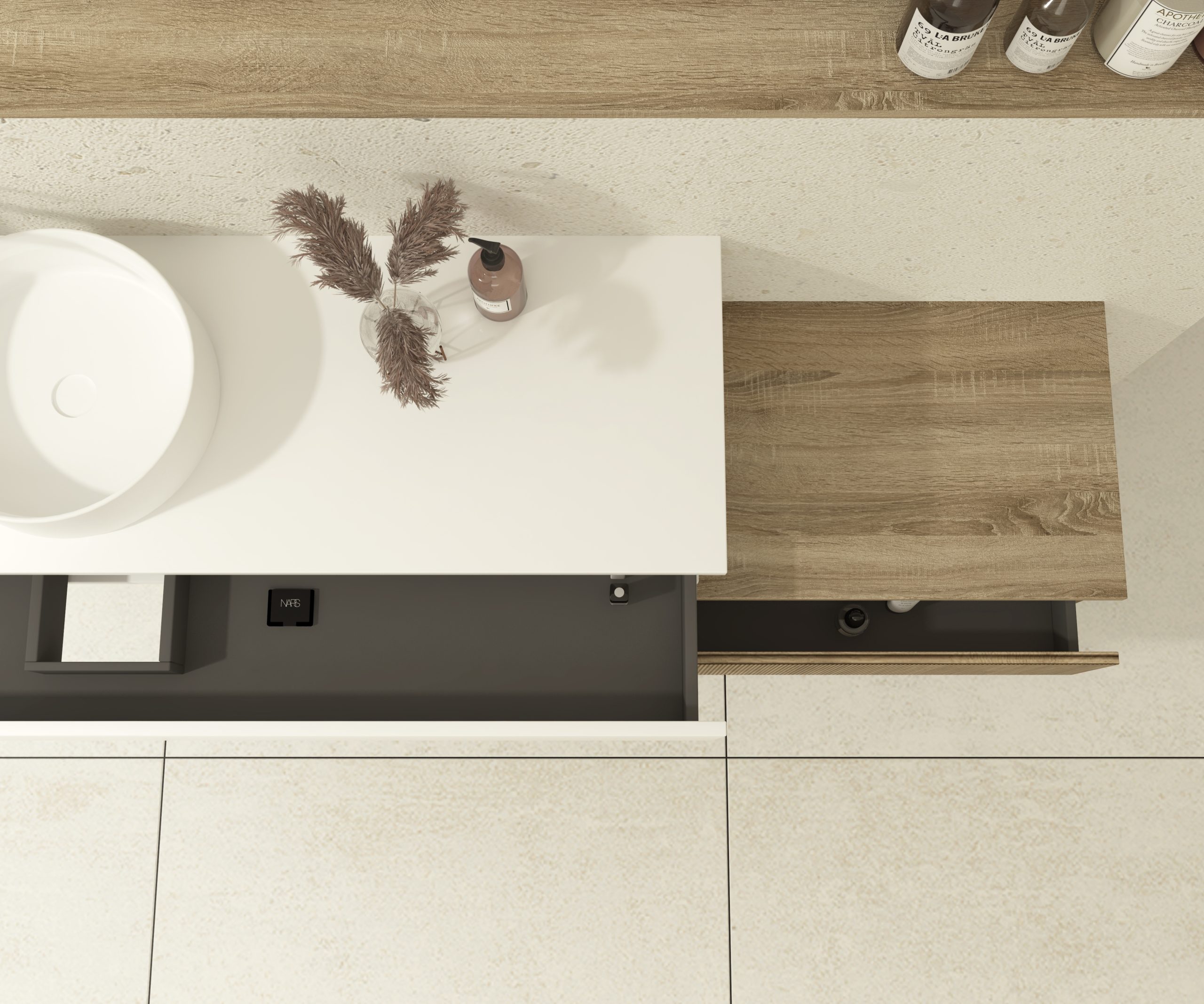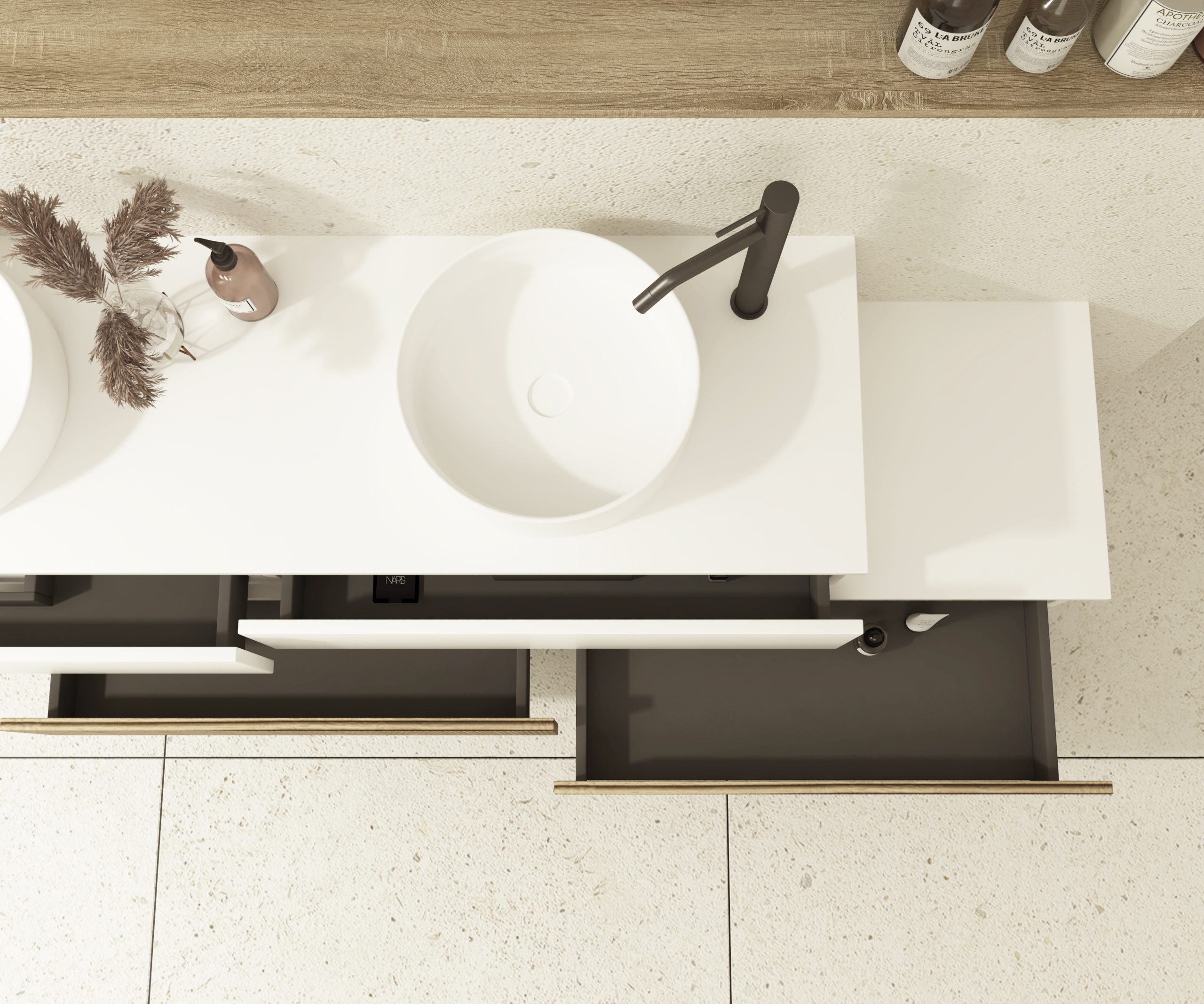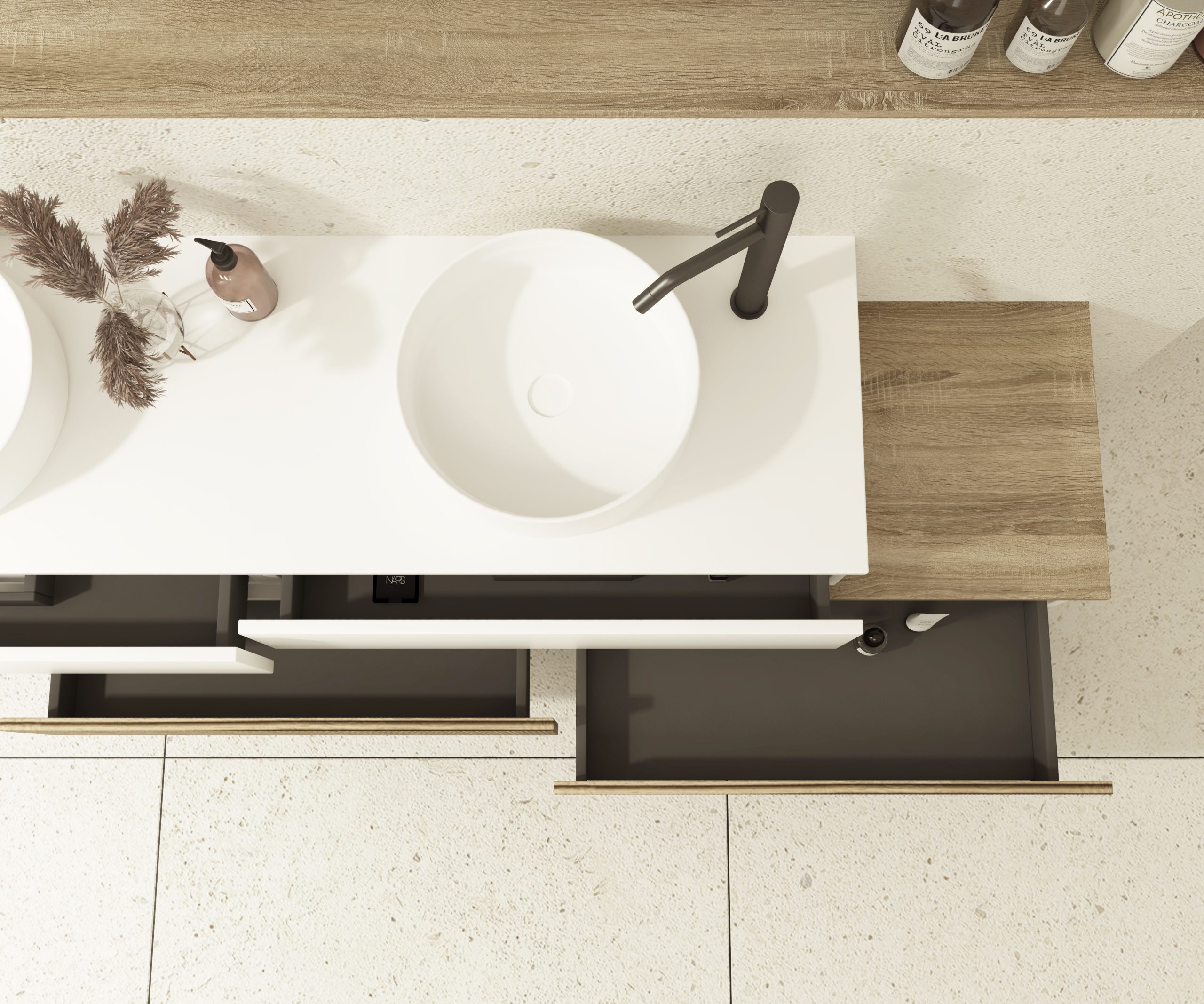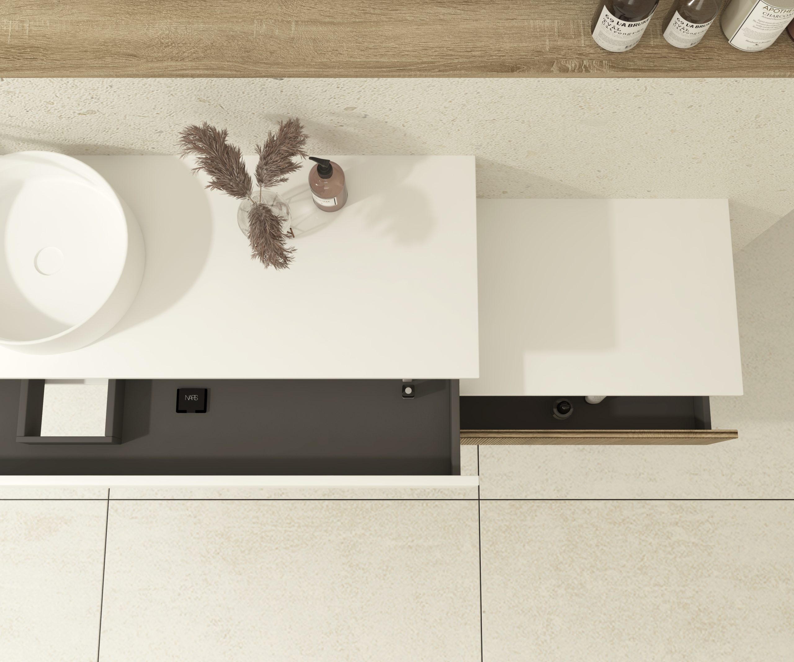 Le meuble suspendu est composé de deux modules tiroirs à ouverture par poignée. Modules indépendants qui peuvent être positionnés comme souhaité, s’adaptant ainsi à l’espace disponible. Meuble fabriqué en panneau de particules de 19 mm avec revêtement mélaminé, écologique et recyclable. Tiroir métallique à double paroi à l’esthétique minimaliste, avec des flancs minces et des lignes droites, doté d’une fermeture amortie et d’une capacité de charge de 25 kg. Tiroir à pleine extension et espace arrière disponible.