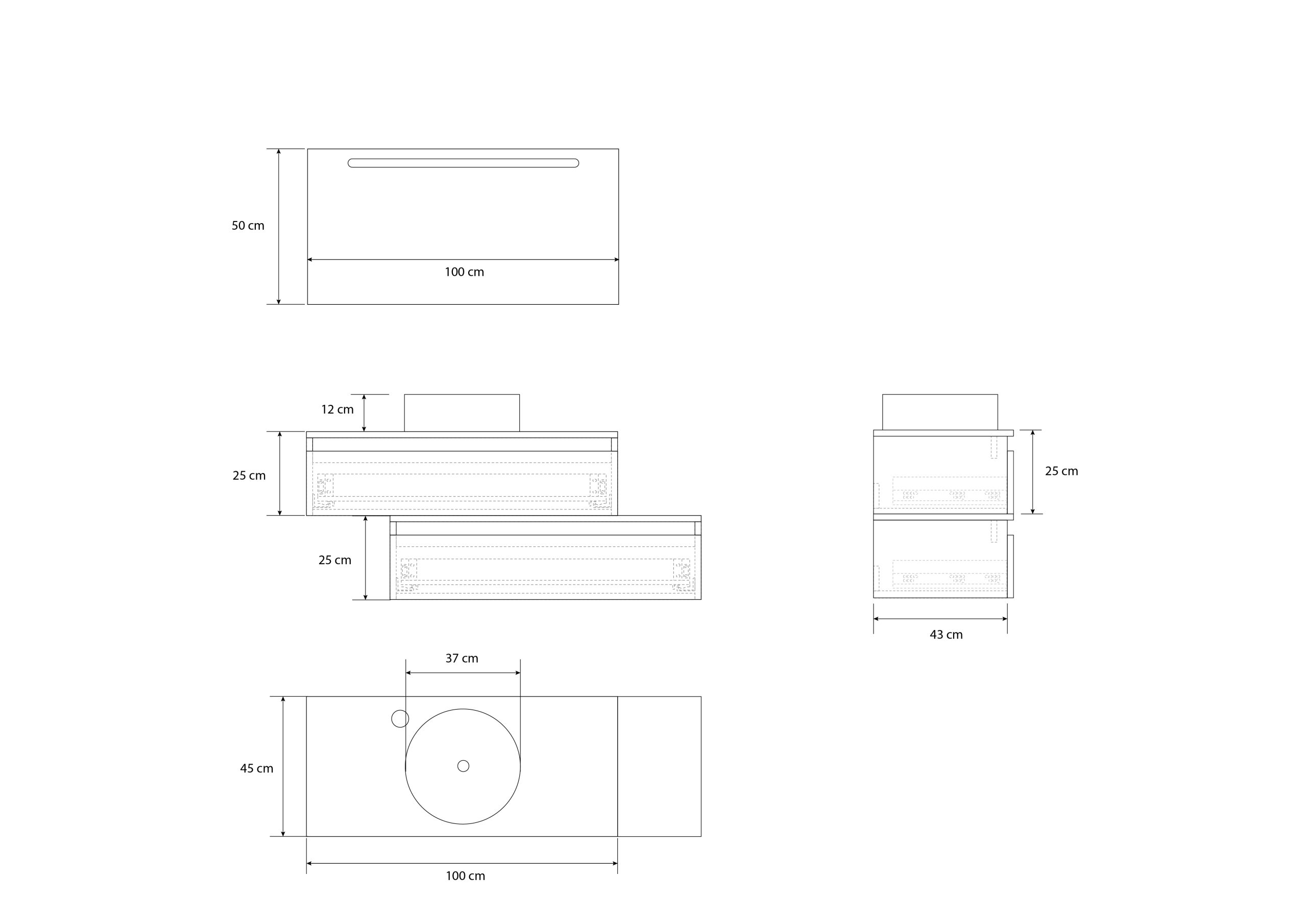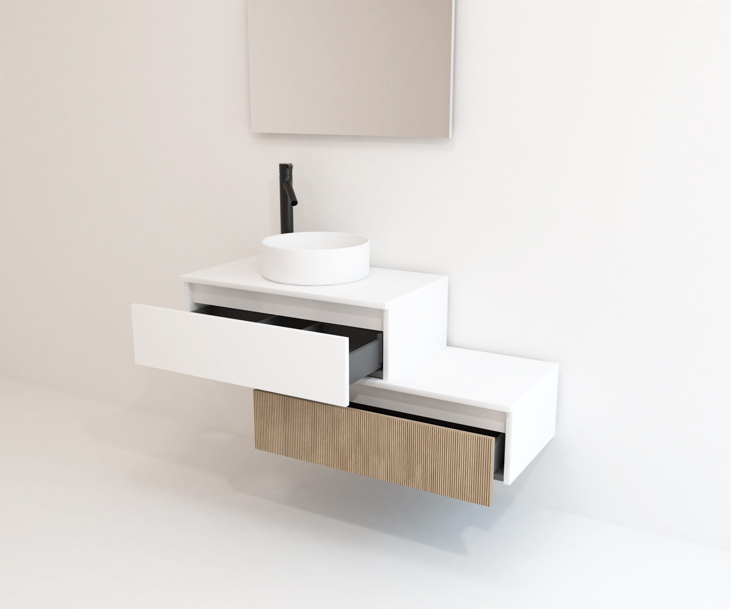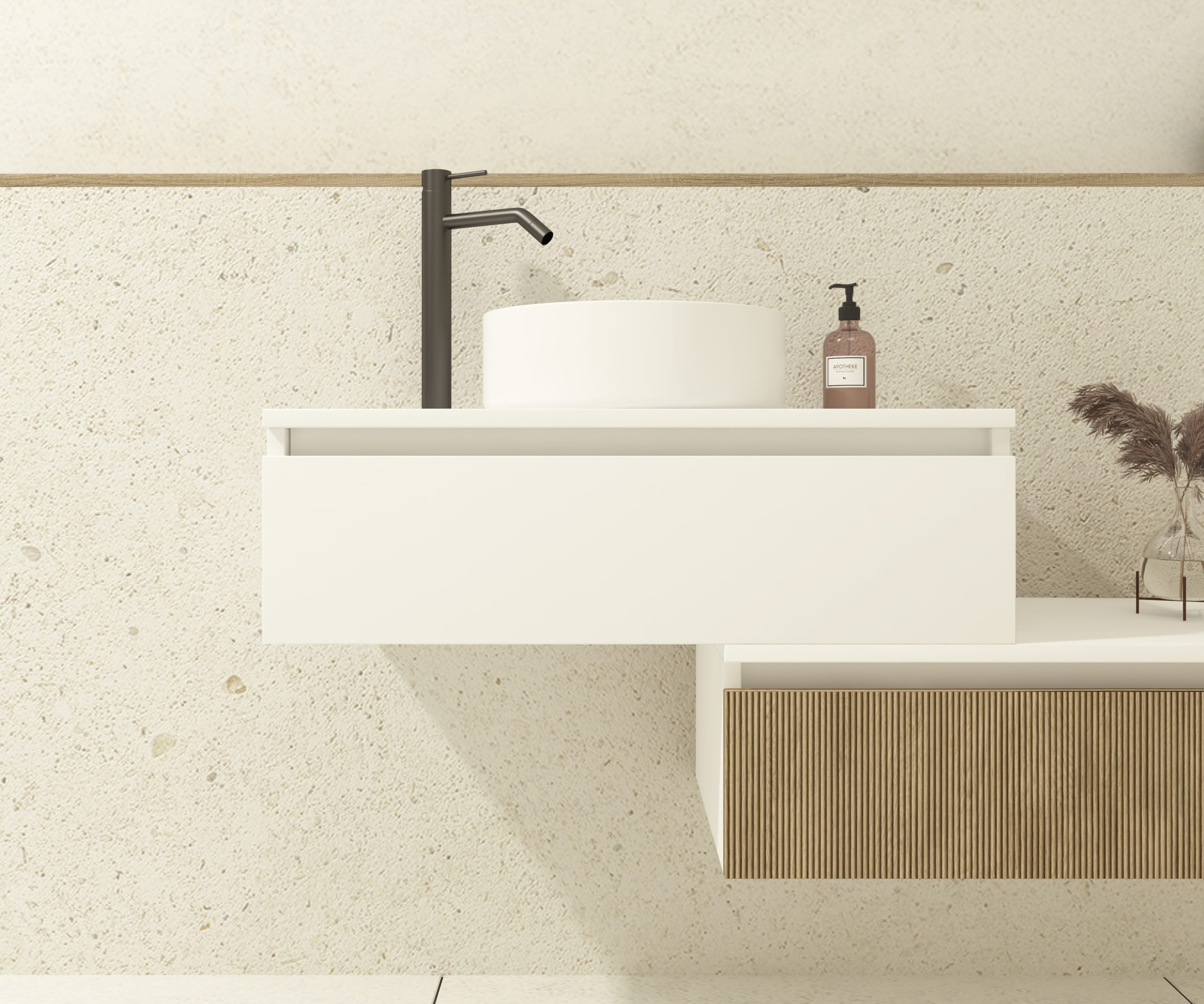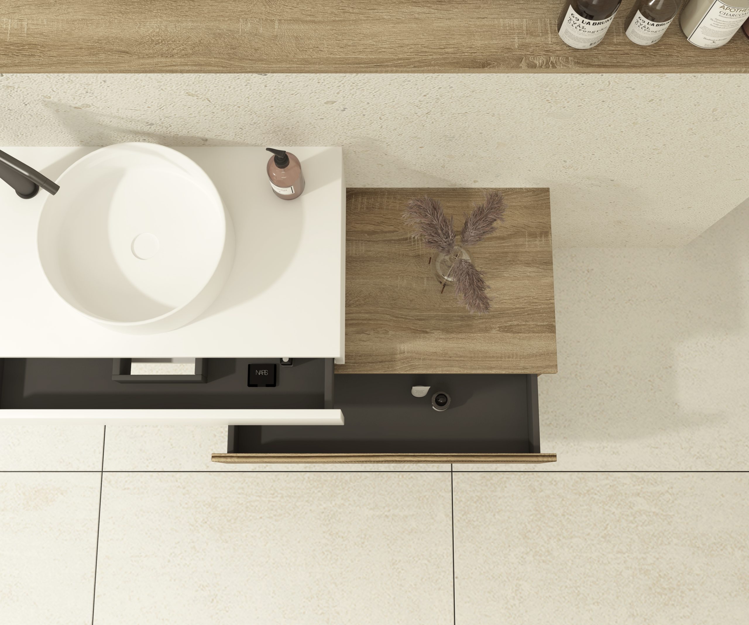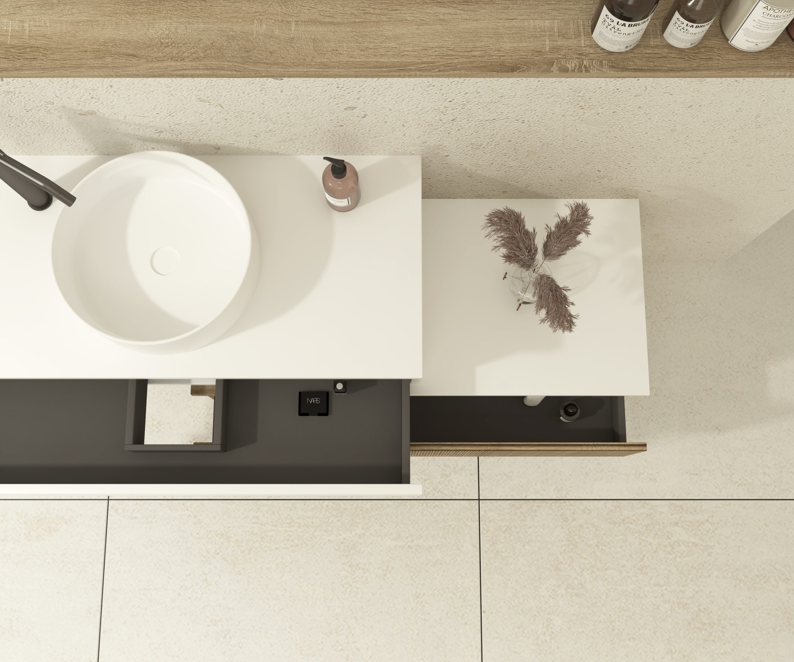 Le meuble suspendu est composé de deux modules tiroirs à ouverture par poignée. Modules indépendants qui peuvent être positionnés comme souhaité, s’adaptant ainsi à l’espace disponible. Meuble fabriqué en panneau de particules de 19 mm avec revêtement mélaminé, écologique et recyclable. Tiroir métallique à double paroi à l’esthétique minimaliste, avec des flancs minces et des lignes droites, doté d’une fermeture amortie et d’une capacité de charge de 25 kg. Tiroir à pleine extension et espace arrière disponible.