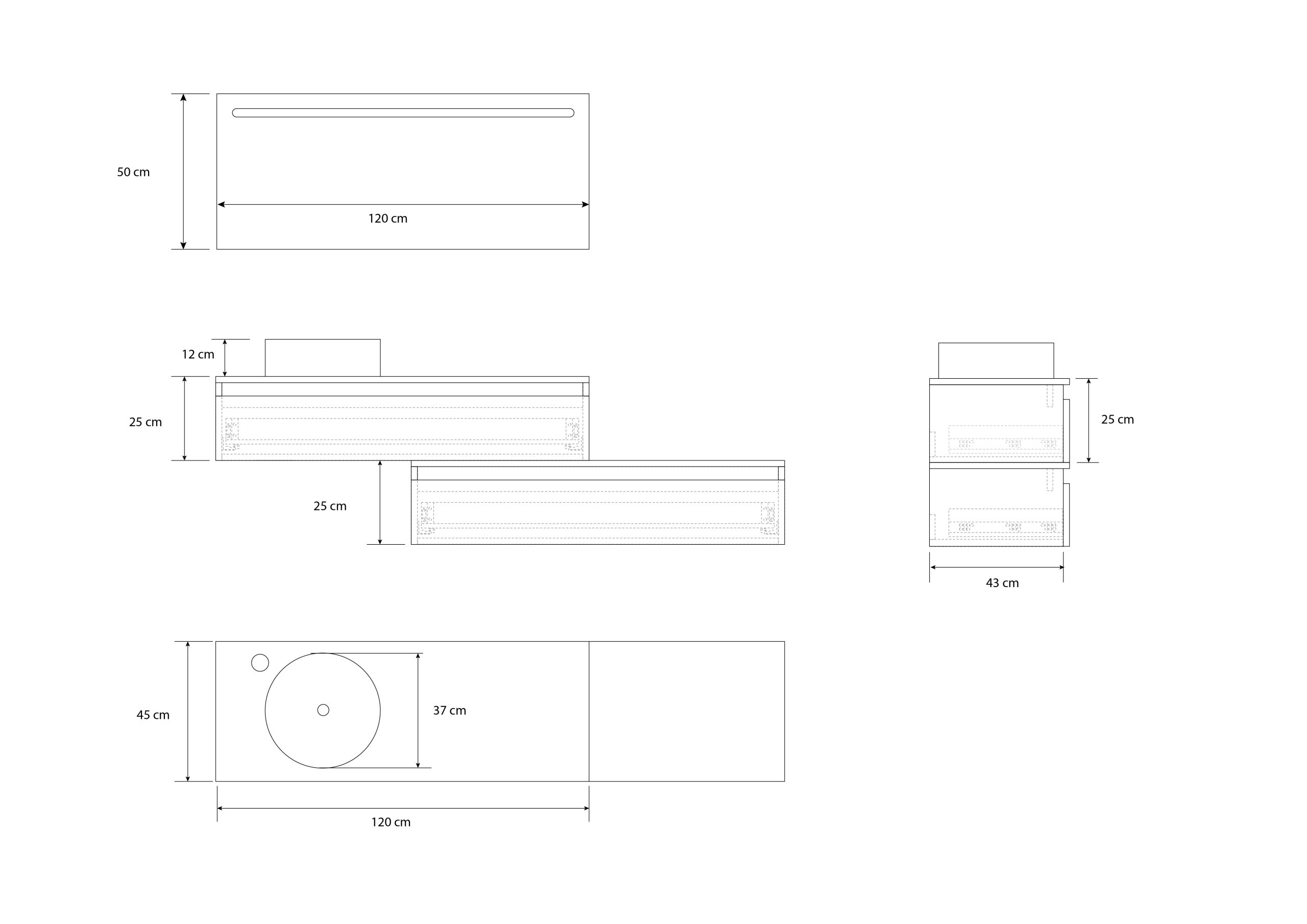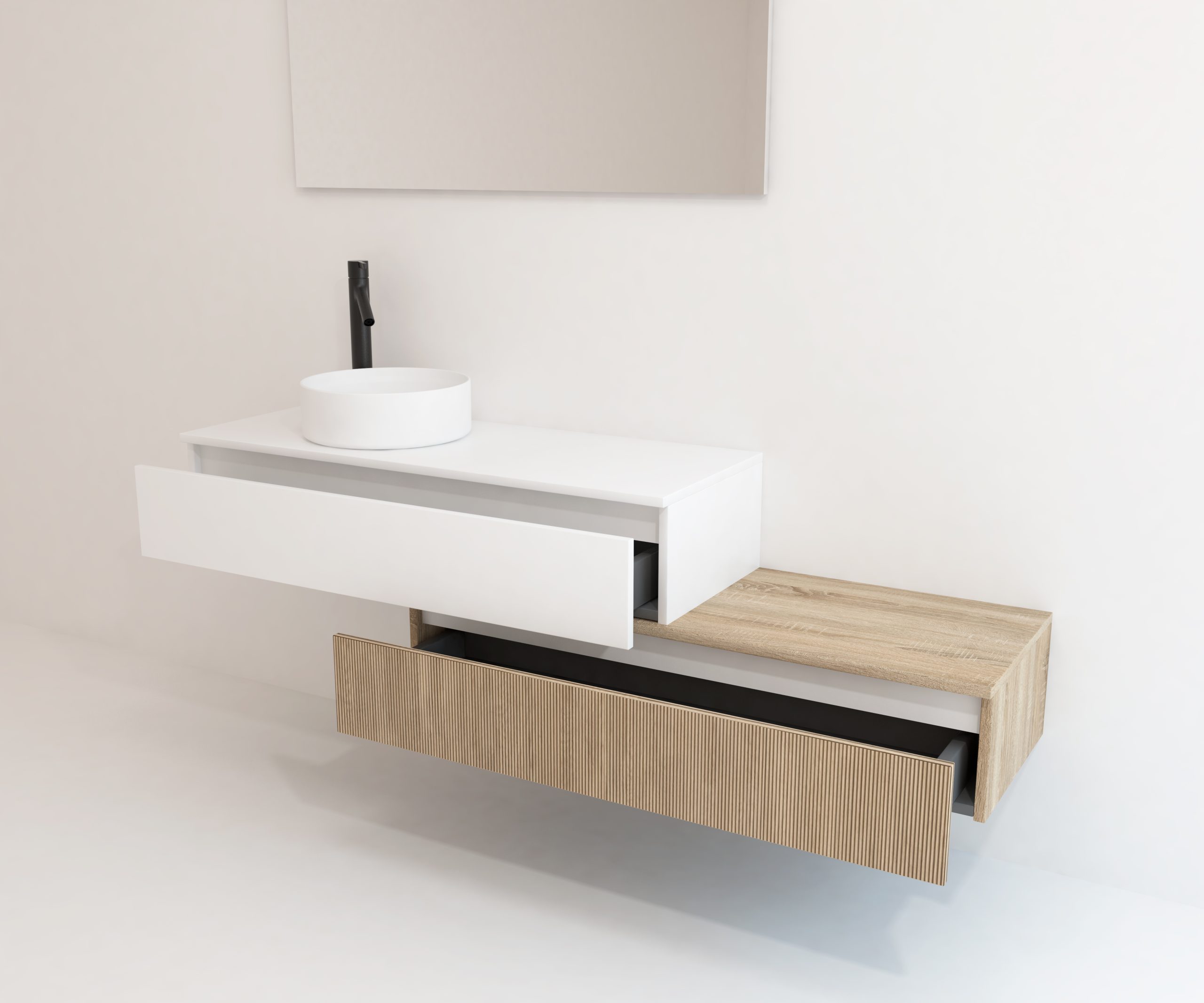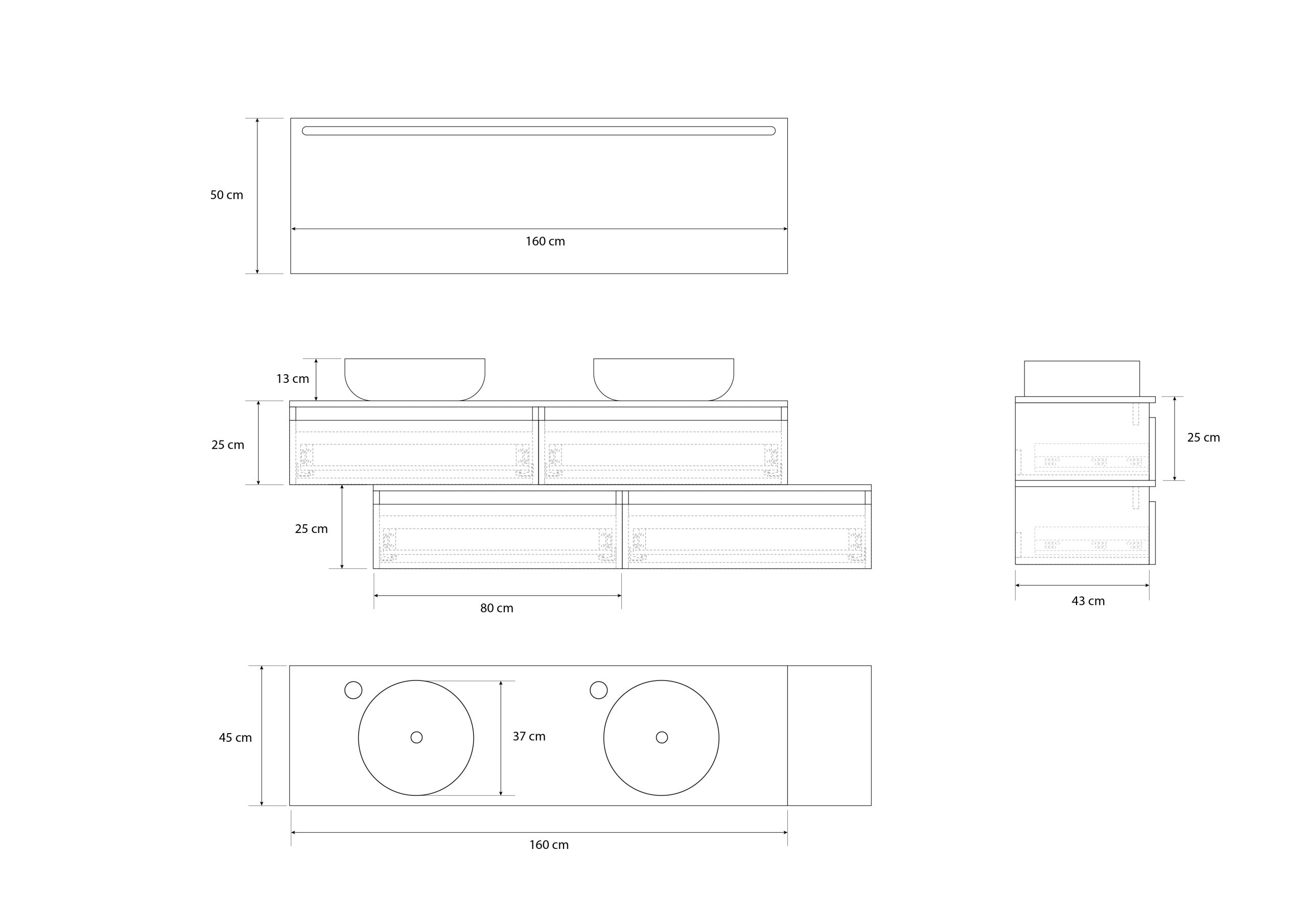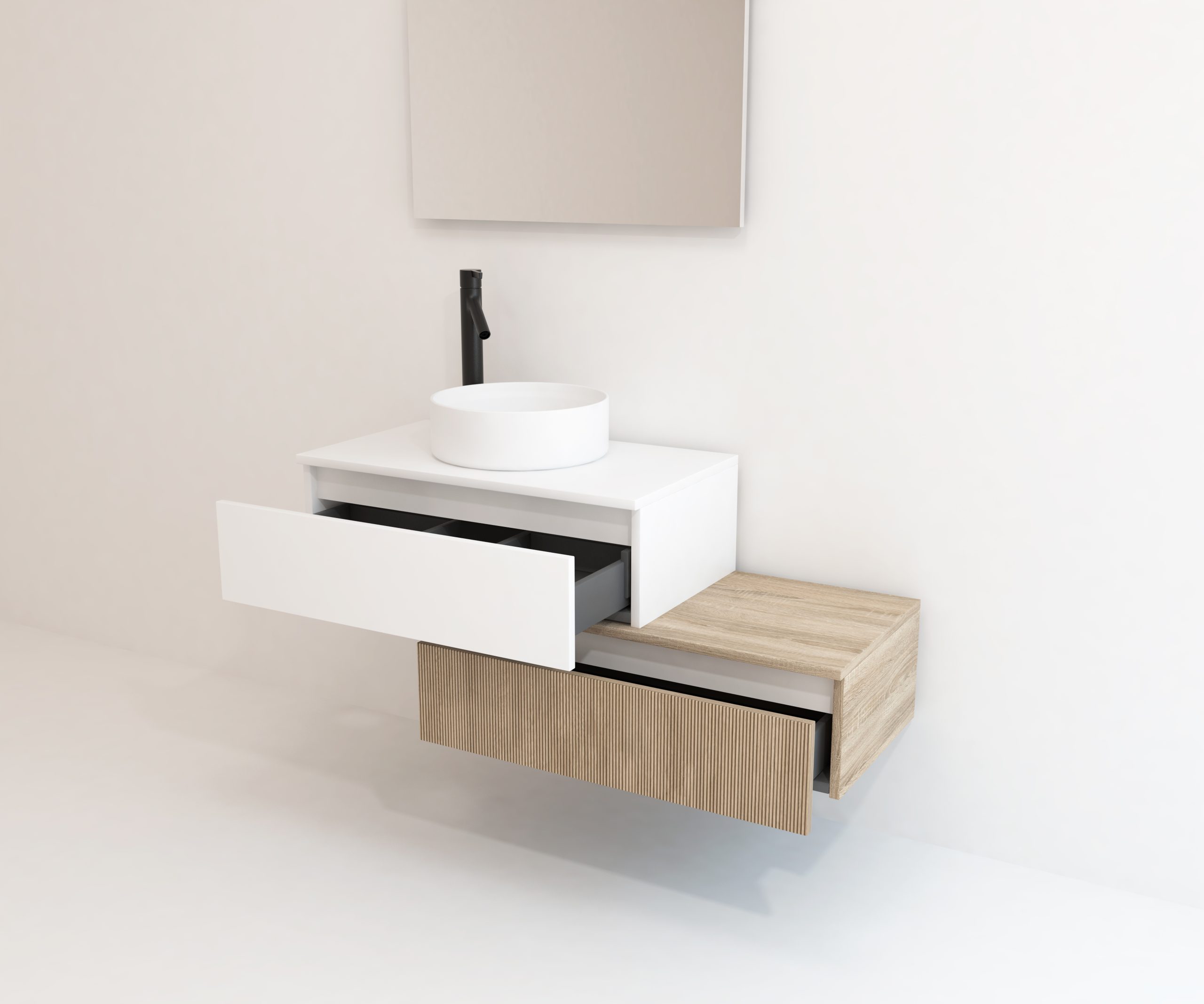 Le meuble suspendu est composé de deux modules tiroirs à ouverture par poignée. Modules indépendants qui peuvent être positionnés comme souhaité, s’adaptant ainsi à l’espace disponible. Meuble fabriqué en panneau de particules de 19 mm avec revêtement mélaminé, écologique et recyclable. Tiroir métallique à double paroi à l’esthétique minimaliste, avec des flancs minces et des lignes droites, doté d’une fermeture amortie et d’une capacité de charge de 25 kg. Tiroir à pleine extension et espace arrière disponible.