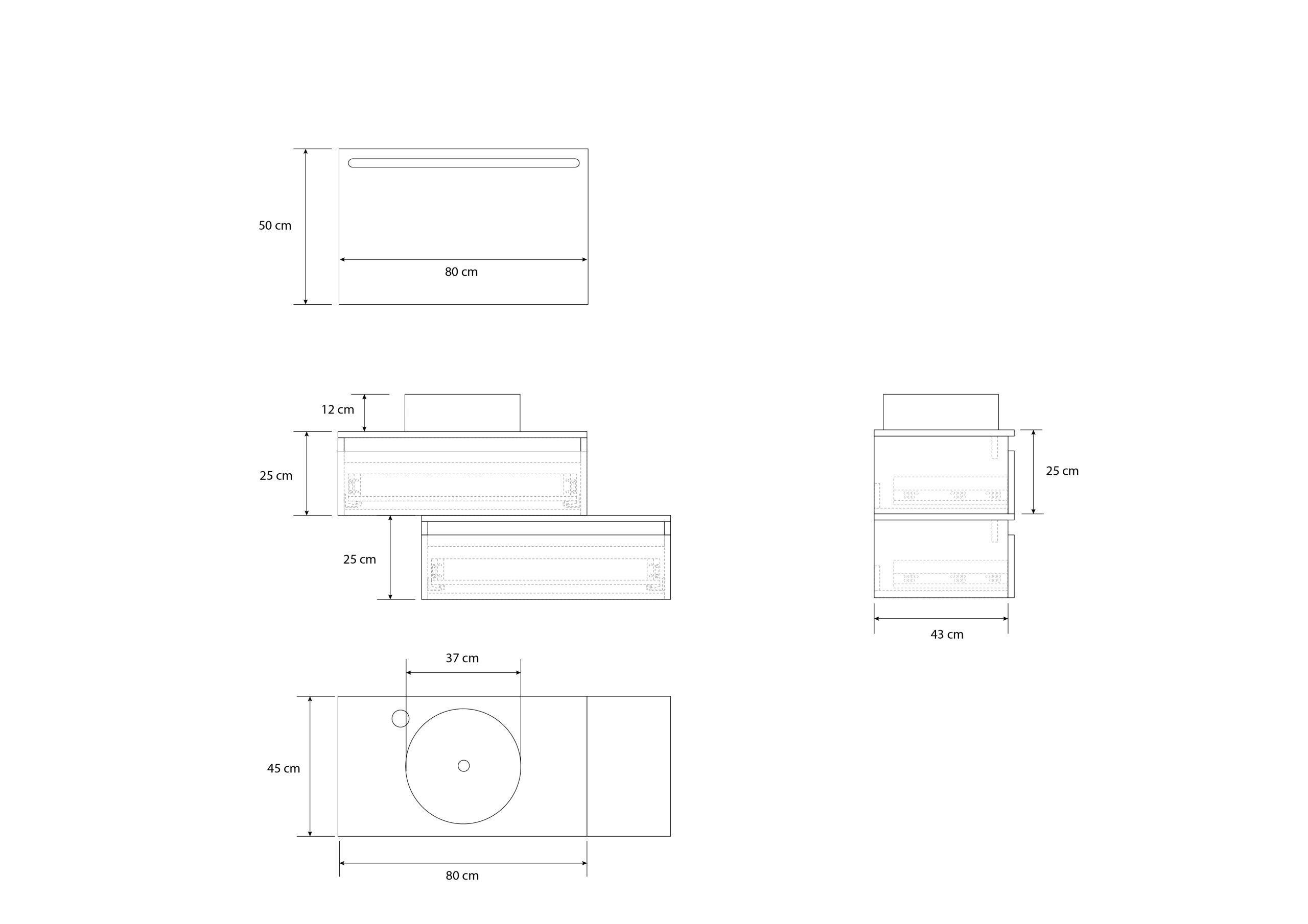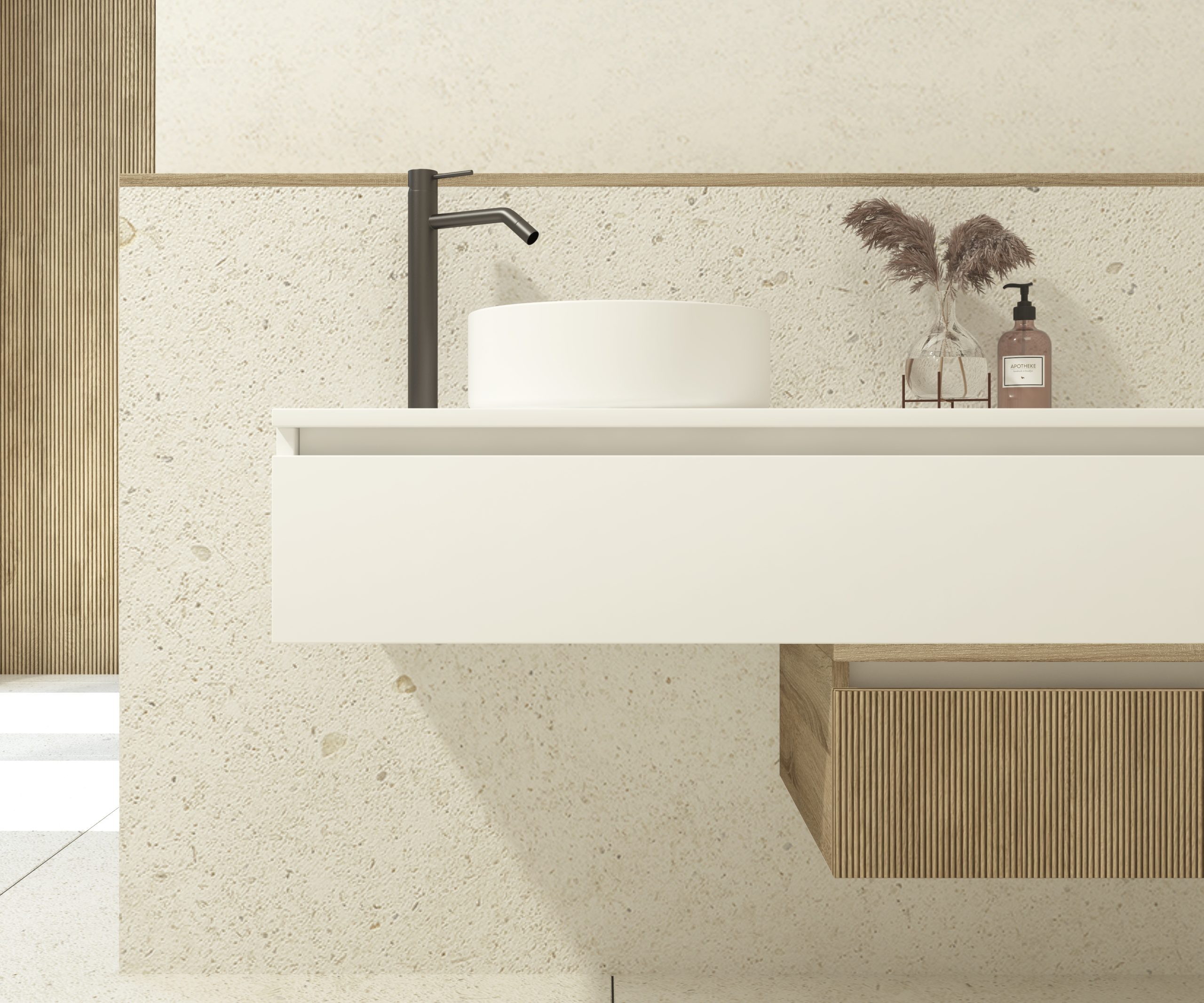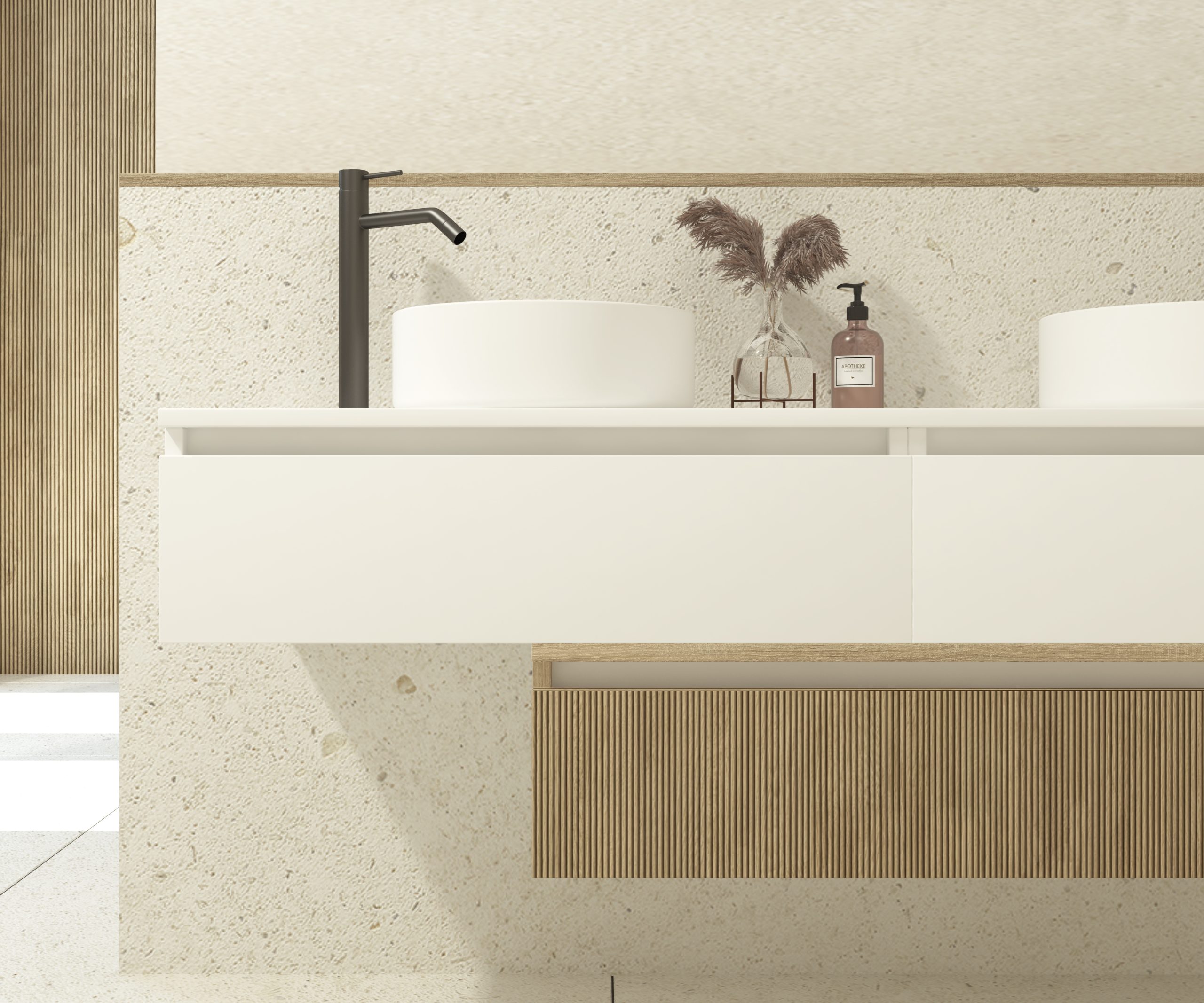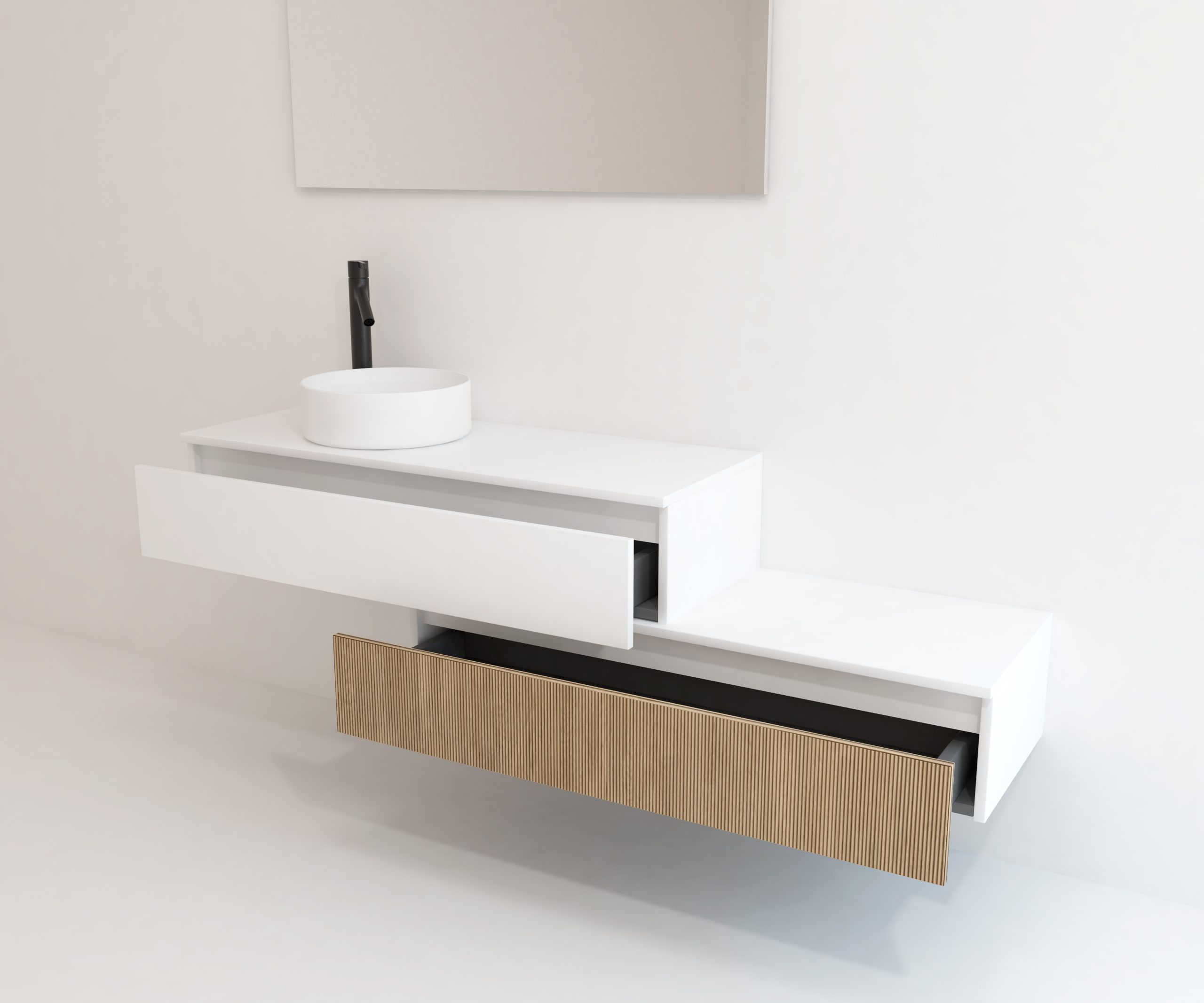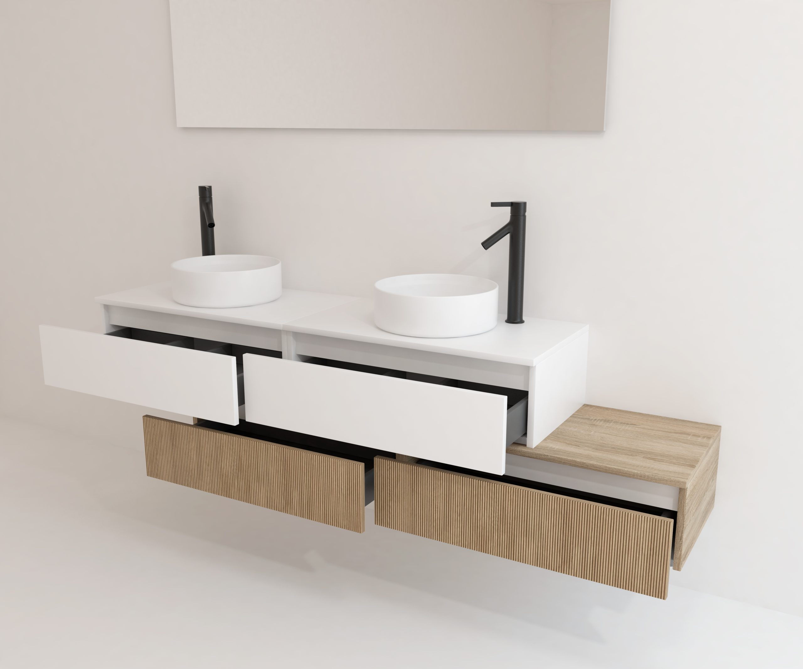 Le meuble suspendu est composé de deux modules tiroirs à ouverture par poignée. Modules indépendants qui peuvent être positionnés comme souhaité, s’adaptant ainsi à l’espace disponible. Meuble fabriqué en panneau de particules de 19 mm avec revêtement mélaminé, écologique et recyclable. Tiroir métallique à double paroi à l’esthétique minimaliste, avec des flancs minces et des lignes droites, doté d’une fermeture amortie et d’une capacité de charge de 25 kg. Tiroir à pleine extension et espace arrière disponible.