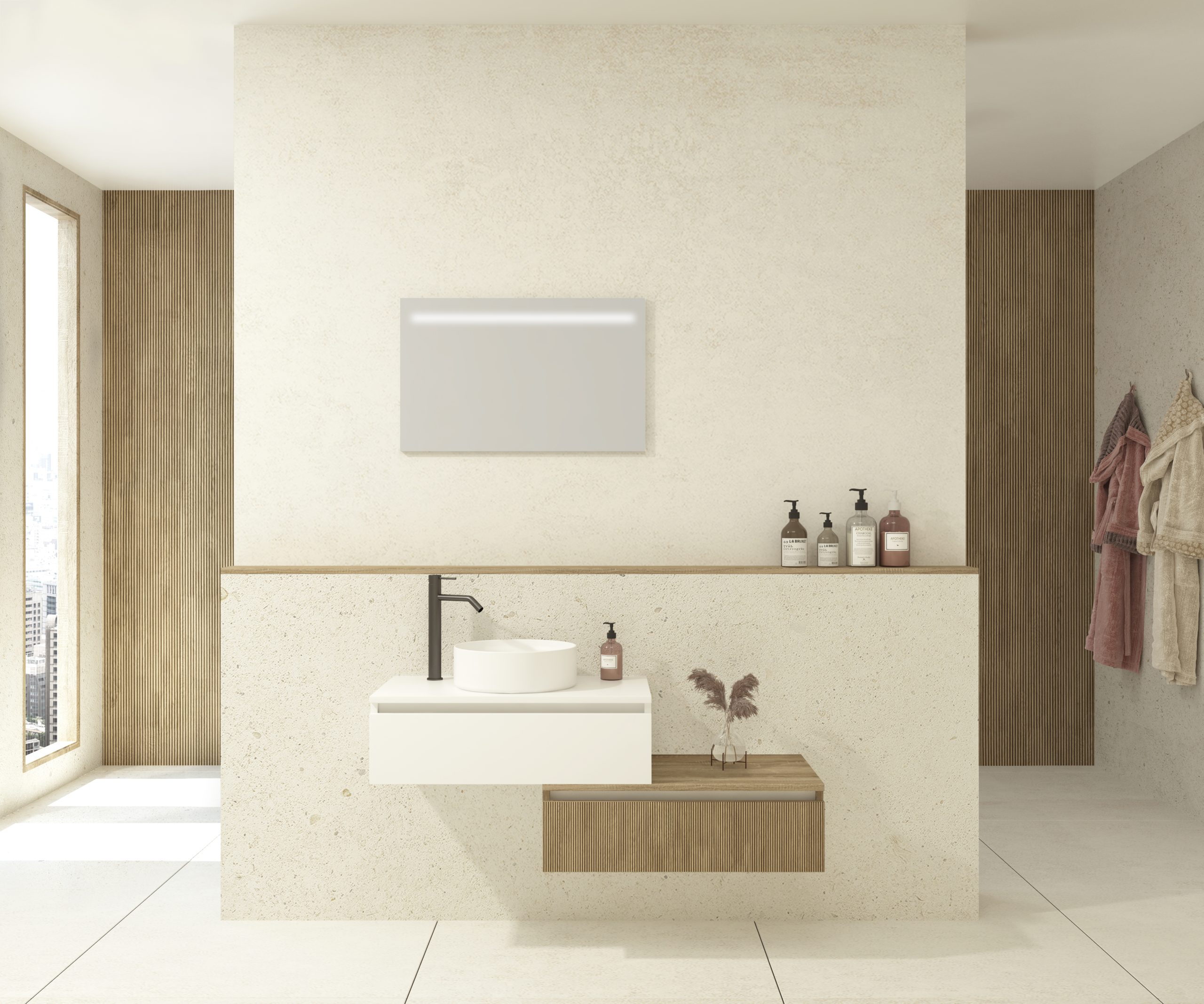 Vasque en céramique blanche incluse. Miroir LED inclus, IP44, 14,4W, 1320 lumens et température 6000K. Livré monté, prêt à être fixé au mur. Comprend toute la quincaillerie nécessaire. Fabriqué en Espagne. Robinet et siphon non inclus.