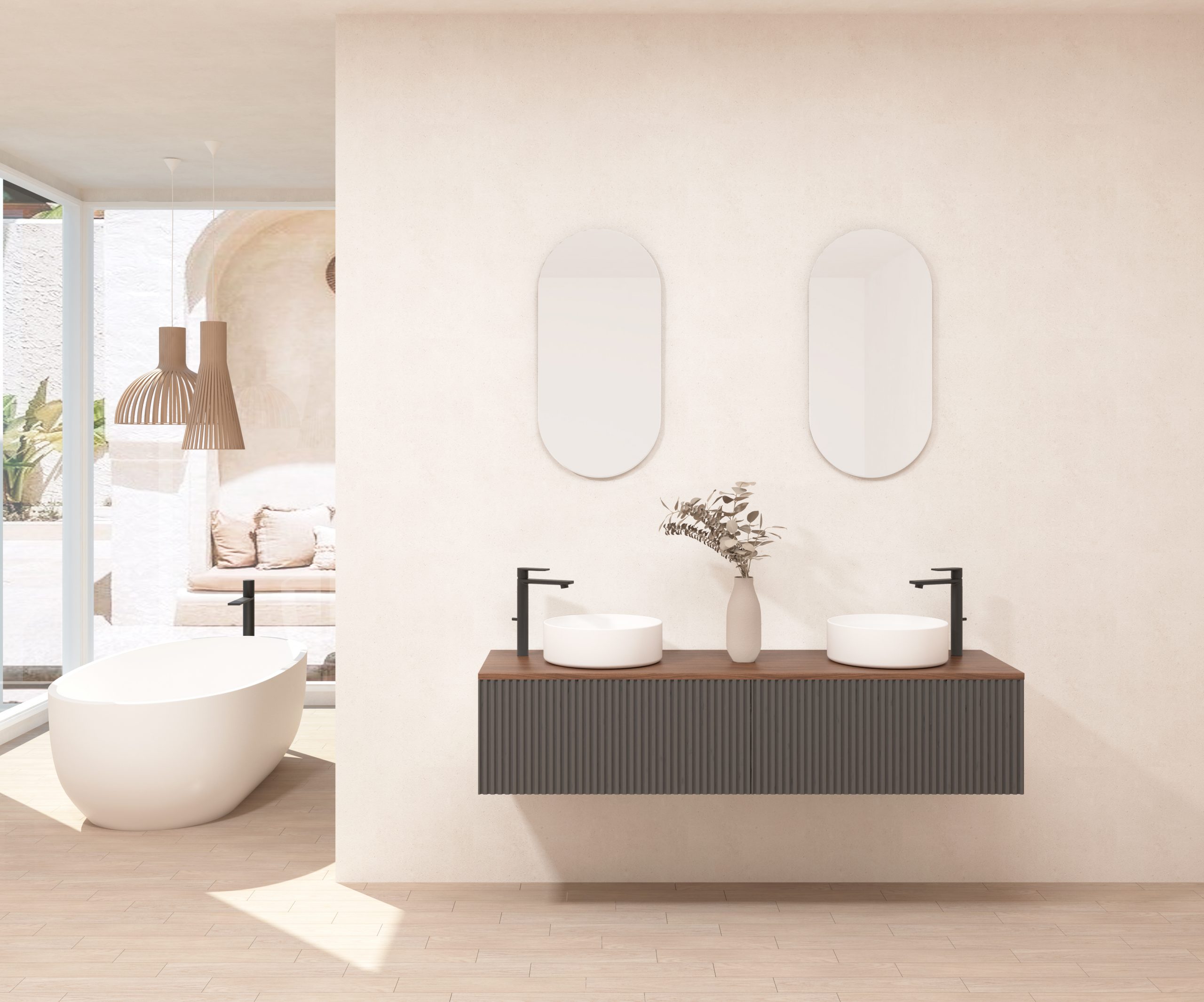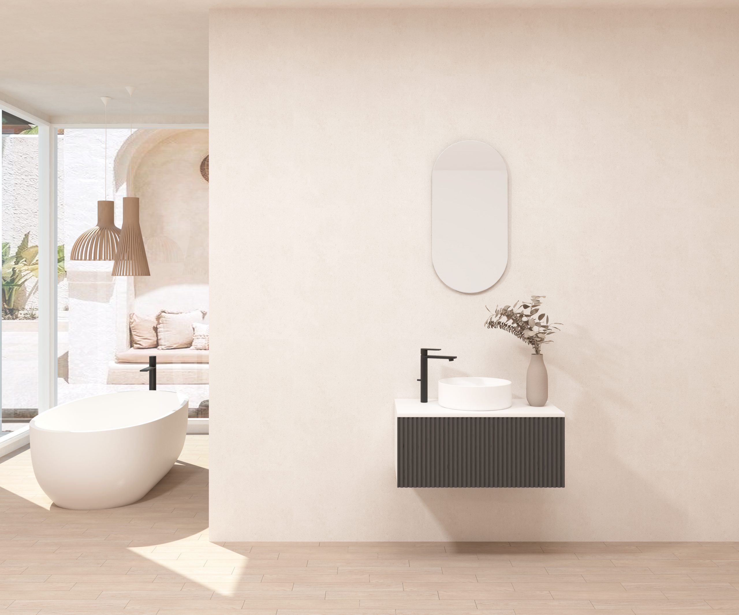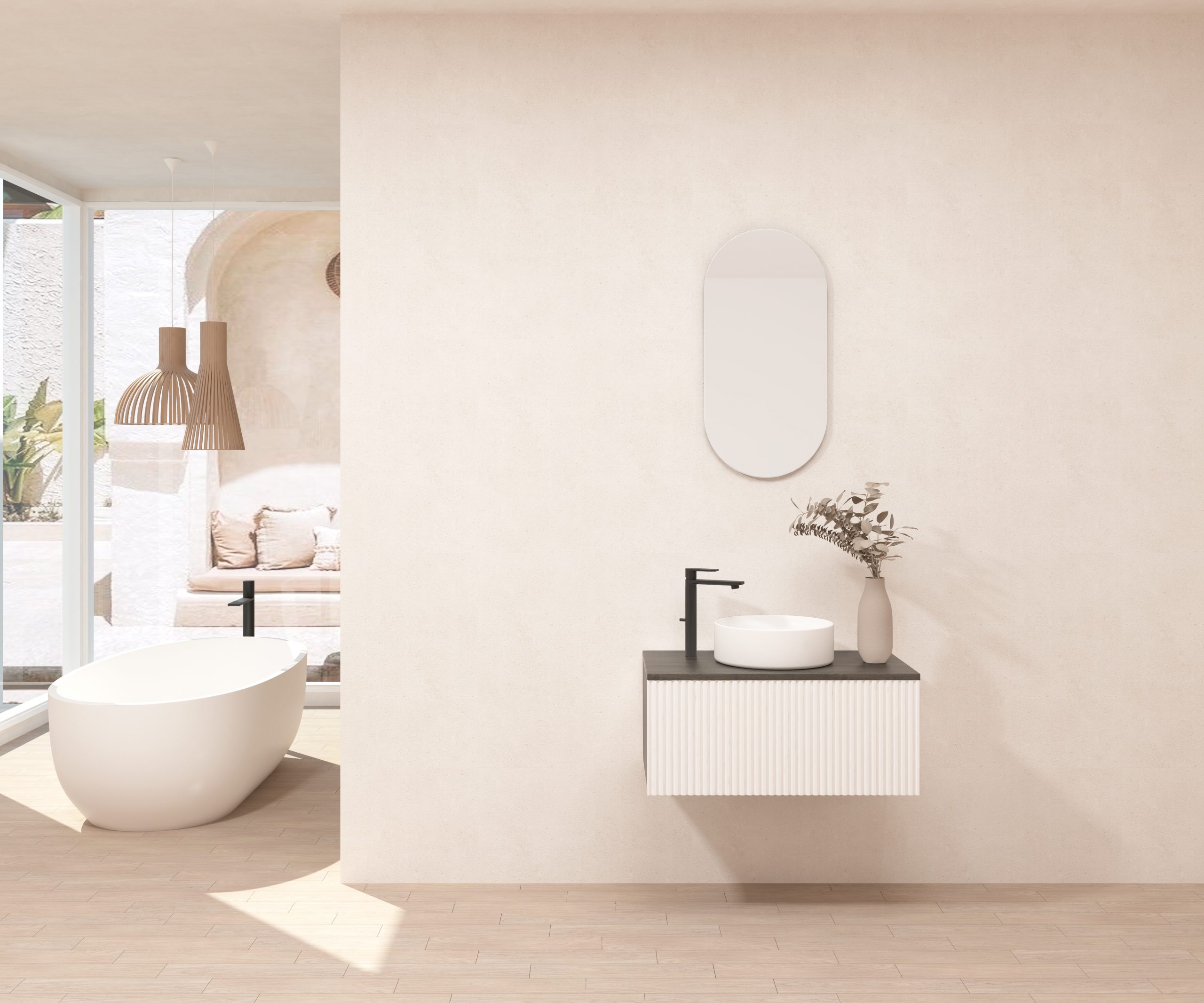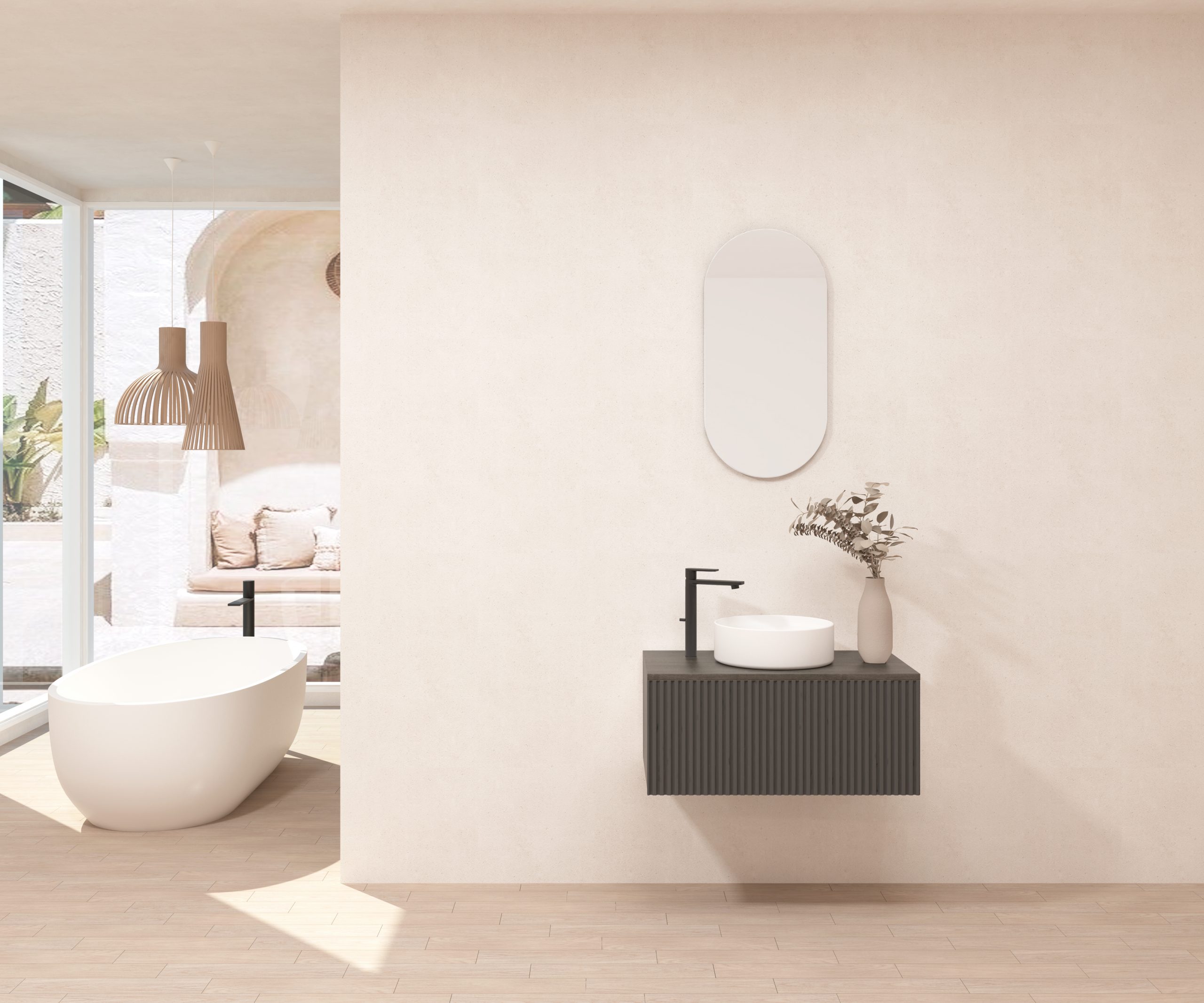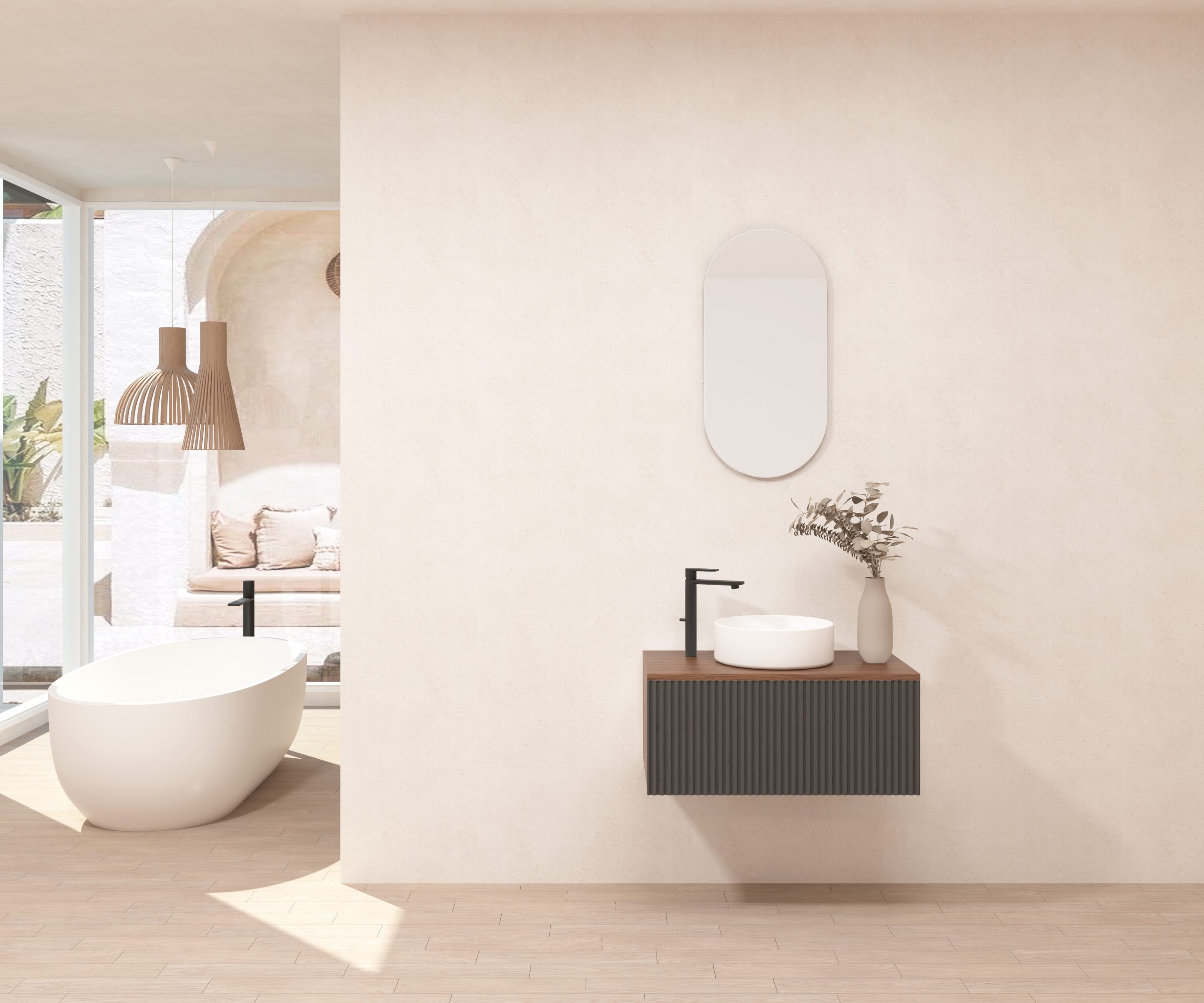 Ensemble composé d’un meuble sous-vasque suspendu, d’une vasque et d’un miroir design capsule.