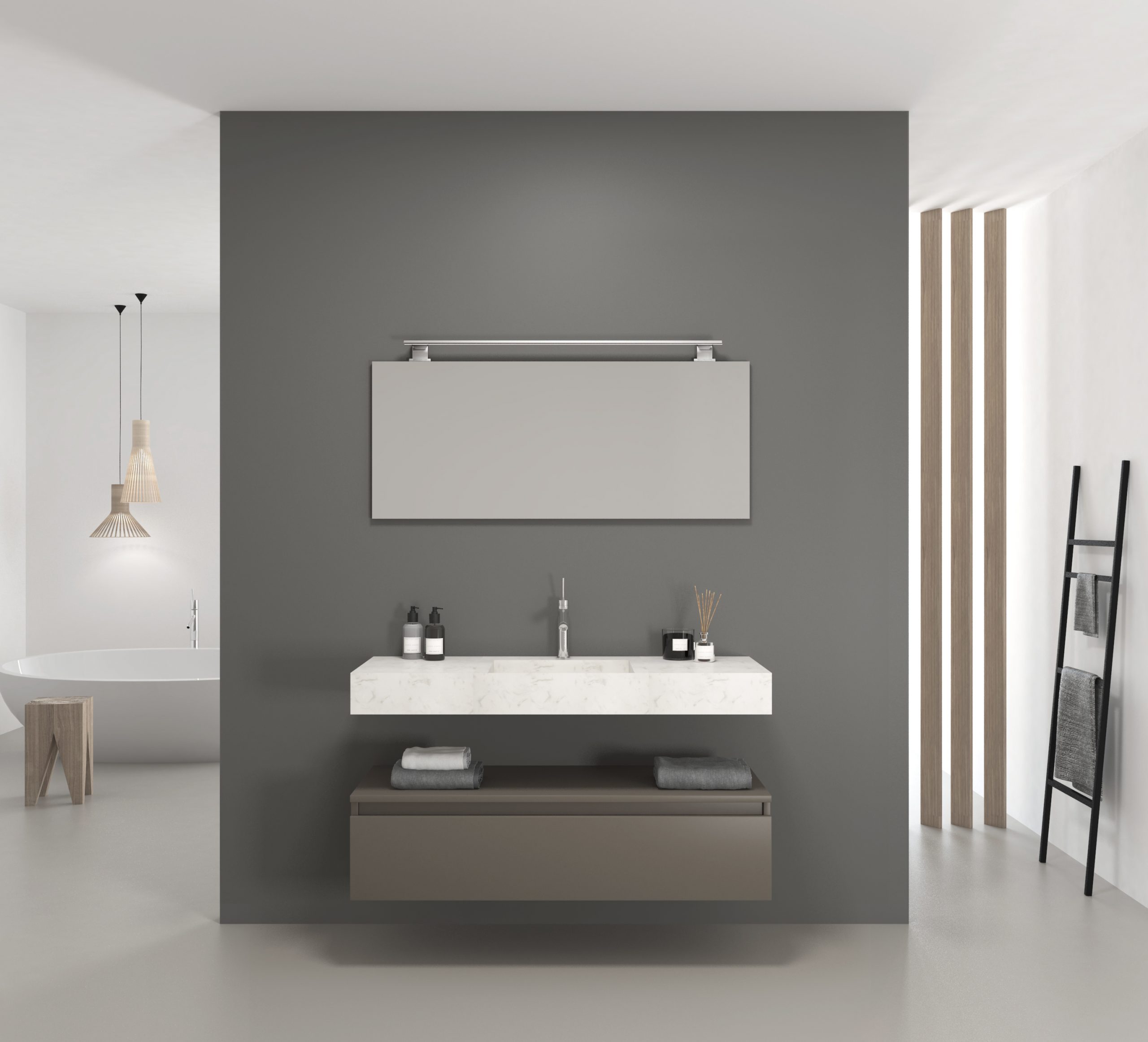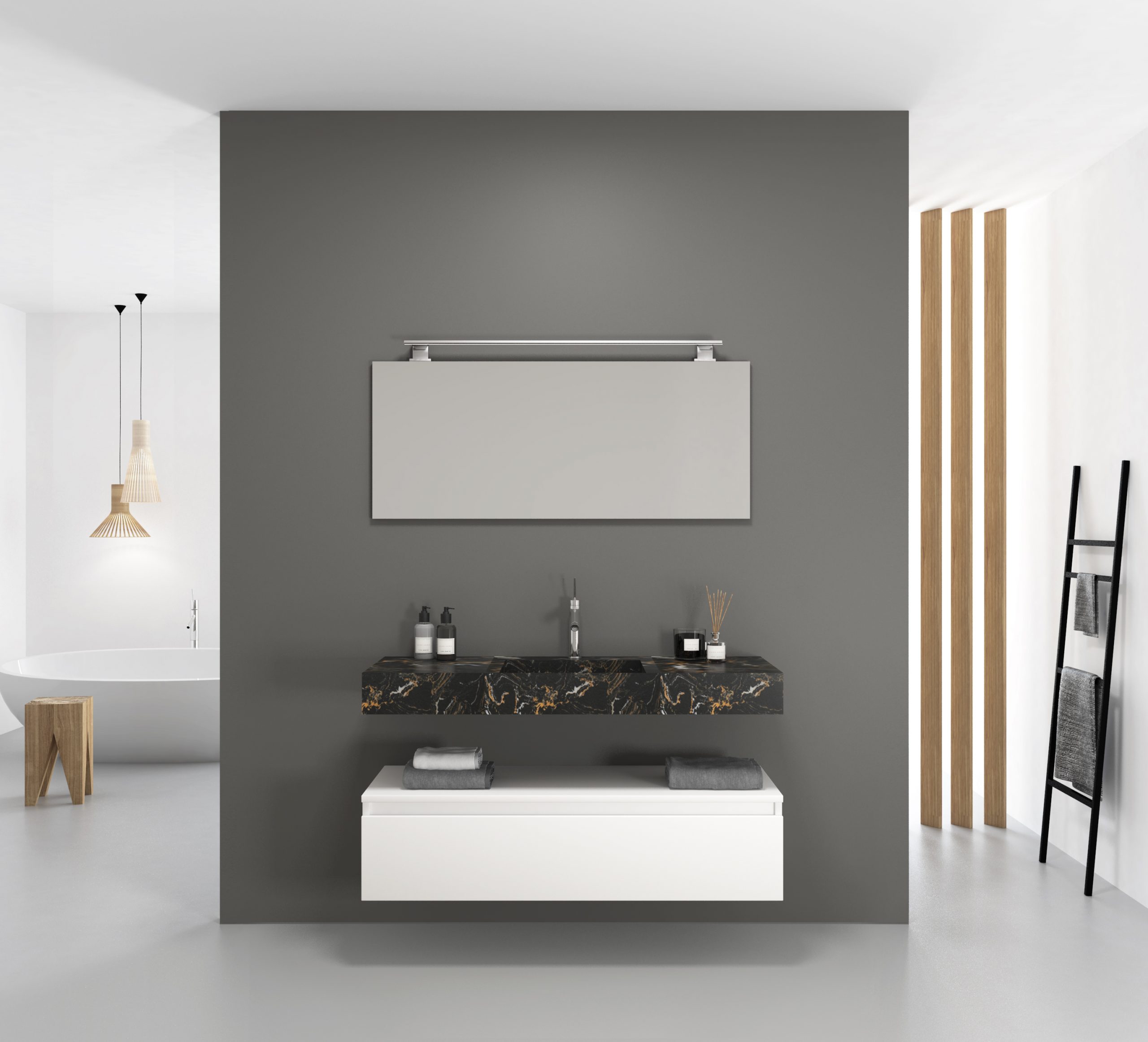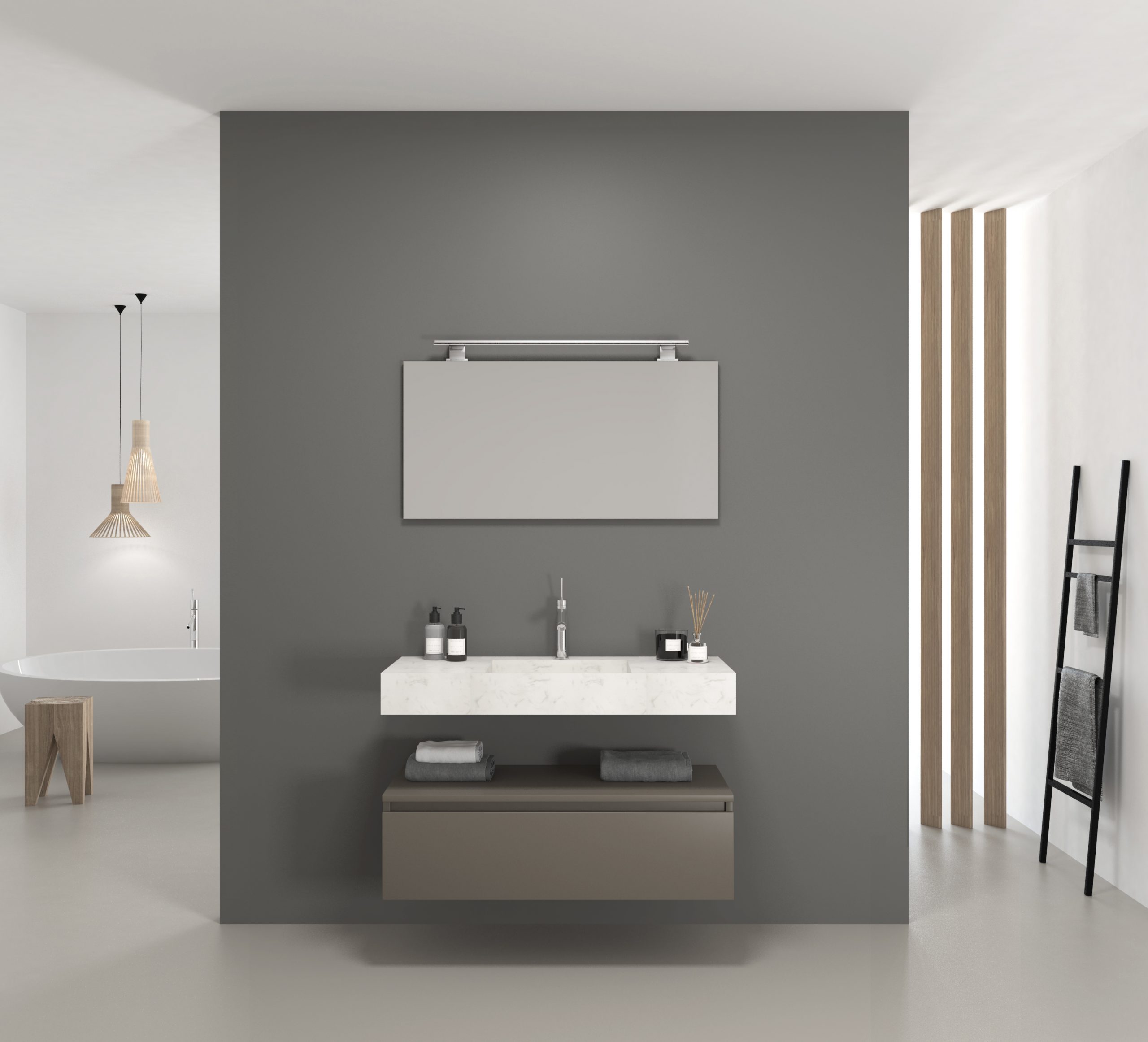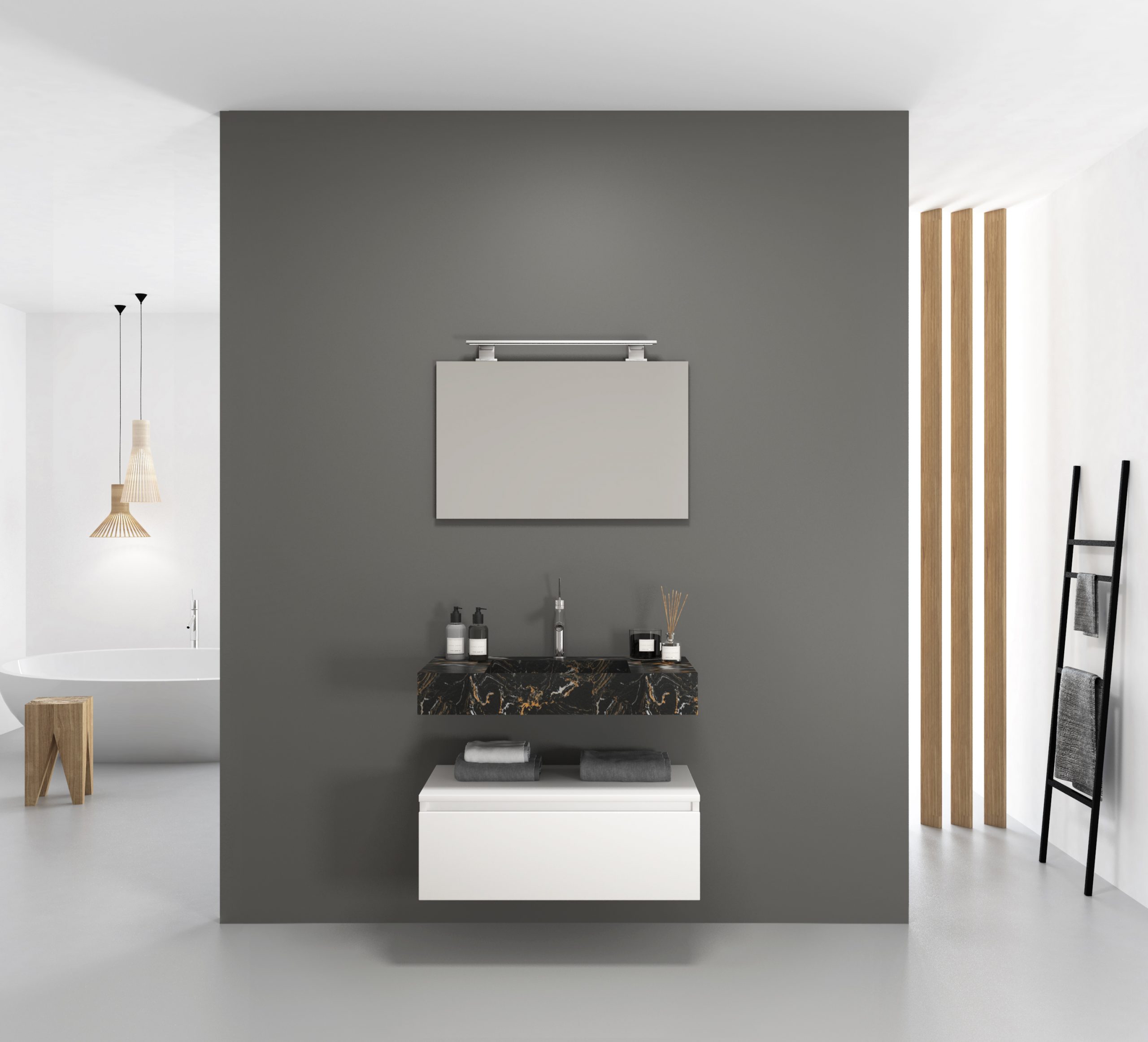 Pack compuesto por mueble de baño fabricado en tablero de partículas laminado de 19mm acabado mate con un cajón de gran capacidad, cierre suave y extracción total. Lavabo suspendido de mármol compacto con escuadras de acero inoxidable. Espejo liso y foco iluminación LED 6000K, 9,6W, 600lm. Fabricado en España. Grifo no incluido.
