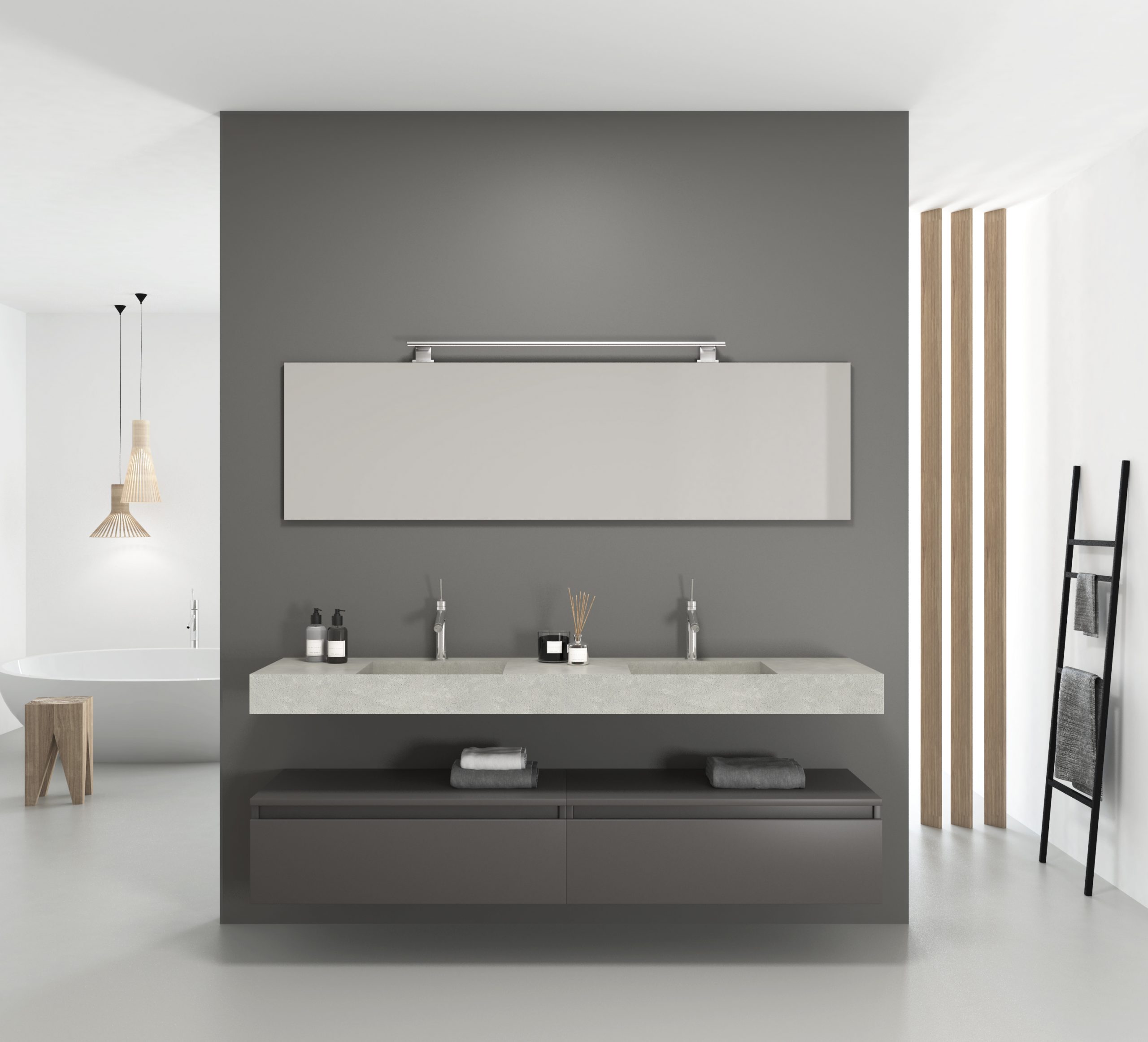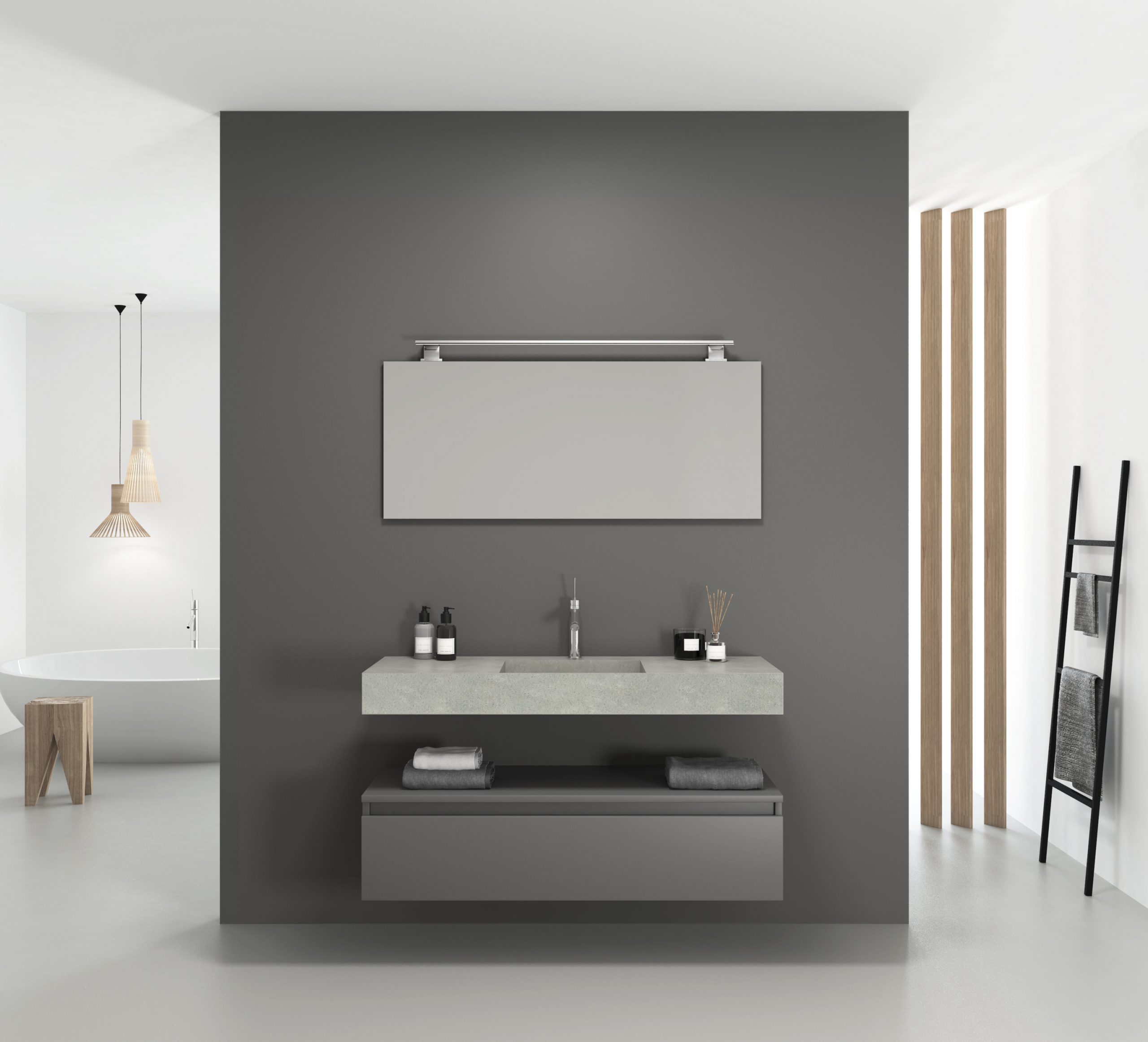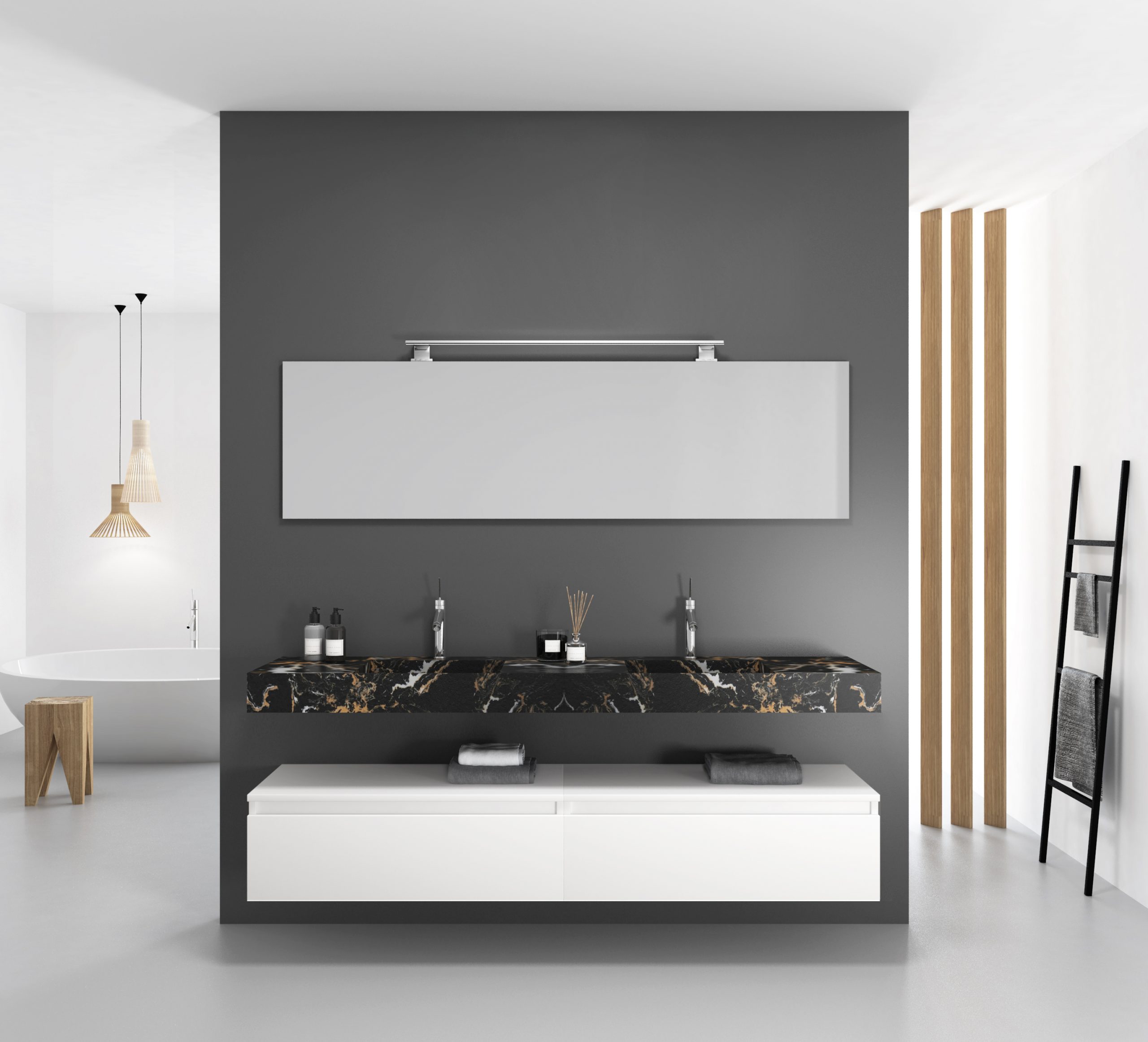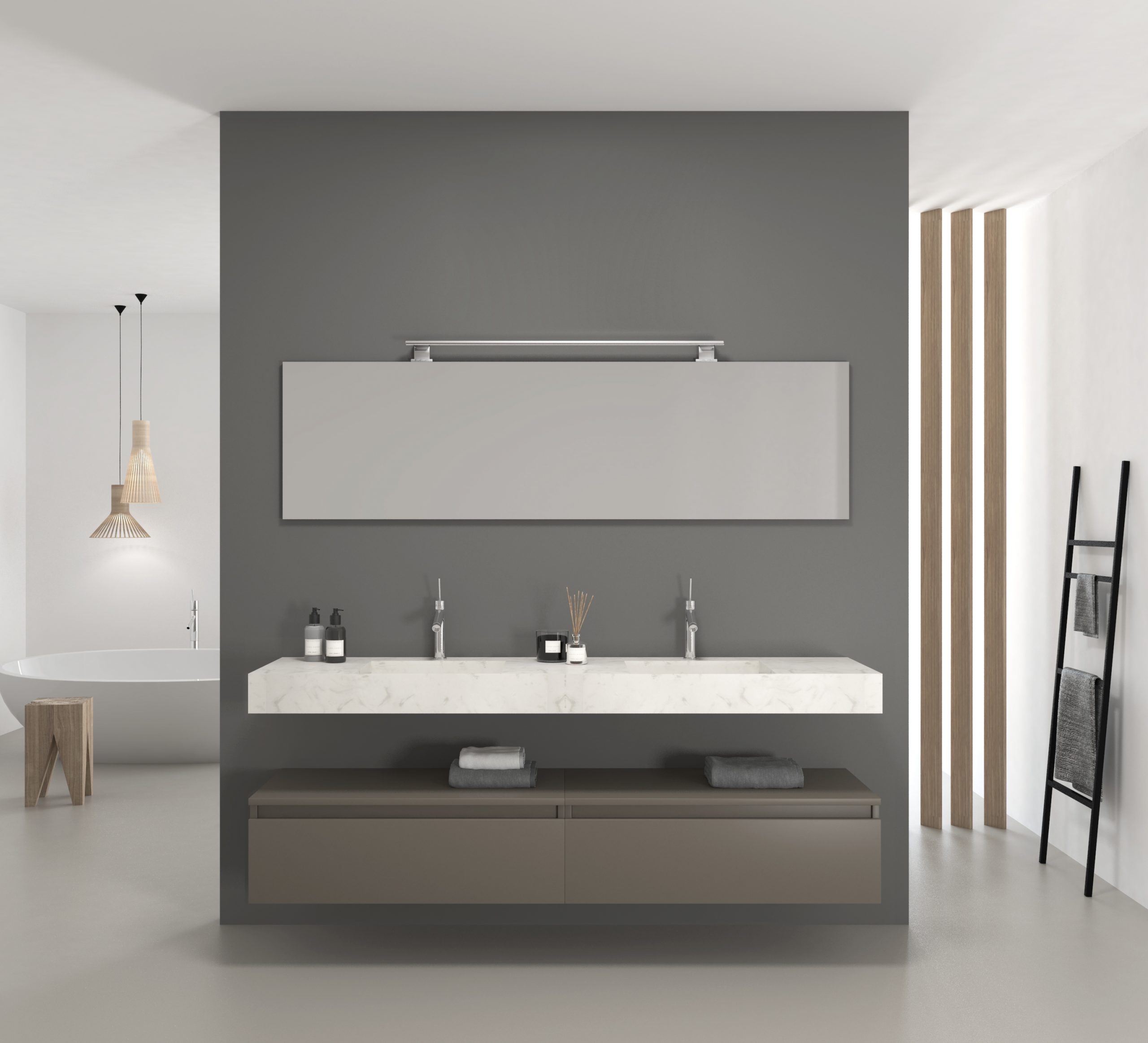 Pack compuesto por mueble de baño fabricado en tablero de partículas laminado de 19mm acabado mate con un cajón de gran capacidad, cierre suave y extracción total. Lavabo suspendido de mármol compacto con escuadras de acero inoxidable. Espejo liso y foco iluminación LED 6000K, 9,6W, 600lm. Fabricado en España. Grifo no incluido.