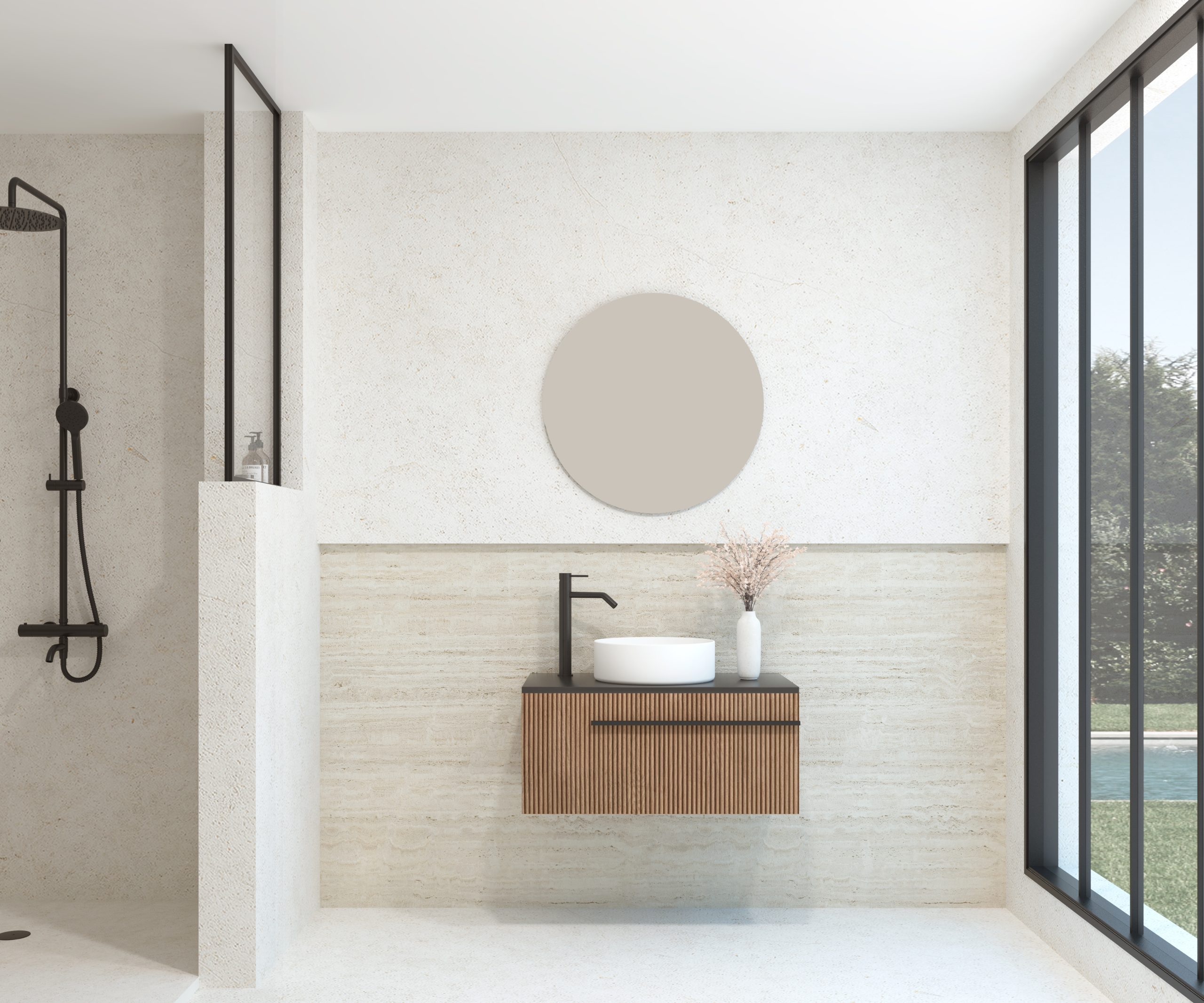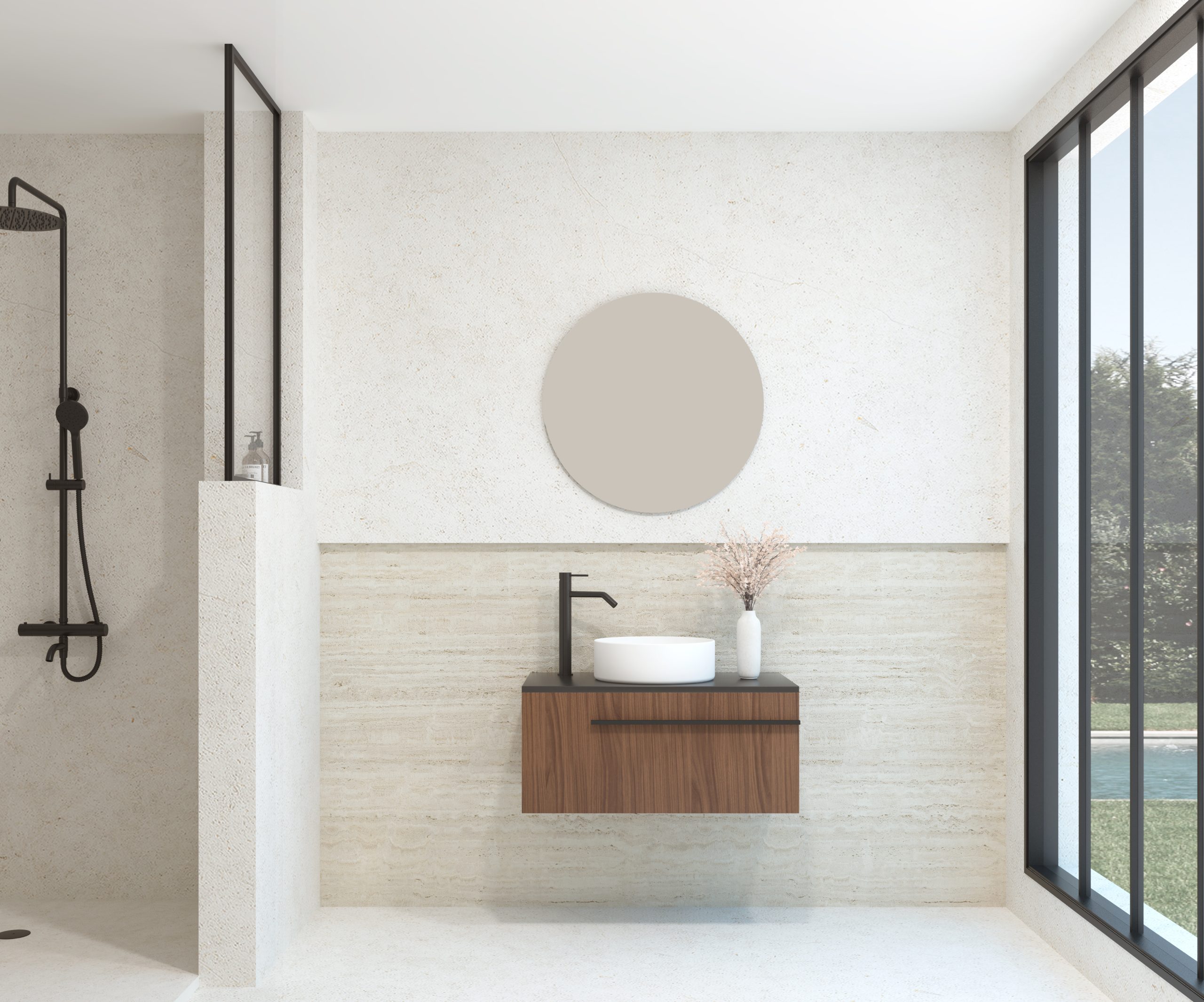 Miroir design circulaire. Vasque à poser en céramique incluse. Livré monté, prêt à être fixé au mur. Comprend toute la quincaillerie nécessaire. Fabriqué en Espagne. Robinet et siphon non inclus. Meuble suspendu composé d’un module de portes et d’un espace décoratif latéral.