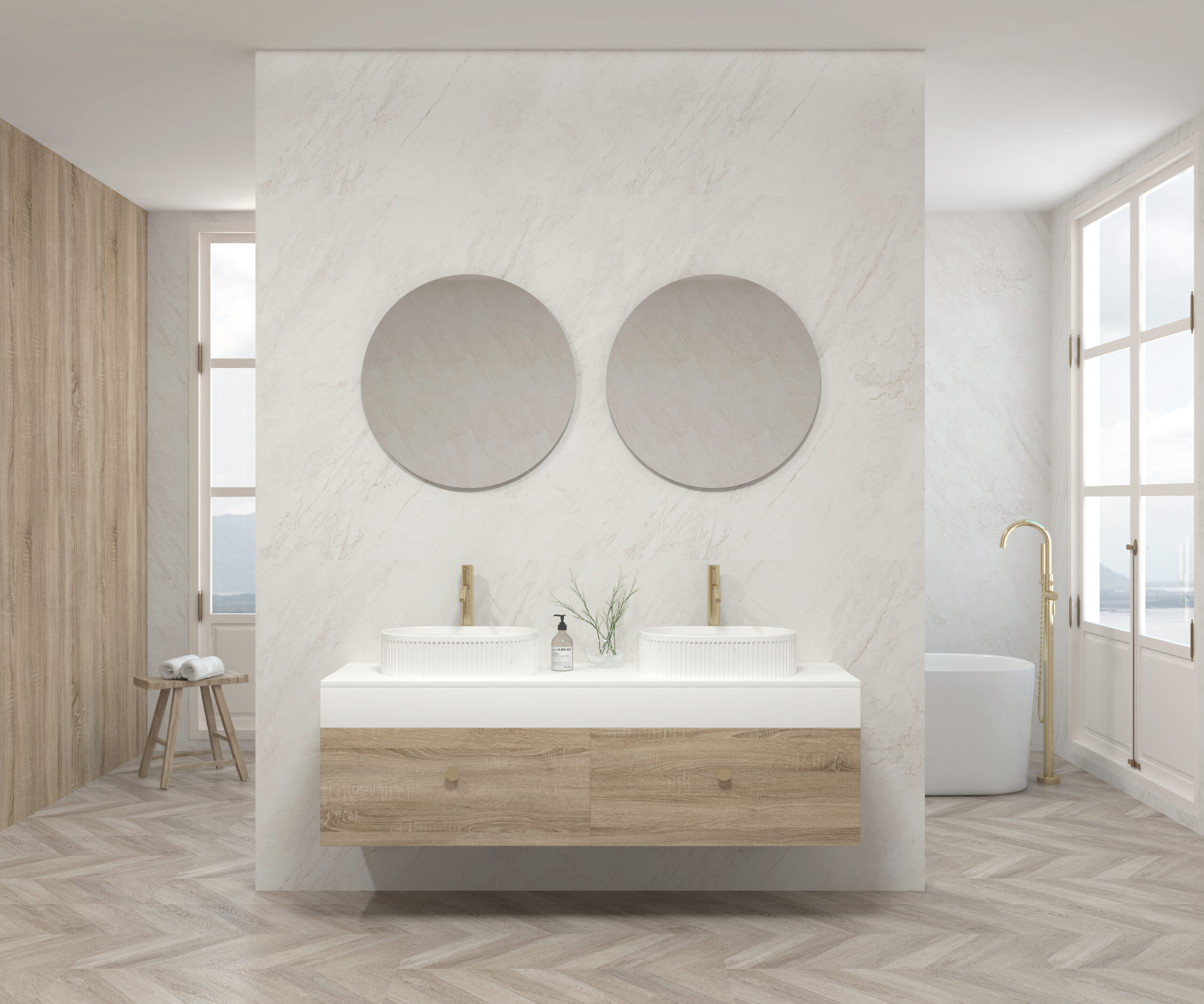 El mueble está fabricado en tablero de partículas de 16 mm con recubrimiento melamínico, ecológico, reciclable y de alta durabilidad. Los cajones metálicos, de doble pared y estética minimalista, cuentan con cierre amortiguado, acceso total, capacidad de carga de hasta 25 kg y espacio trasero disponible. El cajón superior incluye hueco para el sifón, facilitando la instalación.