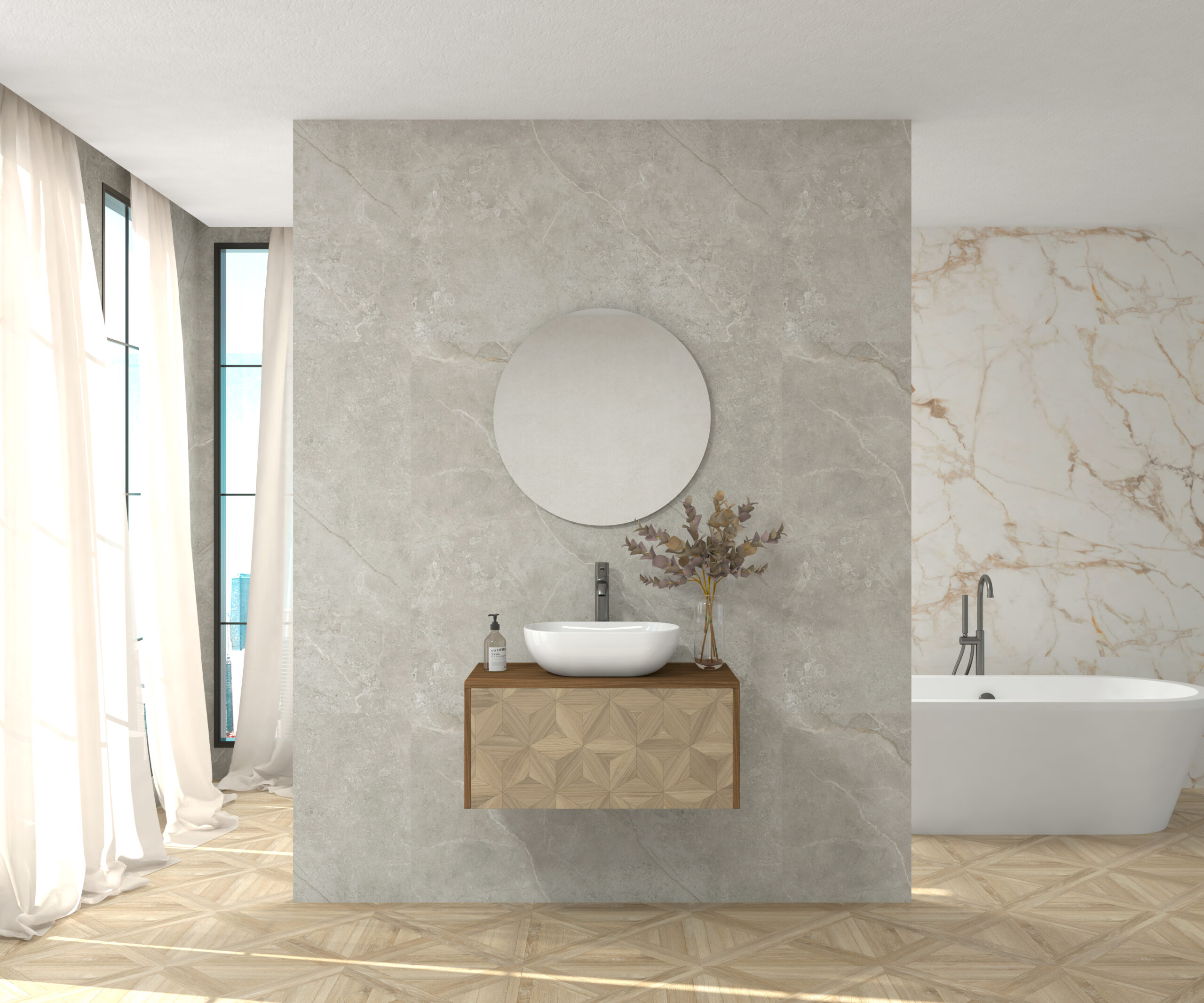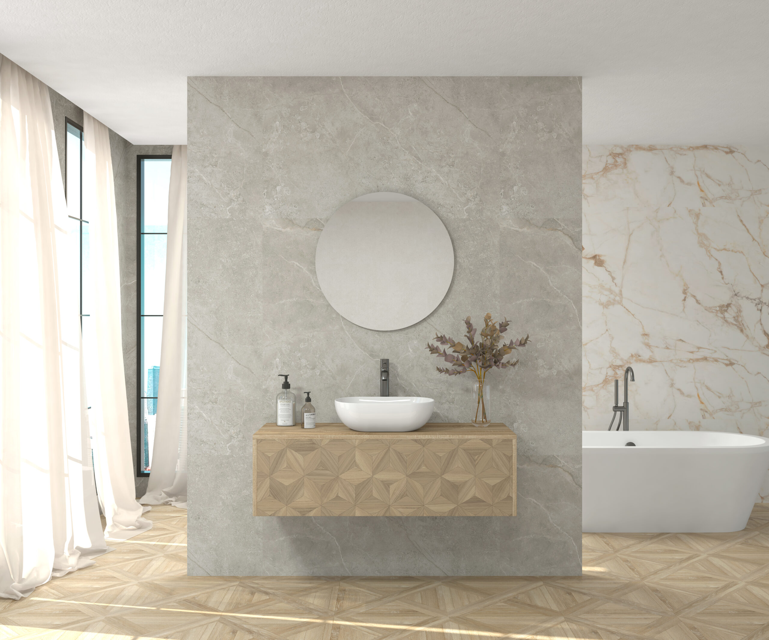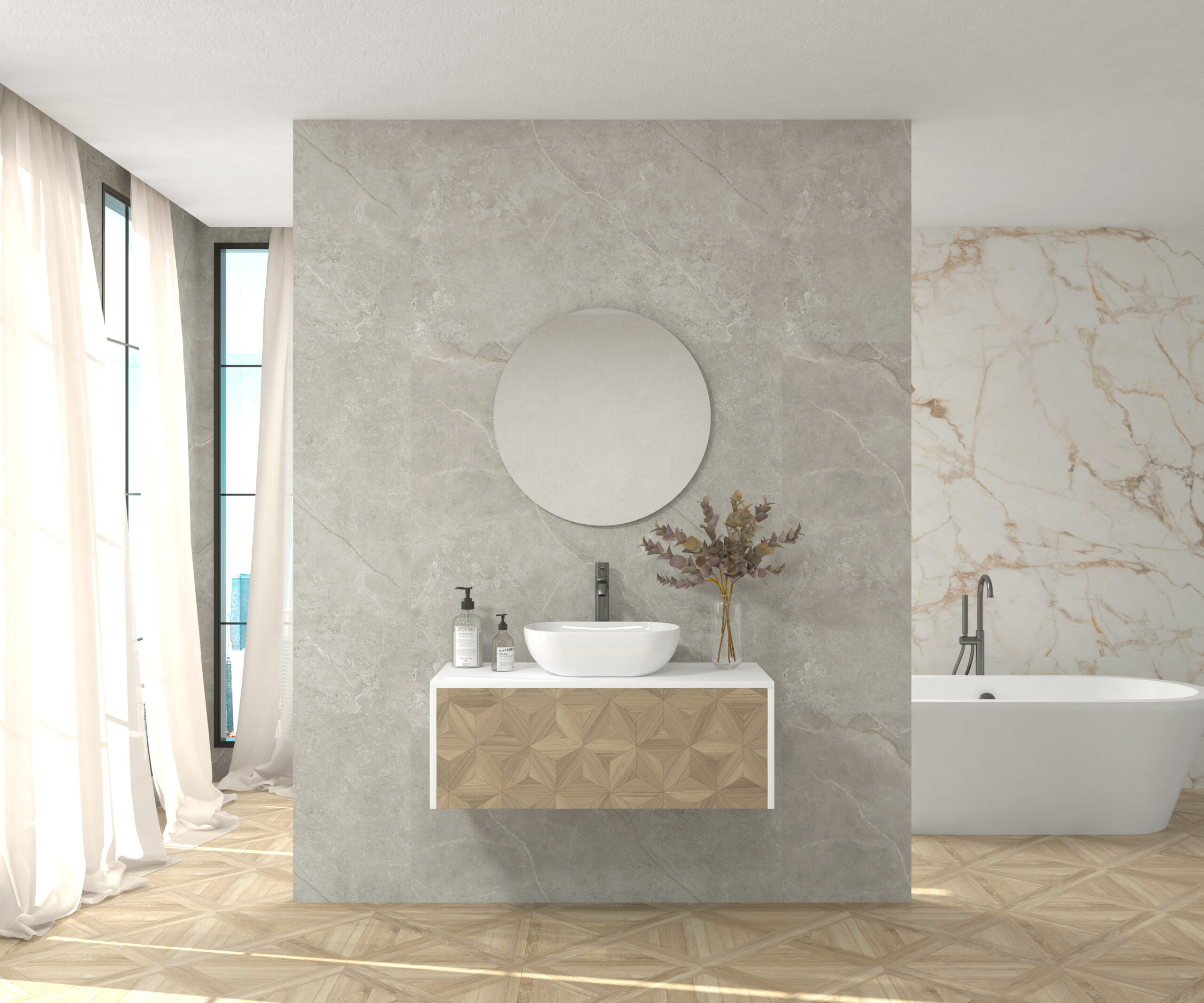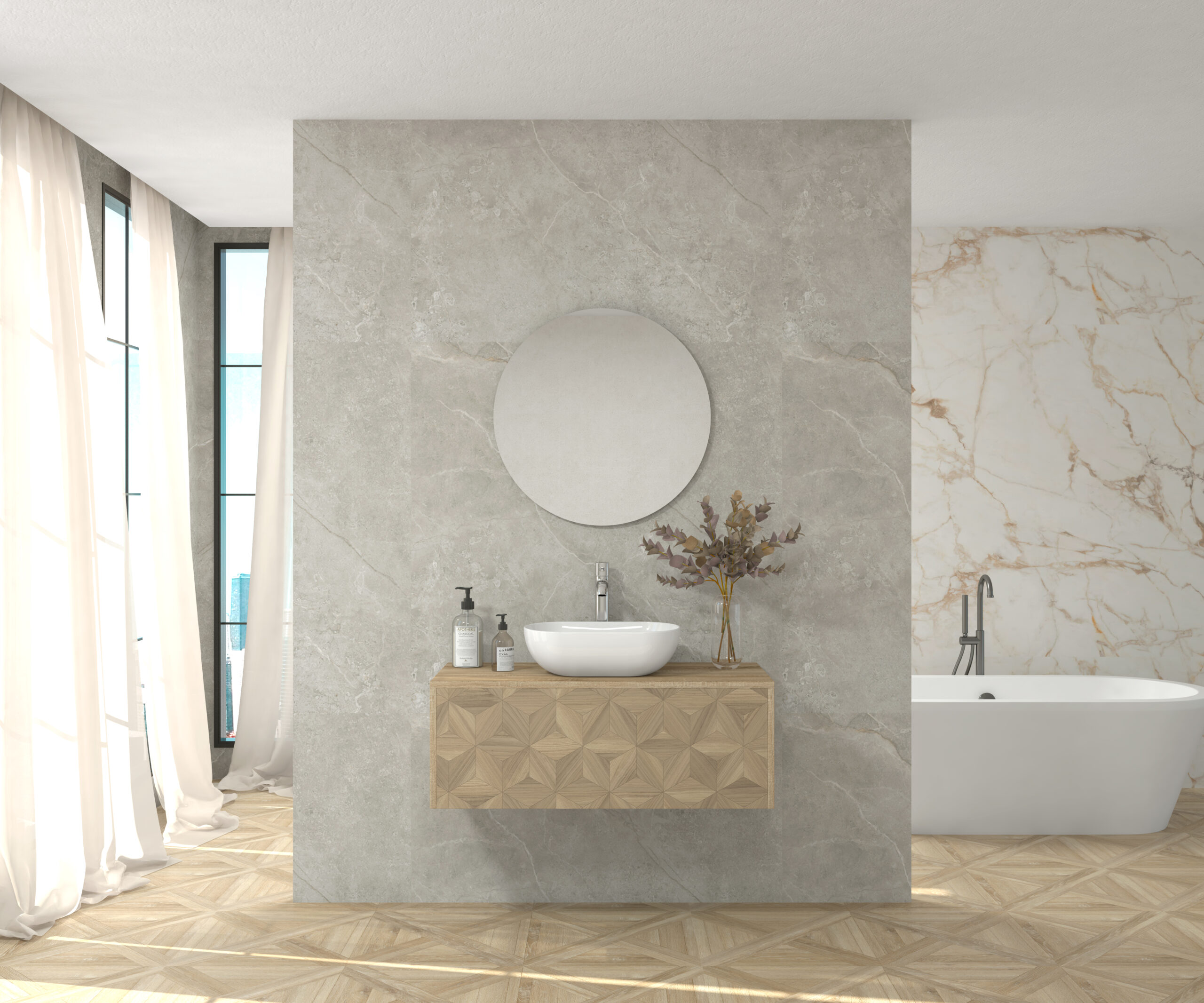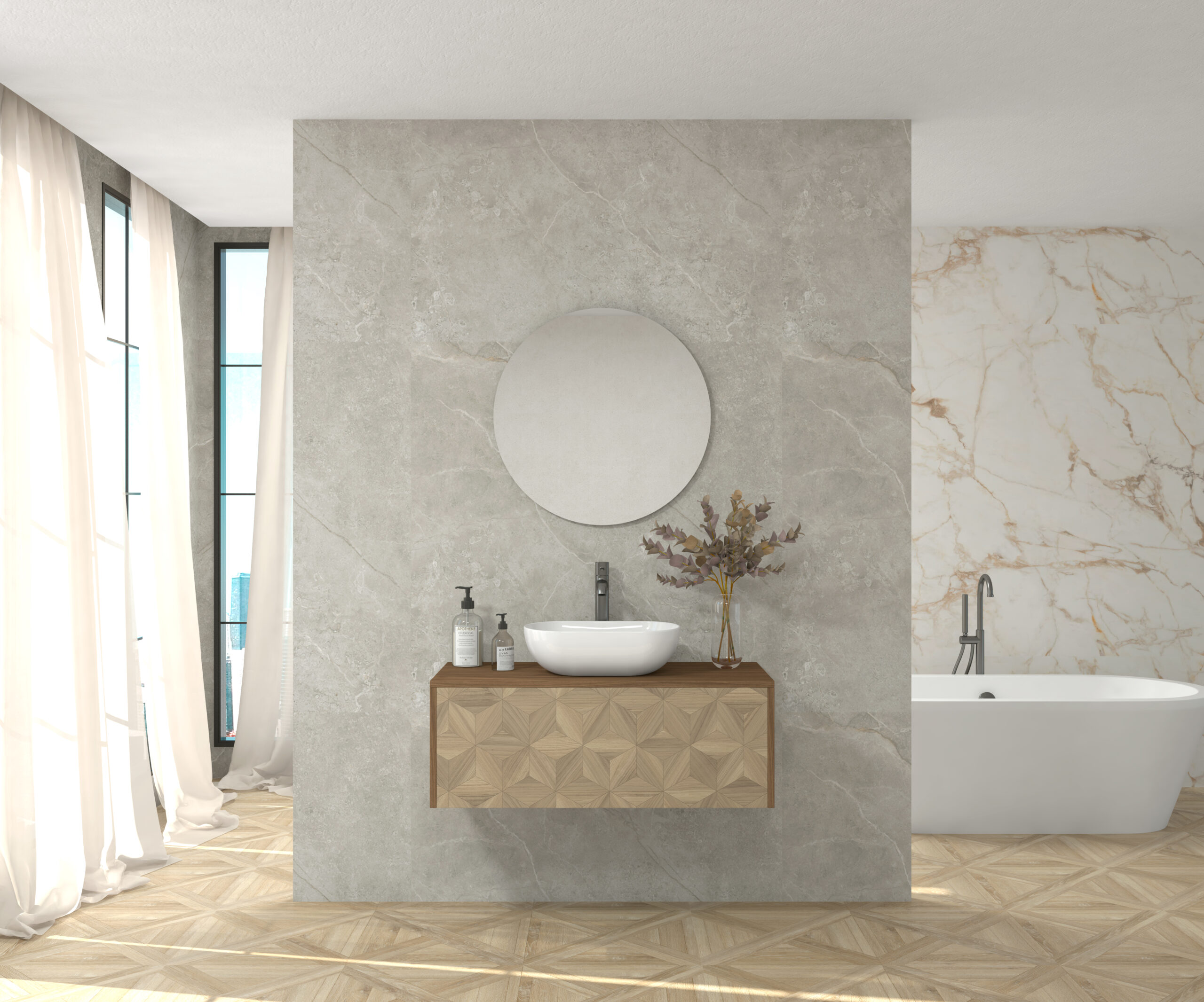 El pack se completa con un espejo de diseño circular y un lavabo sobre encimera. Se entrega montado y listo para ser colgado en la pared, incluyendo todo el herraje necesario para su instalación. Producto fabricado en España. *Grifo y sifón no incluidos.*