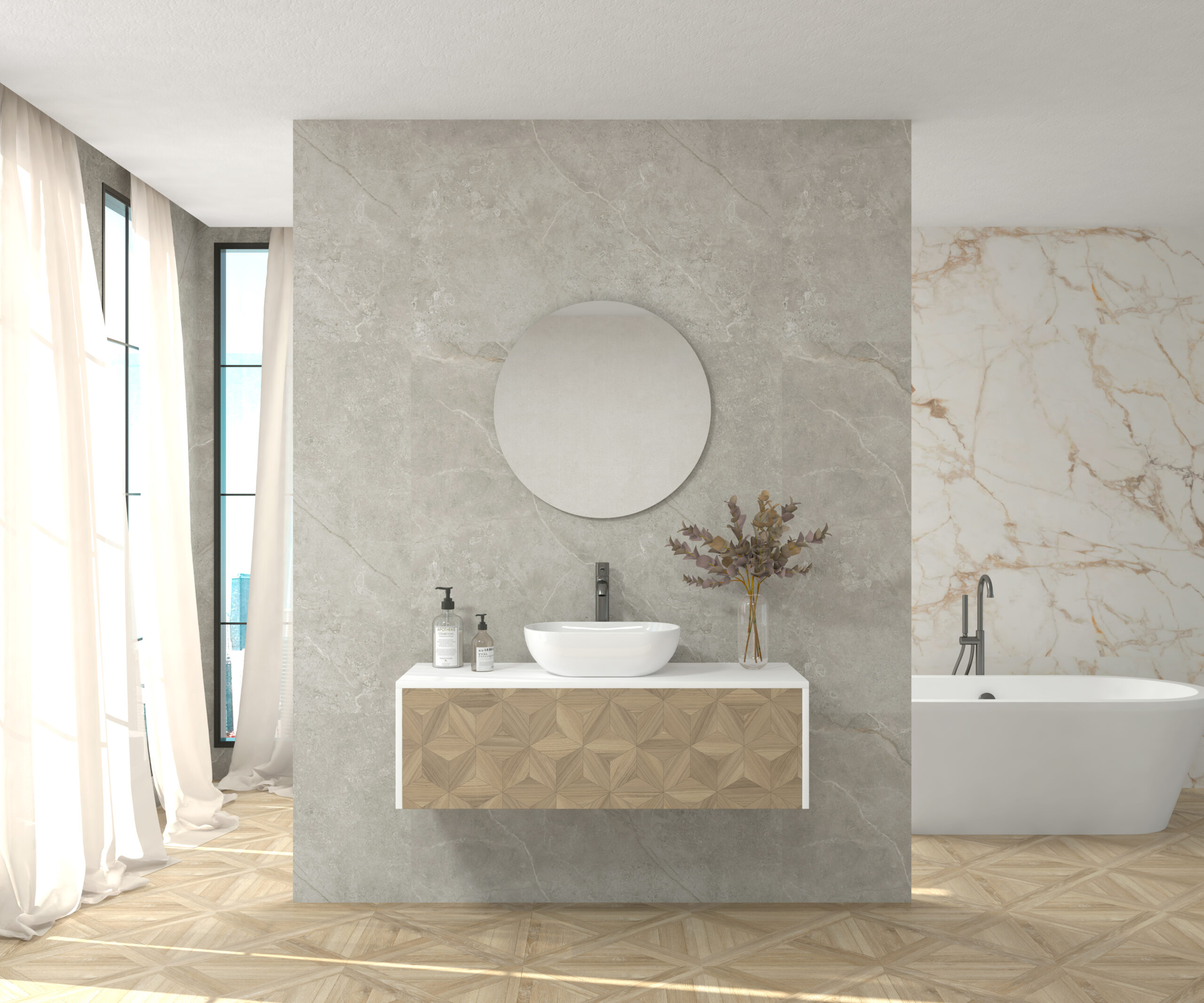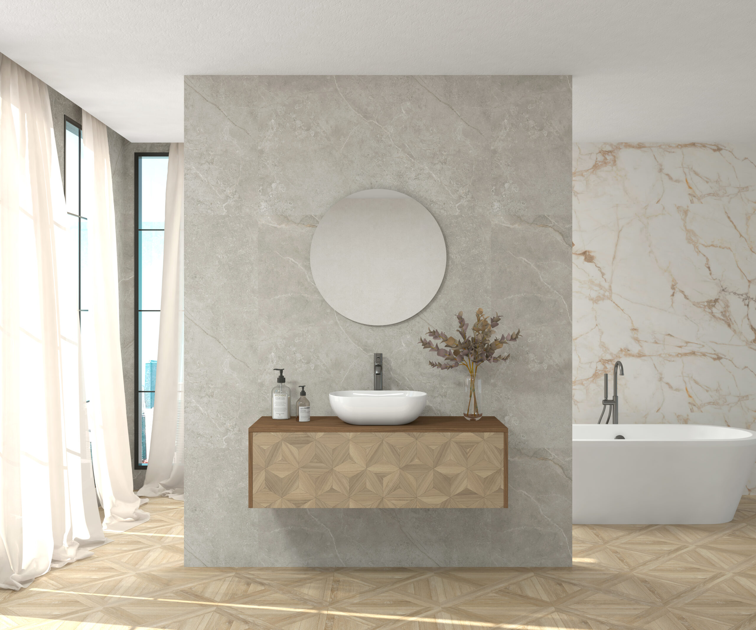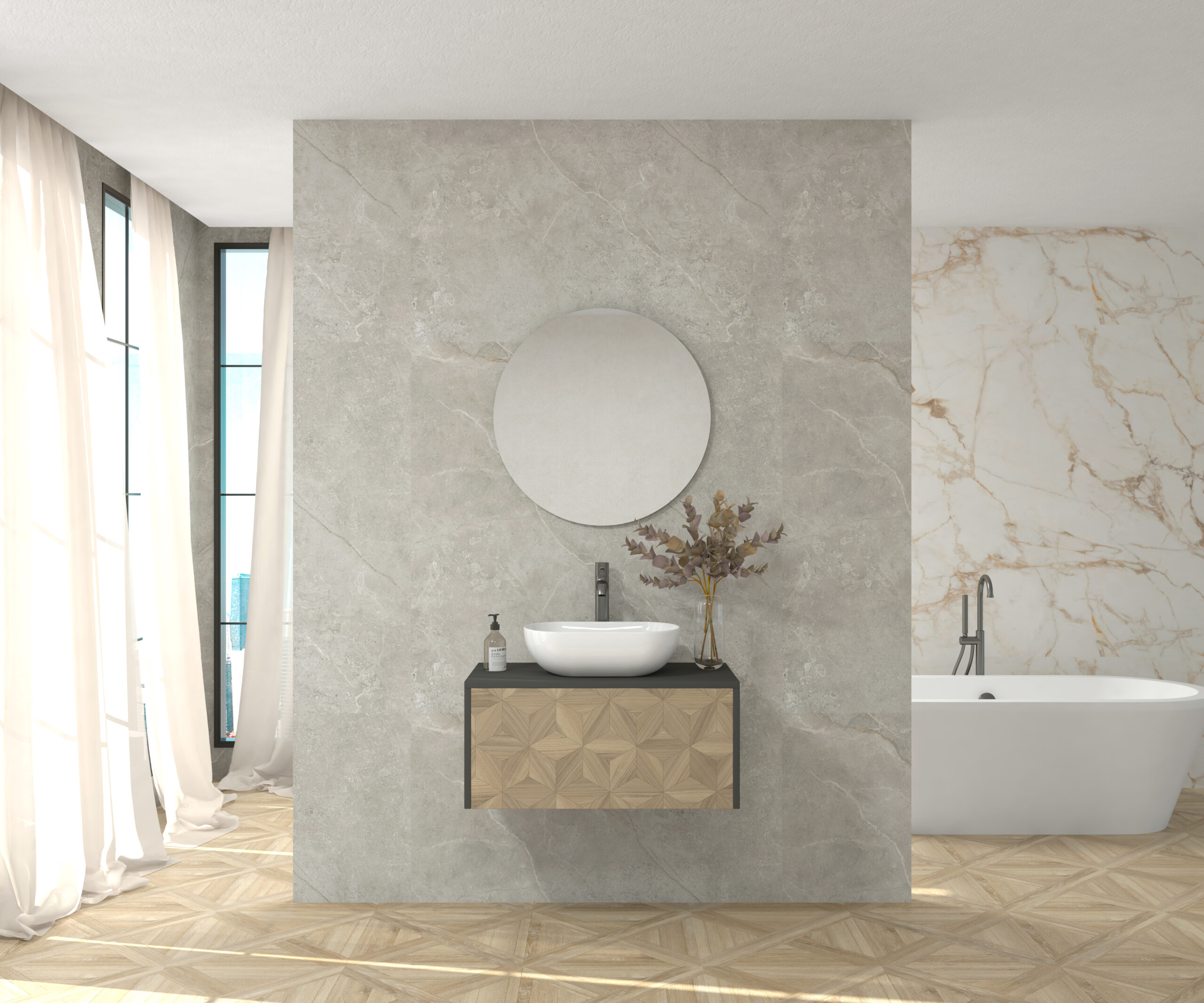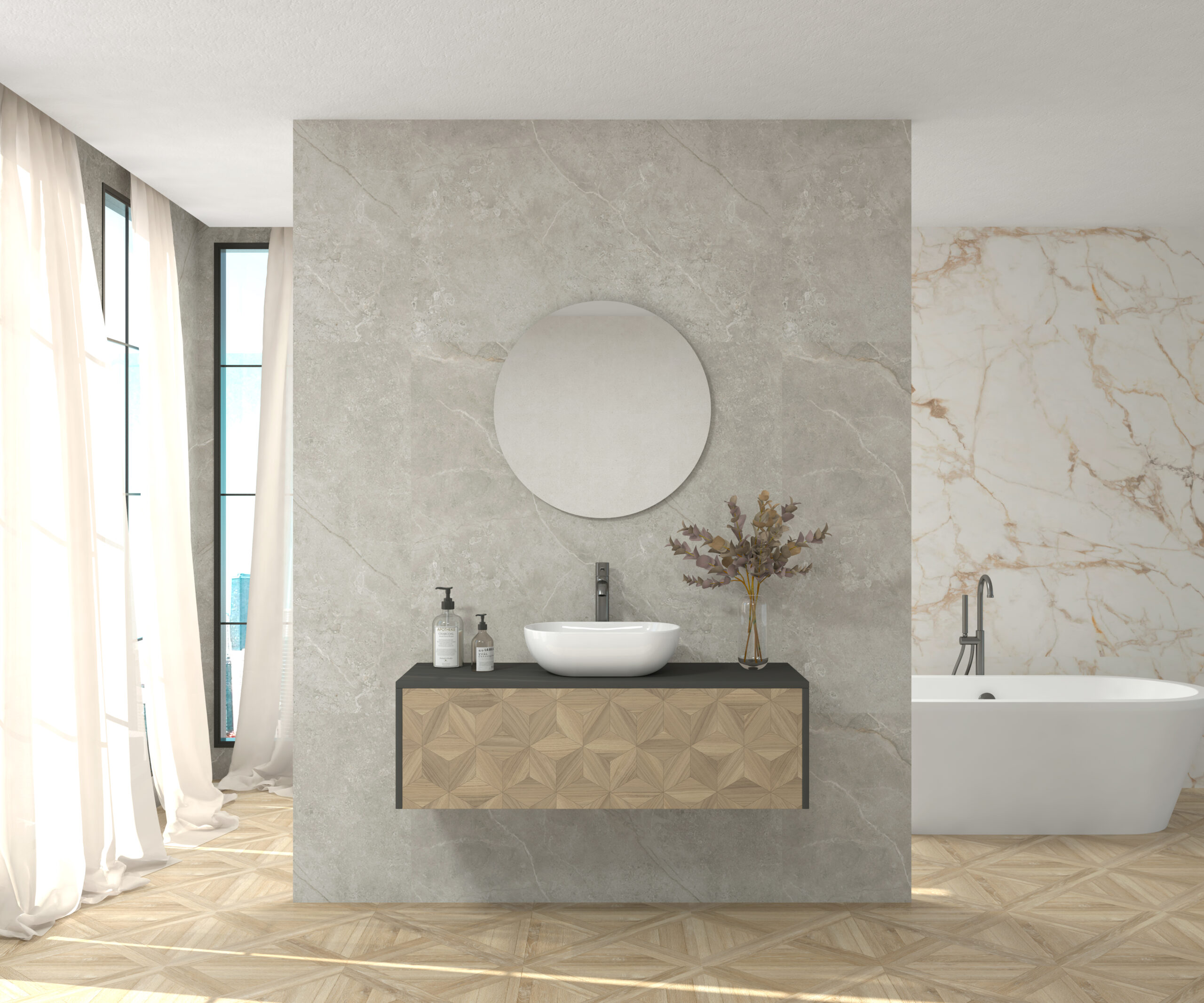 El mueble suspendido cuenta con un módulo de cajón que ofrece un amplio espacio de almacenamiento. Está fabricado en tablero de partículas de 19 mm con recubrimiento melamínico, un material ecológico y reciclable. Su cajón metálico de doble pared presenta un diseño minimalista con costillas finas y líneas rectas, además de un sistema de cierre amortiguado y una capacidad de carga de 25 kg. Ofrece accesibilidad total y un espacio trasero disponible para mayor funcionalidad.