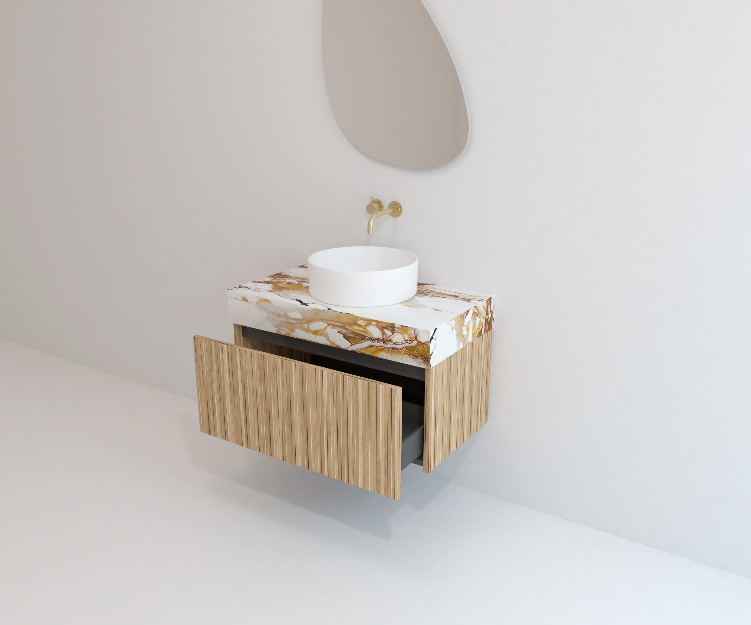 Pack compuesto por encimera de material Dekton de Cosentino, mueble suspendido, lavabo diseño estriado y espejo alma.