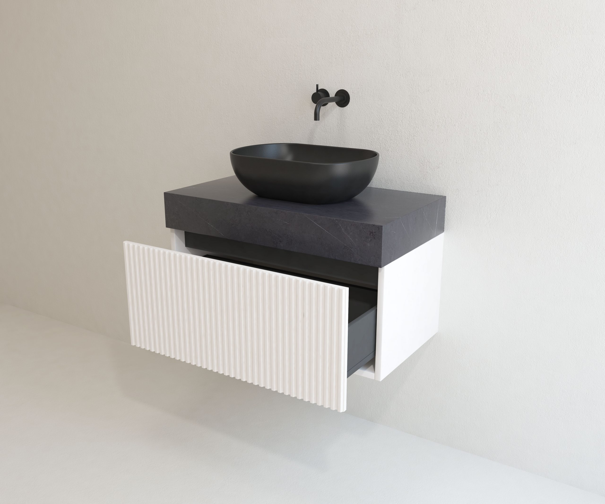 Pack formado por mueble de baño realizado en tablero laminado con un cajón totalmente extraíble y cierre softclosing. Lavabo de Solid Surface, espejo y foco iluminación LED incluidos. Made in Europe.
