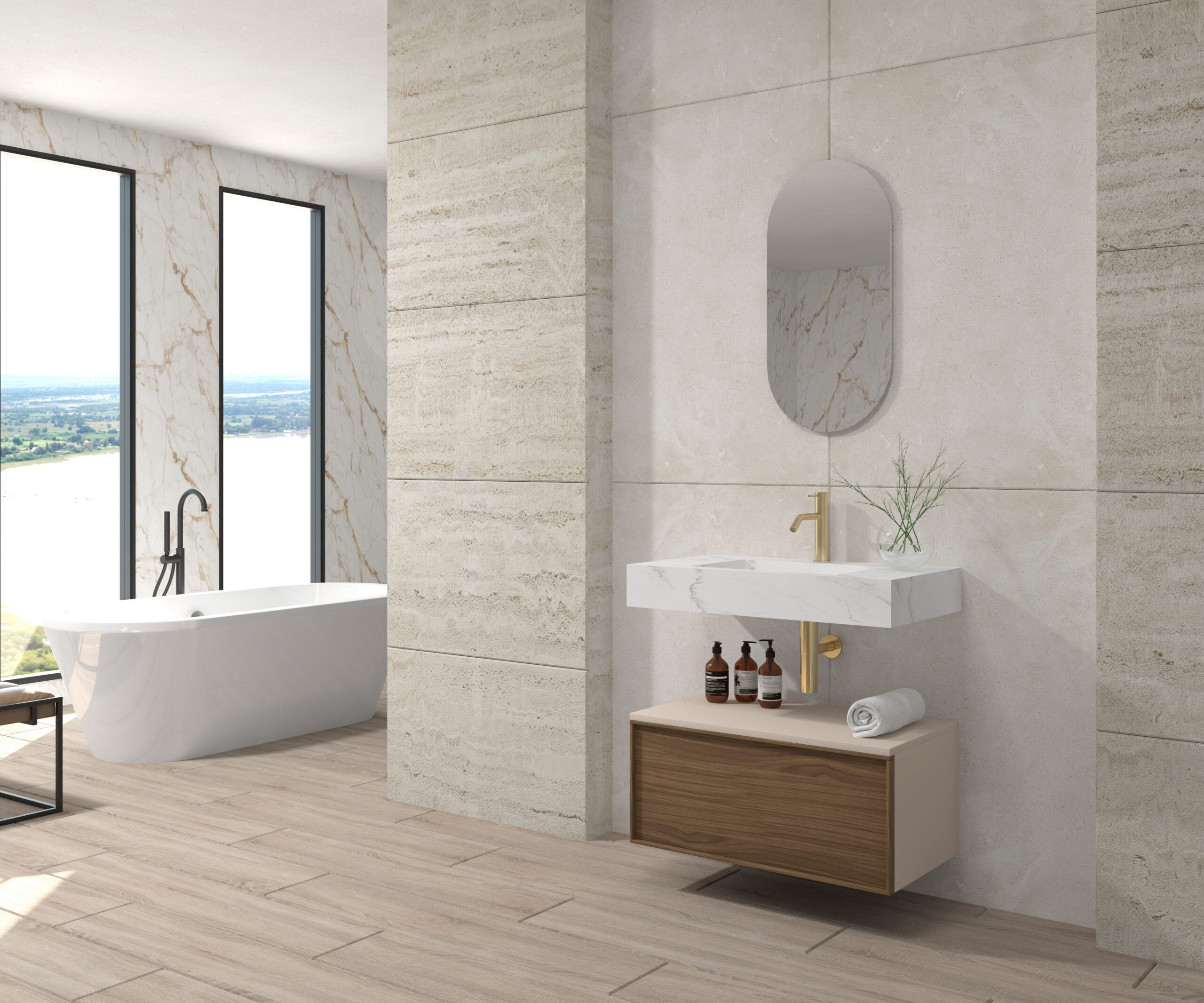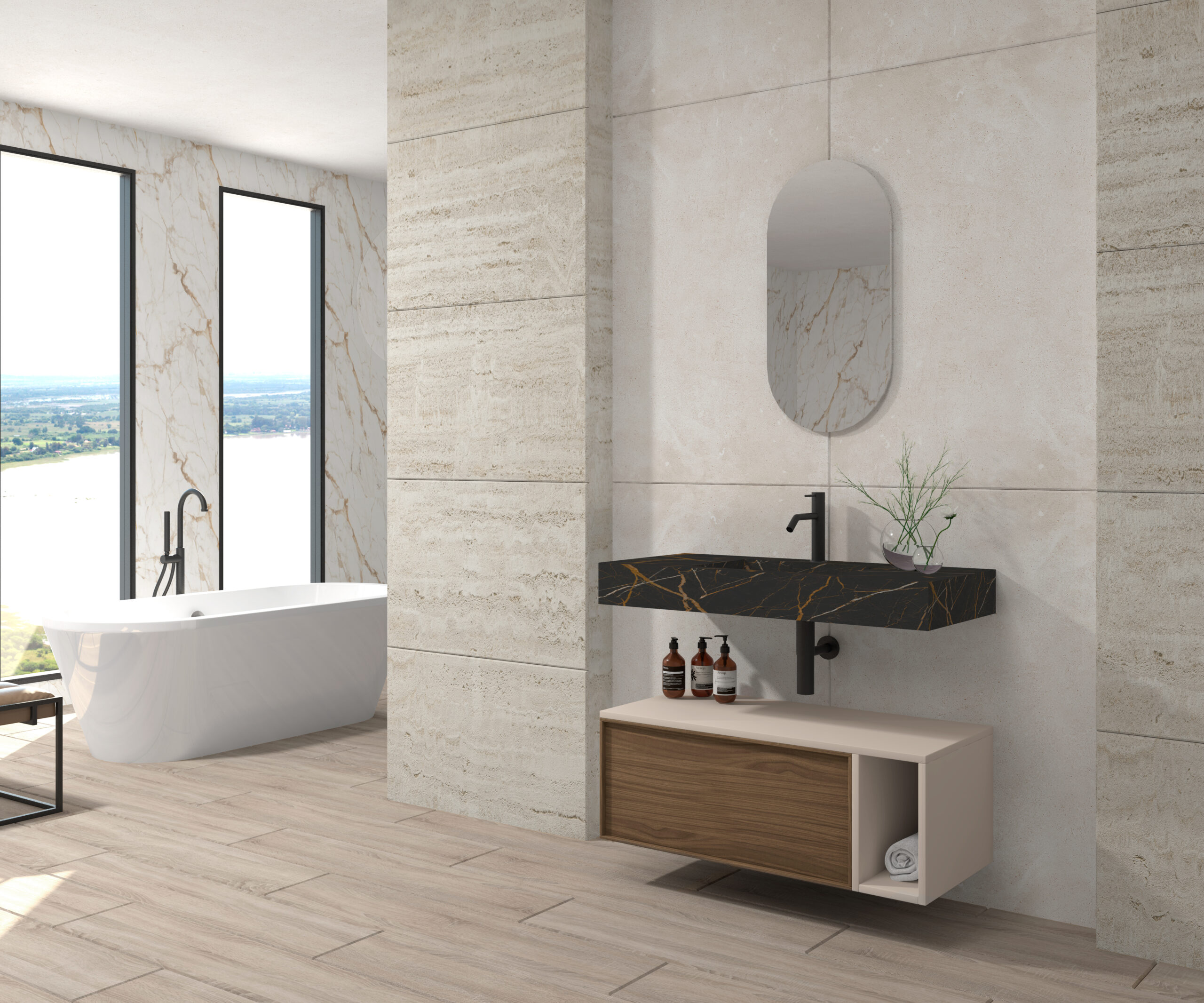 Pack compuesto por mueble suspendido para lavabo, lavabo de piedra sinterizada y espejo diseño cápsula.