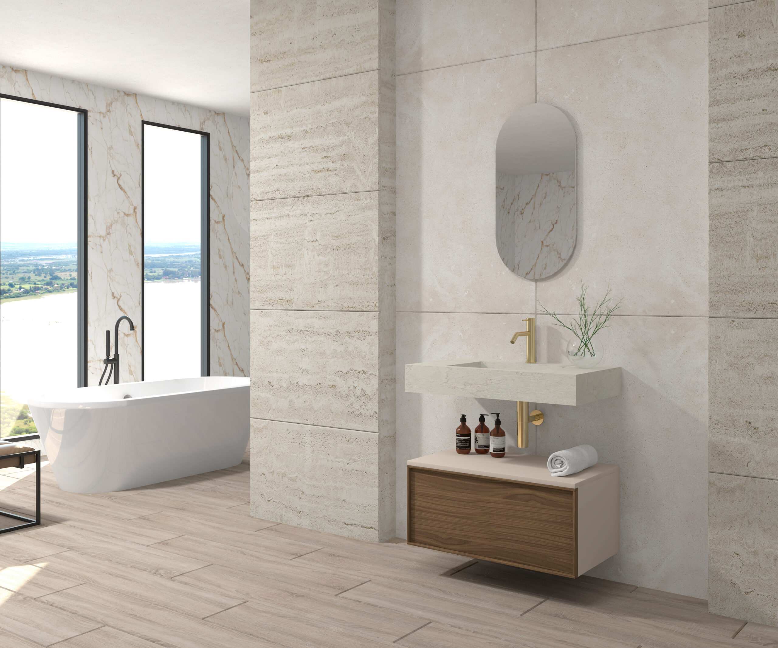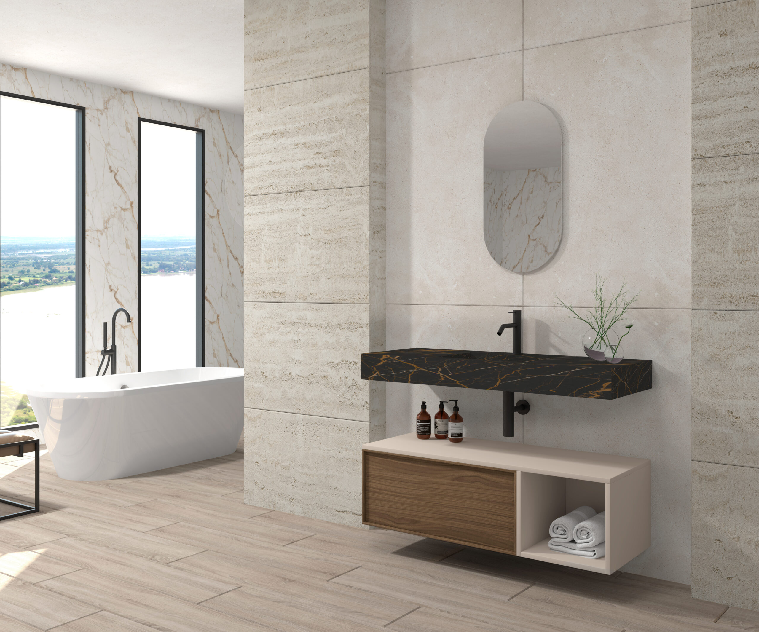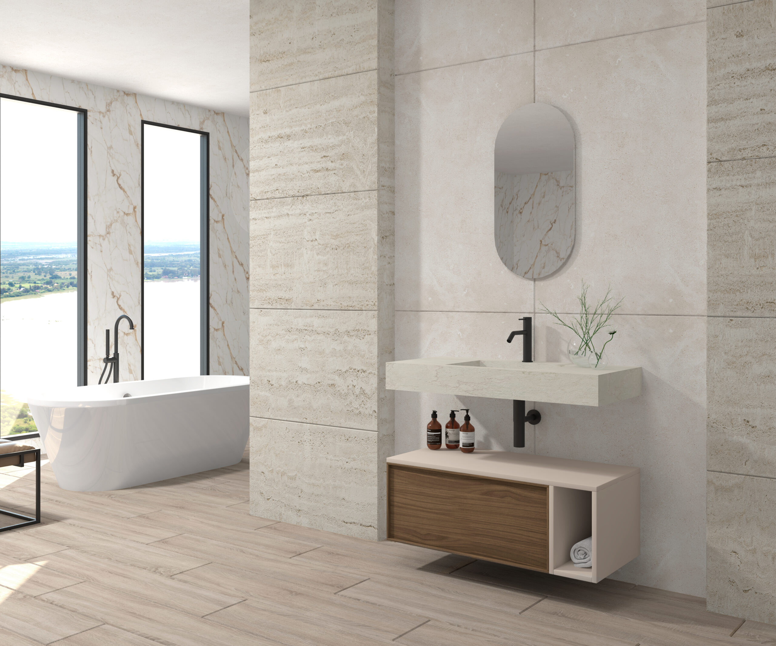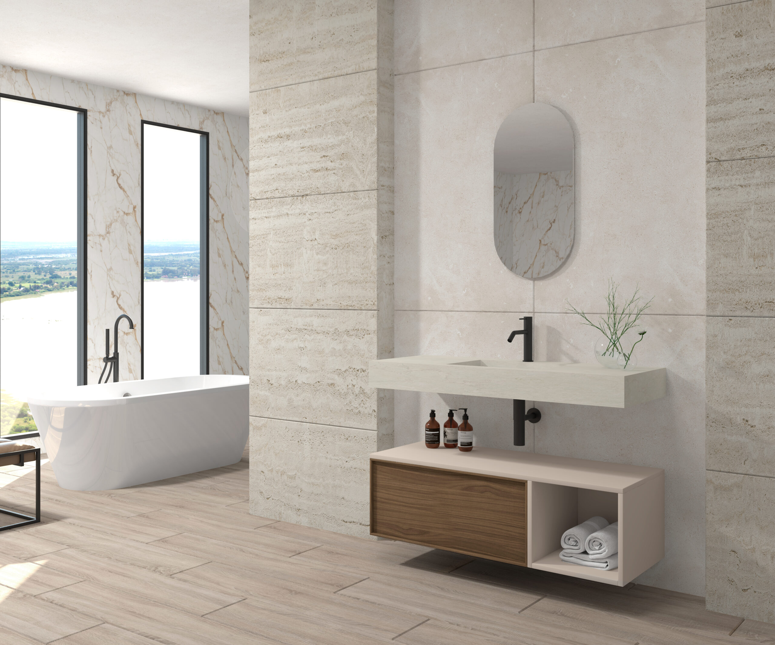 Lavabo suspendido fabricado en superficie de piedra sinterizada, un material de última generación que combina diseño y máxima resistencia. Su composición mineral sometida a altas temperaturas garantiza una estructura compacta, no porosa y extremadamente duradera.