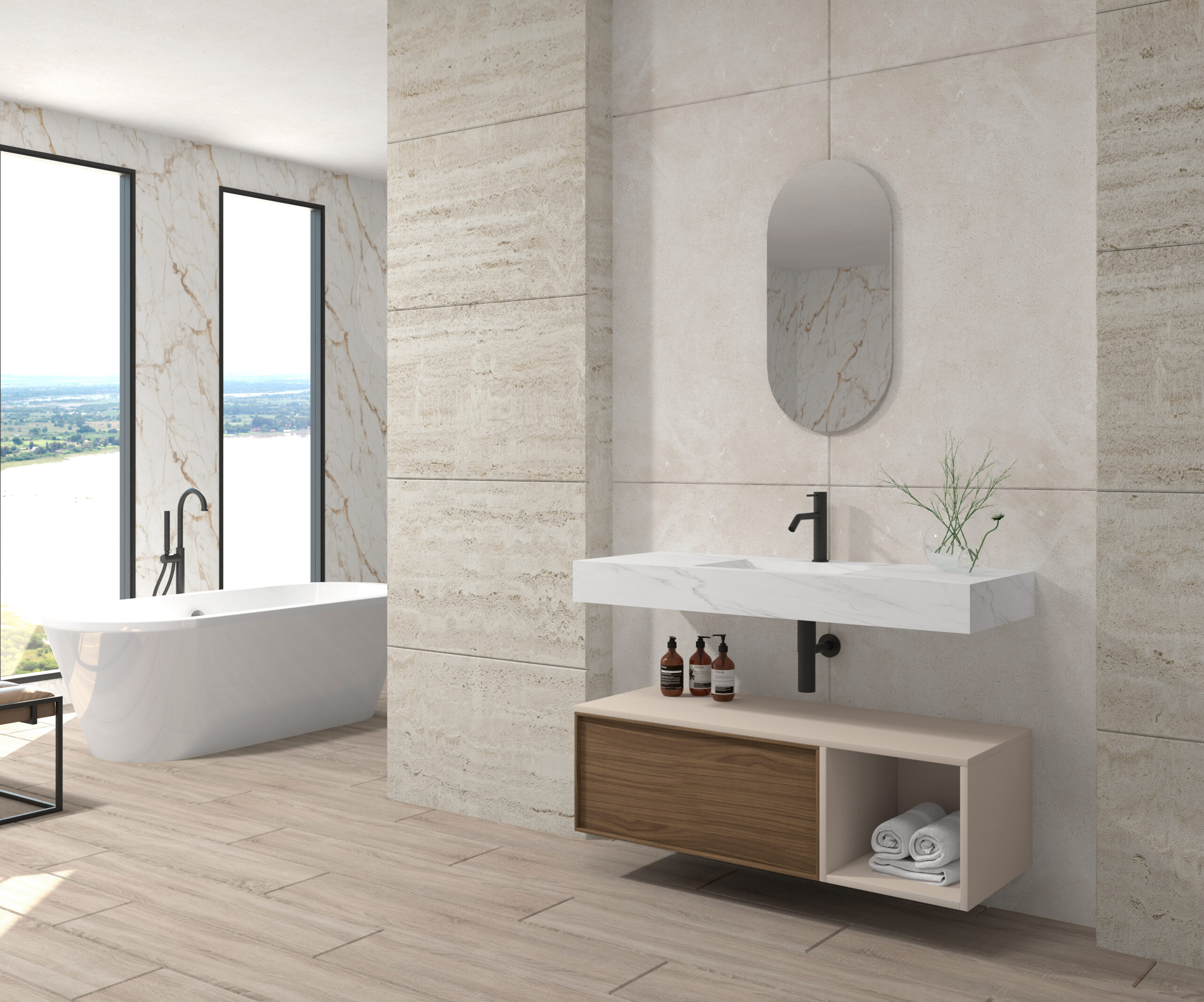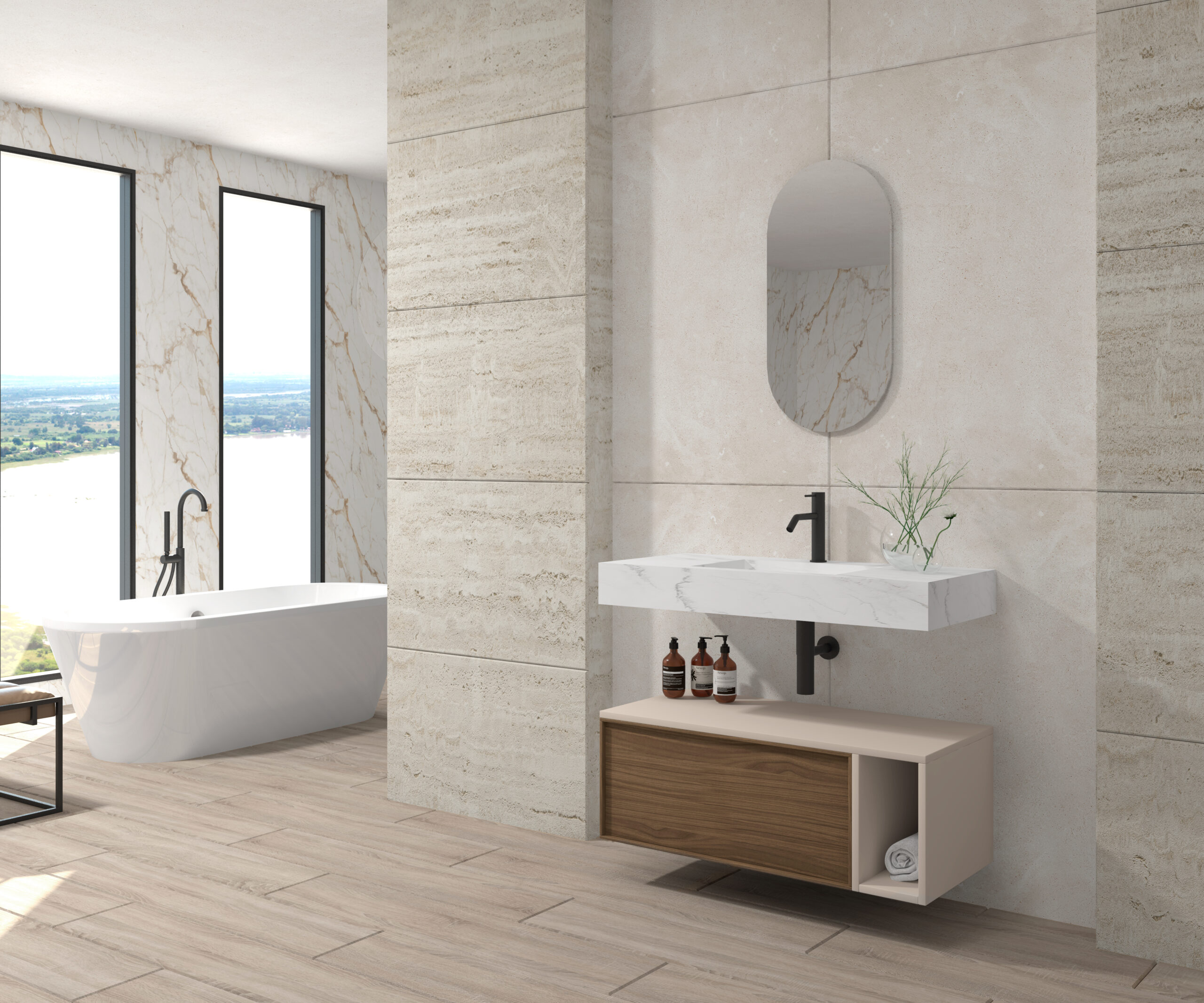 El mueble suspendido cuenta con un módulo de cajón que ofrece un amplio espacio de almacenamiento. Frente fabricado en madera de nogal natural, caracterizado por su veta elegante y su tonalidad cálida y profunda. Aporta sofisticación y equilibrio al mueble, convirtiéndose en una opción atemporal para baños contemporáneos. El resto del mueble está fabricado en tablero de partículas de 19 mm con recubrimiento melamínico, un material ecológico y reciclable. Su cajón metálico de doble pared presenta un diseño minimalista con costillas finas y líneas rectas, además de un sistema de cierre amortiguado y una capacidad de carga de 25 kg. Ofrece accesibilidad total y un espacio trasero disponible para mayor funcionalidad.