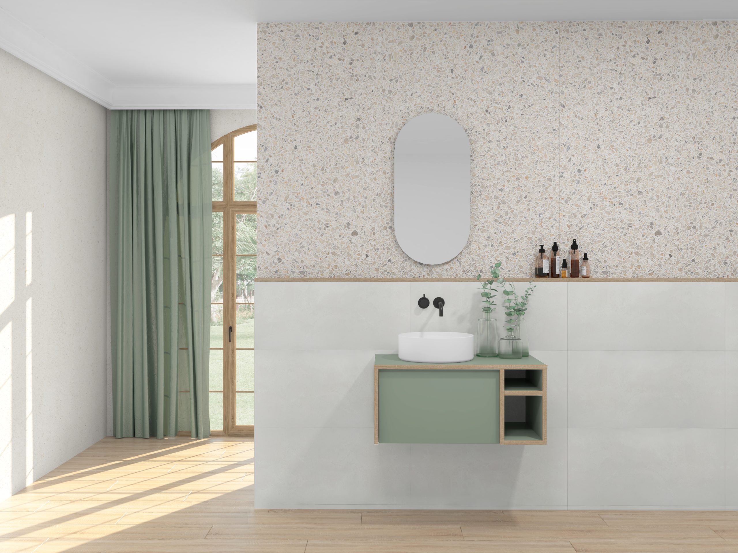 Mueble suspendido formado por un módulo de cajón y espacio decorativo lateral fabricado en tablero de partículas de 19 mm con recubrimiento melamínico, ecológico y reciclable. Cajón metálico de doble pared de estética minimalista, de costillas finas y líneas rectas, con cierre amortiguado y una capacidad de carga de 25 kg. Cajón con accesibilidad total y espacio trasero disponible.
