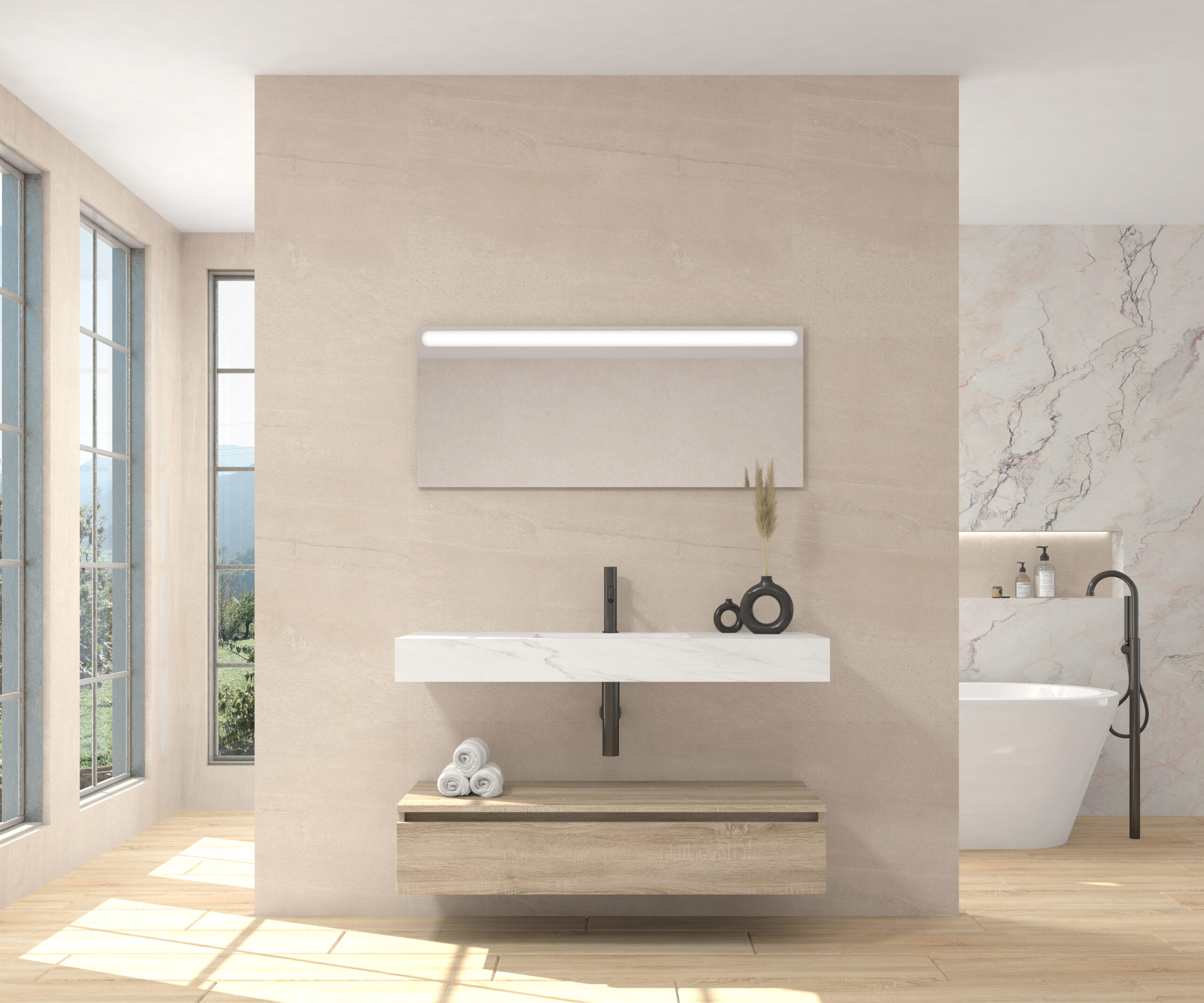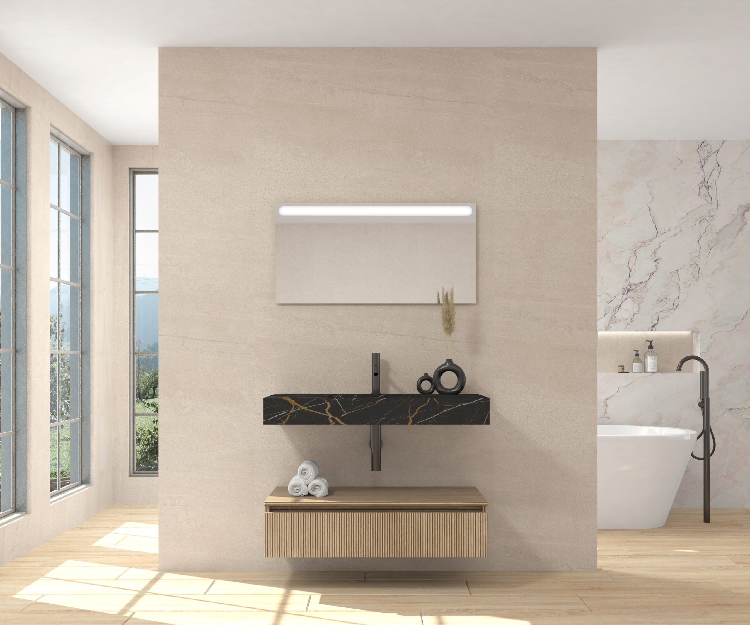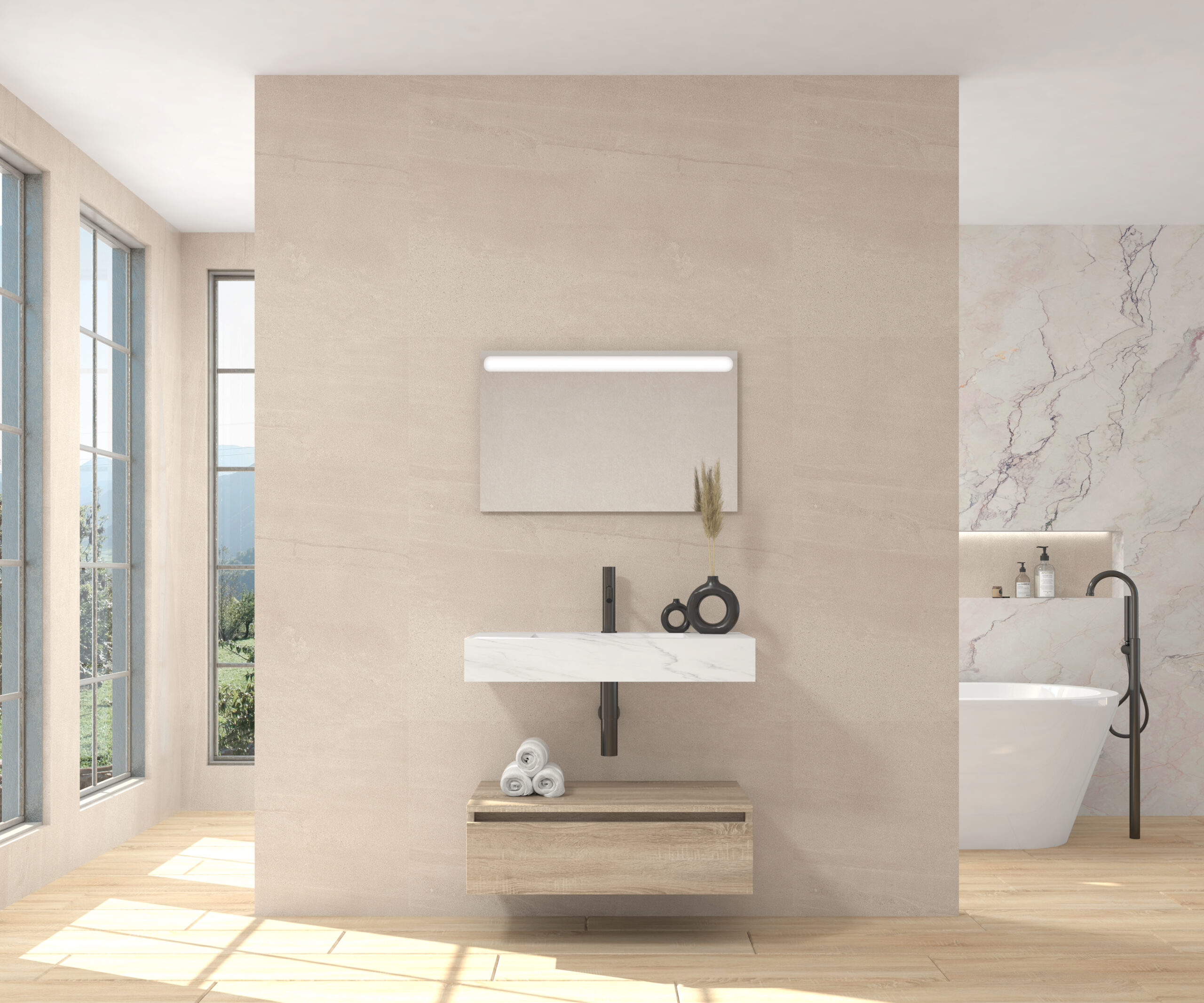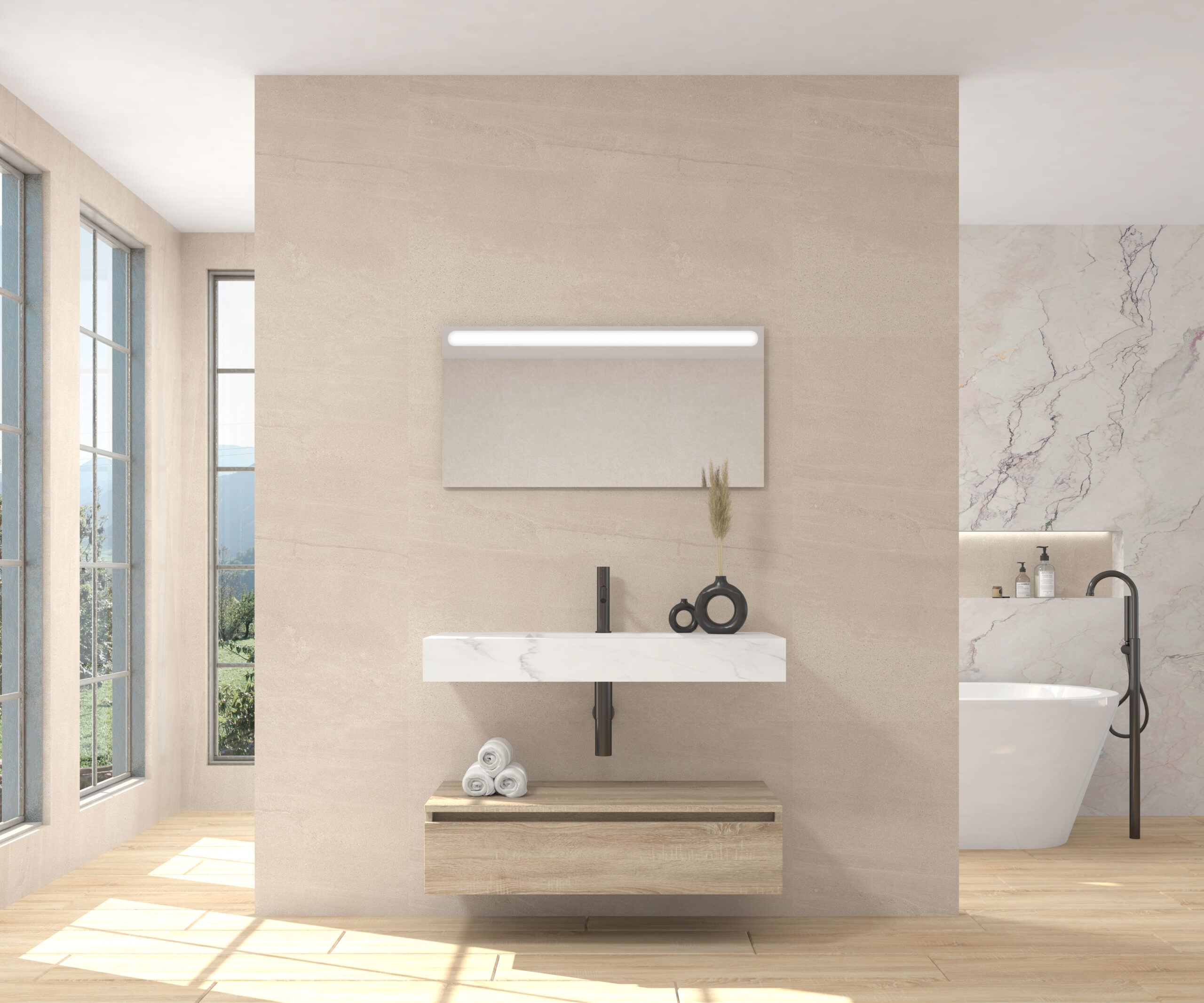 Pack compuesto por mueble suspendido para lavabo, lavabo de piedra sinterizada y espejo con iluminación LED.