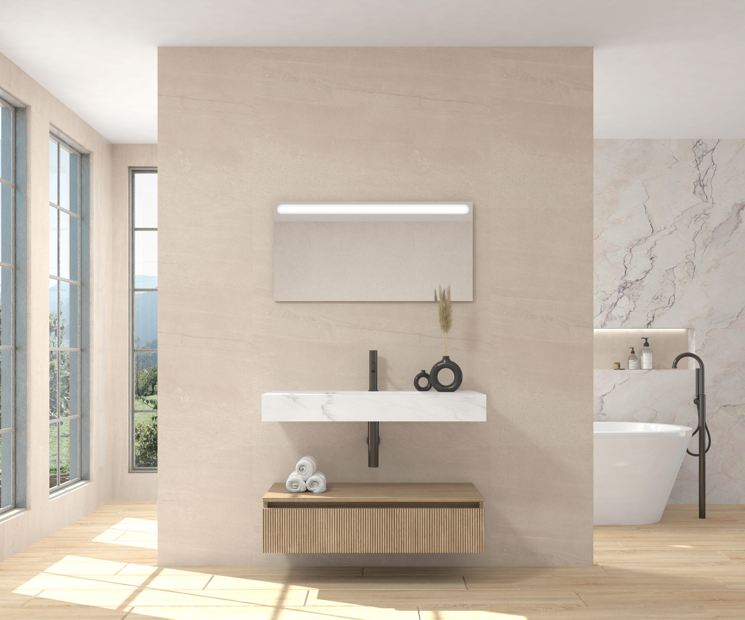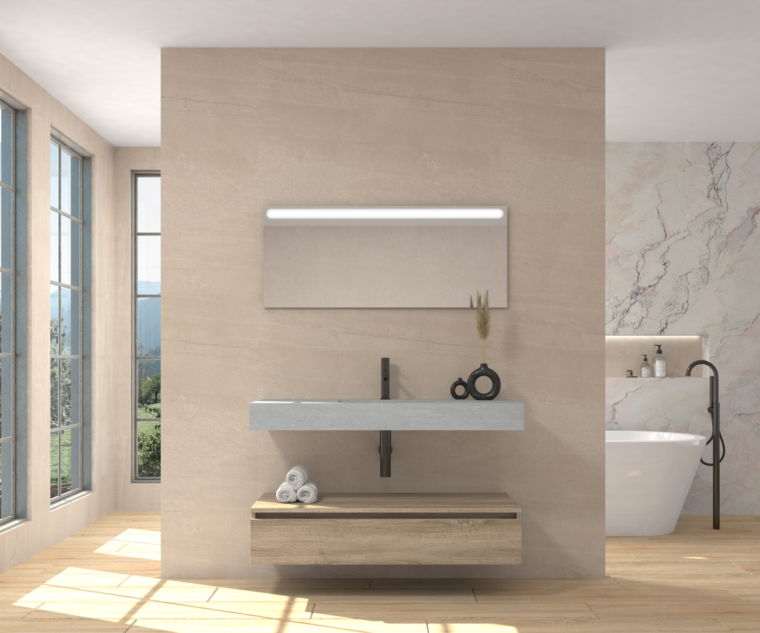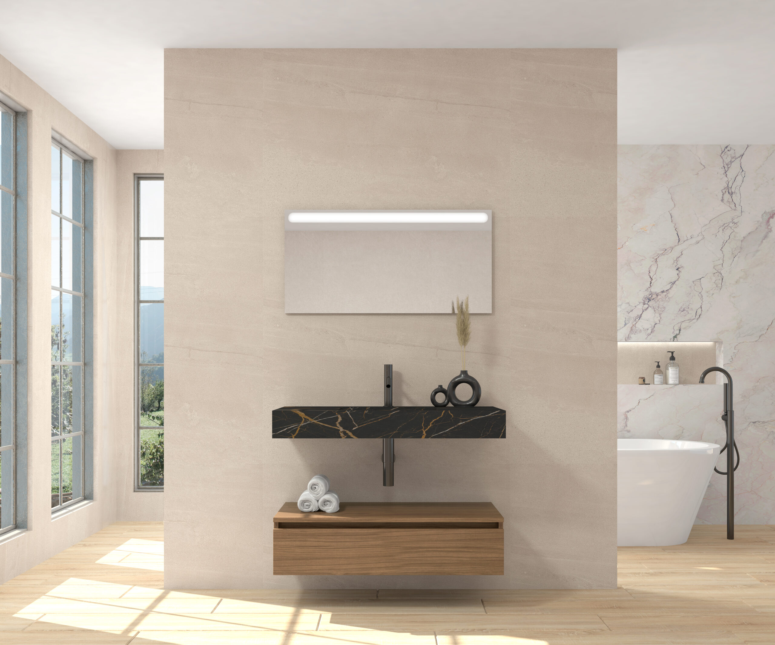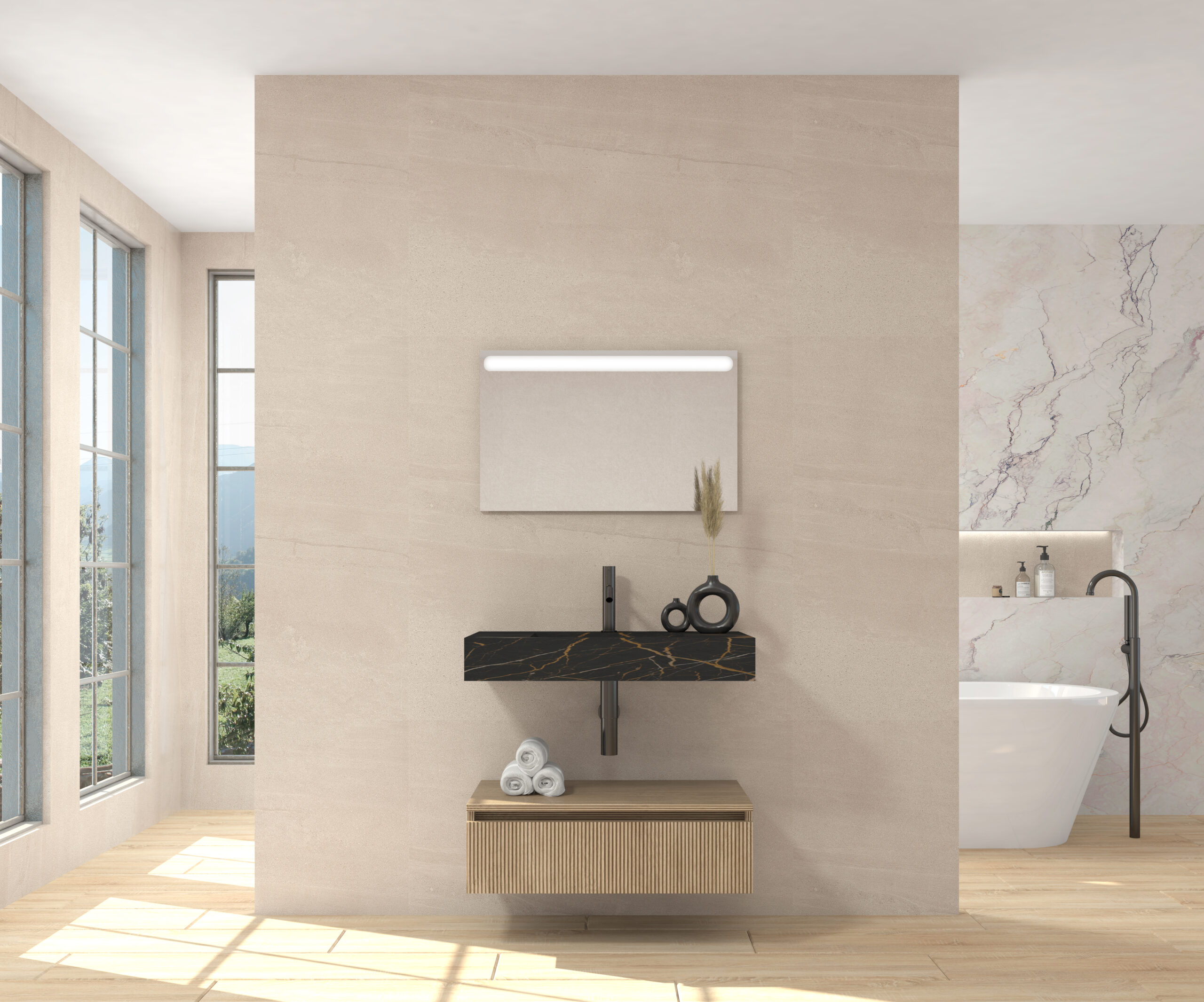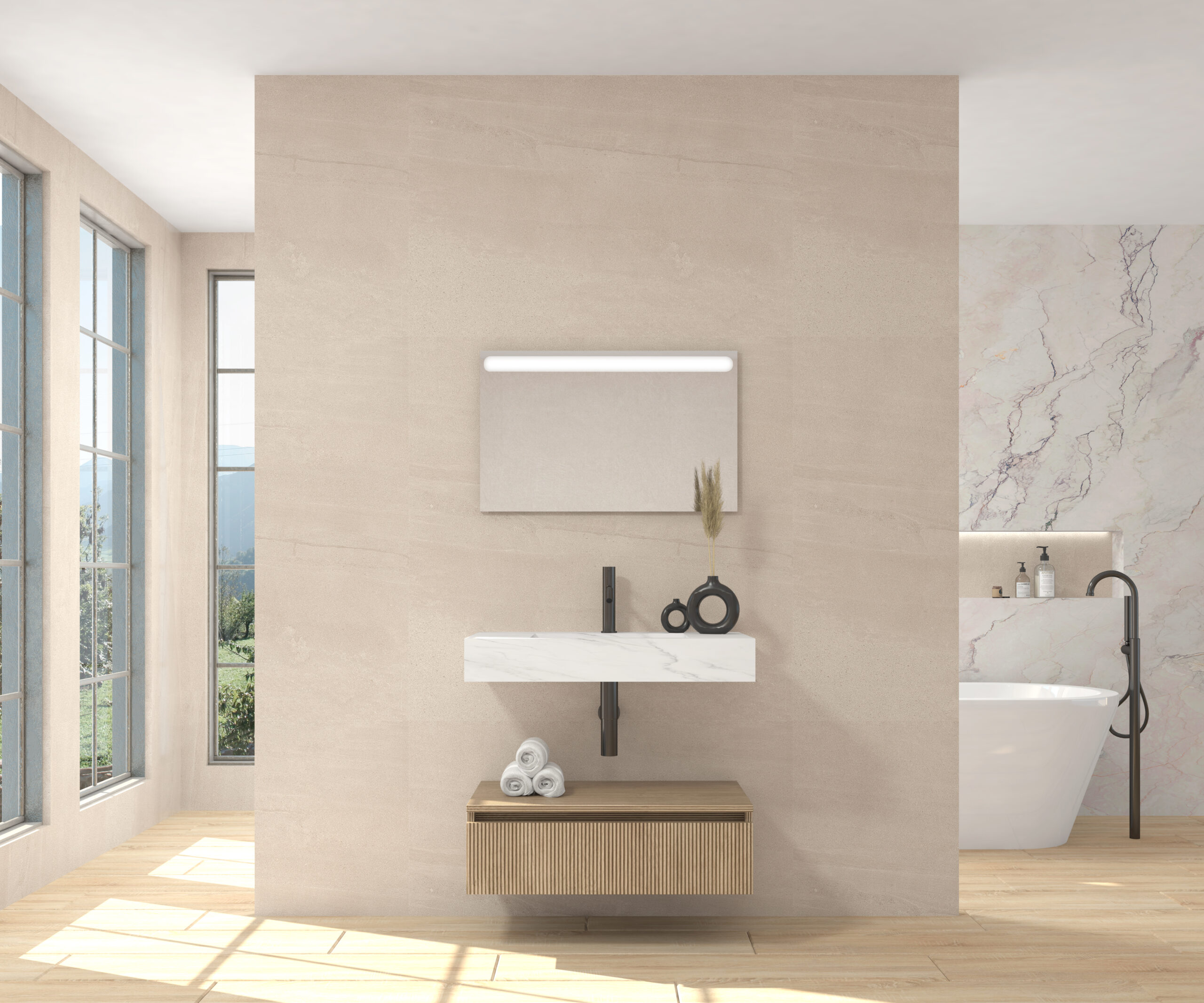 Pack compuesto por mueble suspendido para lavabo, lavabo de piedra sinterizada y espejo con iluminación LED.