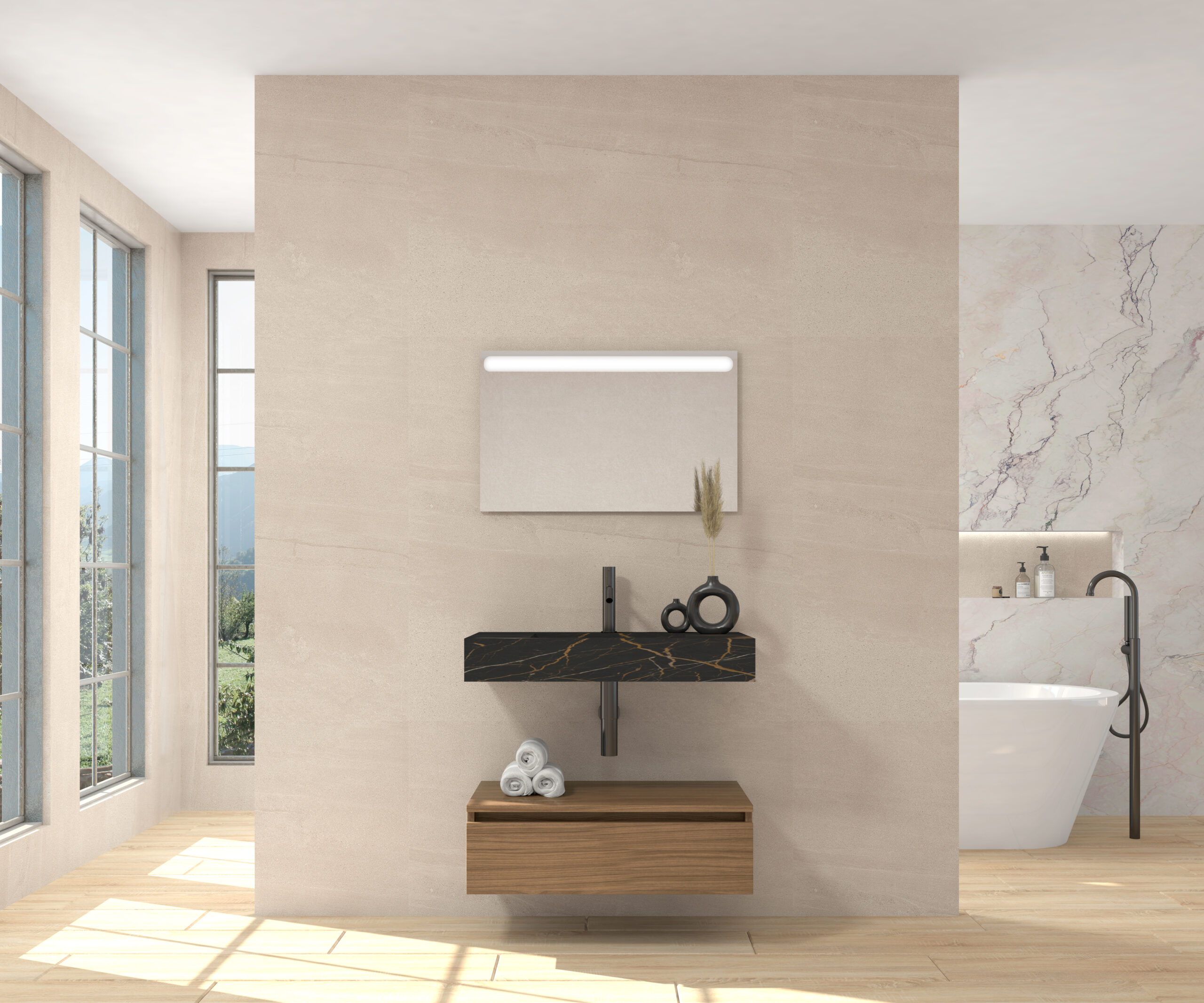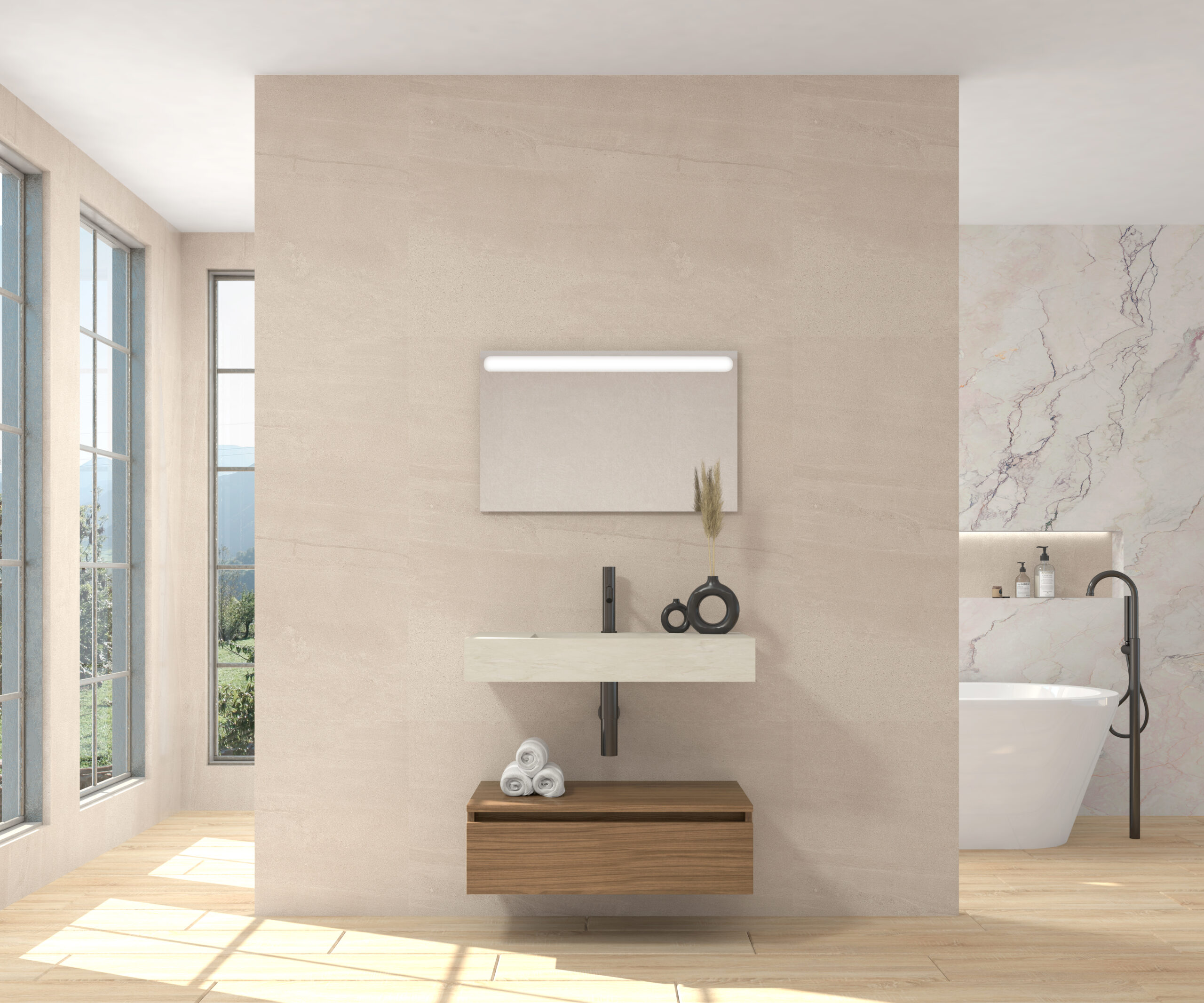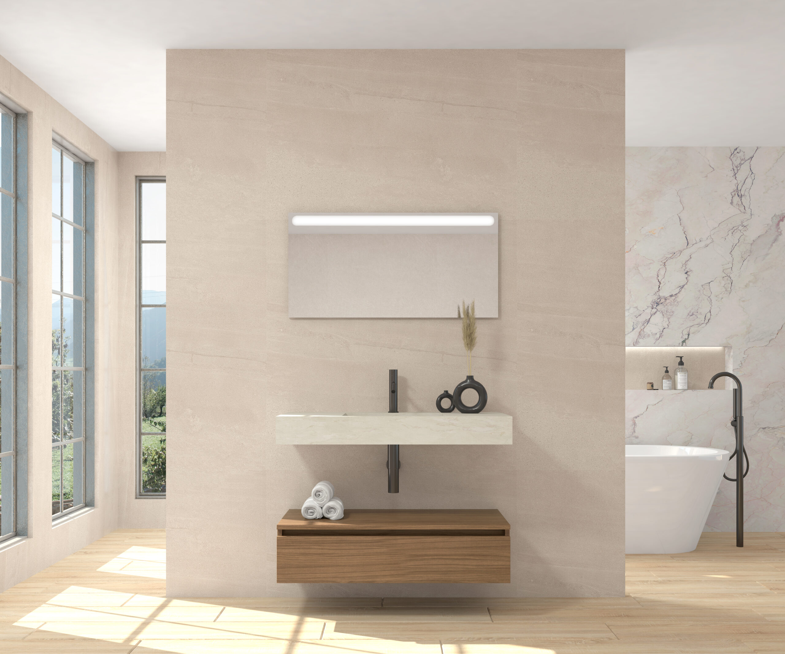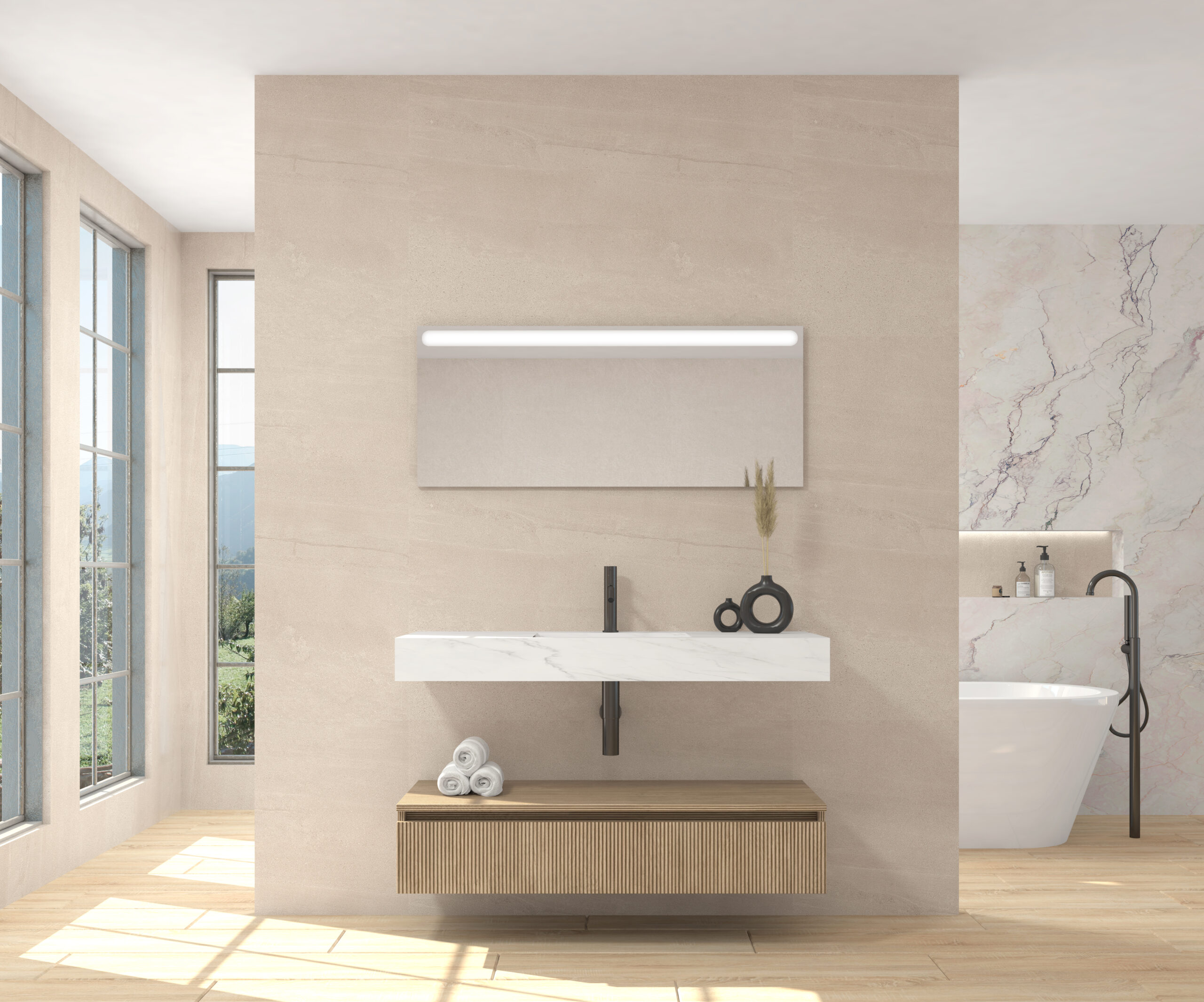 Pack compuesto por mueble suspendido para lavabo, lavabo de piedra sinterizada y espejo con iluminación LED.