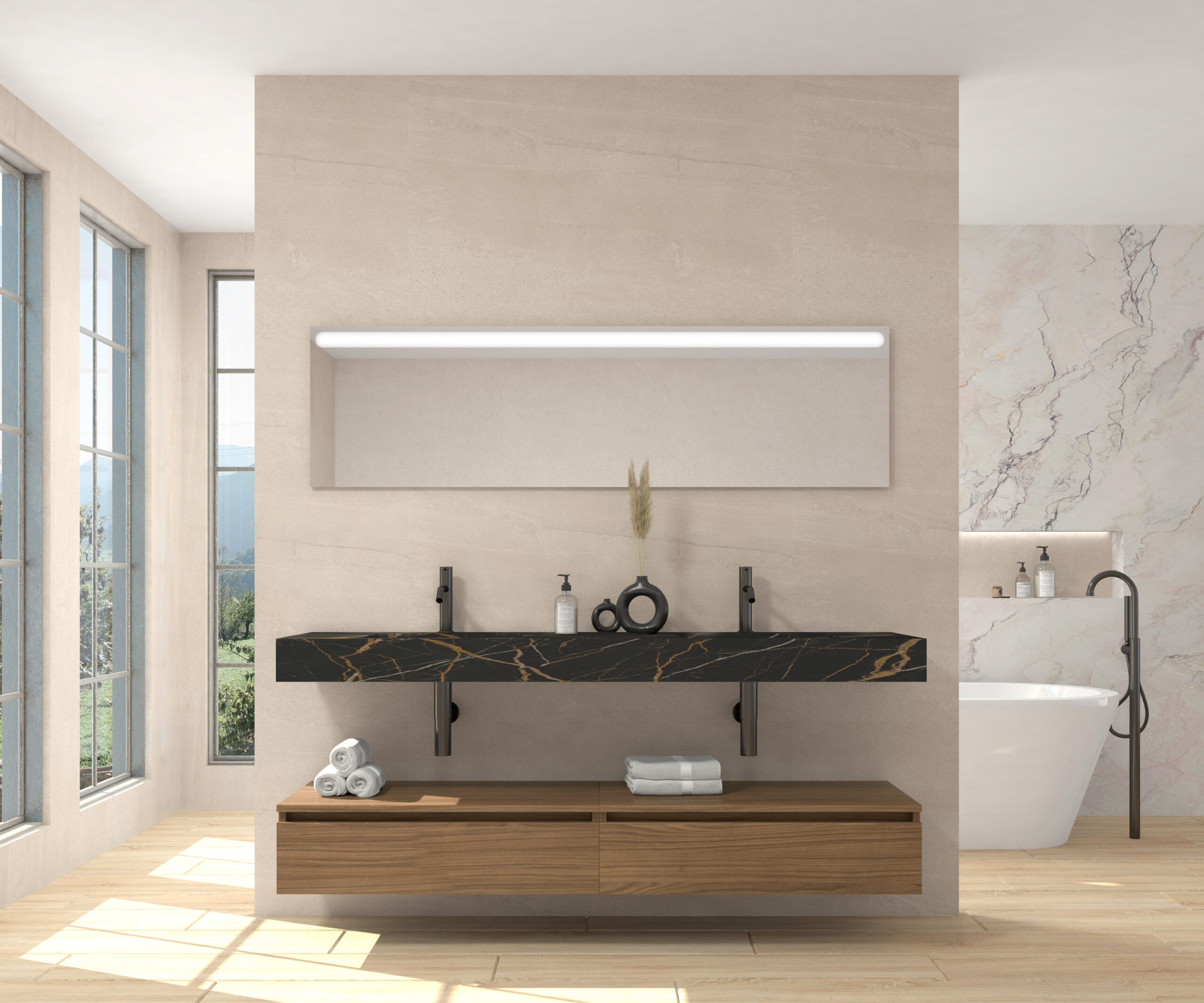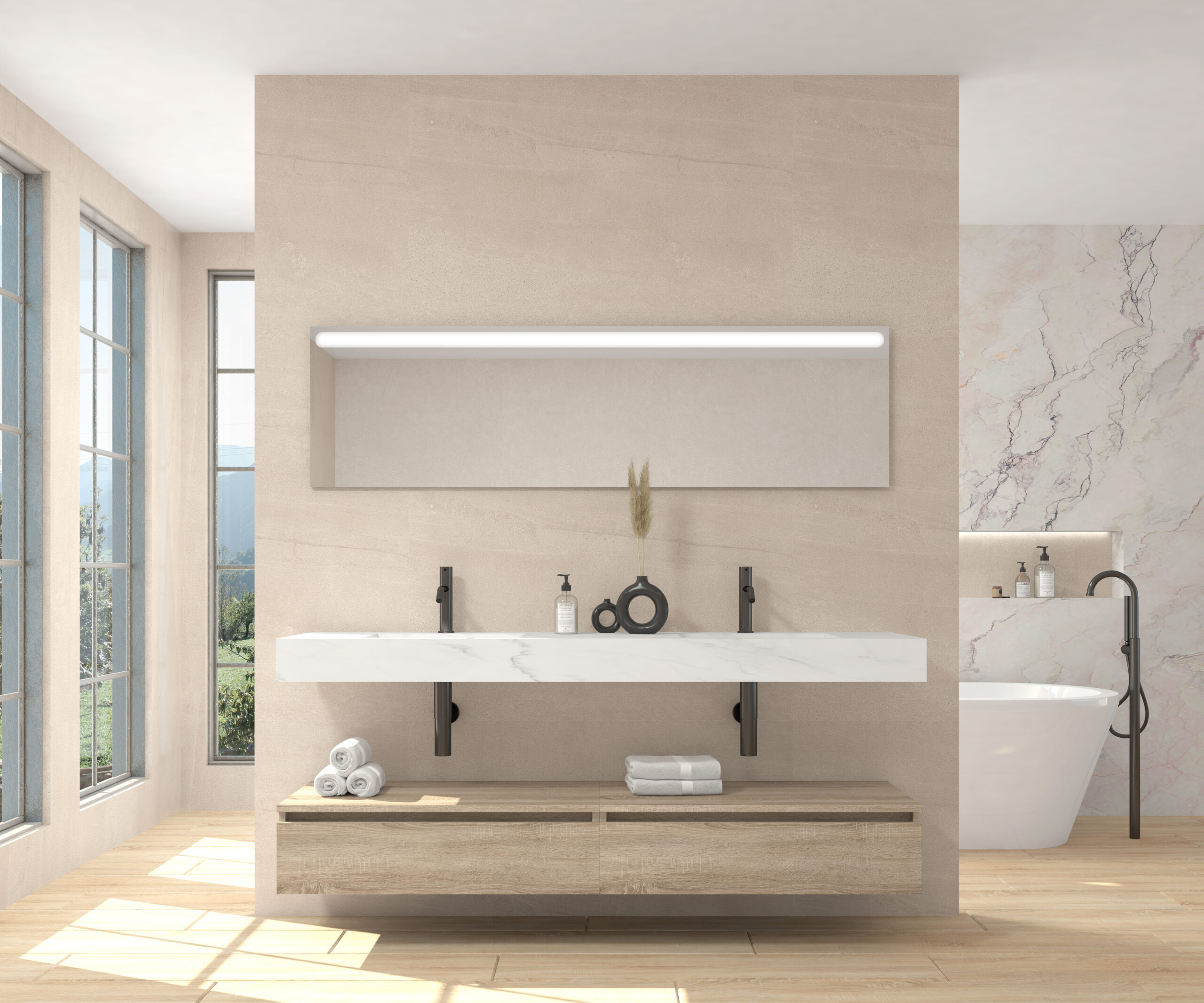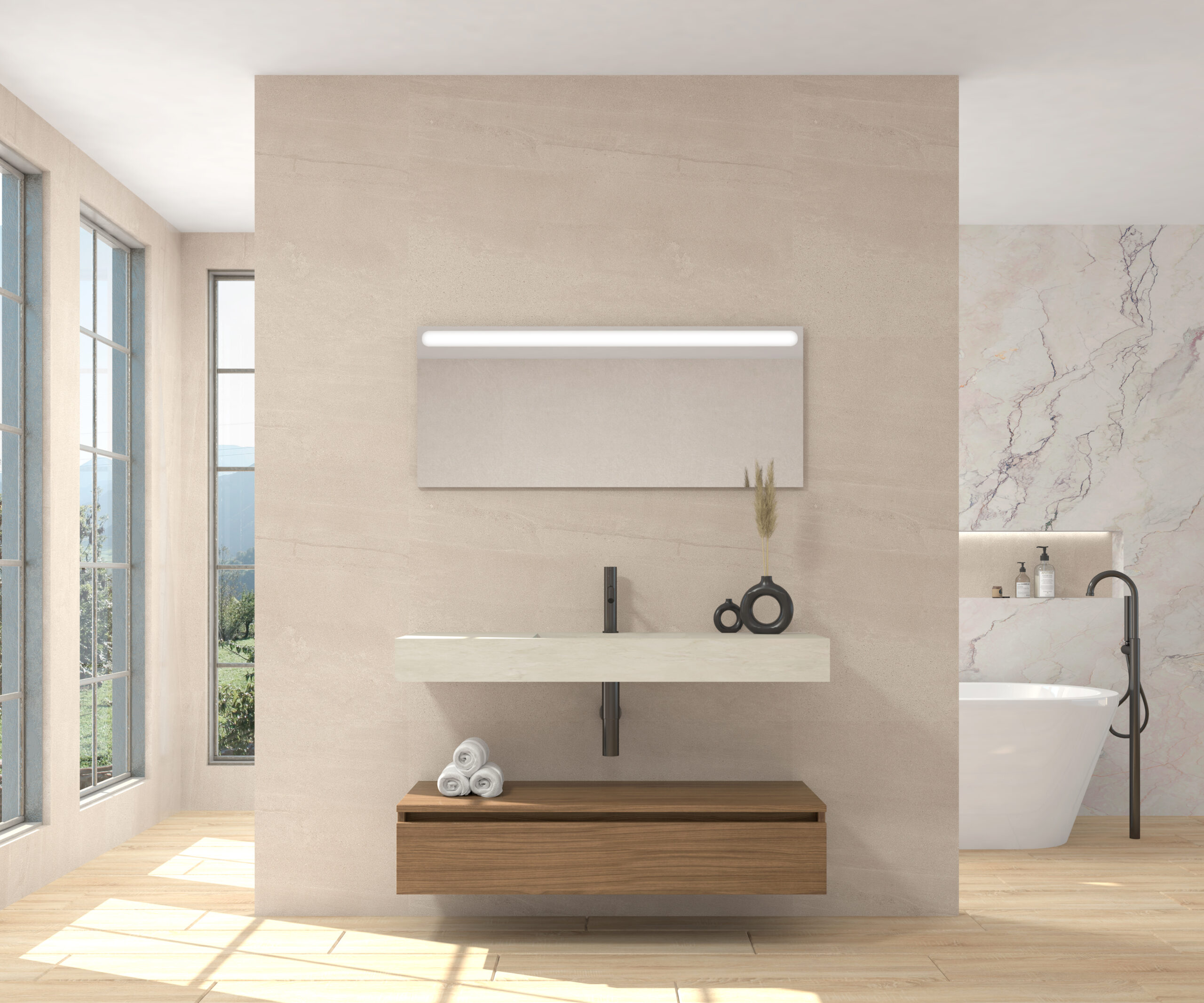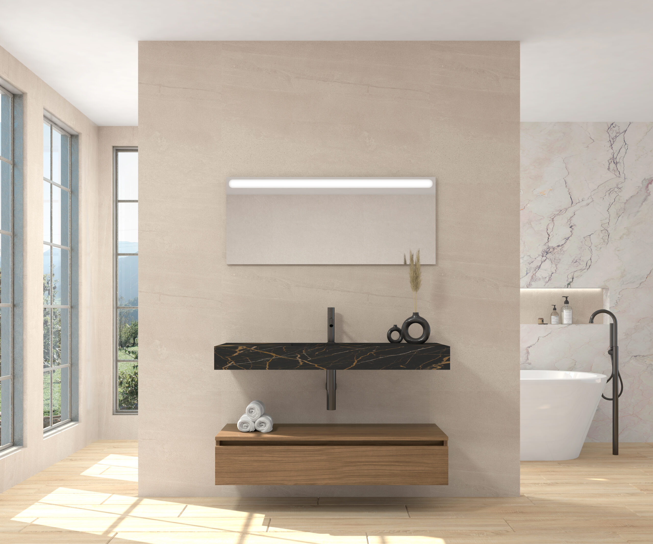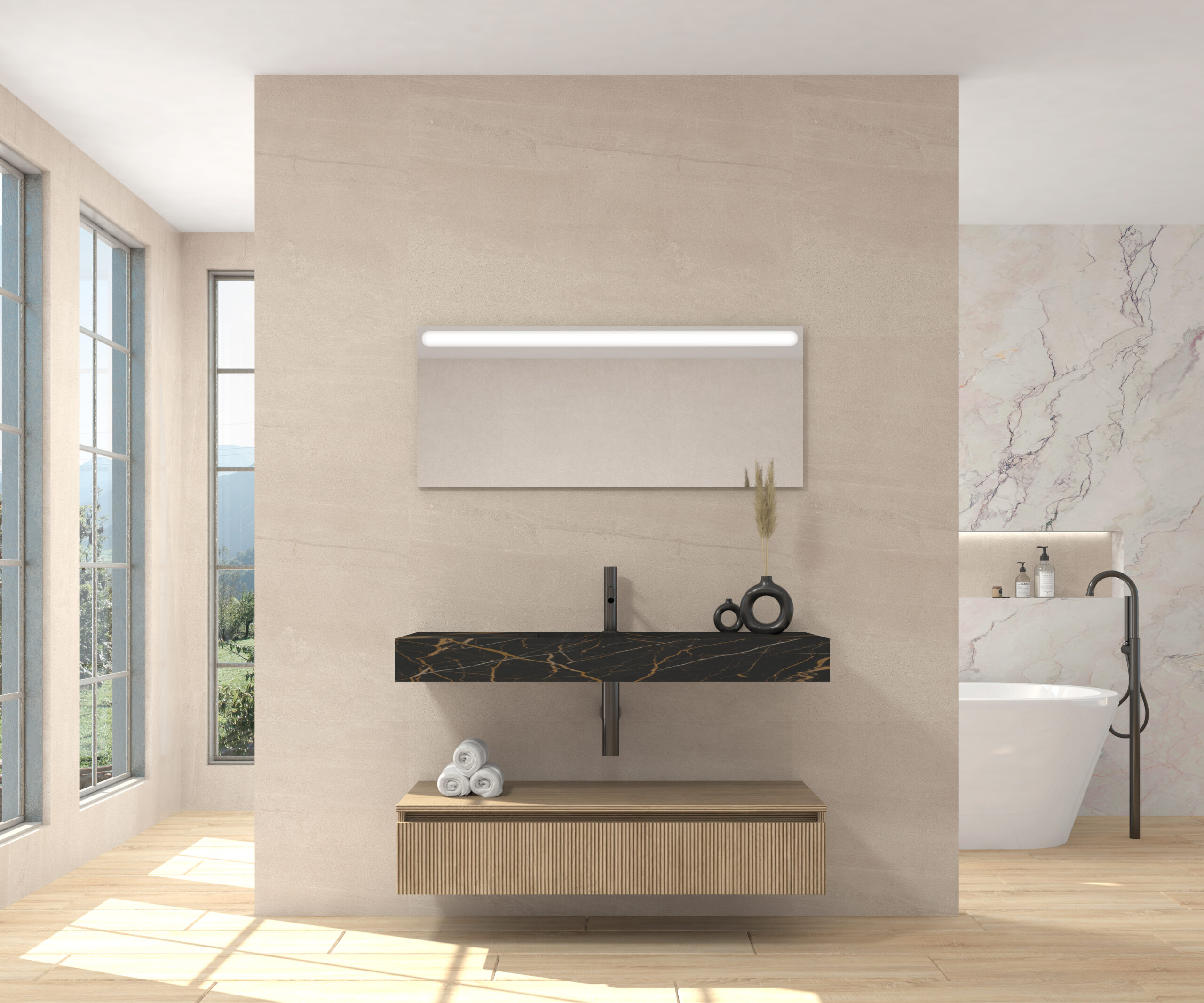 Pack compuesto por mueble suspendido para lavabo, lavabo de piedra sinterizada y espejo con iluminación LED.