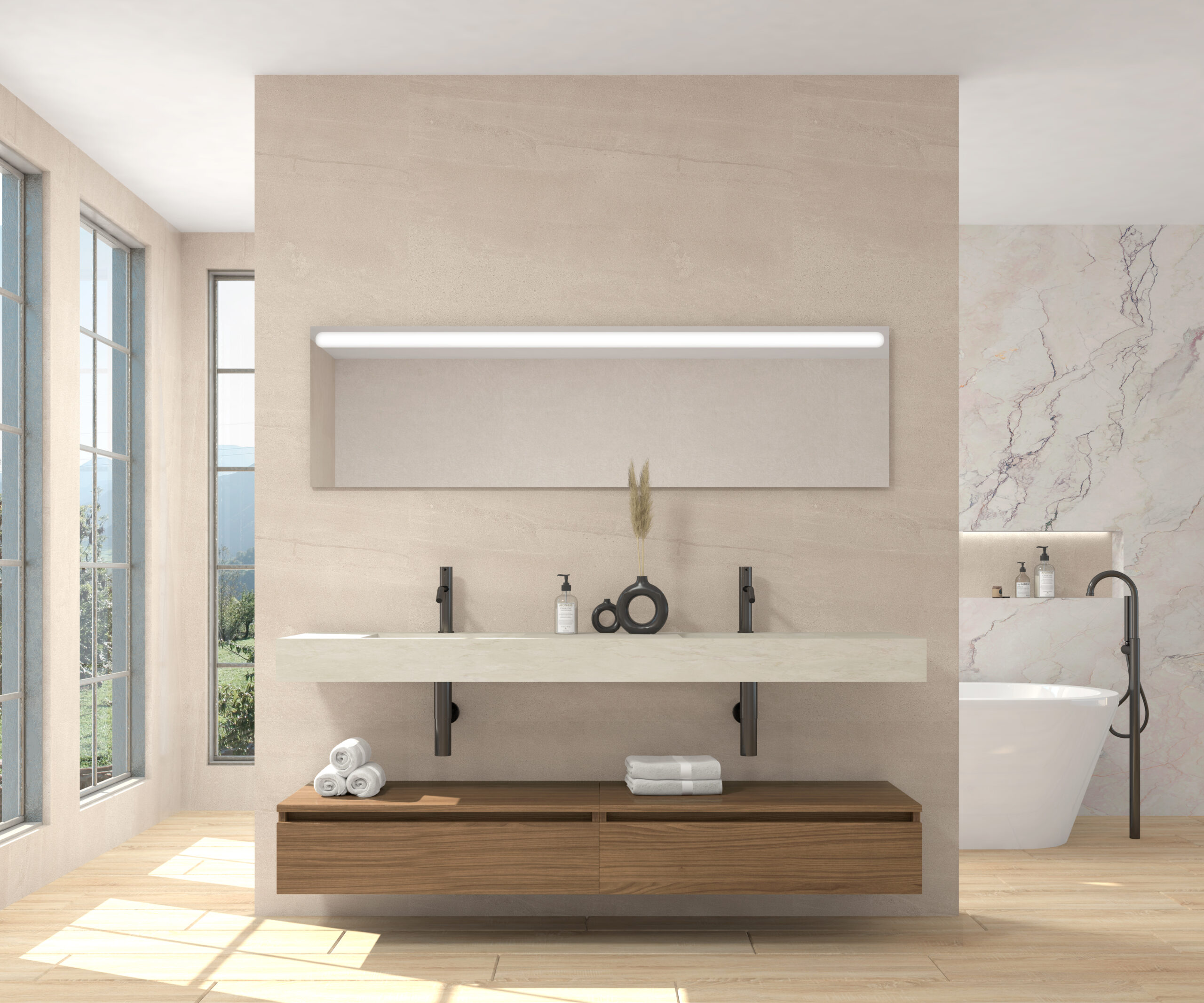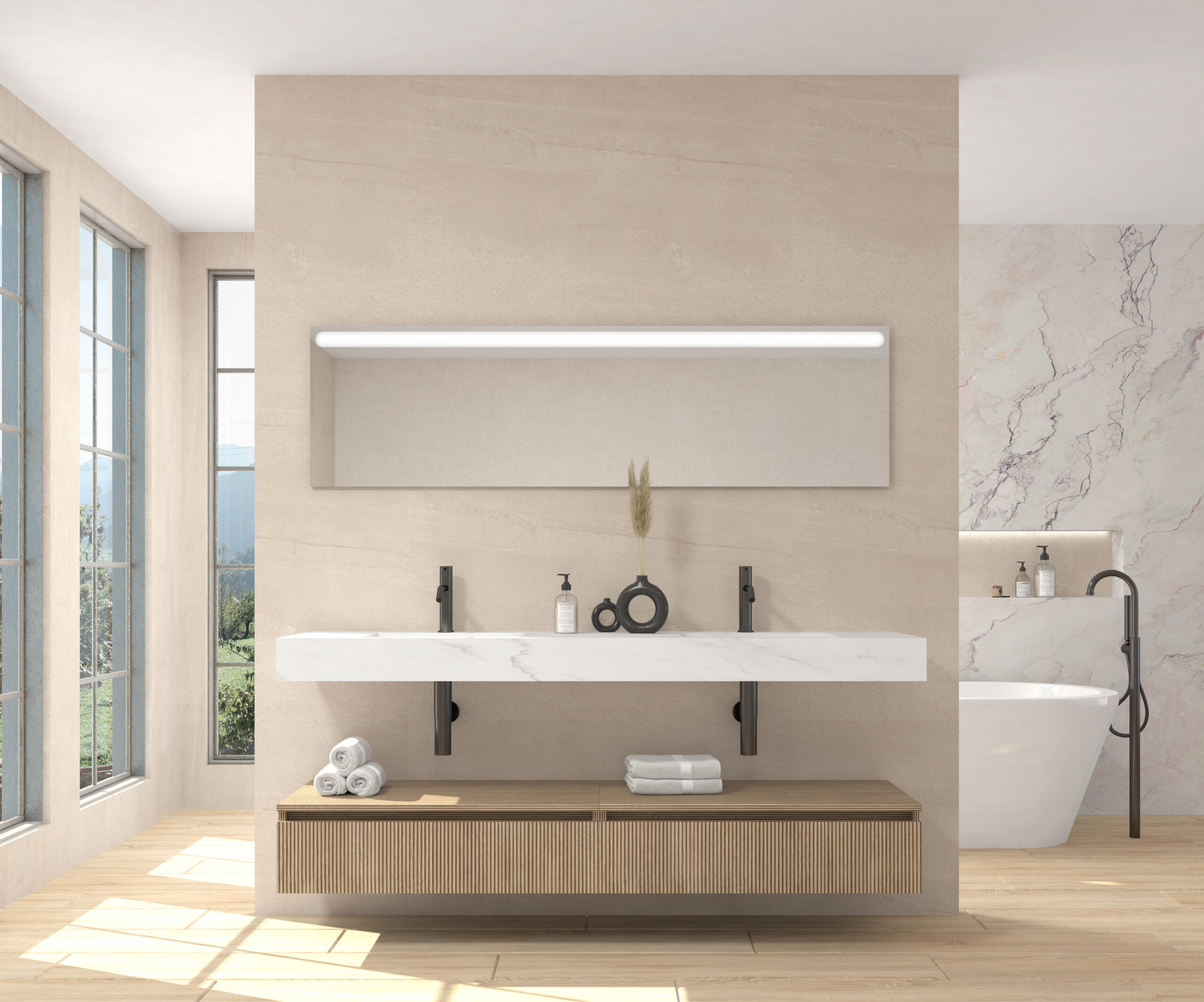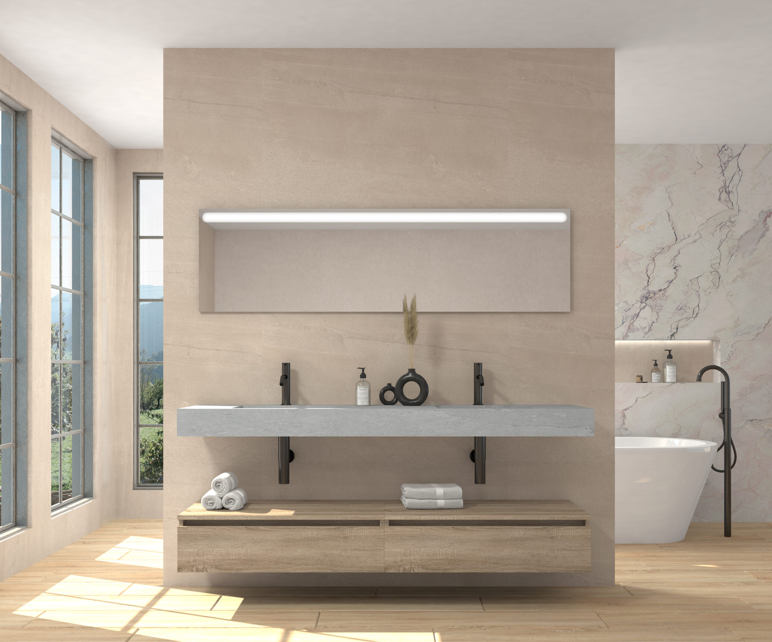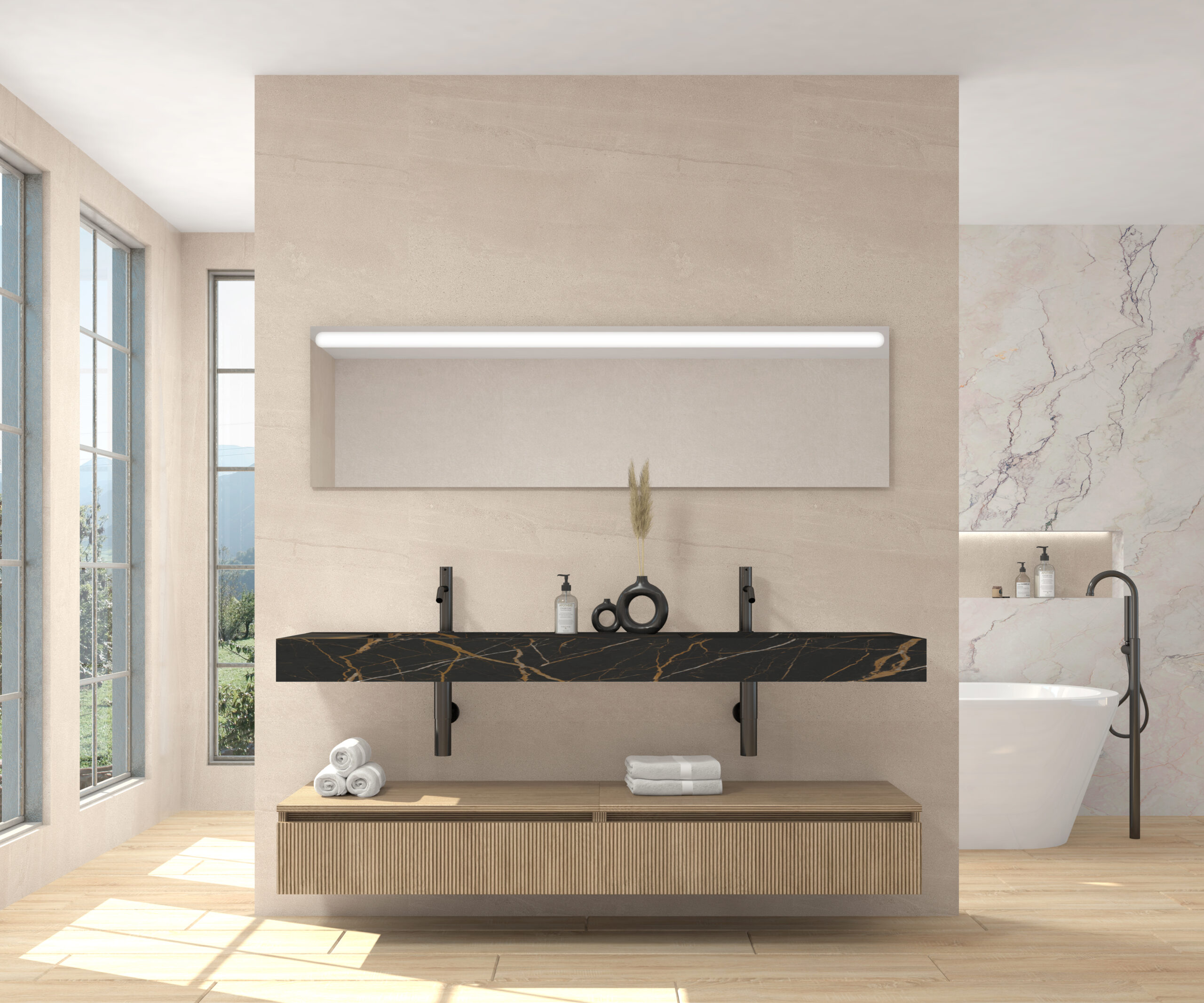 Pack compuesto por mueble suspendido para lavabo, lavabo de piedra sinterizada y espejo con iluminación LED.