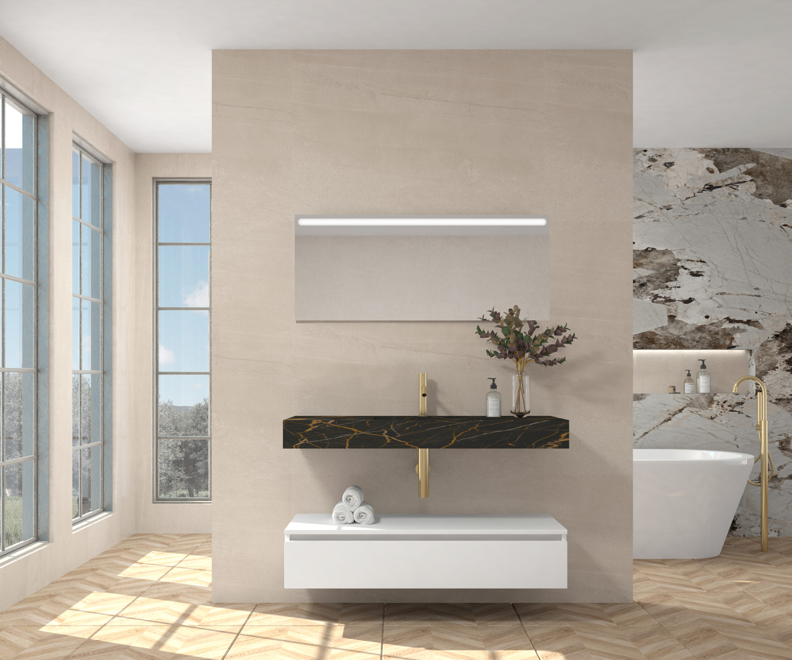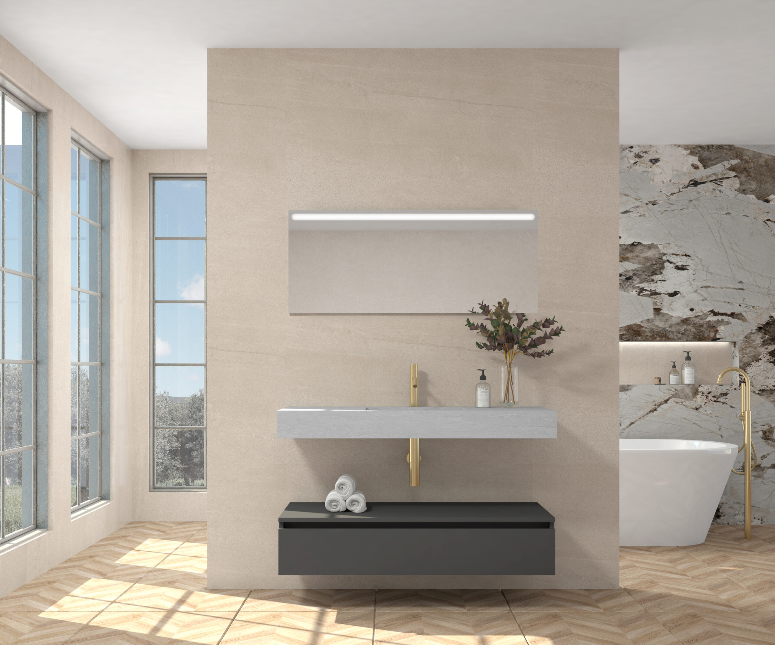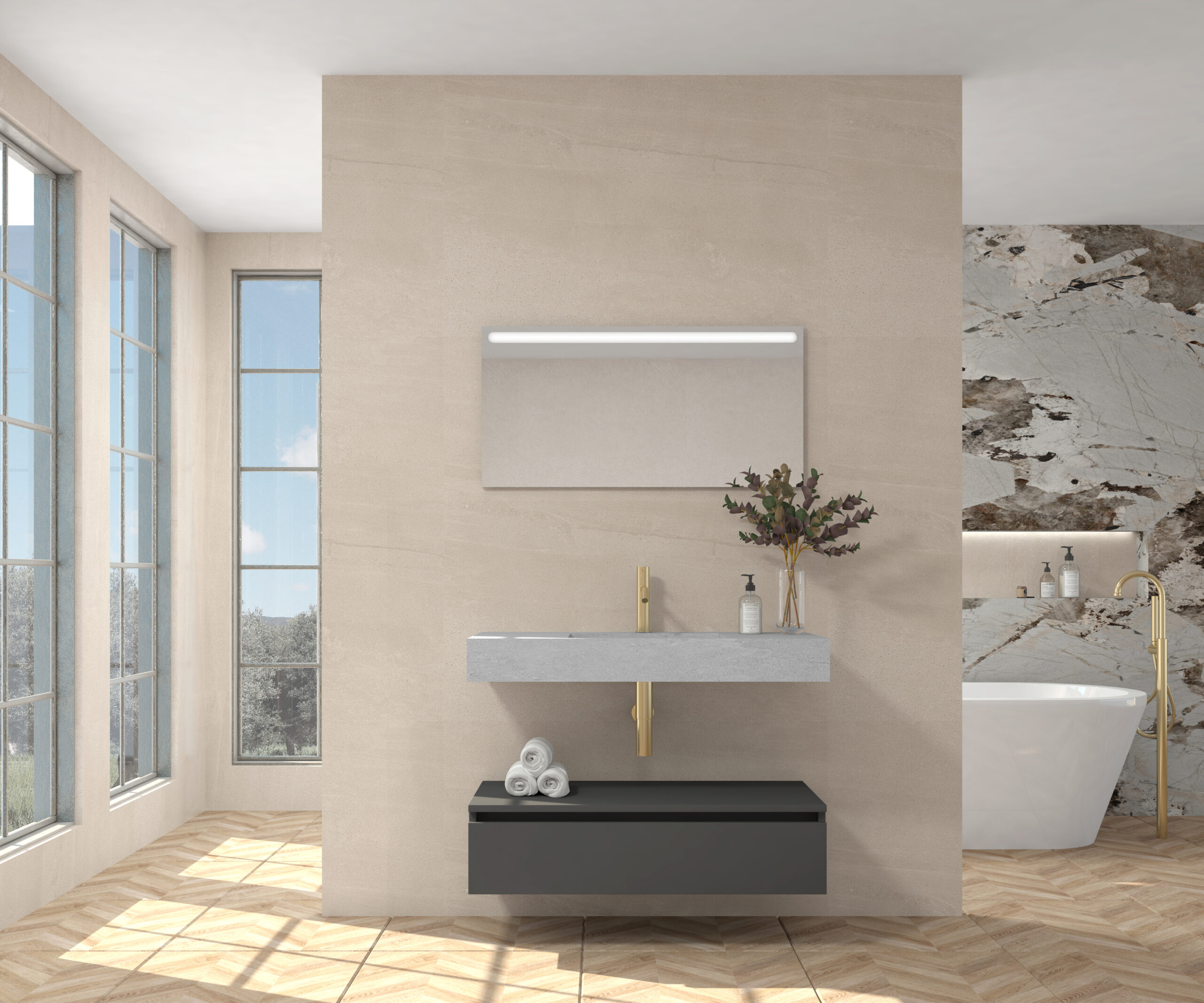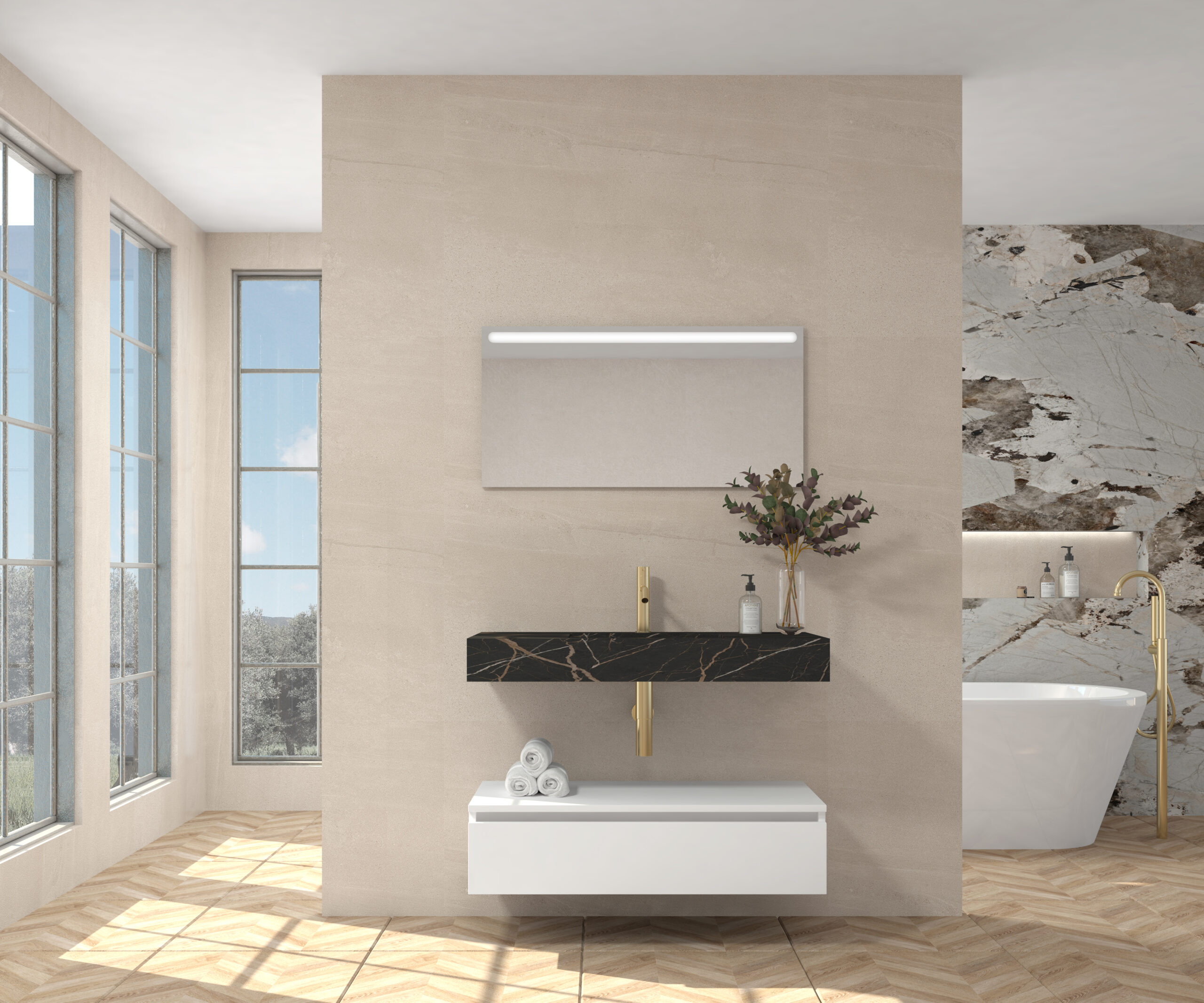 Pack compuesto por mueble suspendido para lavabo, lavabo de piedra sinterizada y espejo LED.