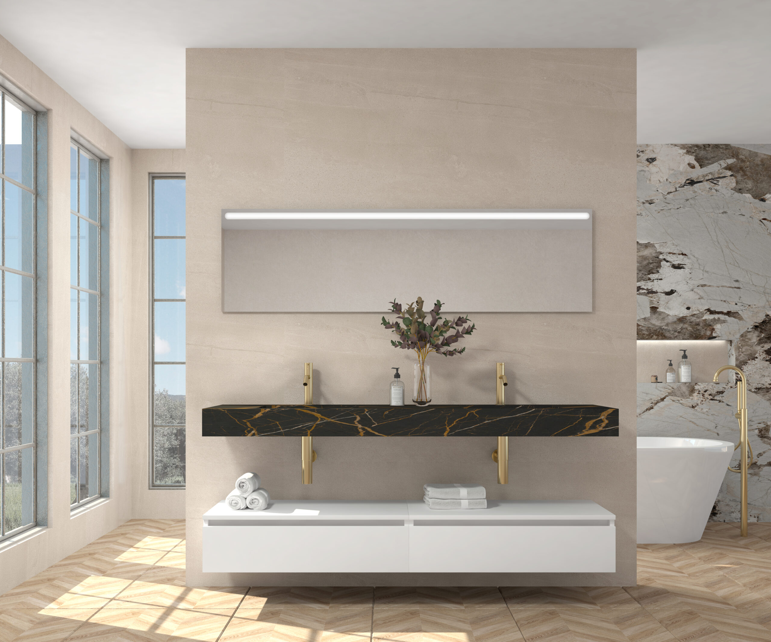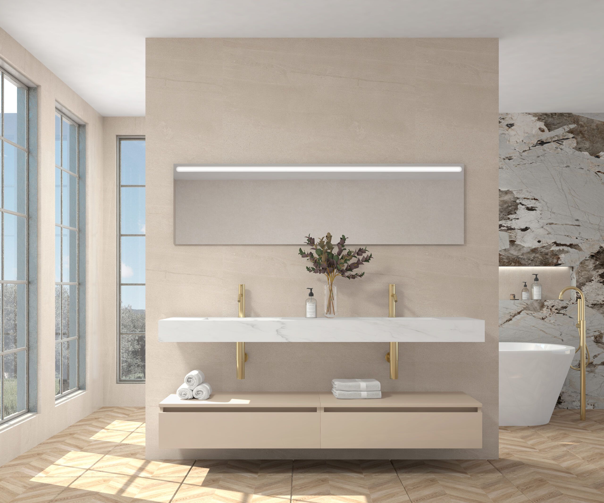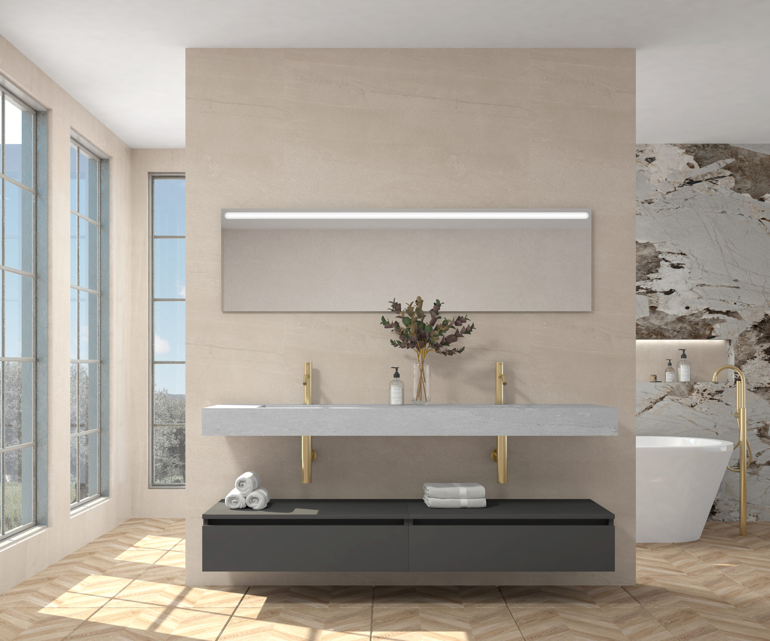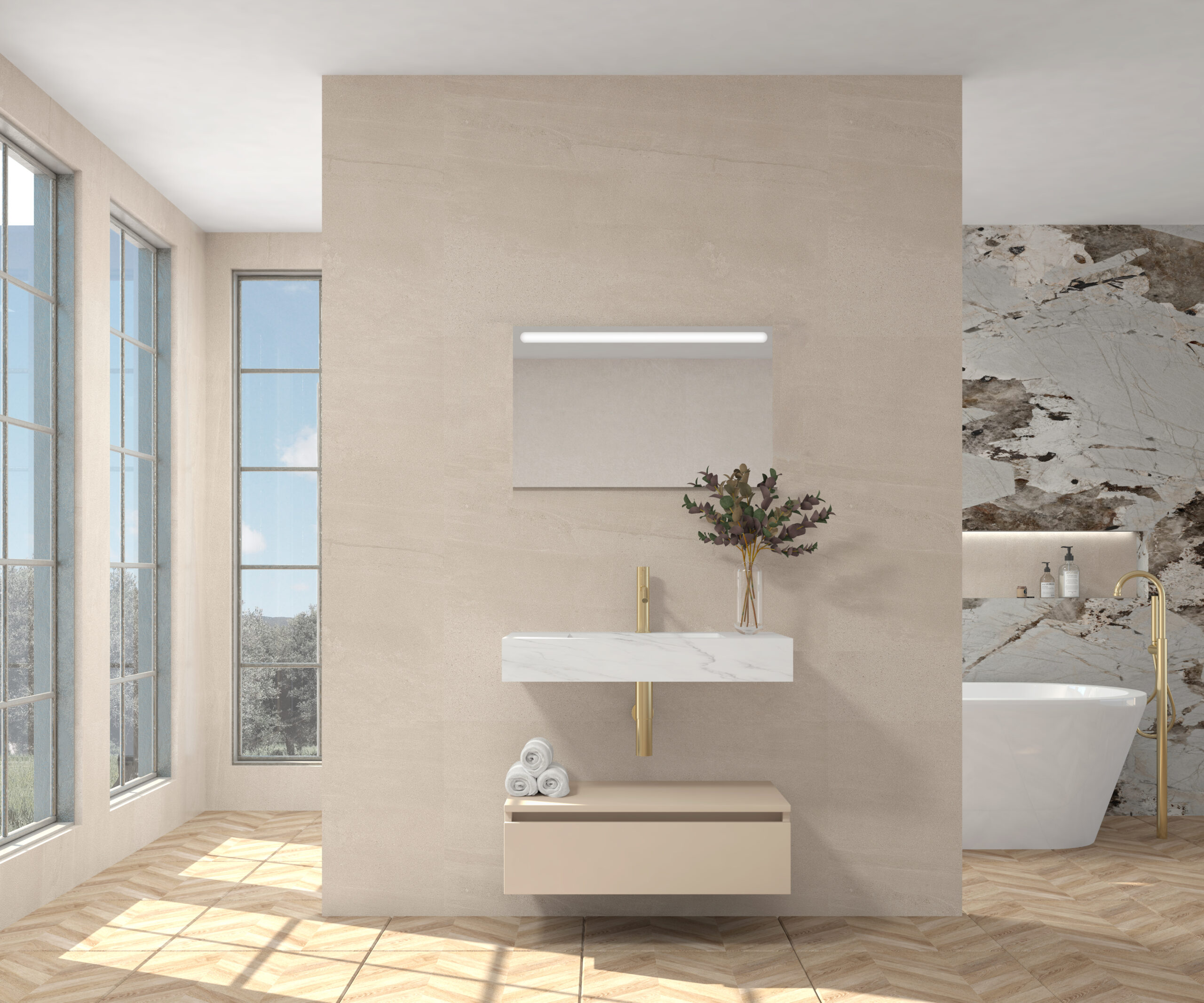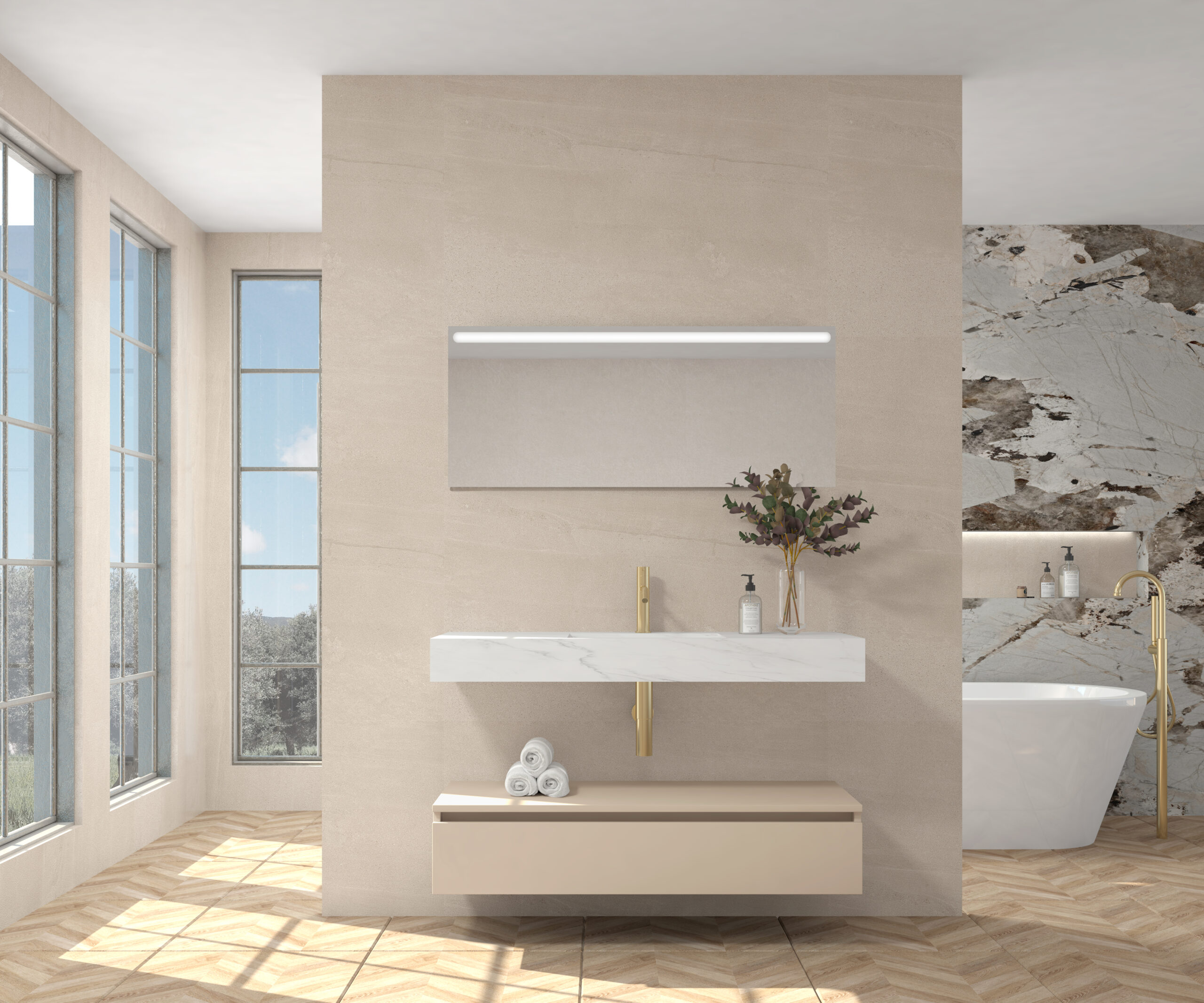 Pack compuesto por mueble suspendido para lavabo, lavabo de piedra sinterizada y espejo LED.