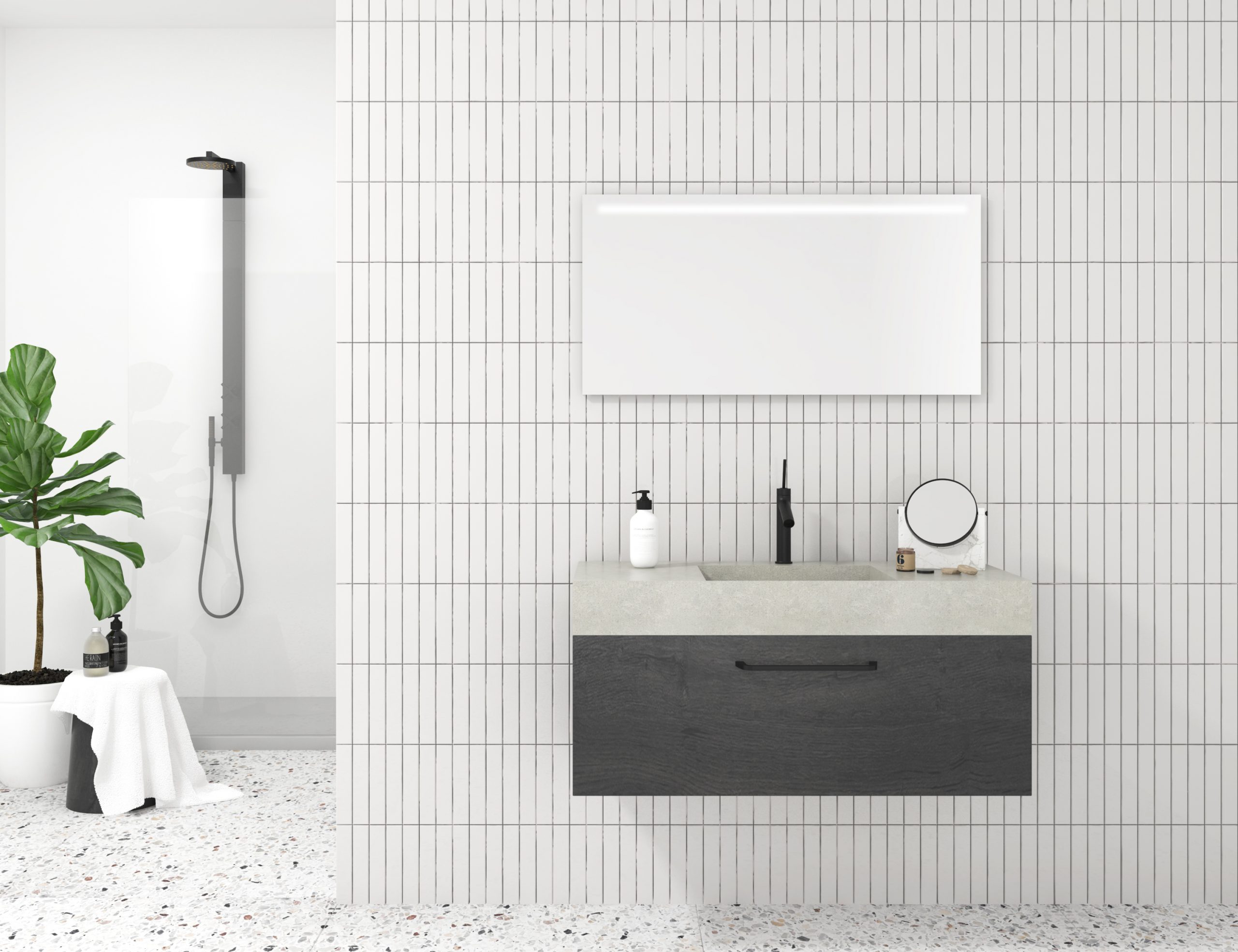 Pack URANO BLACK + lavabo mármol compacto + espejo + foco LED
