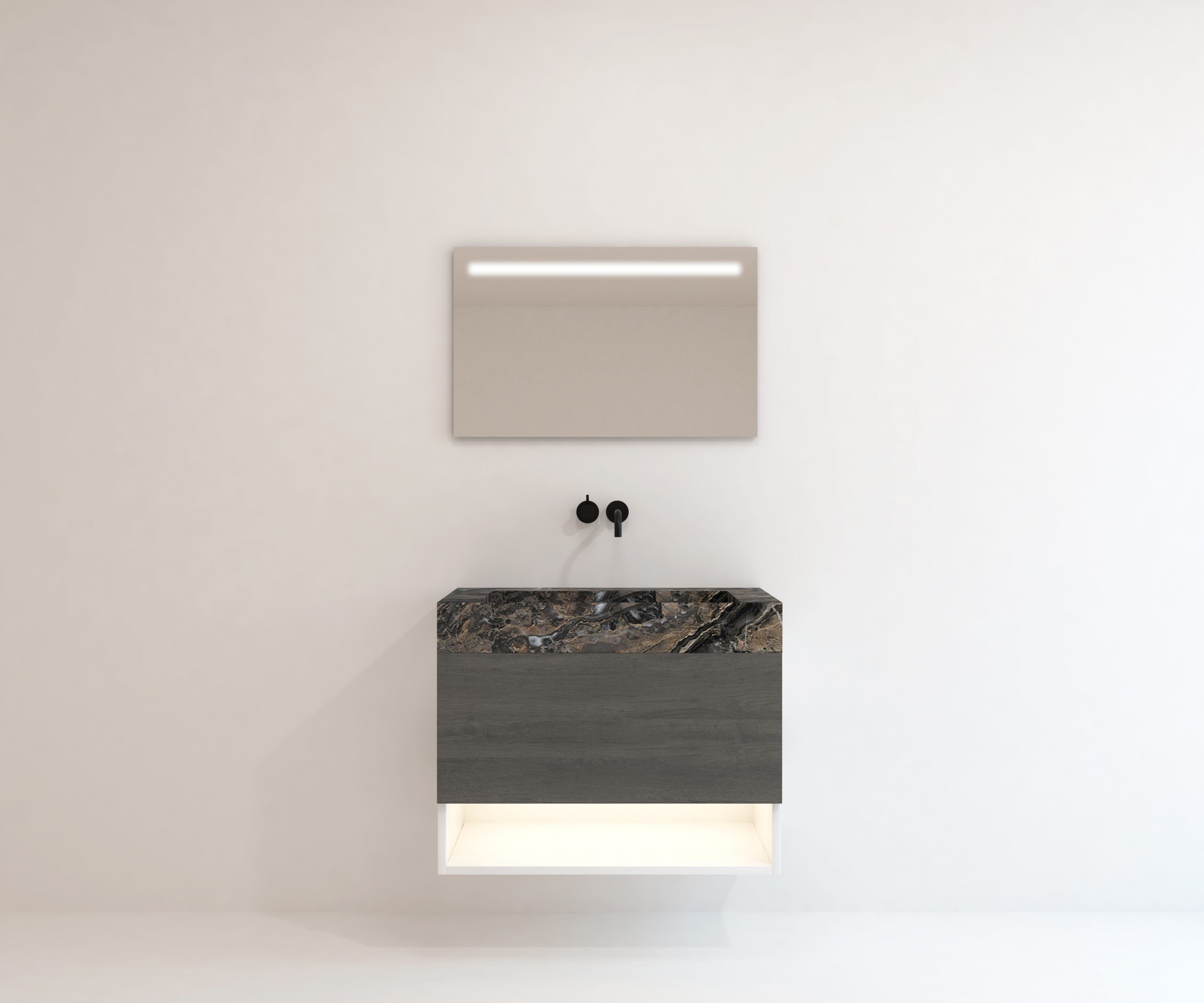 Accesorio toallero perfecto para complementar el mueble de lavabo. Estructura metálica acabado negro mate. Incluye estante de tablero laminado.