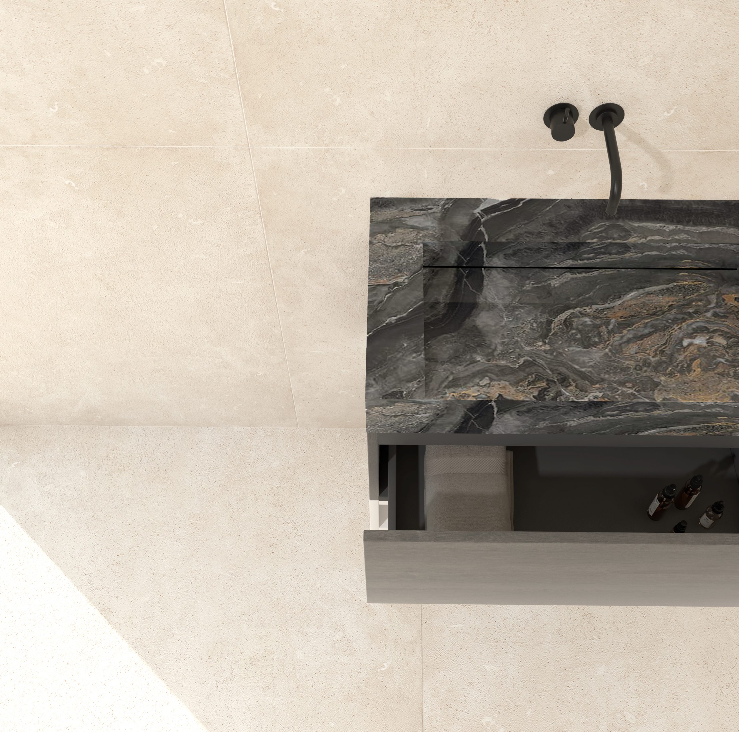 Accesorio toallero perfecto para complementar el mueble de lavabo. Estructura metálica acabado negro mate. Incluye estante de tablero laminado.